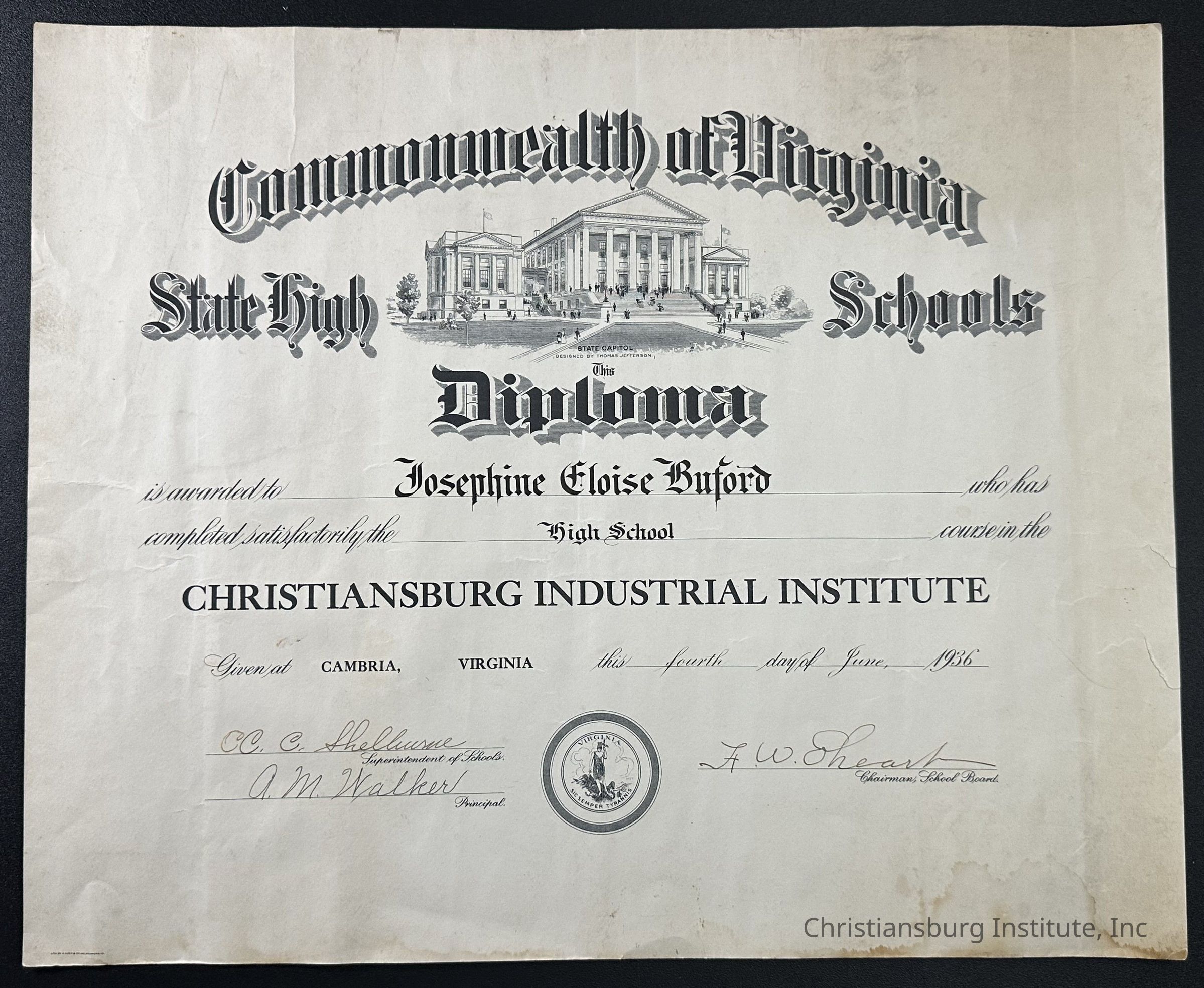 A high school diploma issued to Josephine Eloise Buford on June 4th, 1936 for completing their course of study at Christiansburg Industrial Institute.Collection