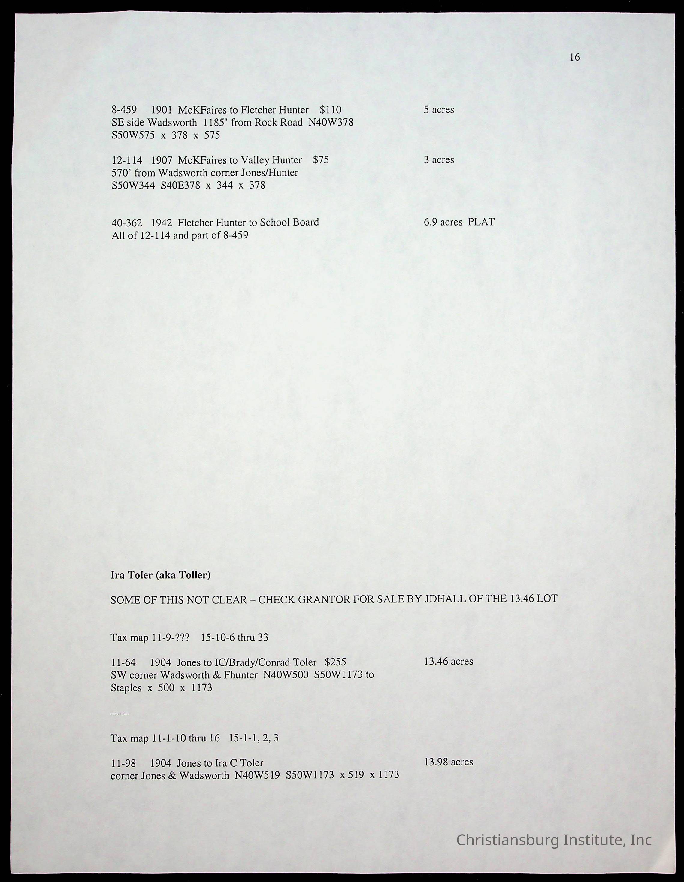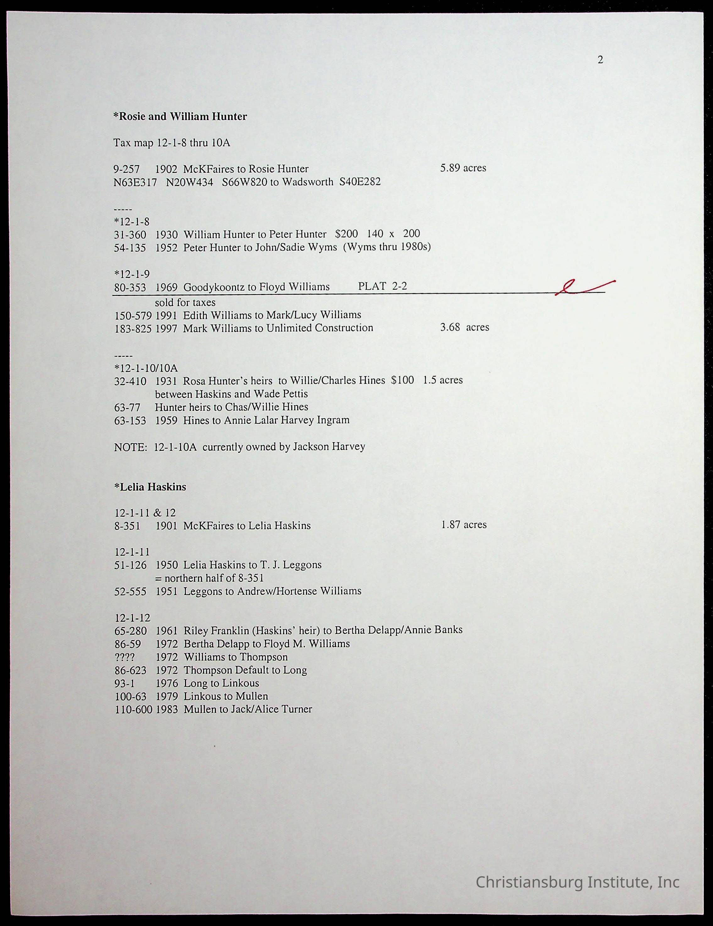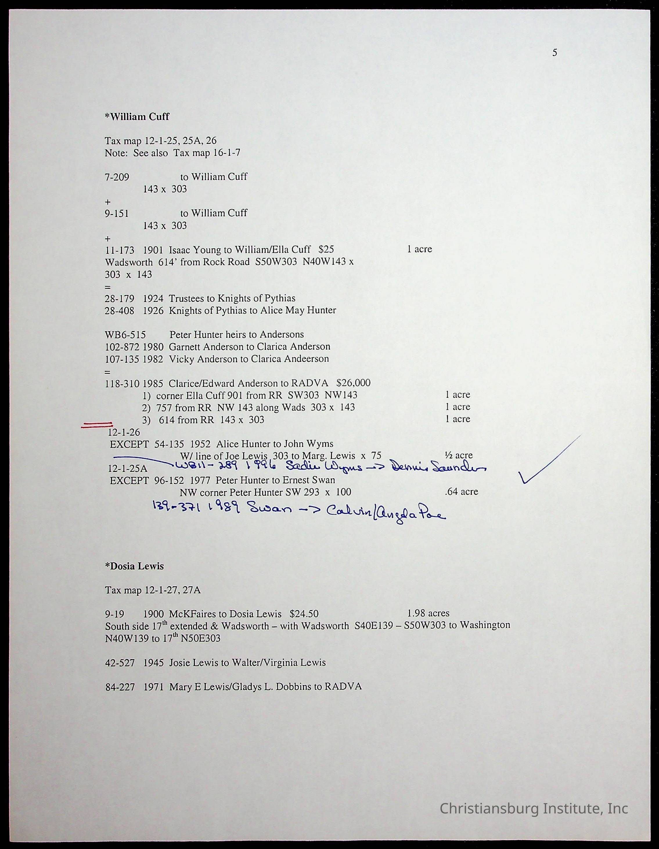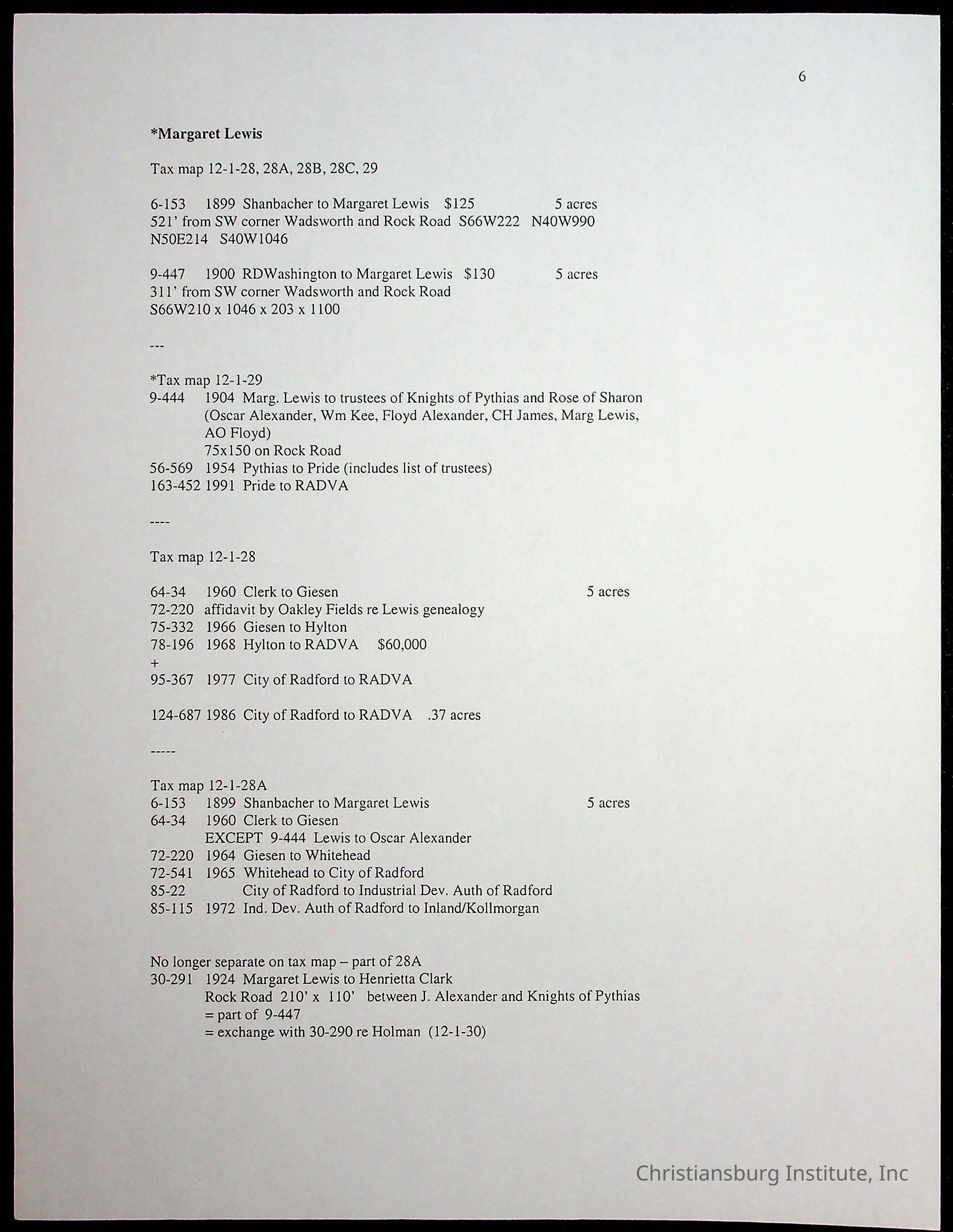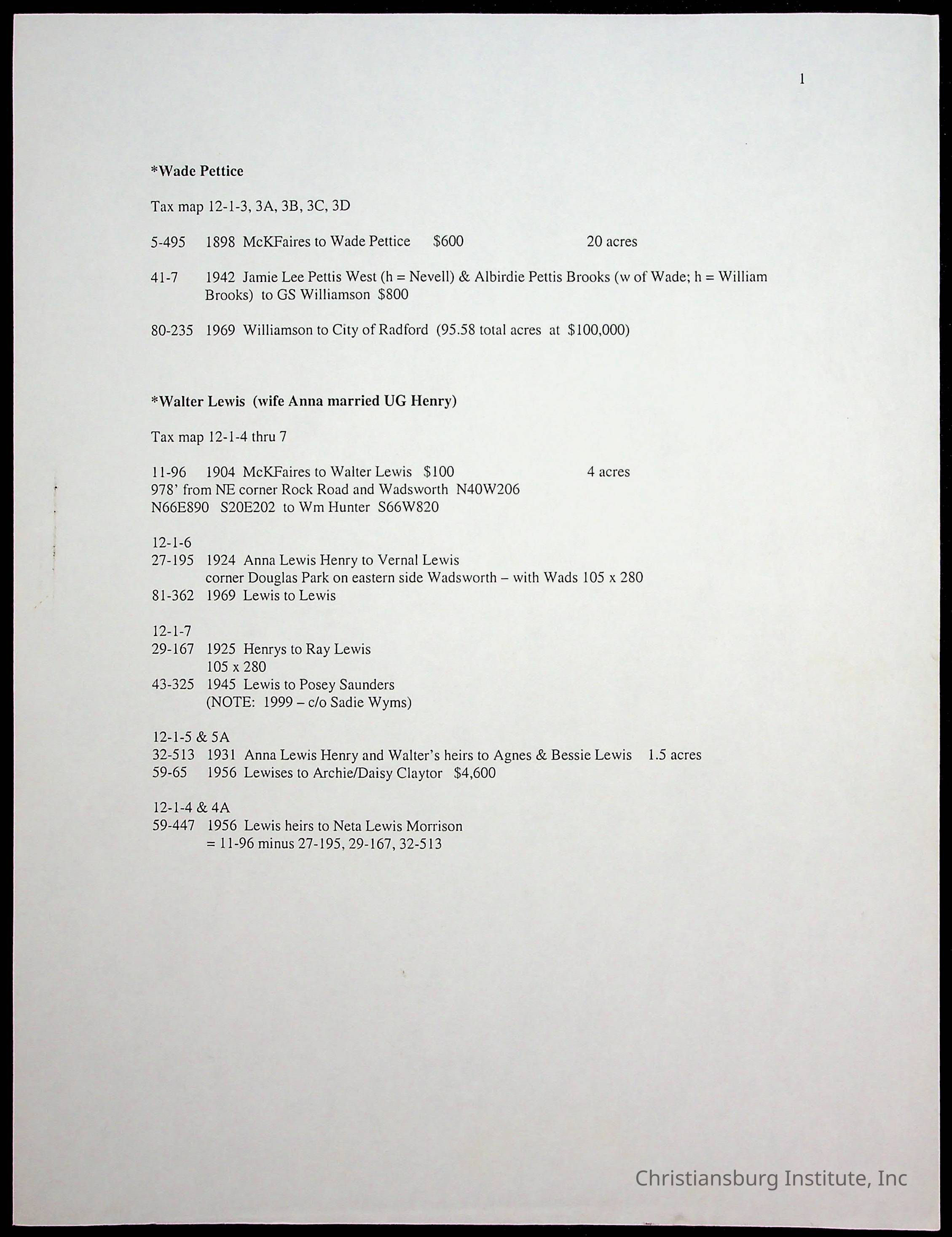 A folder of research materials collected by Radford University professor, Dr. Linda Killen. This folder is titled 'Land/Genealogy Research' and includes various research conducted in Radford, Virginia. This folder includes genealogy records, Dr Killen's notes, and plat maps.