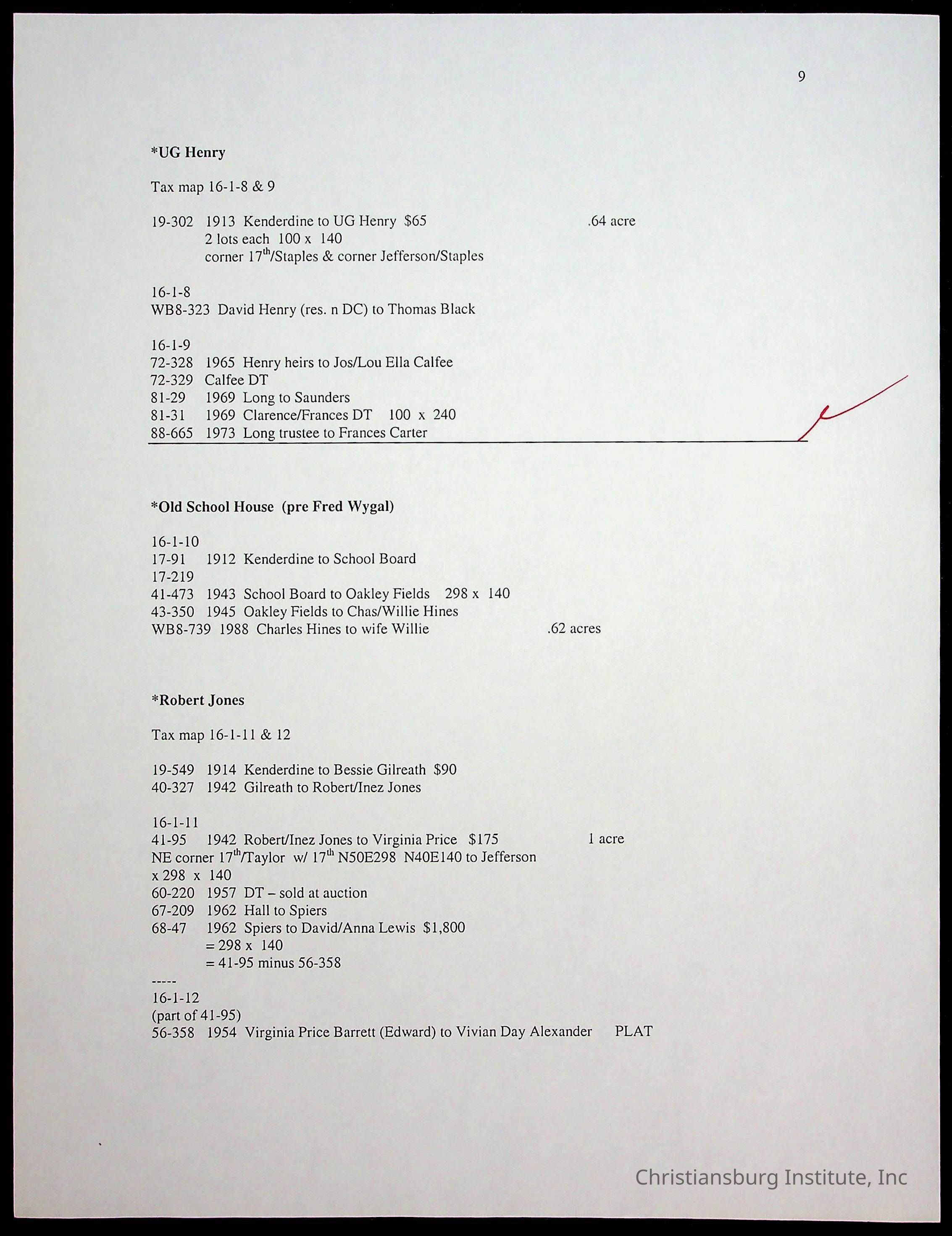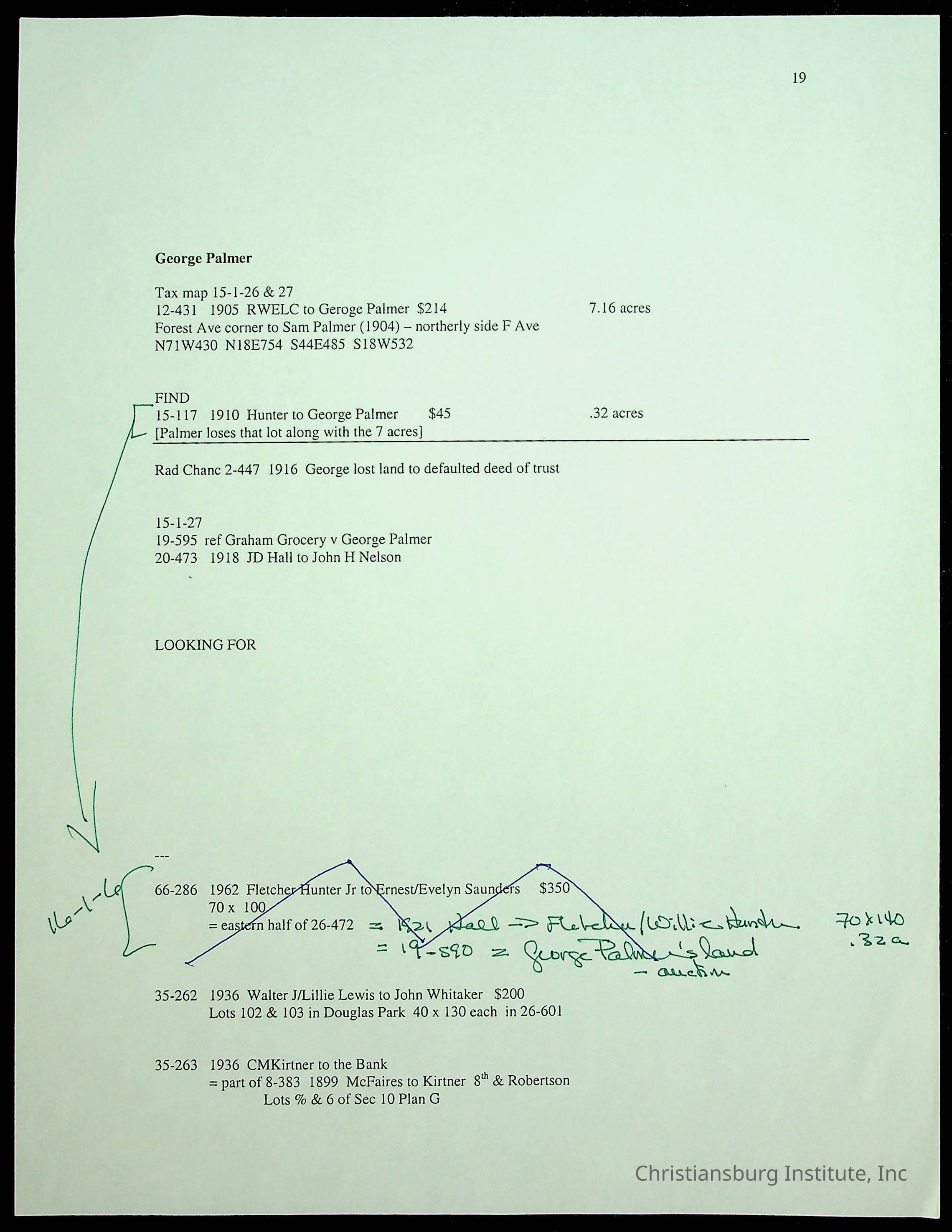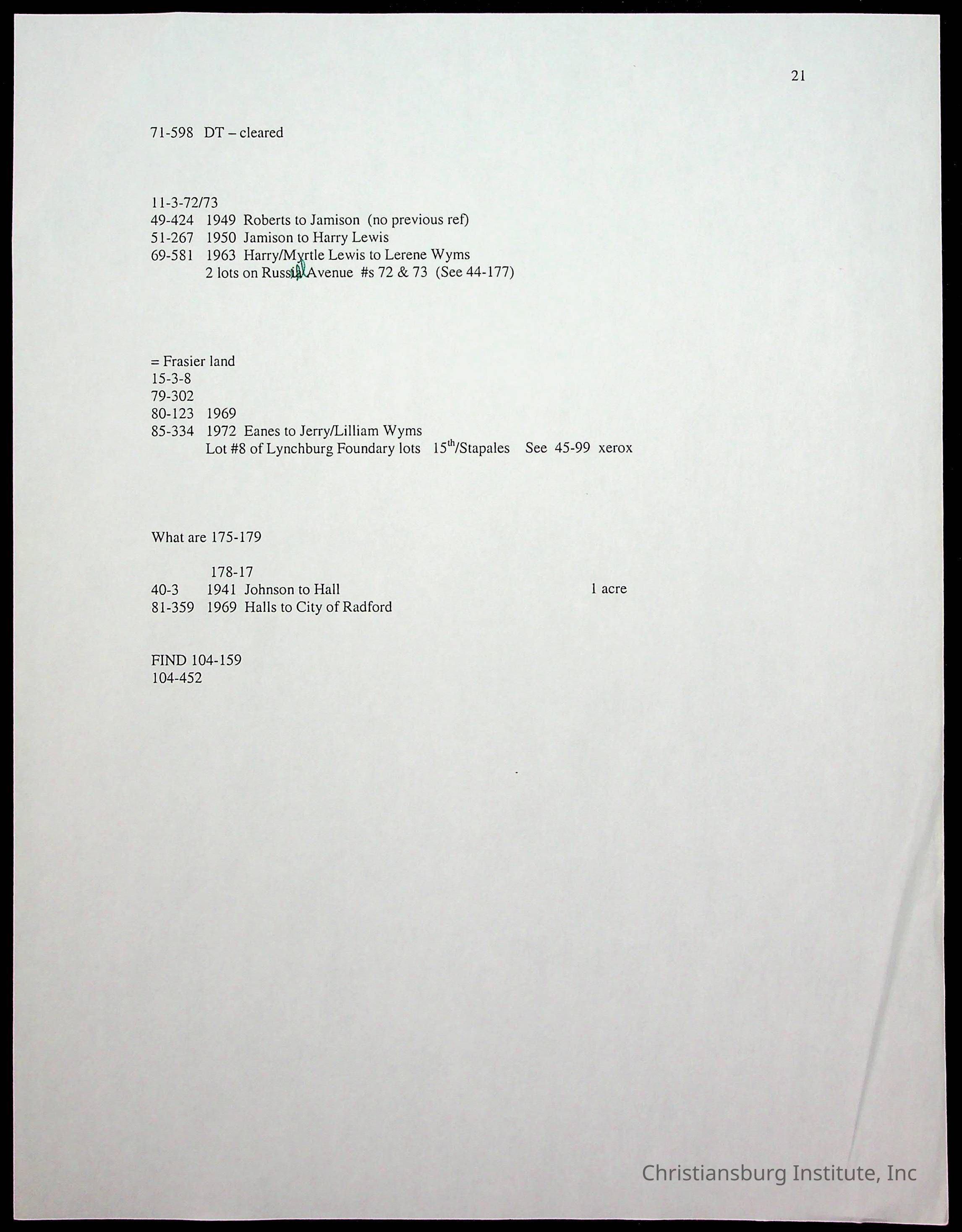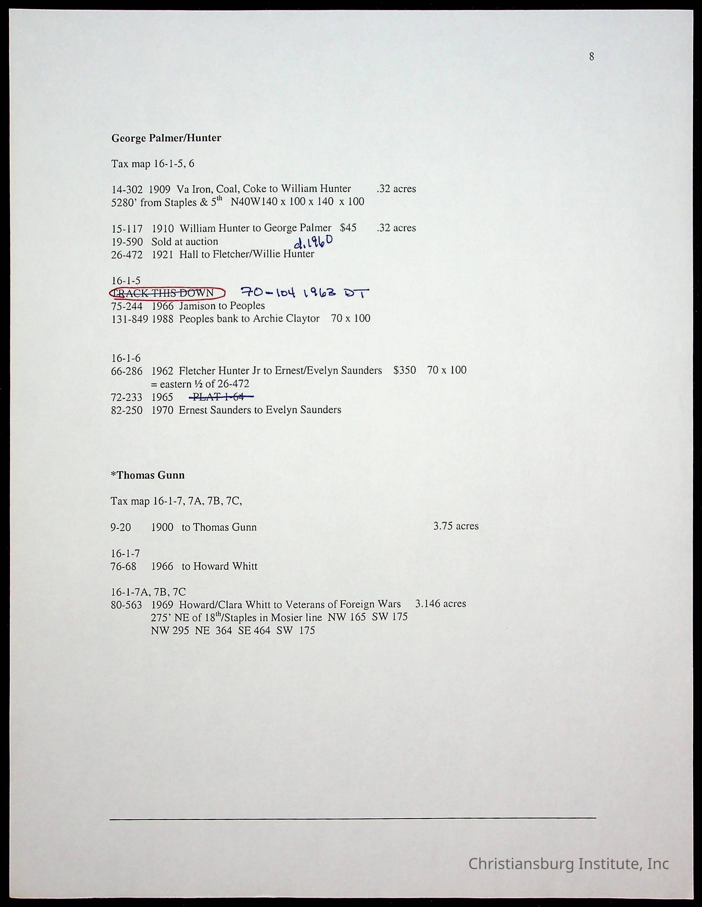 A folder of research materials collected by Radford University professor, Dr. Linda Killen. This folder is titled 'Land/Genealogy Research' and includes various research conducted in Radford, Virginia. This folder includes genealogy records, Dr Killen's notes, and plat maps.