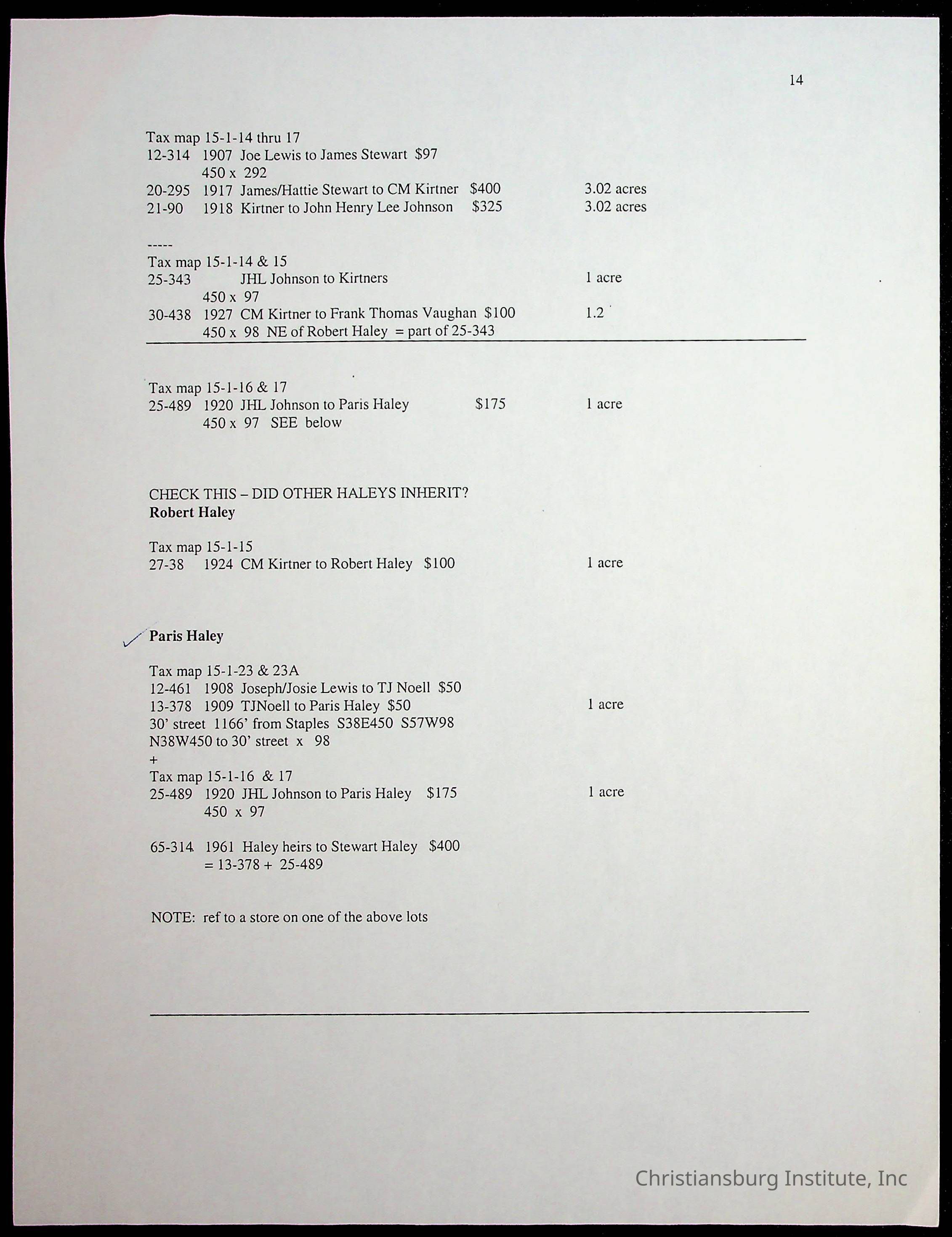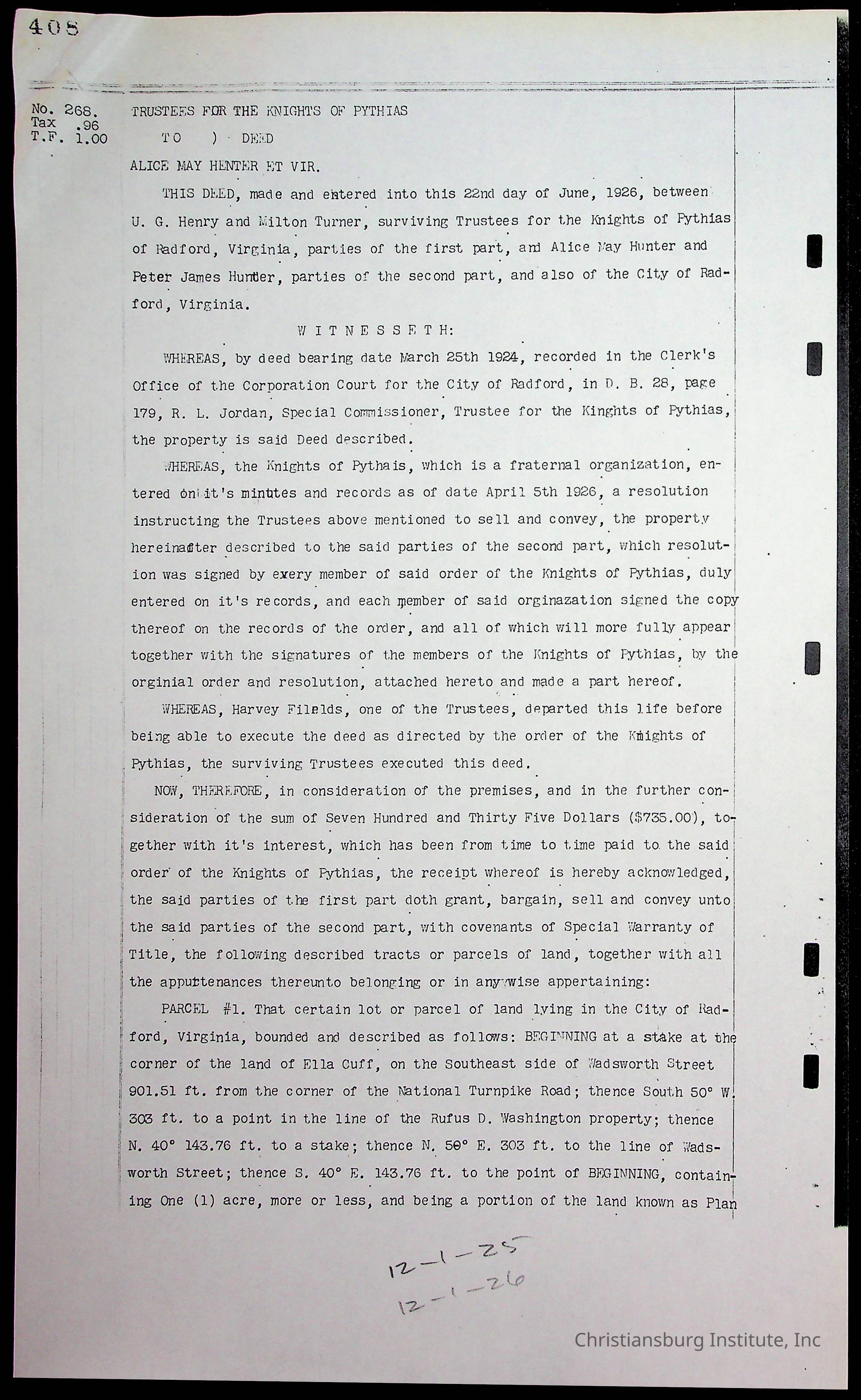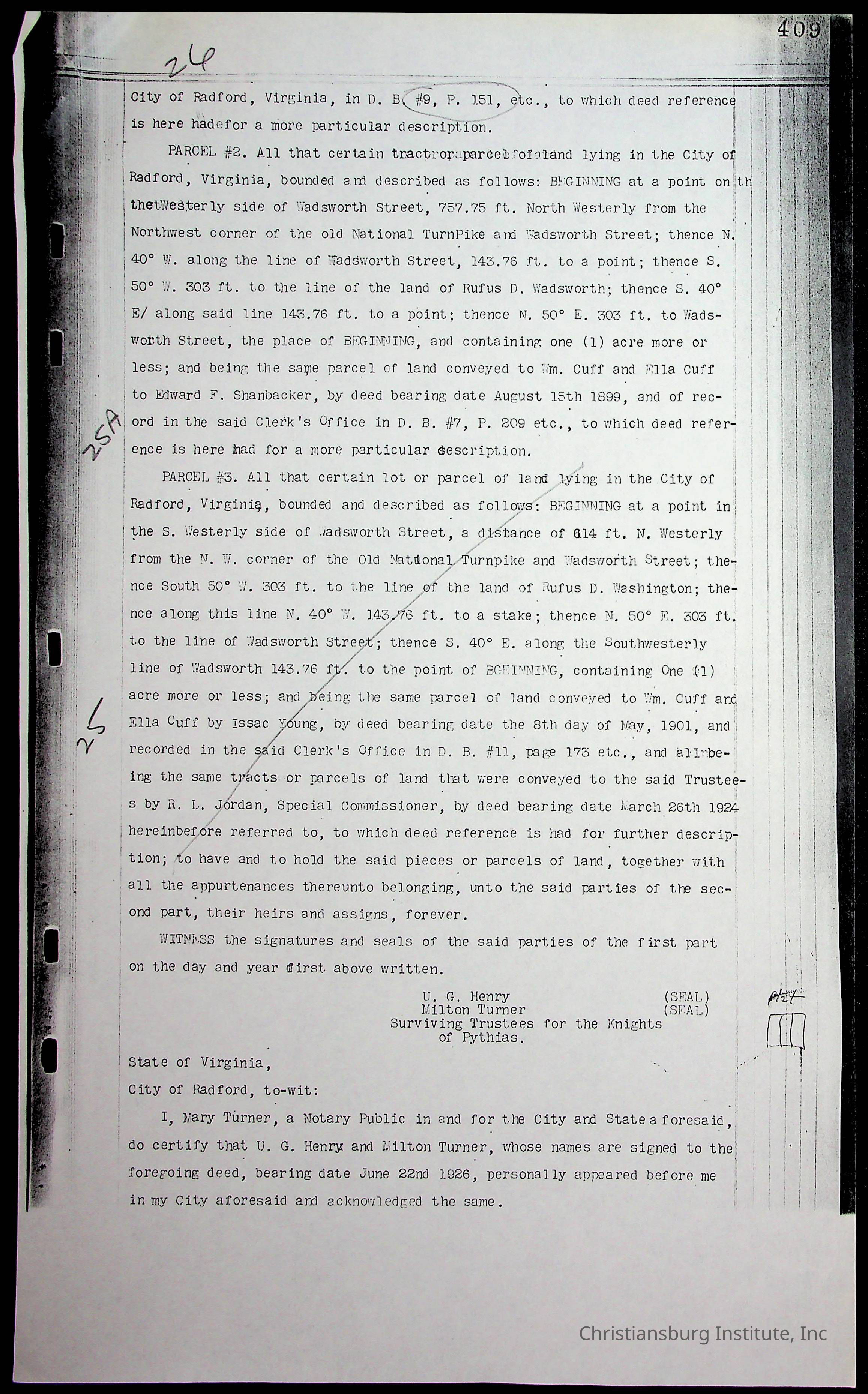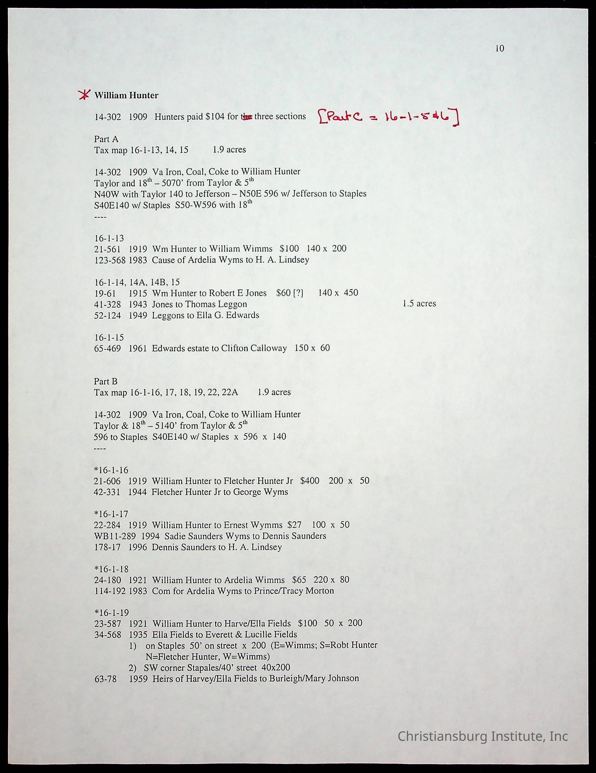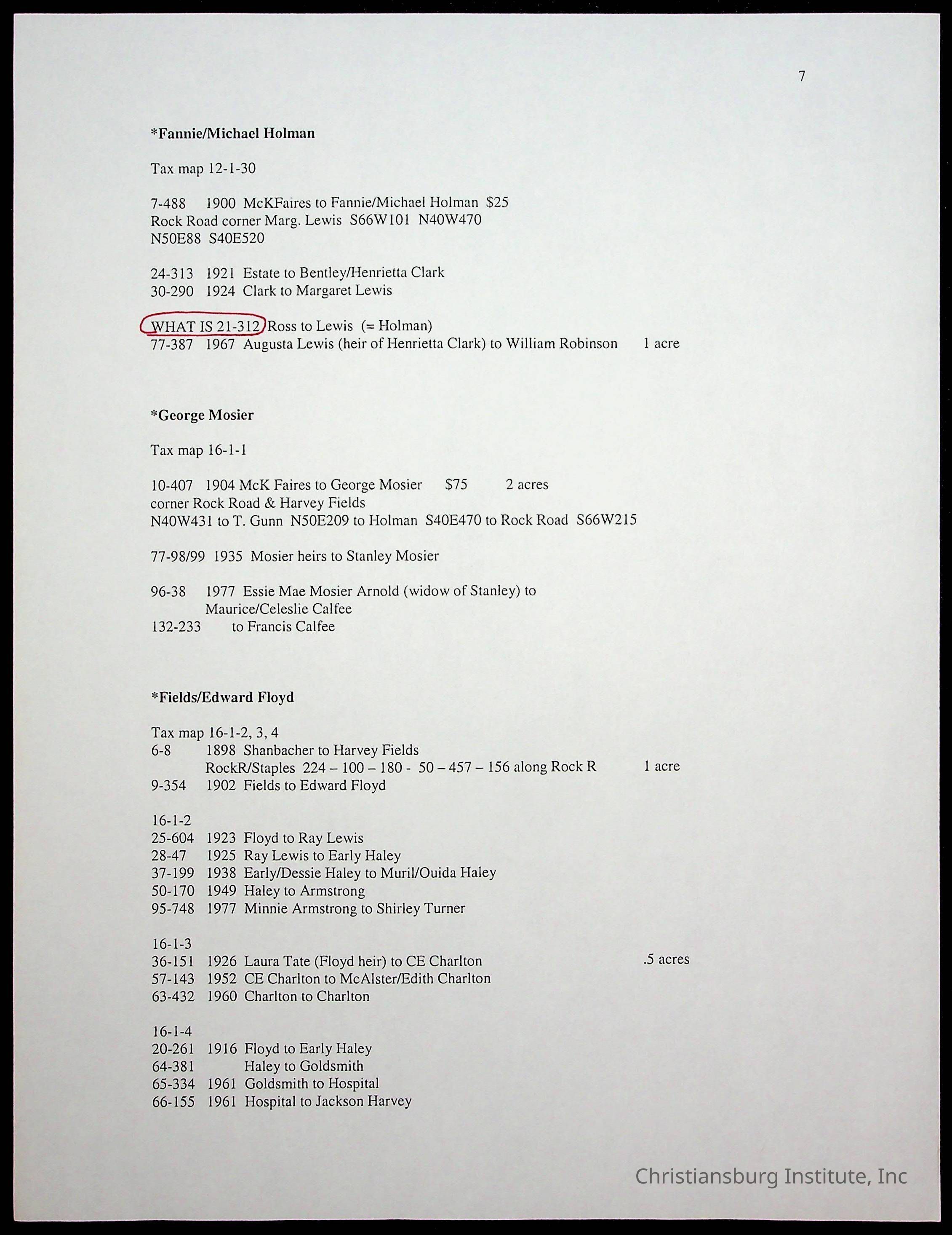 A folder of research materials collected by Radford University professor, Dr. Linda Killen. This folder is titled 'Land/Genealogy Research' and includes various research conducted in Radford, Virginia. This folder includes genealogy records, Dr Killen's notes, and plat maps.
