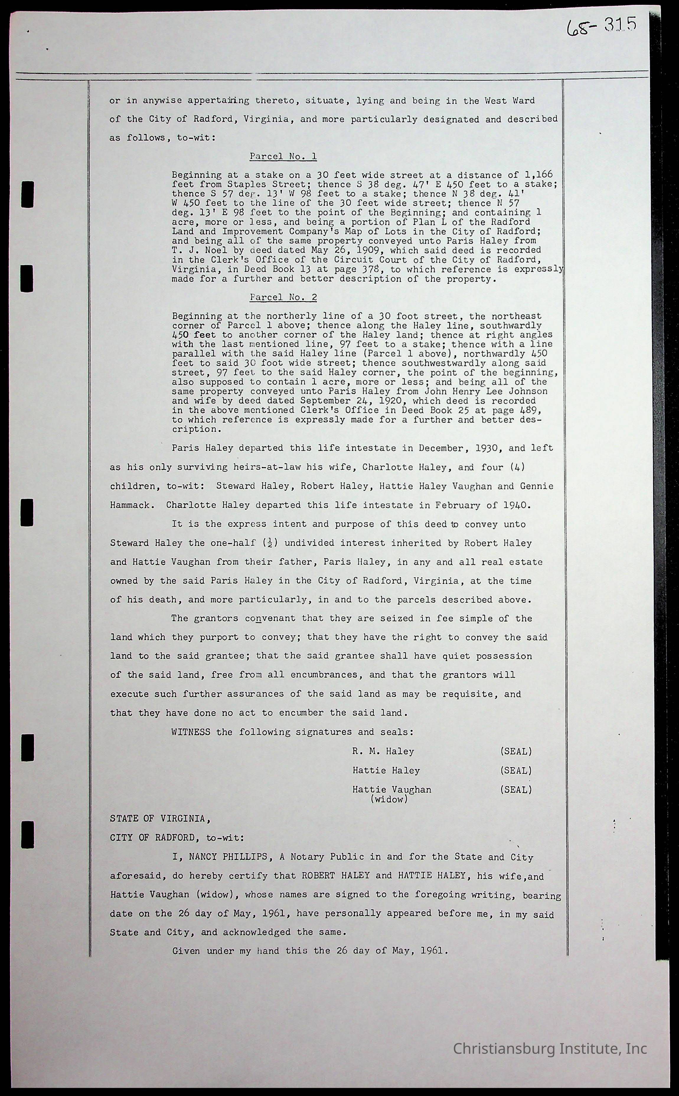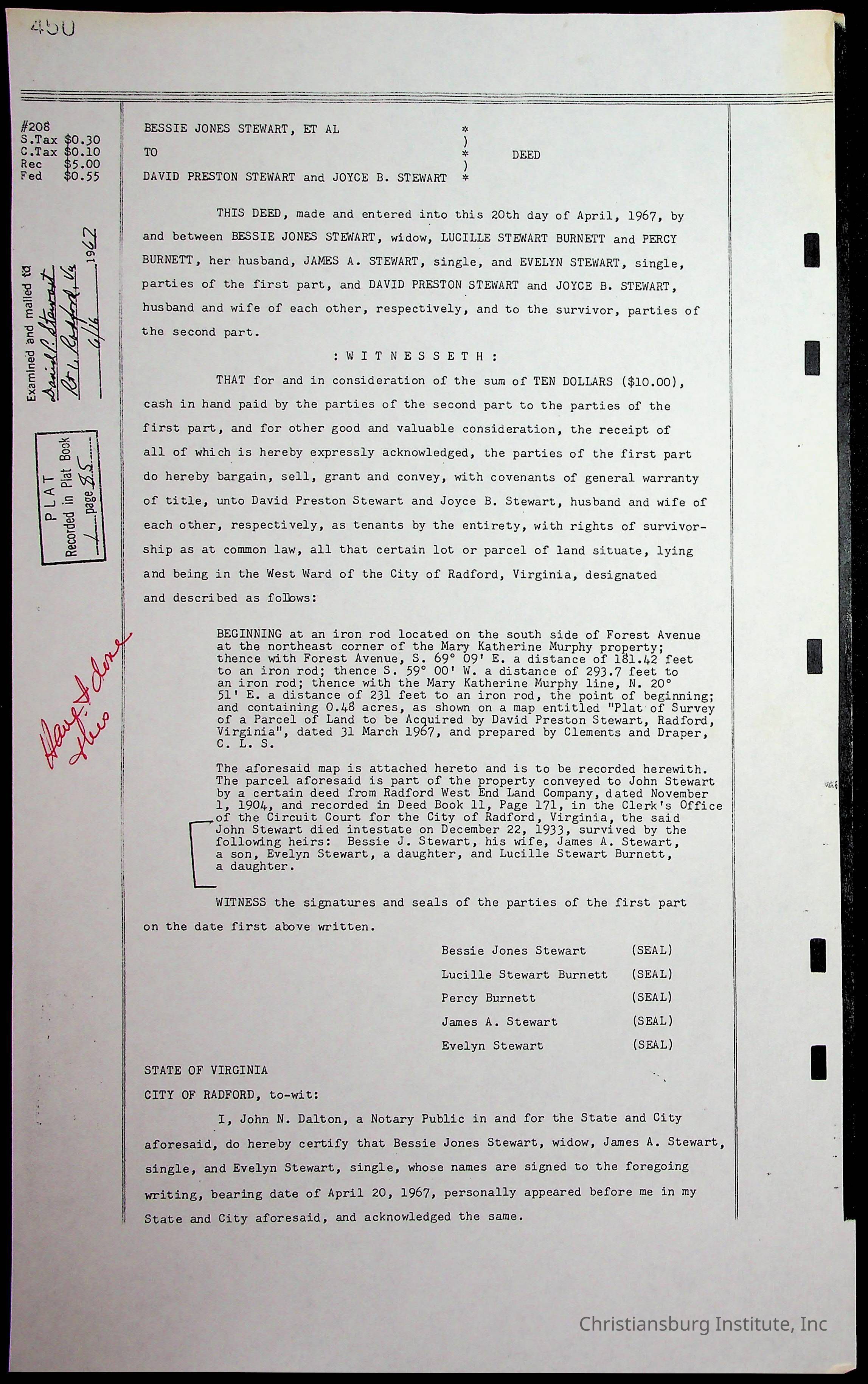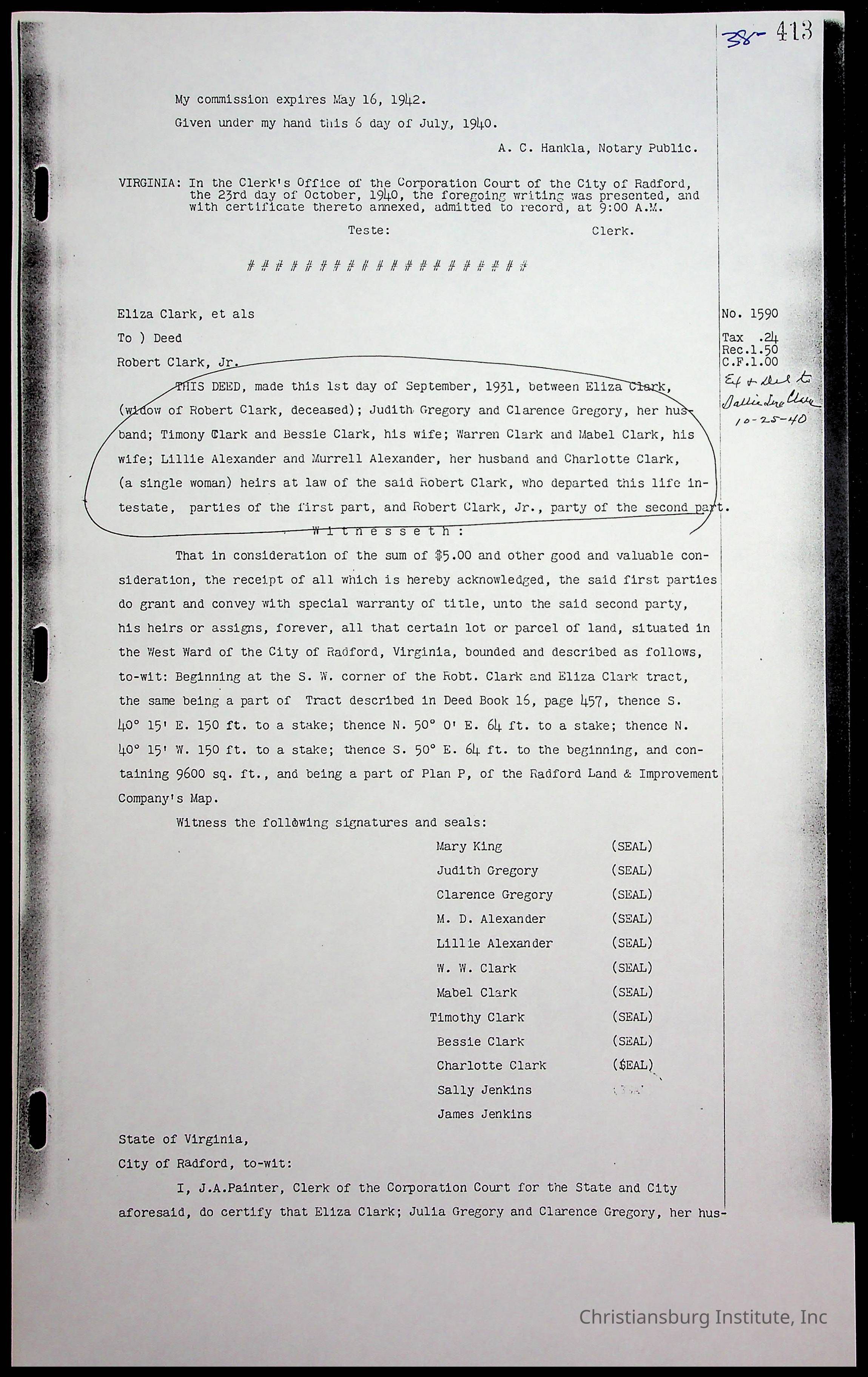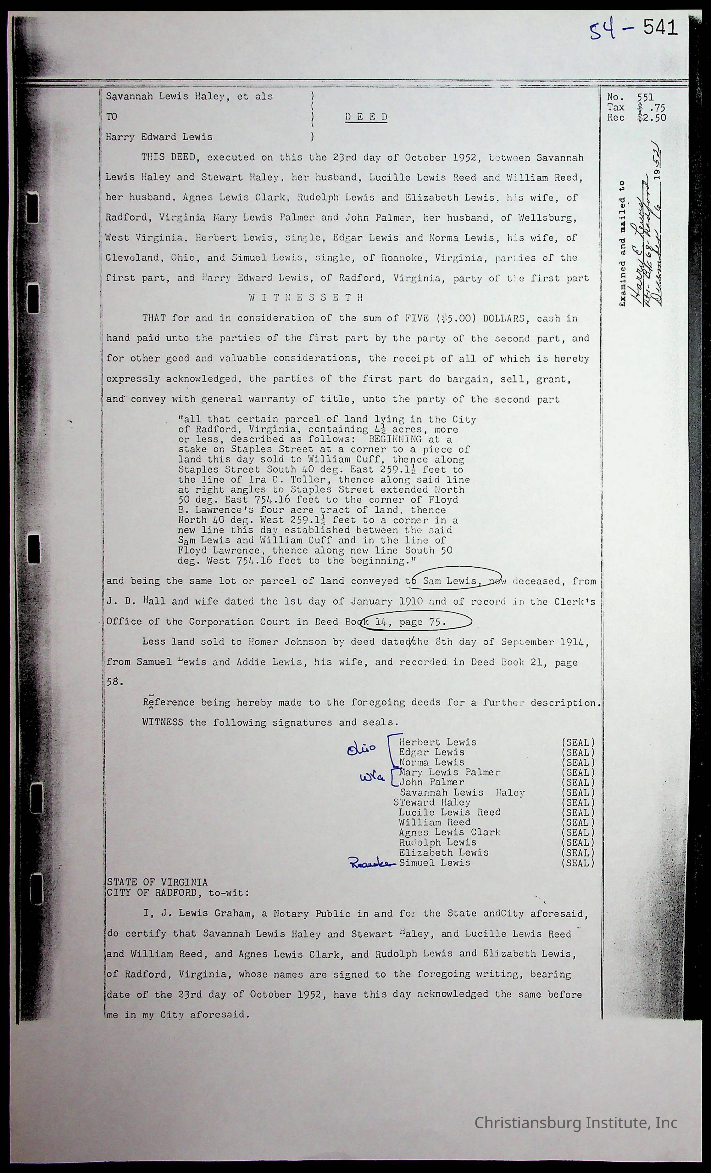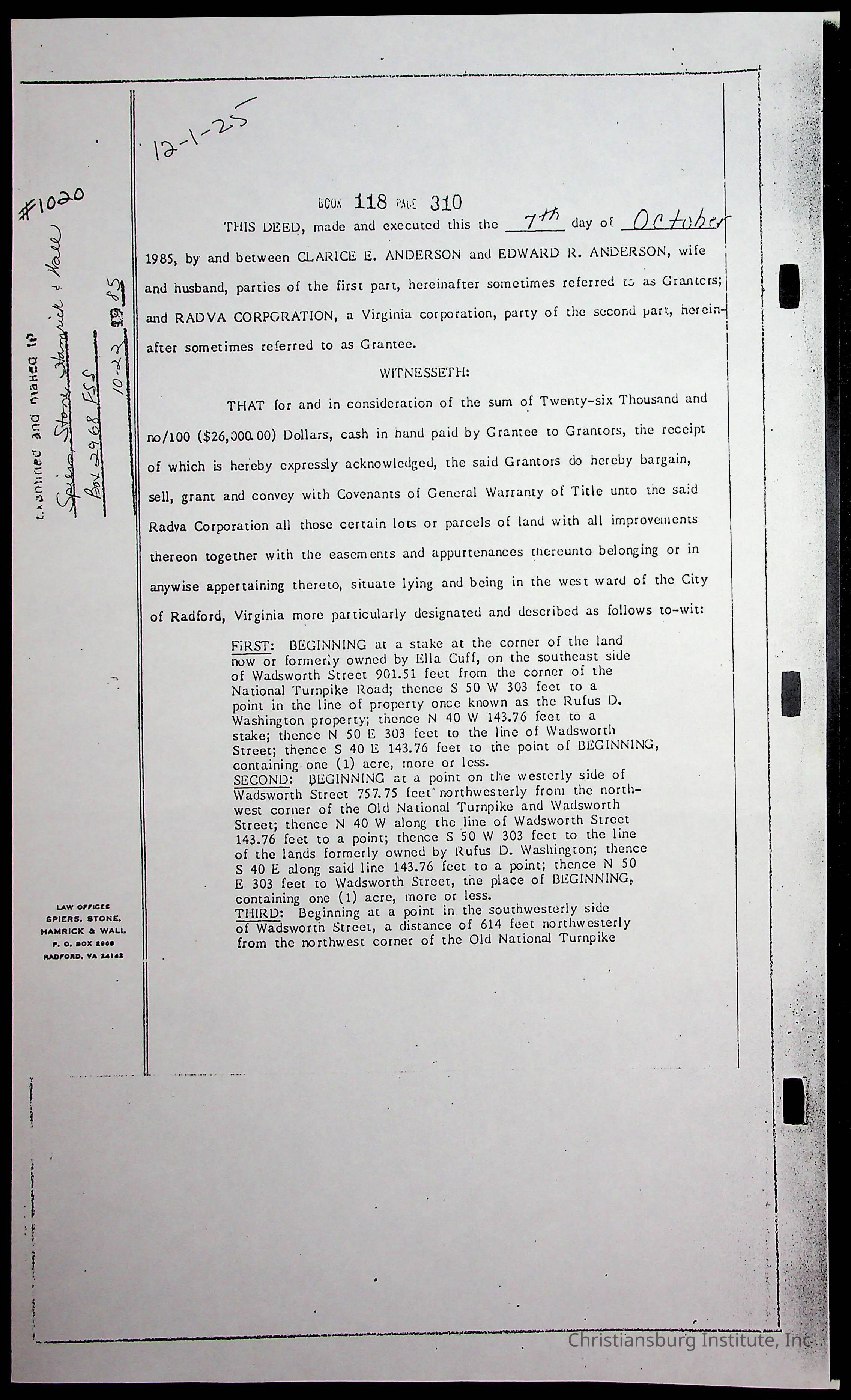 A folder of research materials collected by Radford University professor, Dr. Linda Killen. This folder is titled 'Land/Genealogy Research' and includes various research conducted in Radford, Virginia. This folder includes genealogy records, Dr Killen's notes, and plat maps.