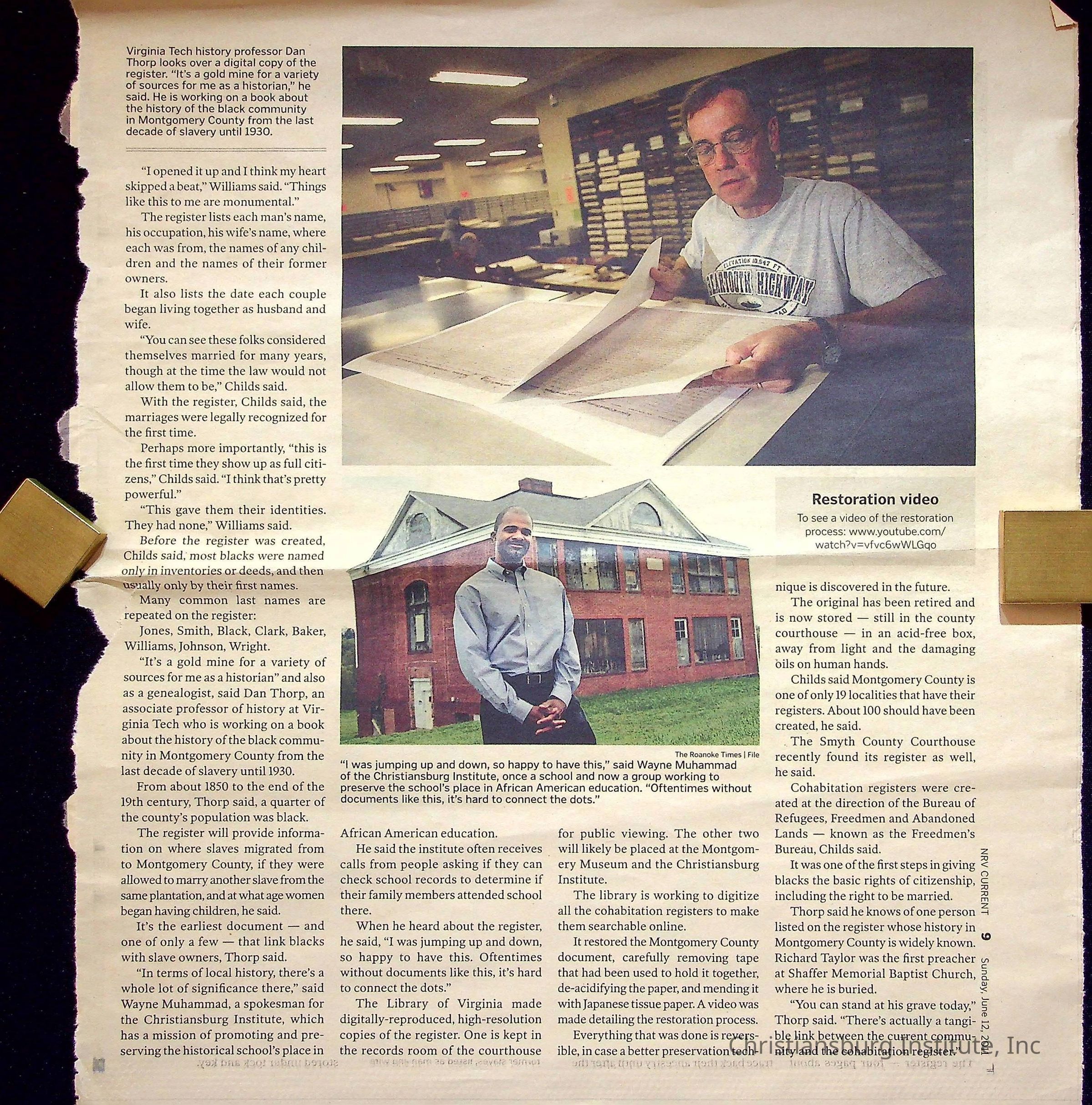 A newspaper clipping from NRV Current from June 12th, 2011 that discusses genealogy and references Christiansburg Institute.Collection