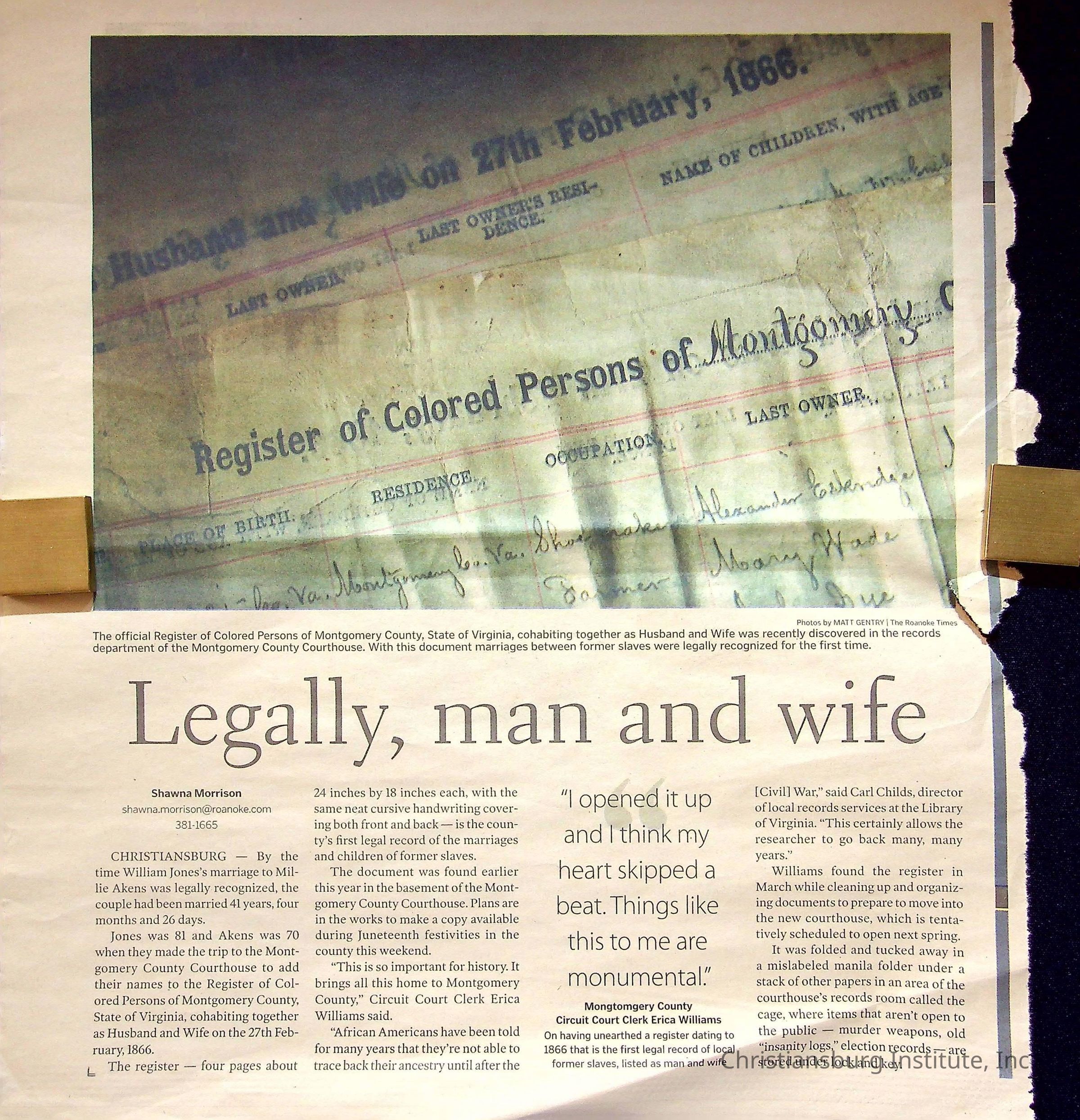 “Legally, man and wife,” NRV Current, June 12, 2011Description
