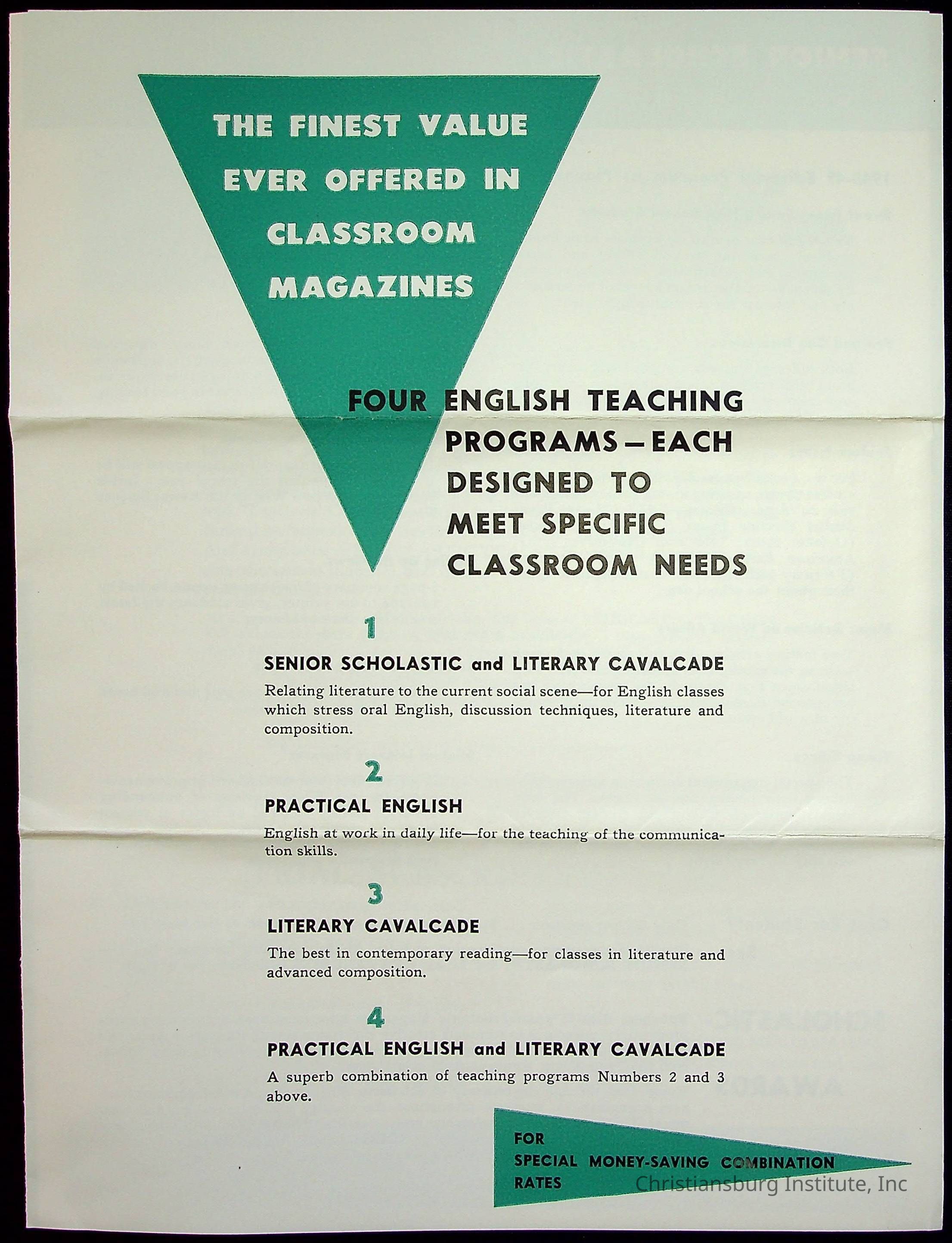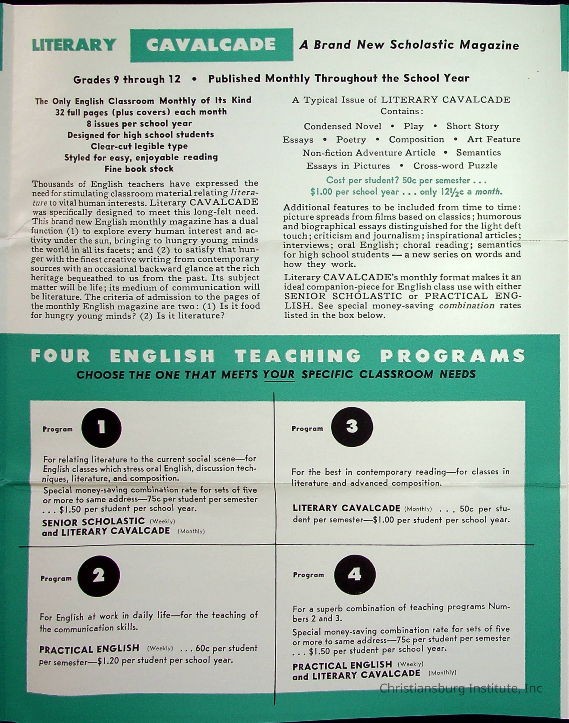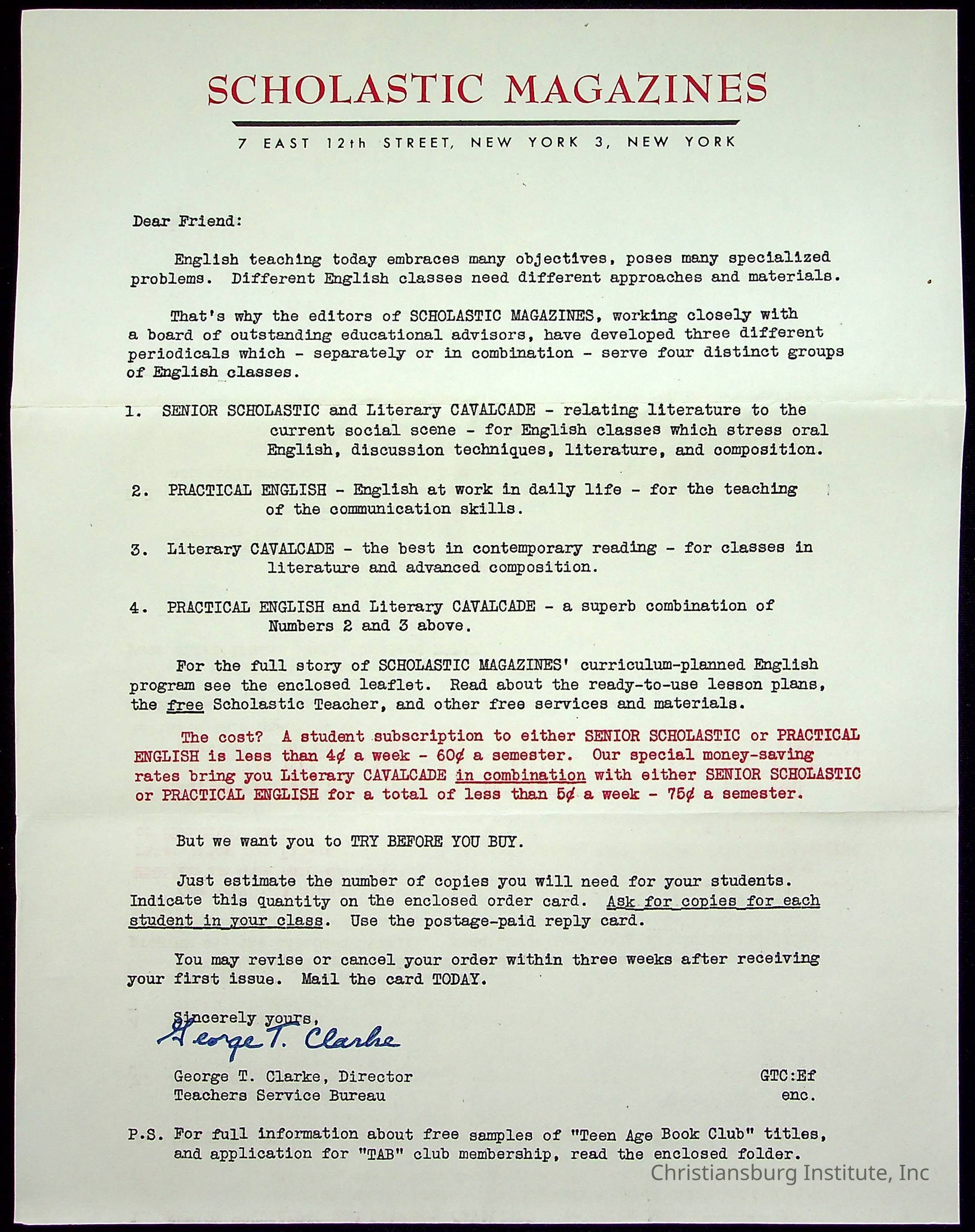 A letter from the Scholastic Magazines' director of teachers service bureau, George T. Clarke to Viola Charlton offering a magazine English classroom curriculum, undated.Collection