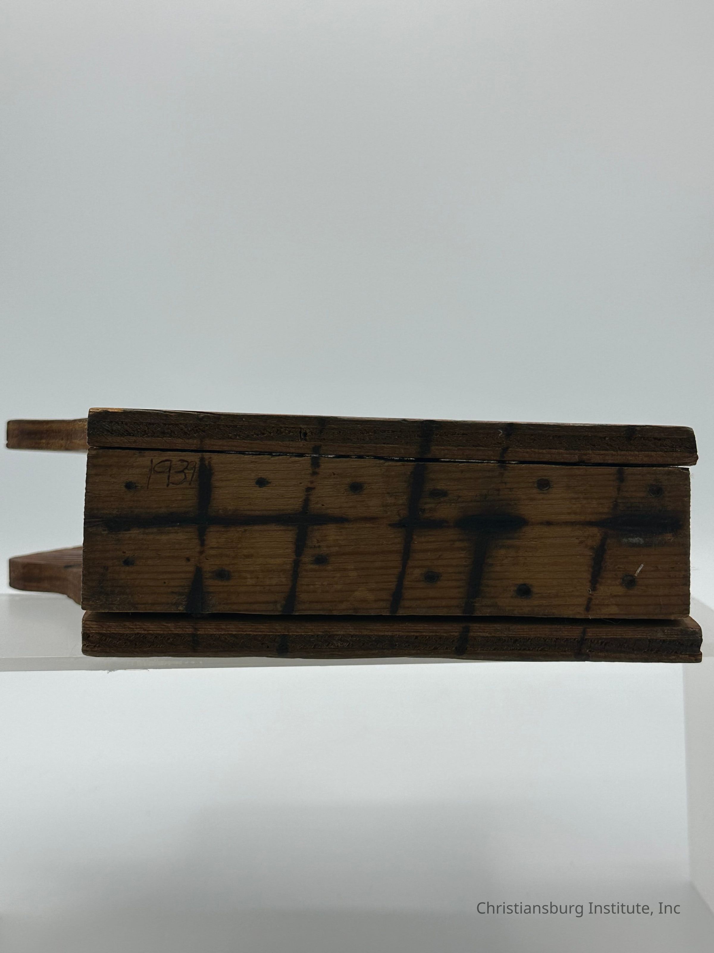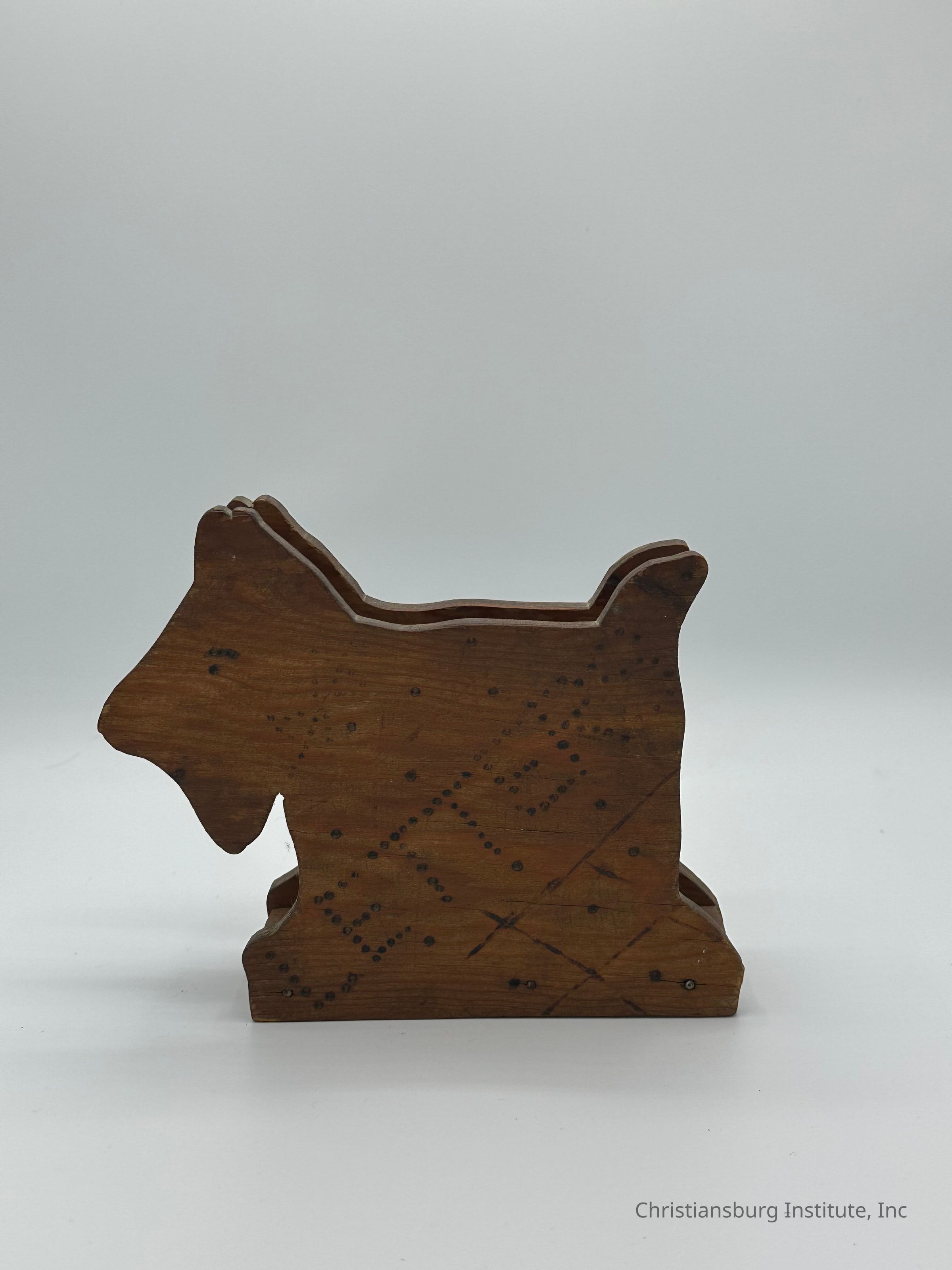A wooden dog-shaped letter holder made by Cora Pack, dated 1939.