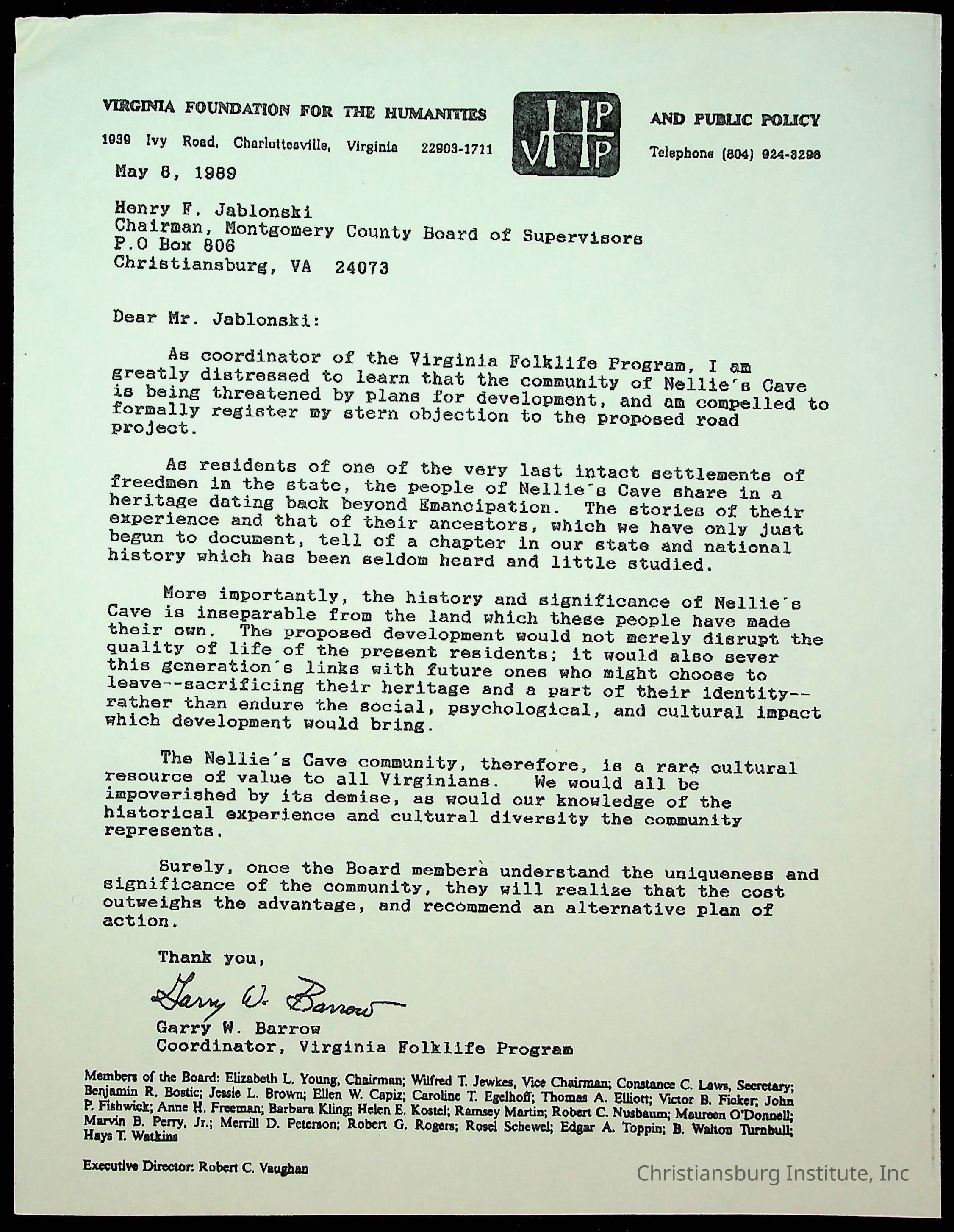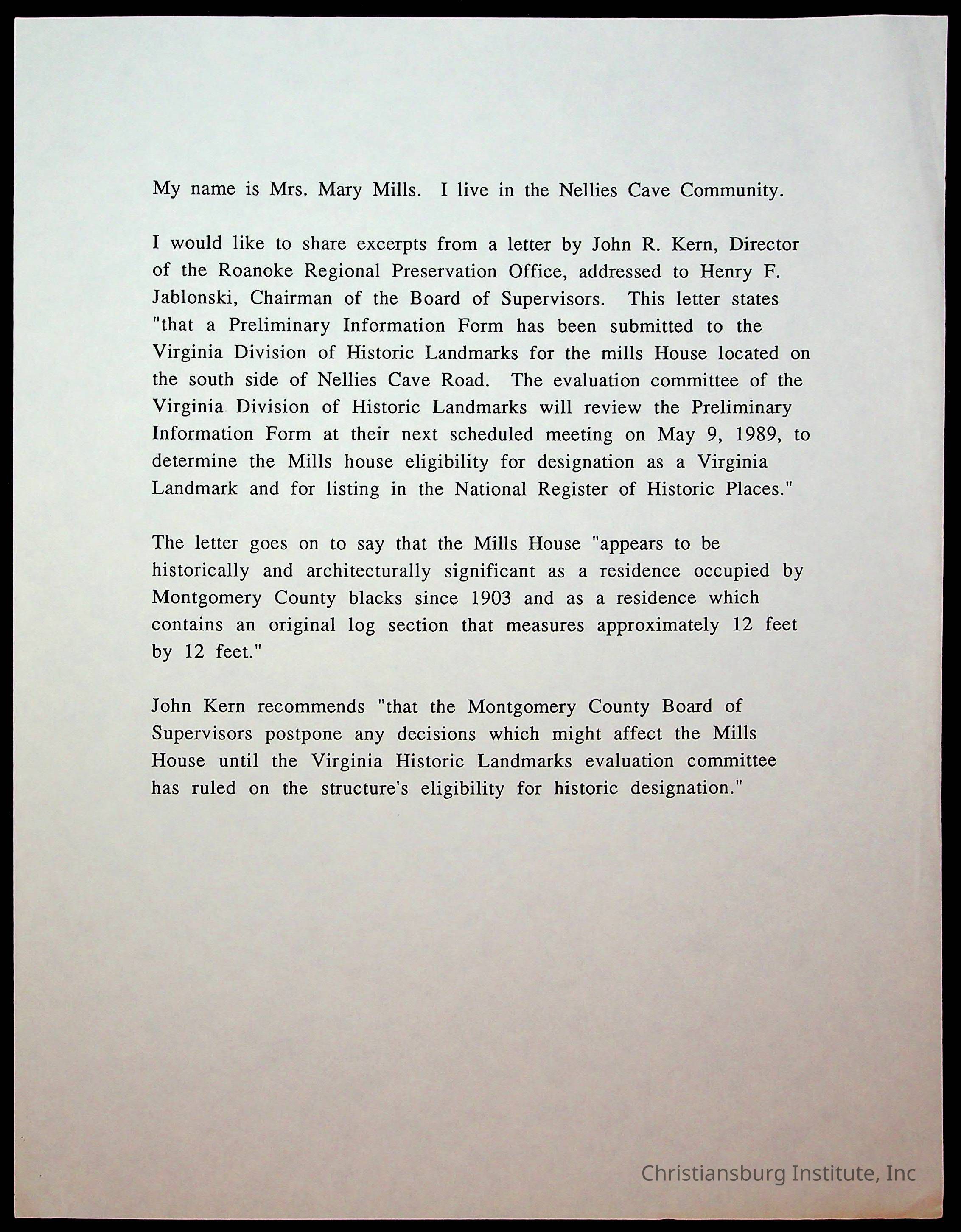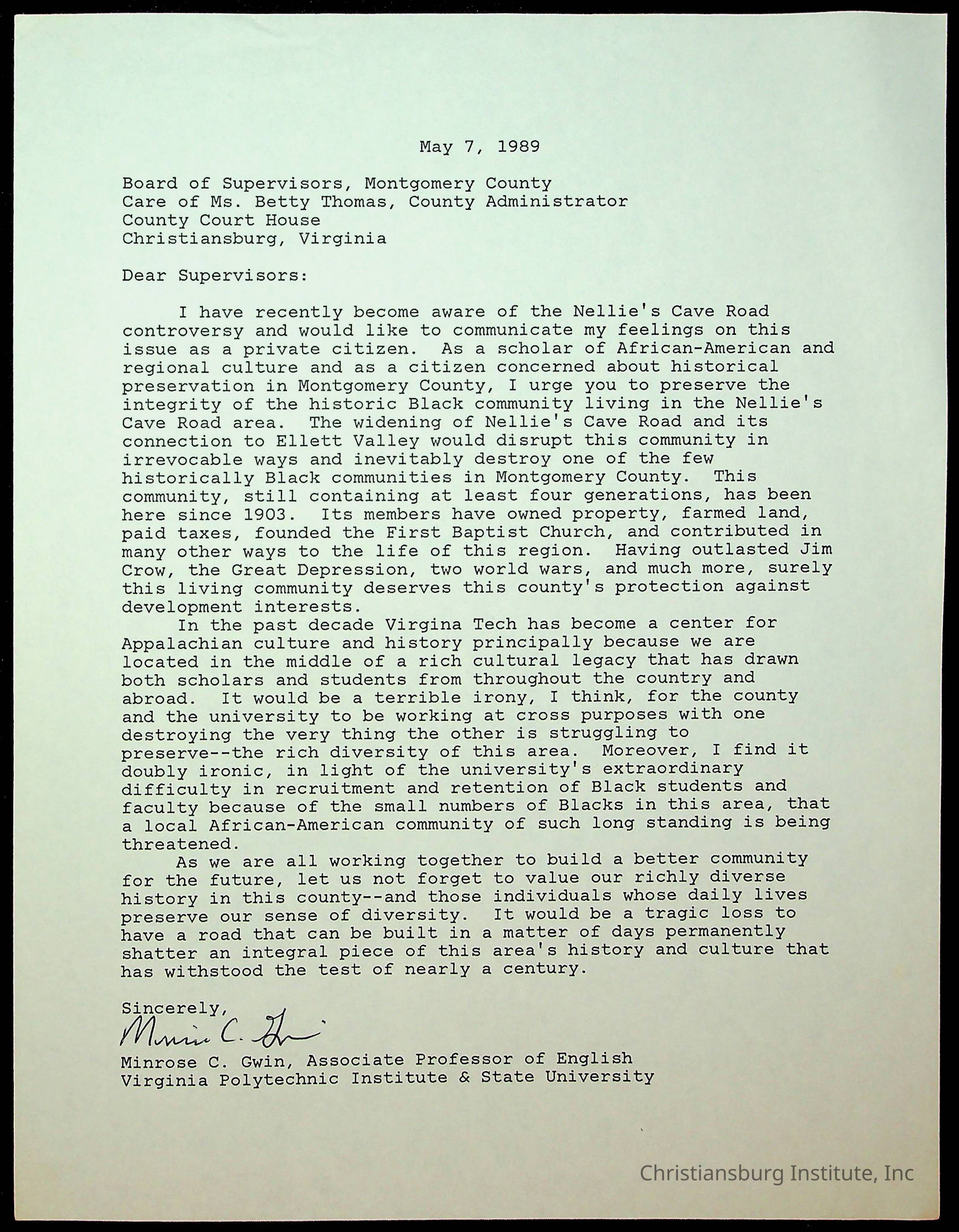 An archive of letters to the Montgomery County Board of Supervisors from the Concerned Citizens for Nellies Cave Community and other community members, compiled by Elizabeth Fine, circa 1990s.