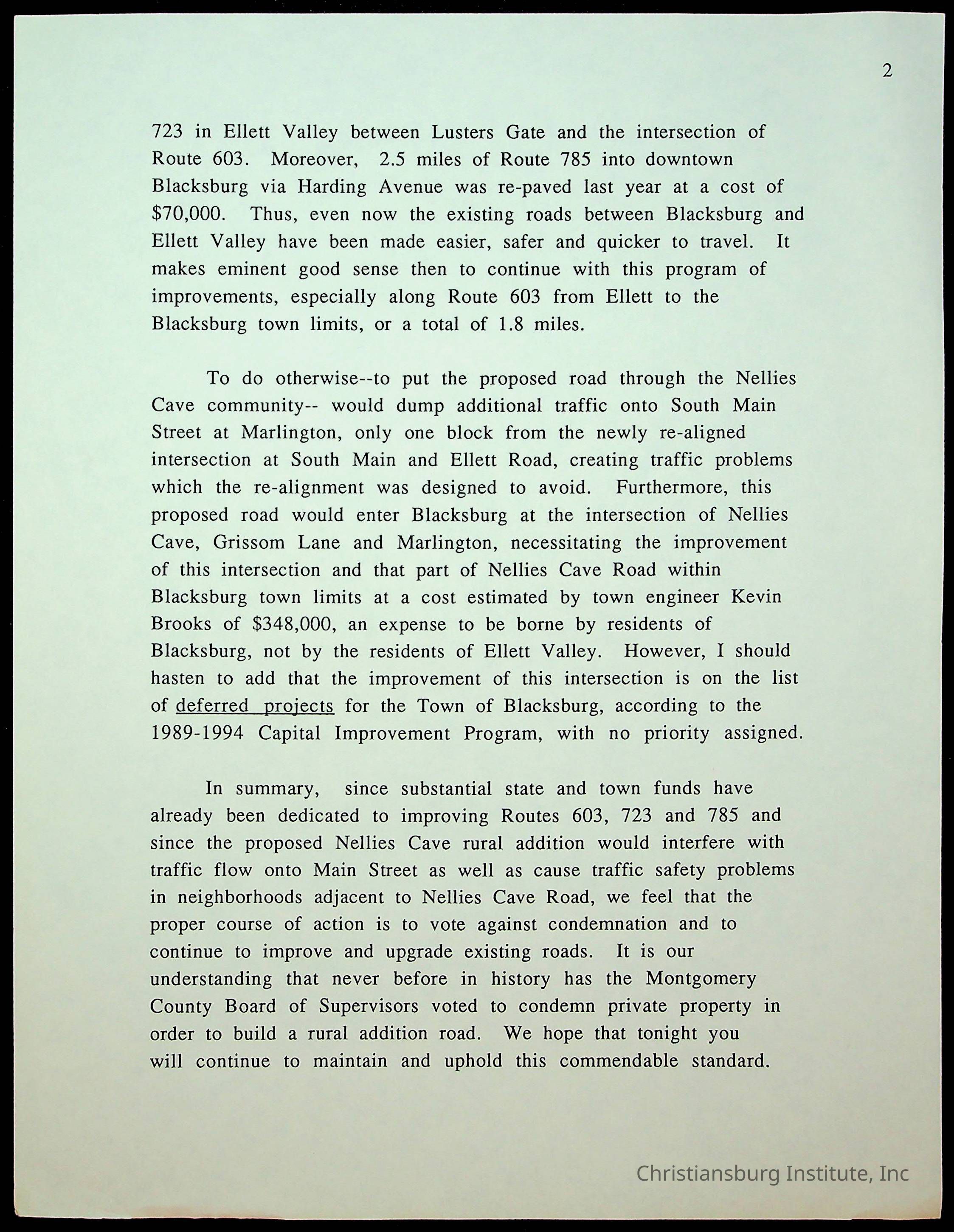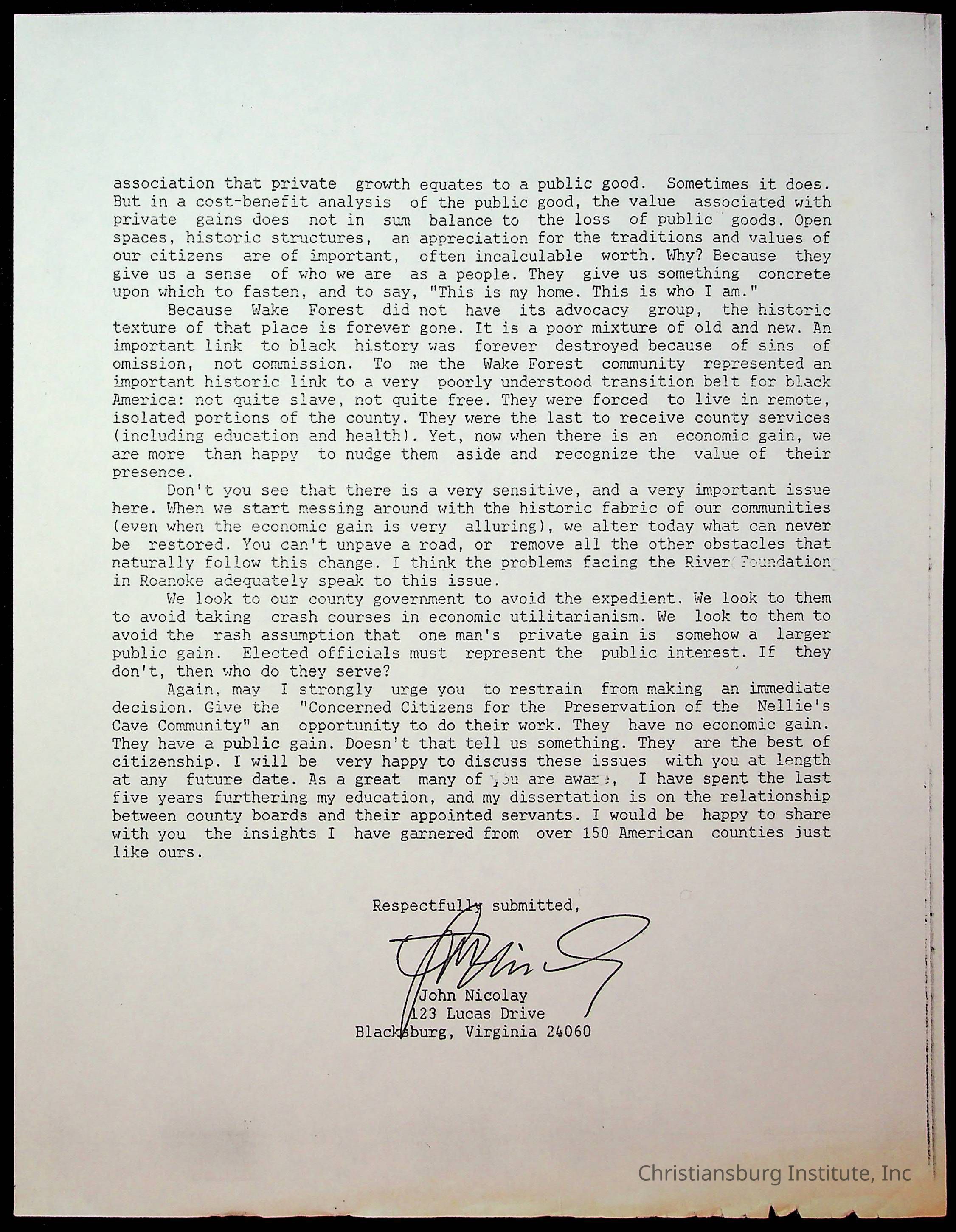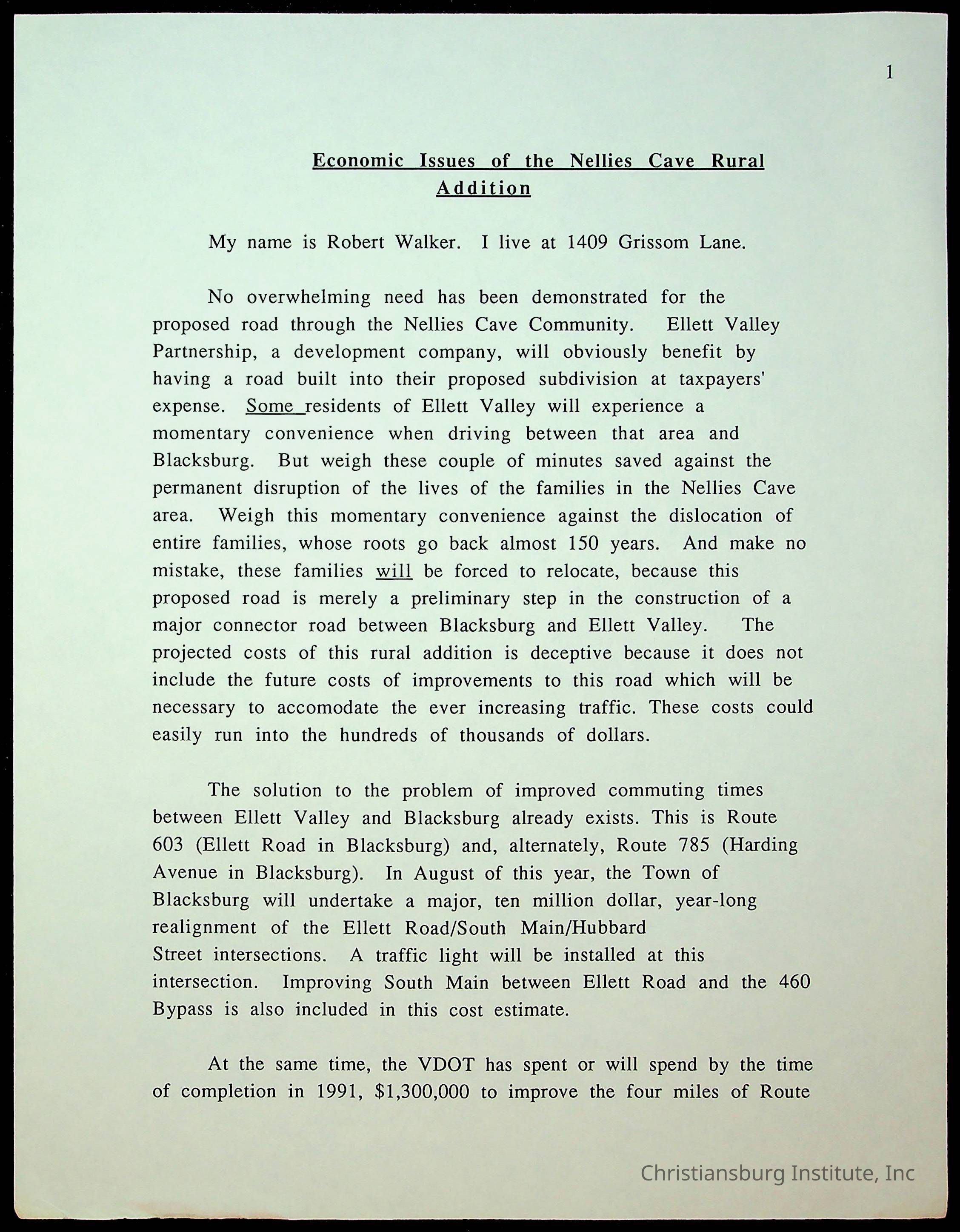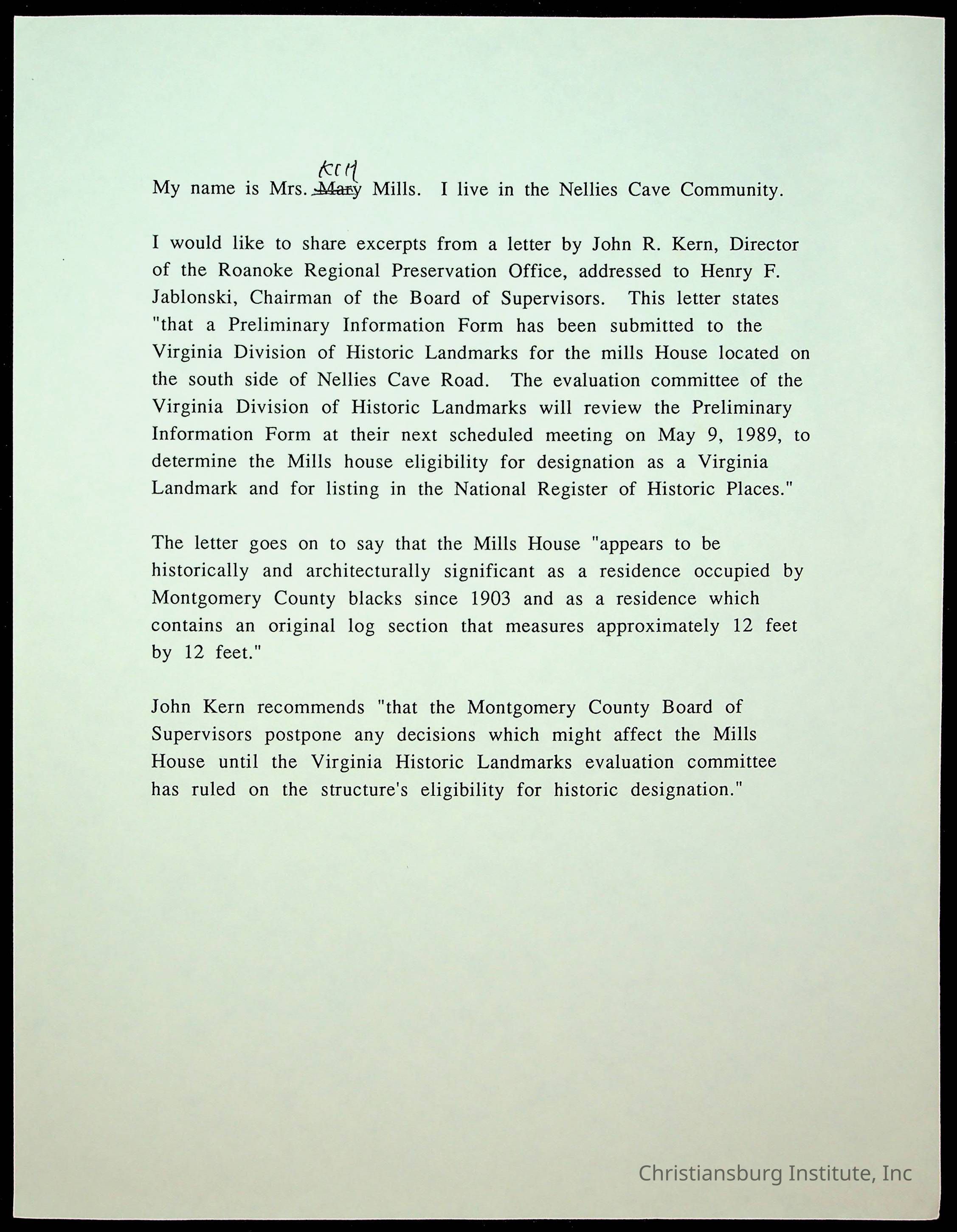 An archive of letters to the Montgomery County Board of Supervisors from the Concerned Citizens for Nellies Cave Community and other community members, compiled by Elizabeth Fine, circa 1990s.
