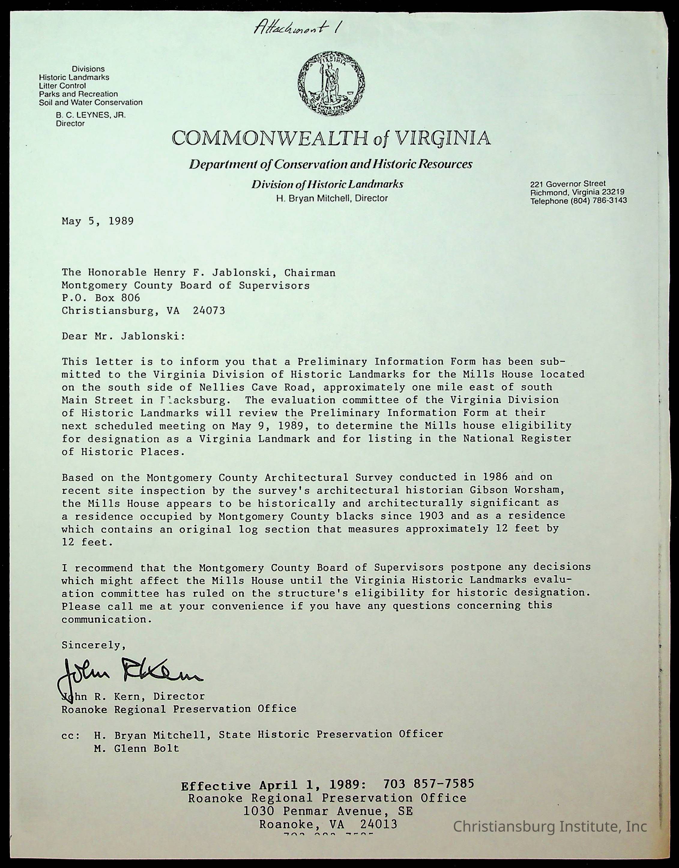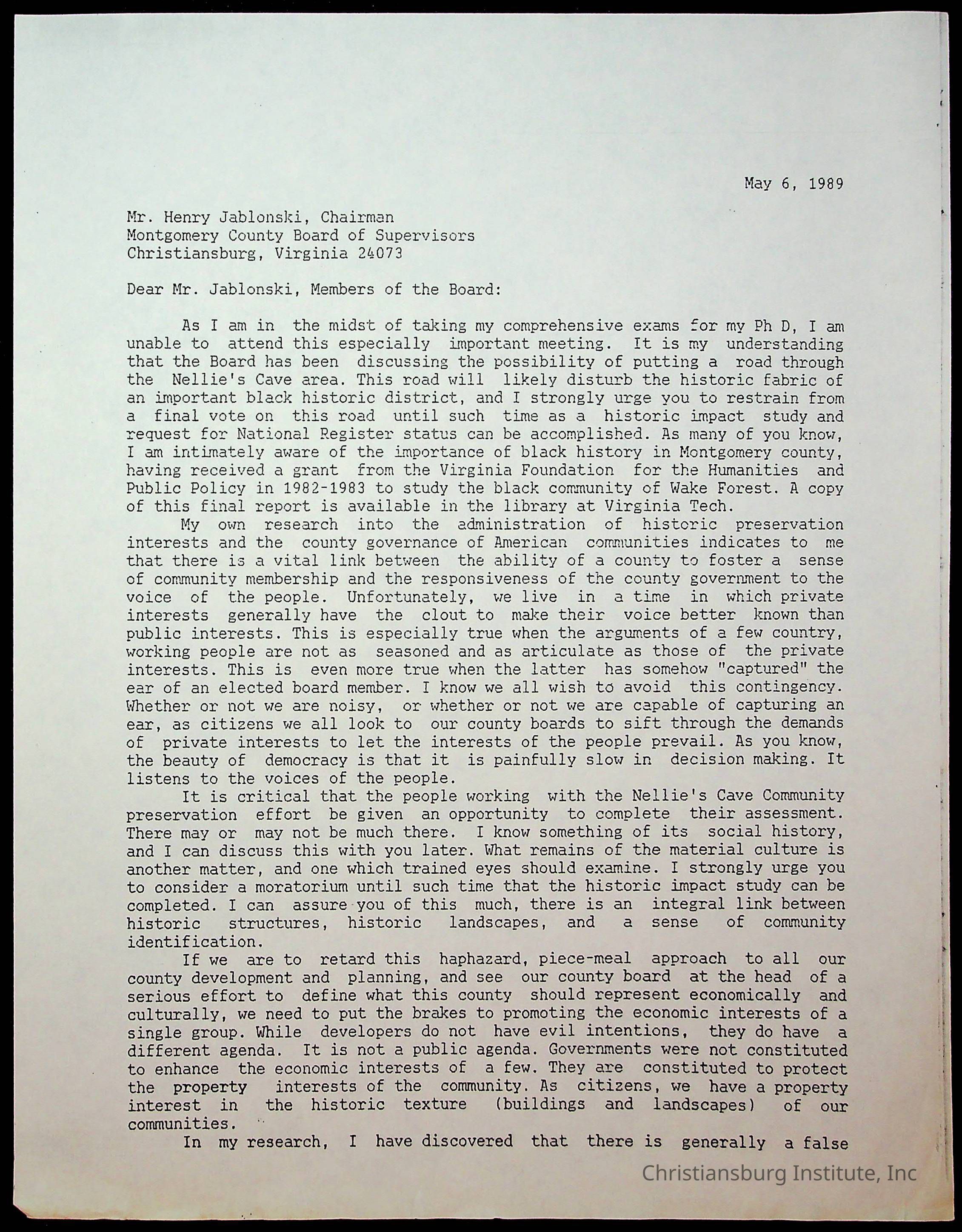 Letters to Montgomery County Board of Supervisors, May 1989