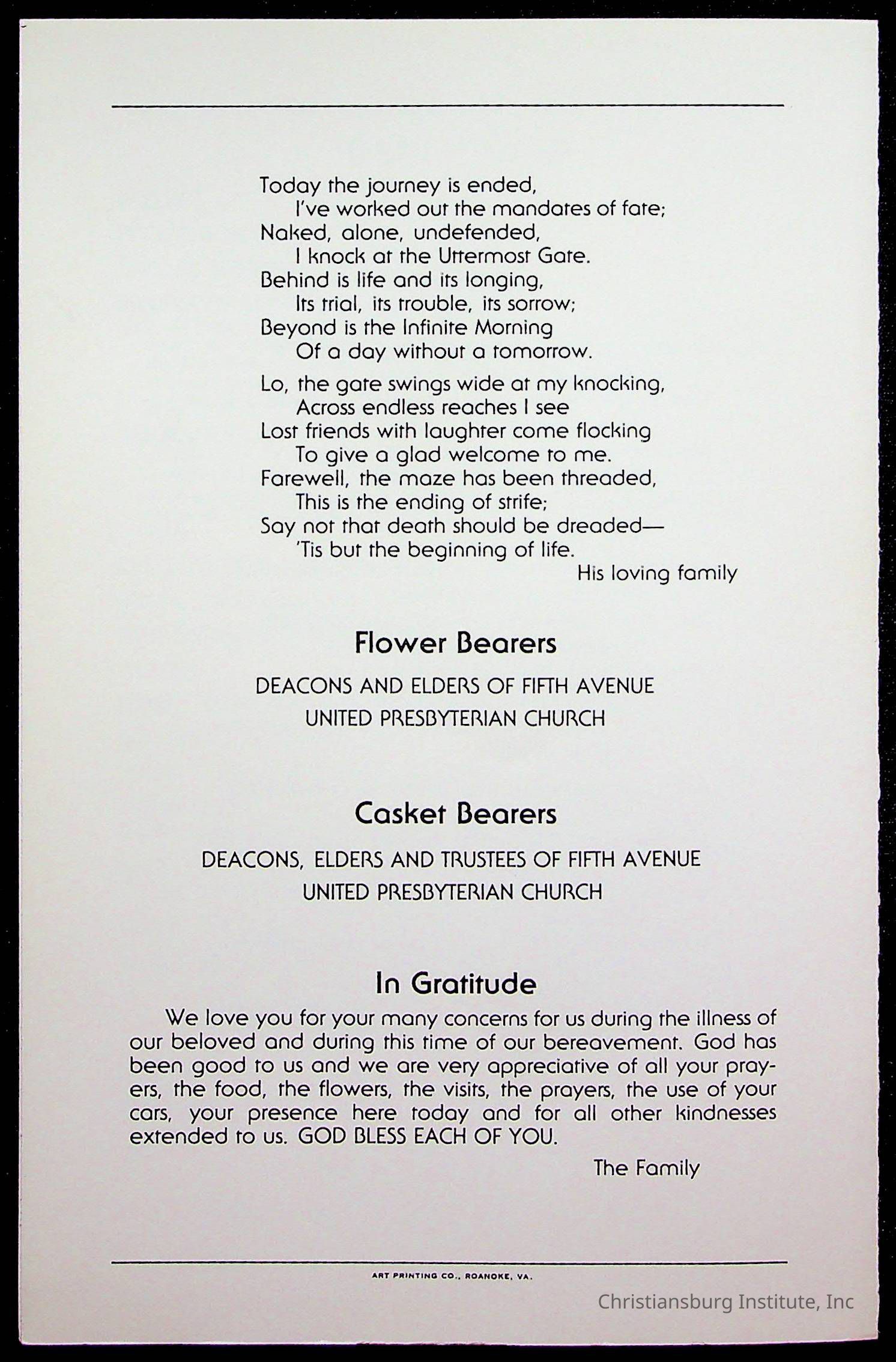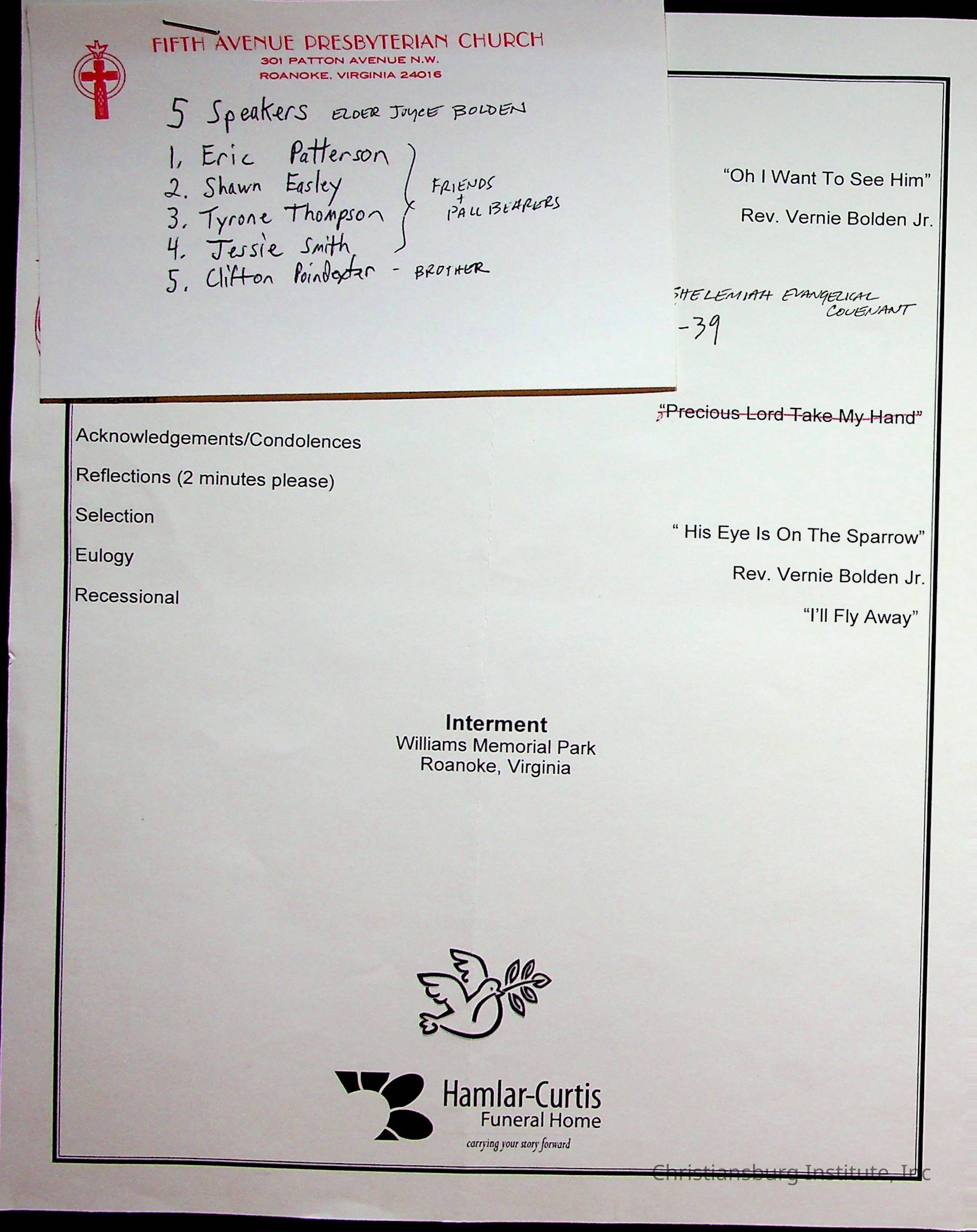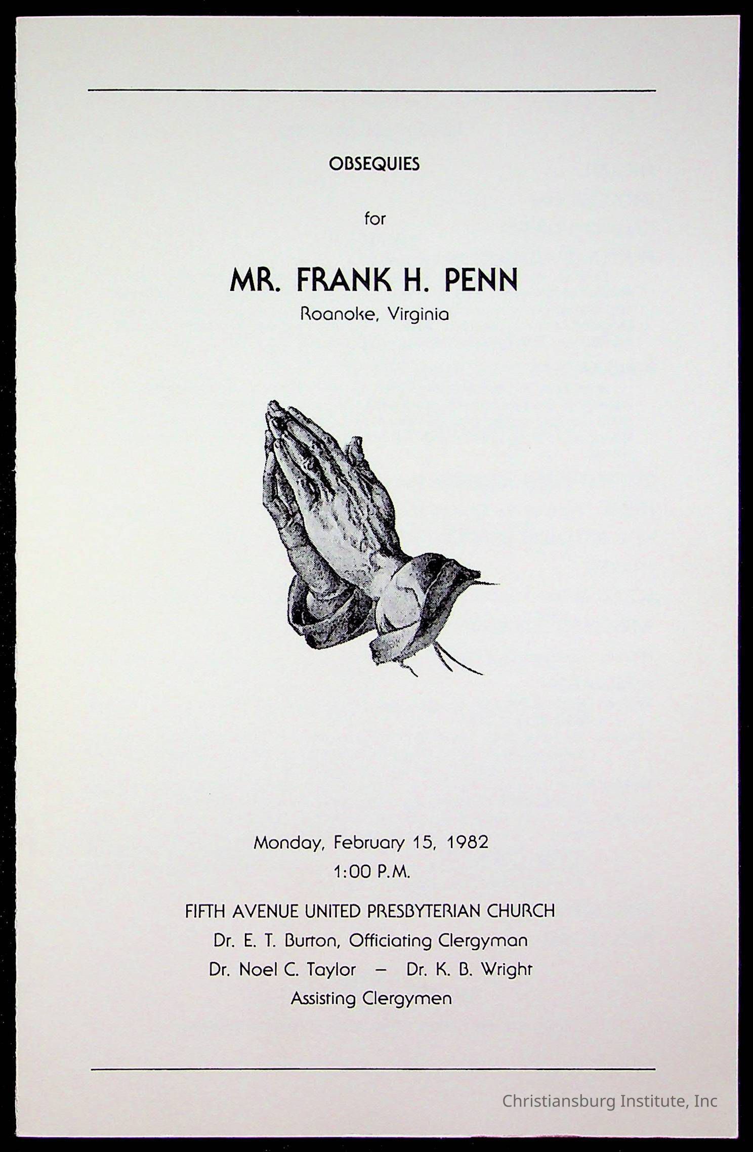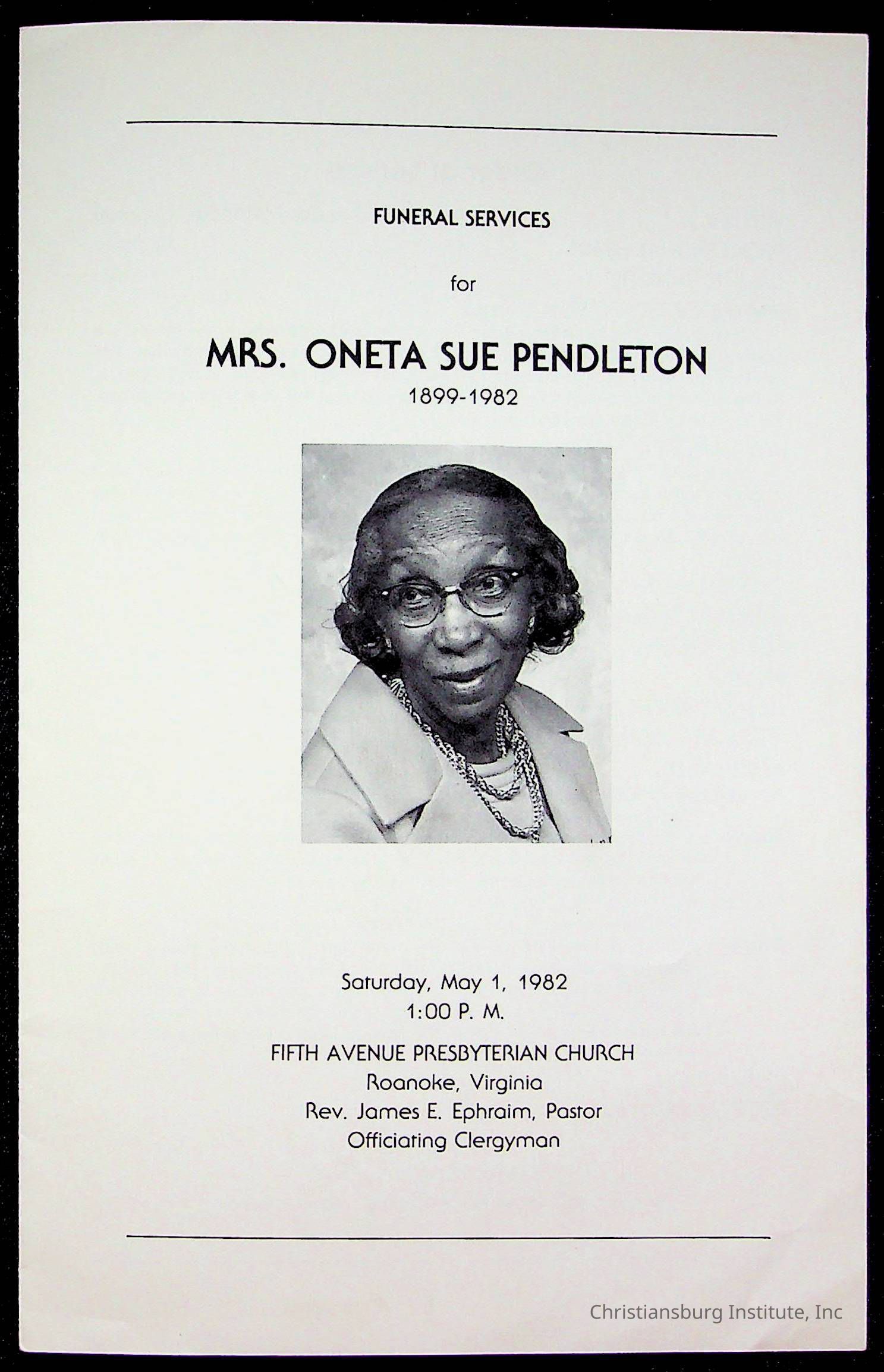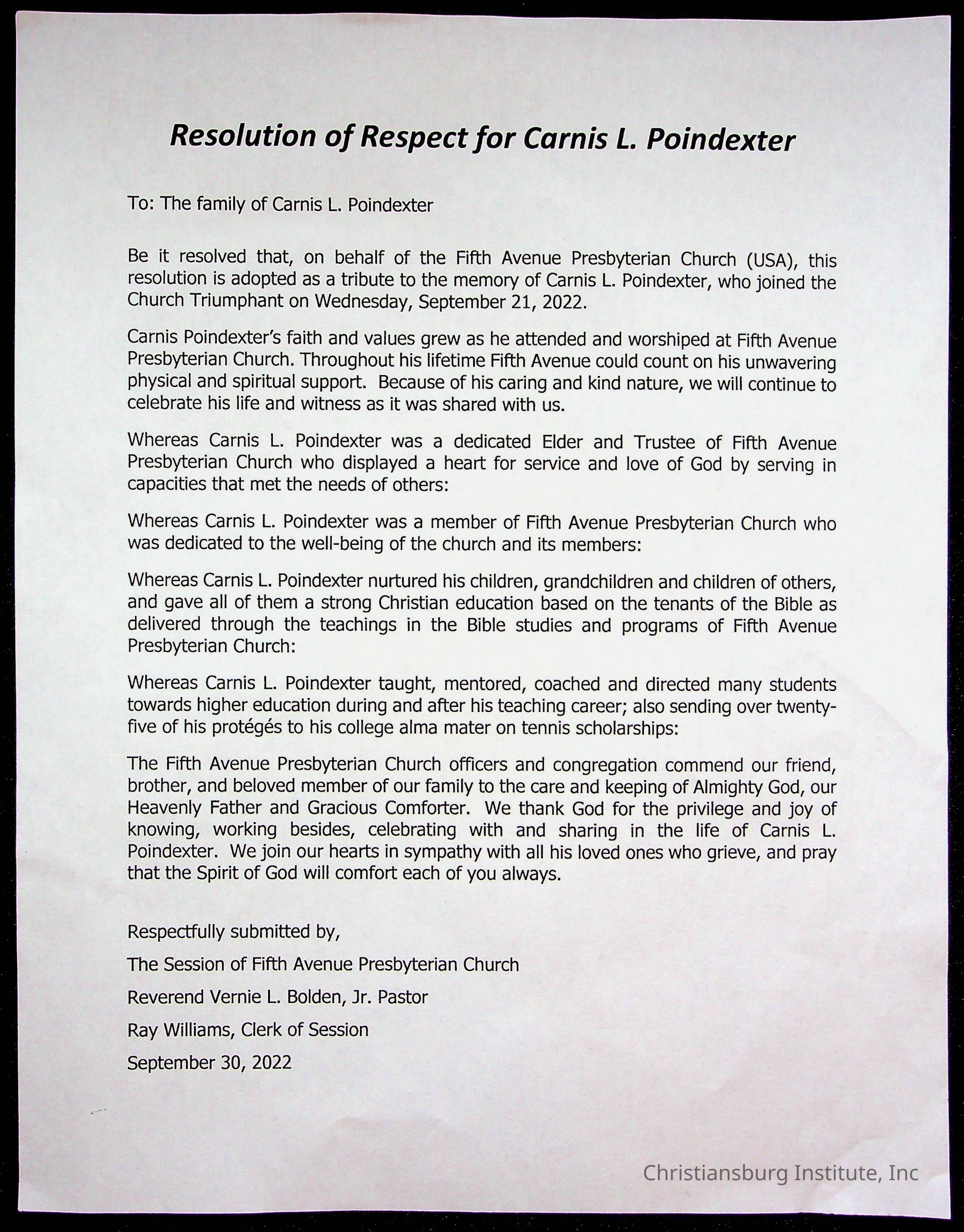 Copyright has been assigned to Christiansburg Institute Museum & Archives by Fifth Avenue Presbyterian Church. For permission to publish materials created by the donor, contact CIMA@christiansburginstitute.com. Materials not created by Fifth Avenue Presbyterian Church may still be under copyright.