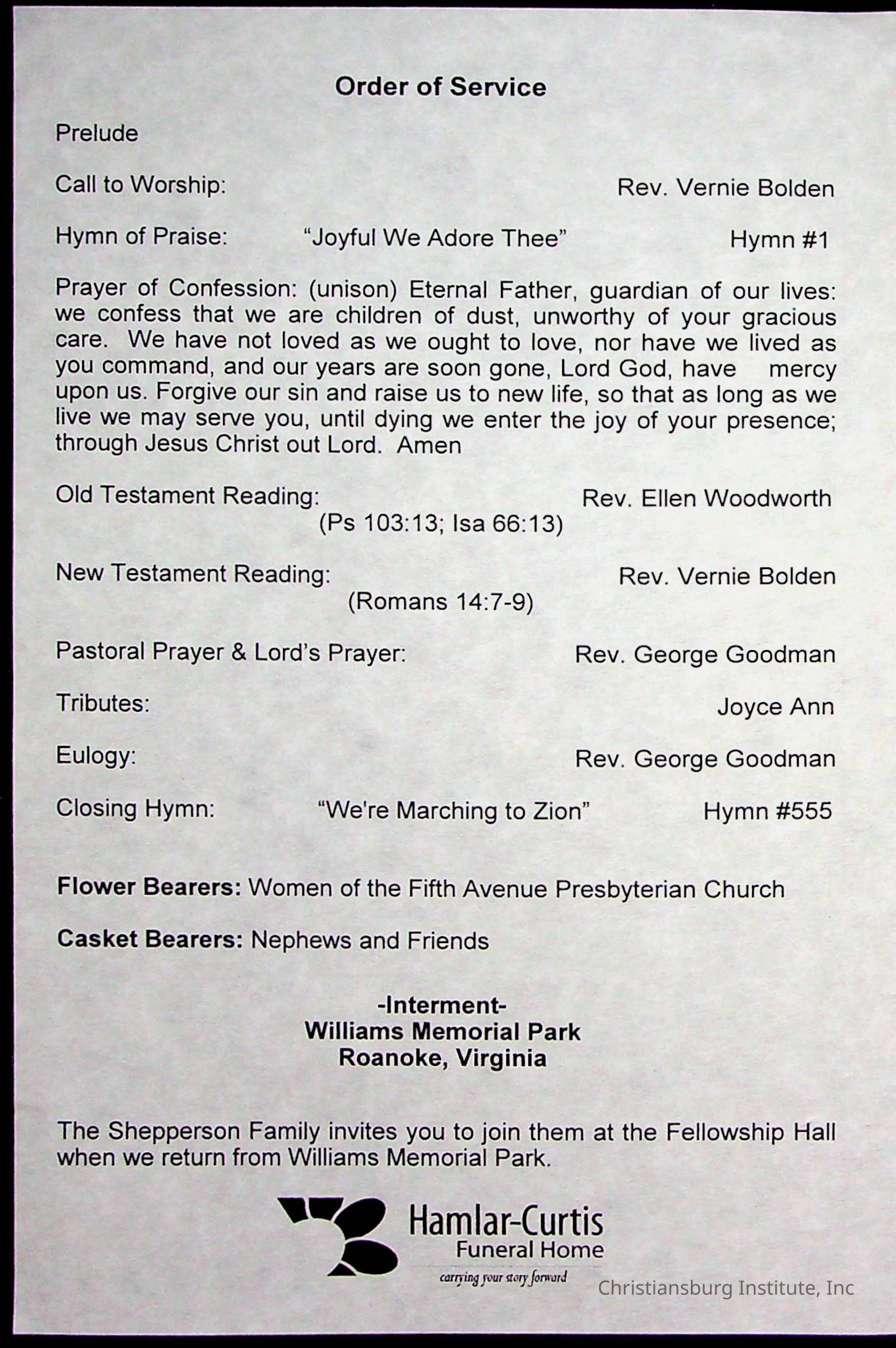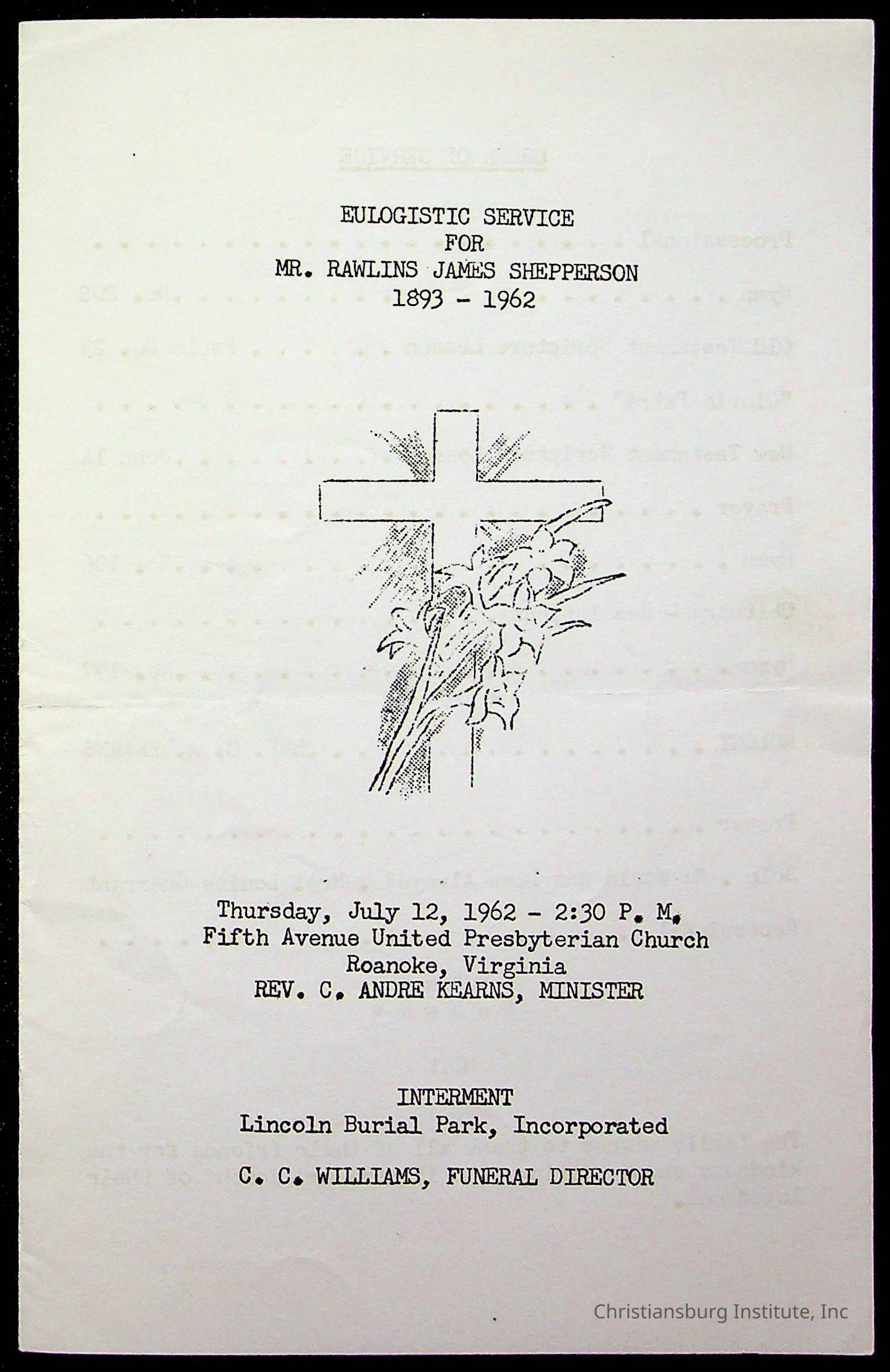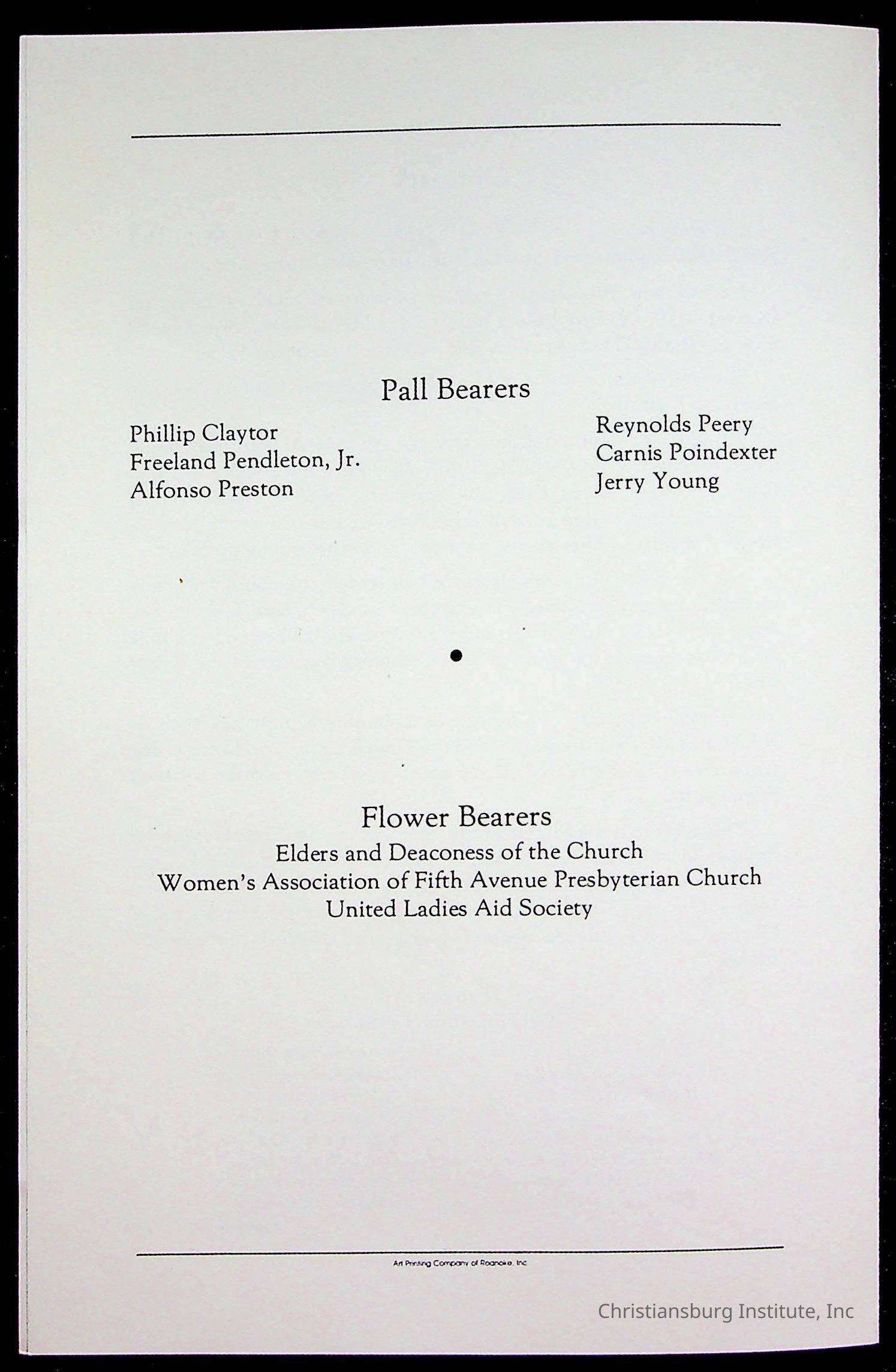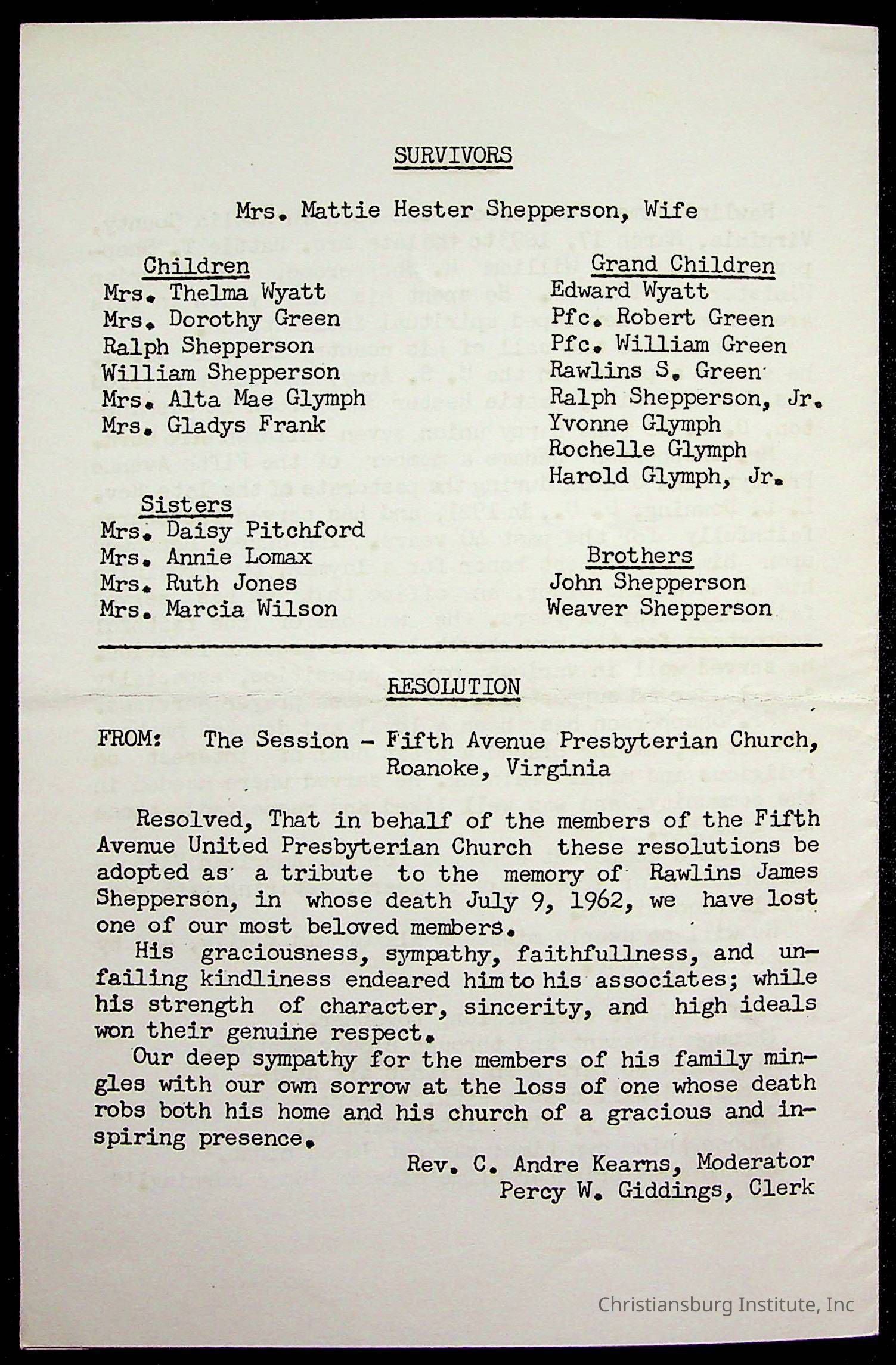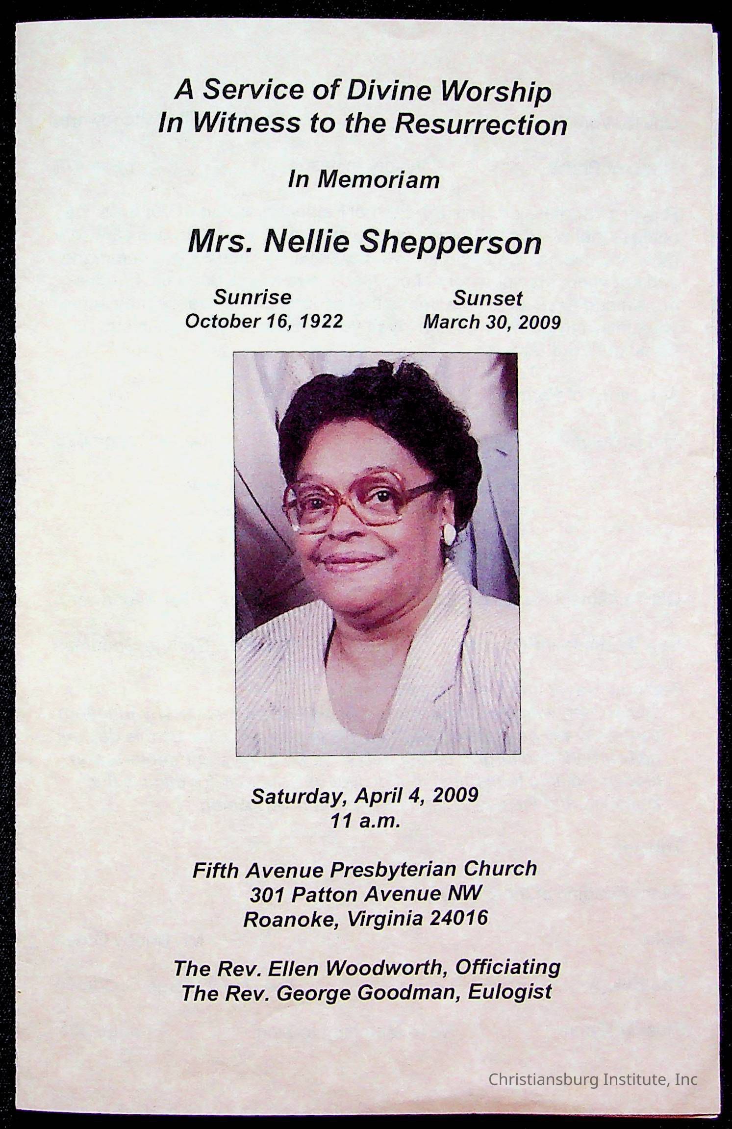 Copyright has been assigned to Christiansburg Institute Museum & Archives by Fifth Avenue Presbyterian Church. For permission to publish materials created by the donor, contact CIMA@christiansburginstitute.com. Materials not created by Fifth Avenue Presbyterian Church may still be under copyright.