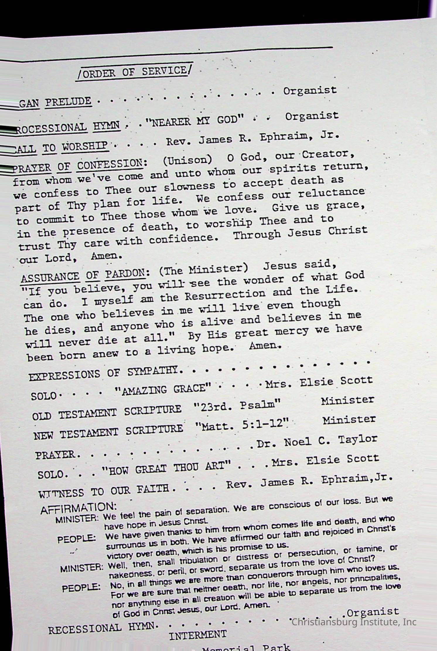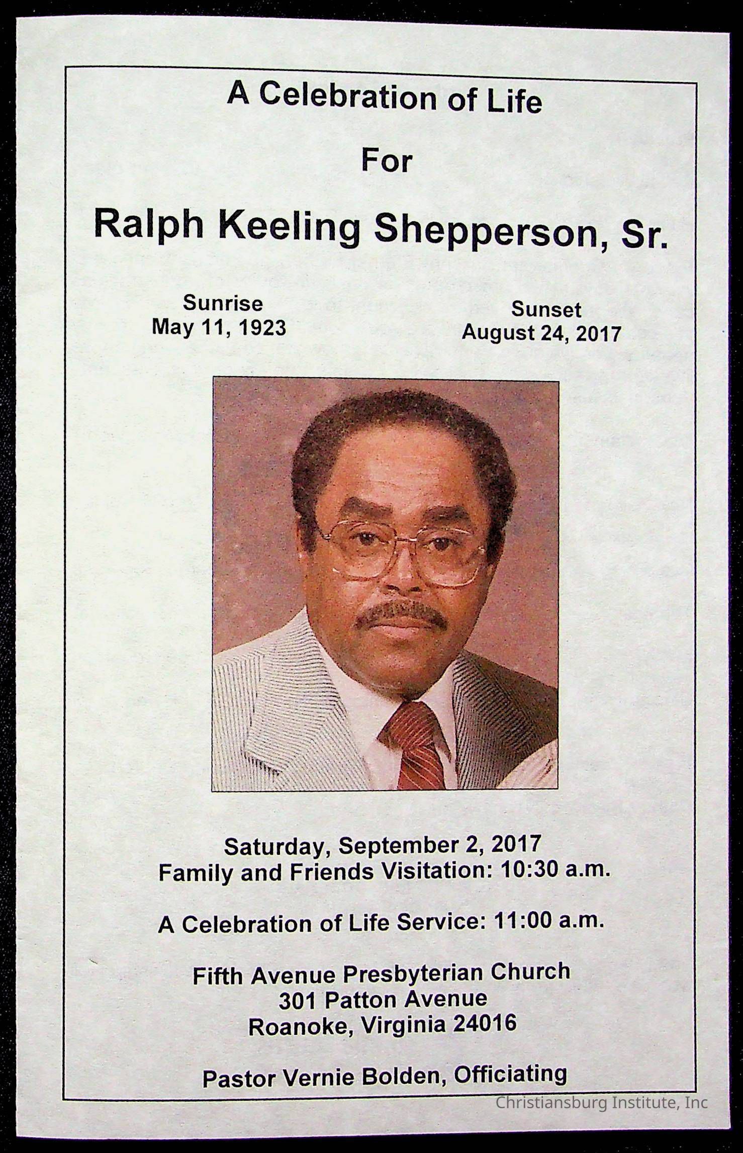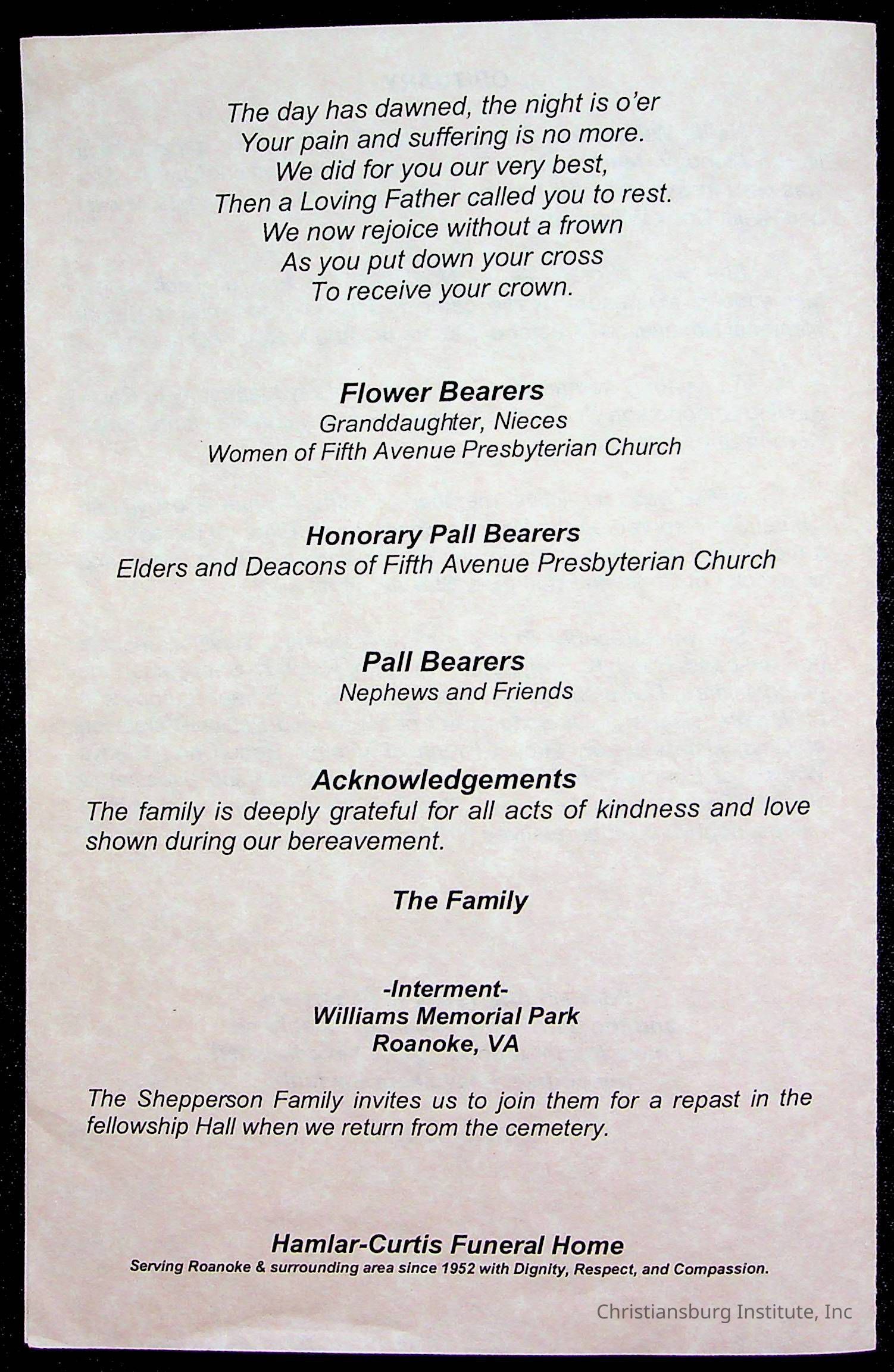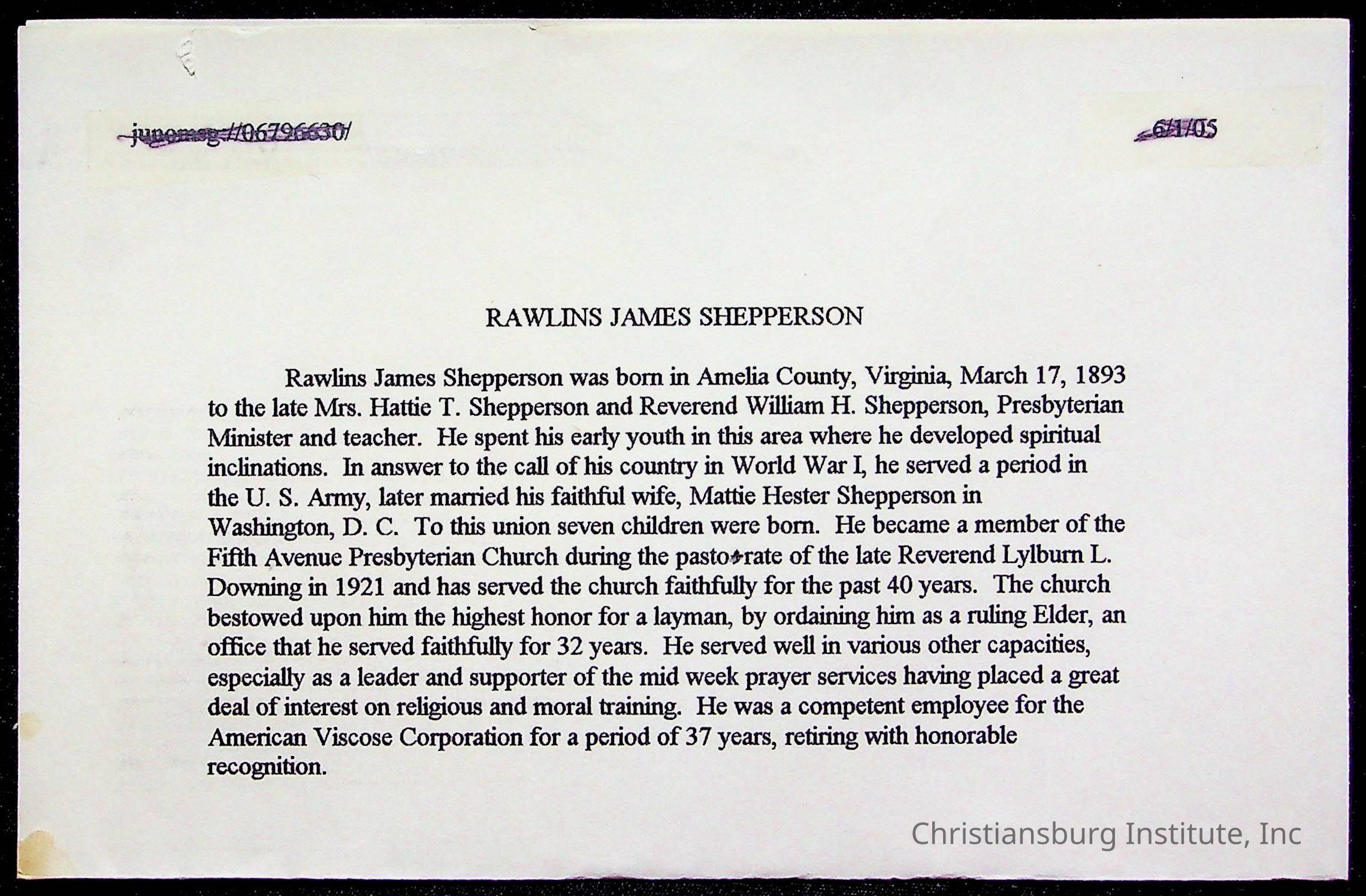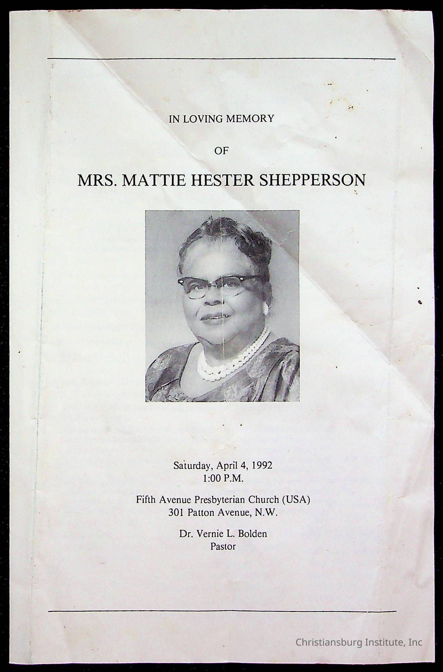 Copyright has been assigned to Christiansburg Institute Museum & Archives by Fifth Avenue Presbyterian Church. For permission to publish materials created by the donor, contact CIMA@christiansburginstitute.com. Materials not created by Fifth Avenue Presbyterian Church may still be under copyright.