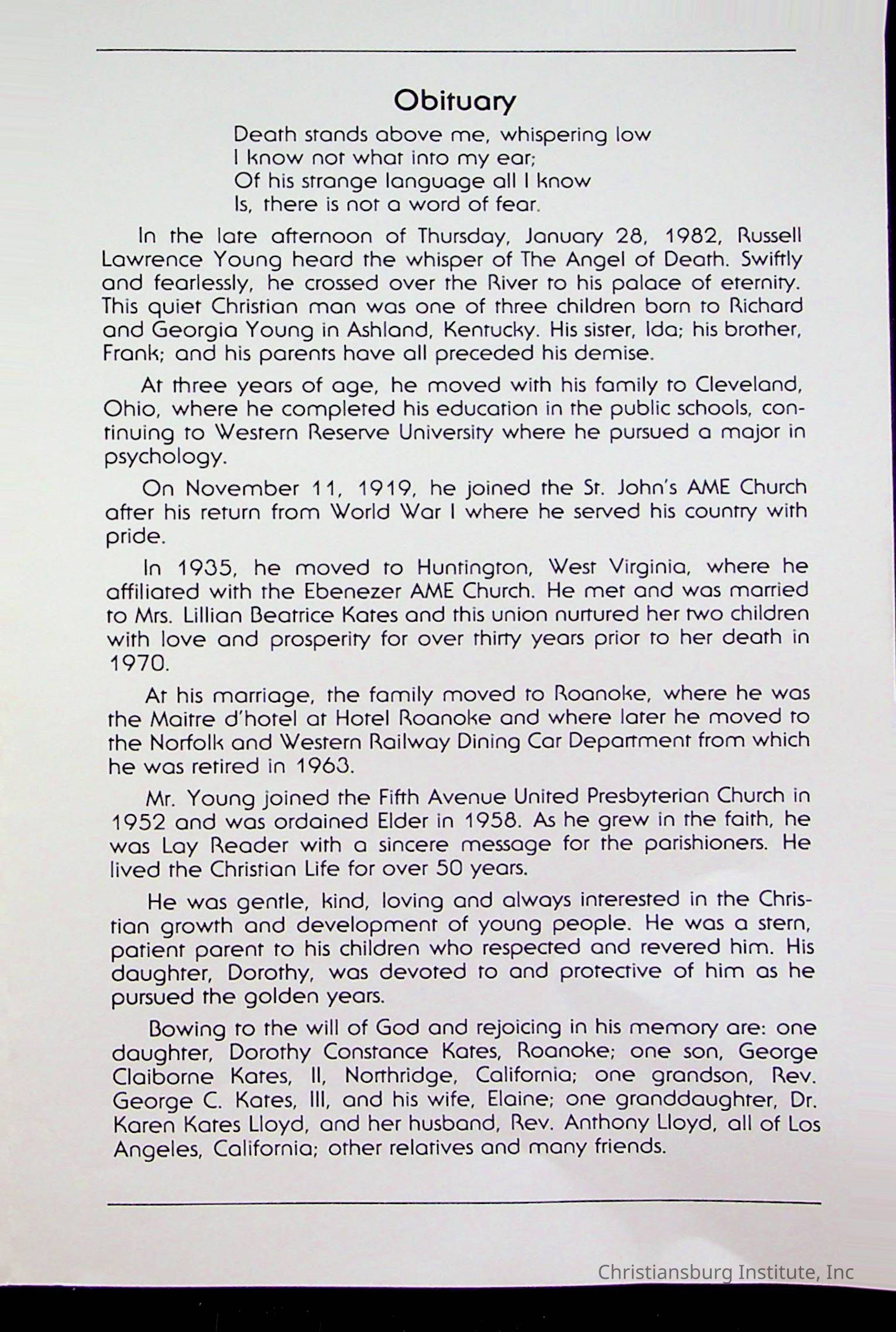 Copyright has been assigned to Christiansburg Institute Museum & Archives by Fifth Avenue Presbyterian Church. For permission to publish materials created by the donor, contact CIMA@christiansburginstitute.com. Materials not created by Fifth Avenue Presbyterian Church may still be under copyright.