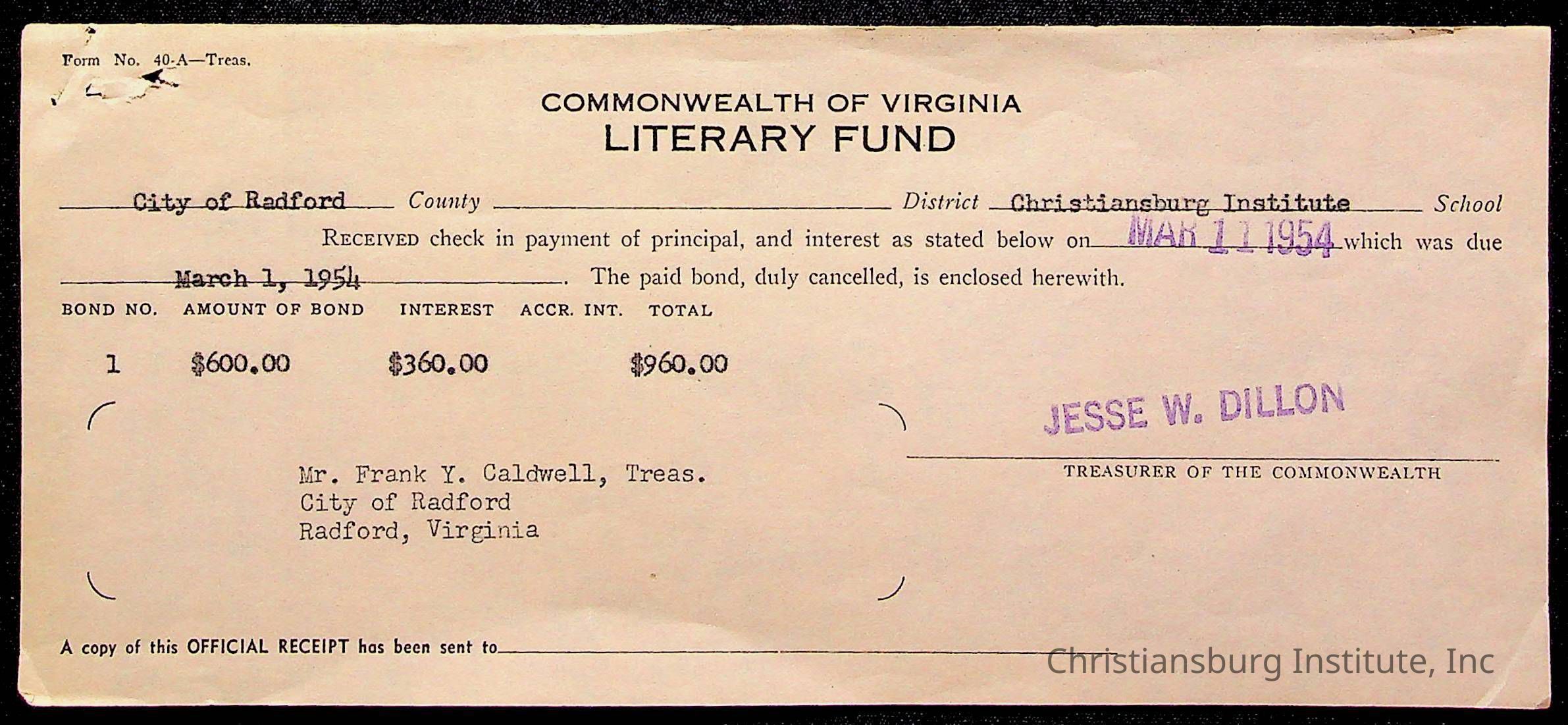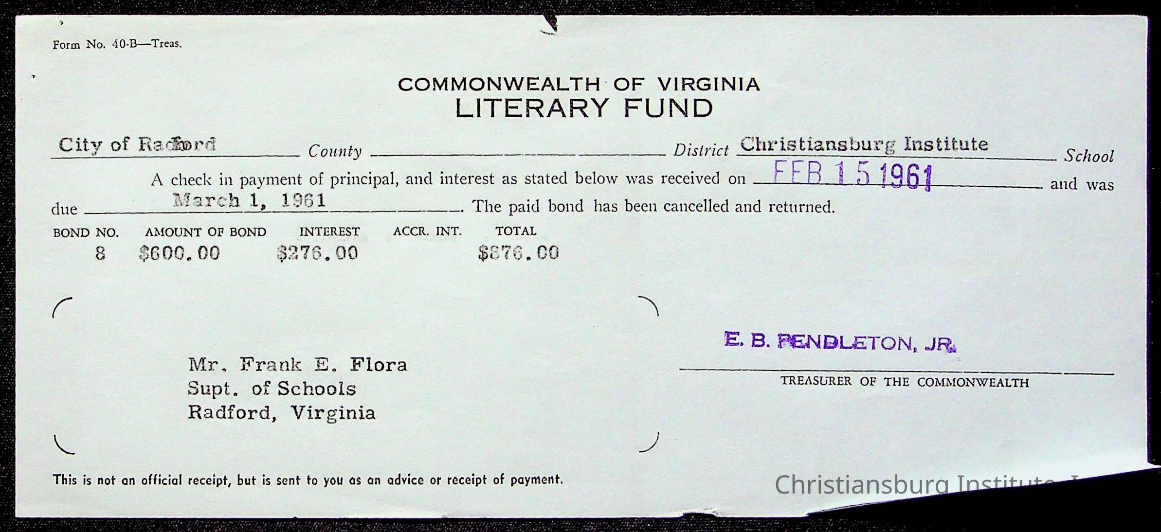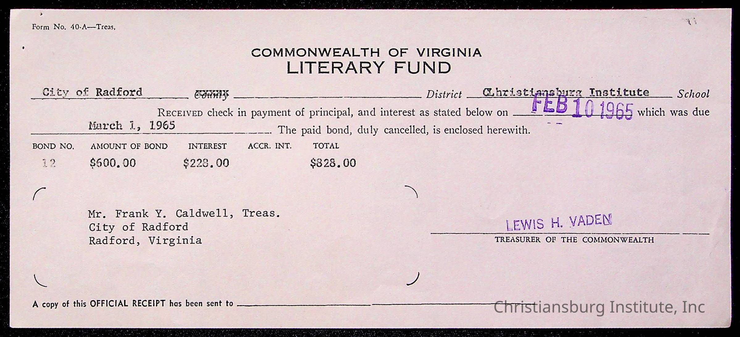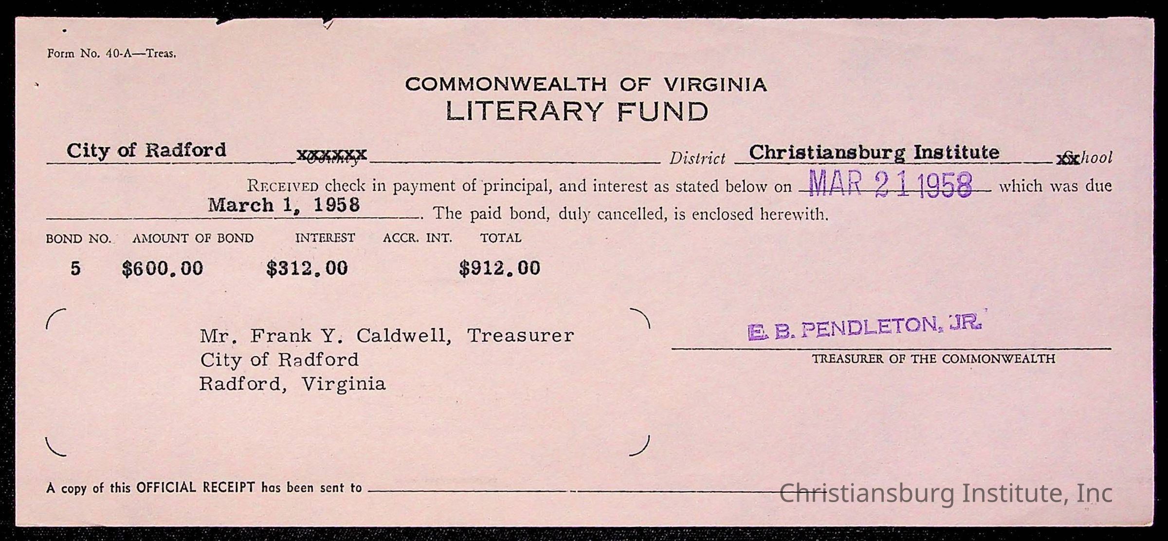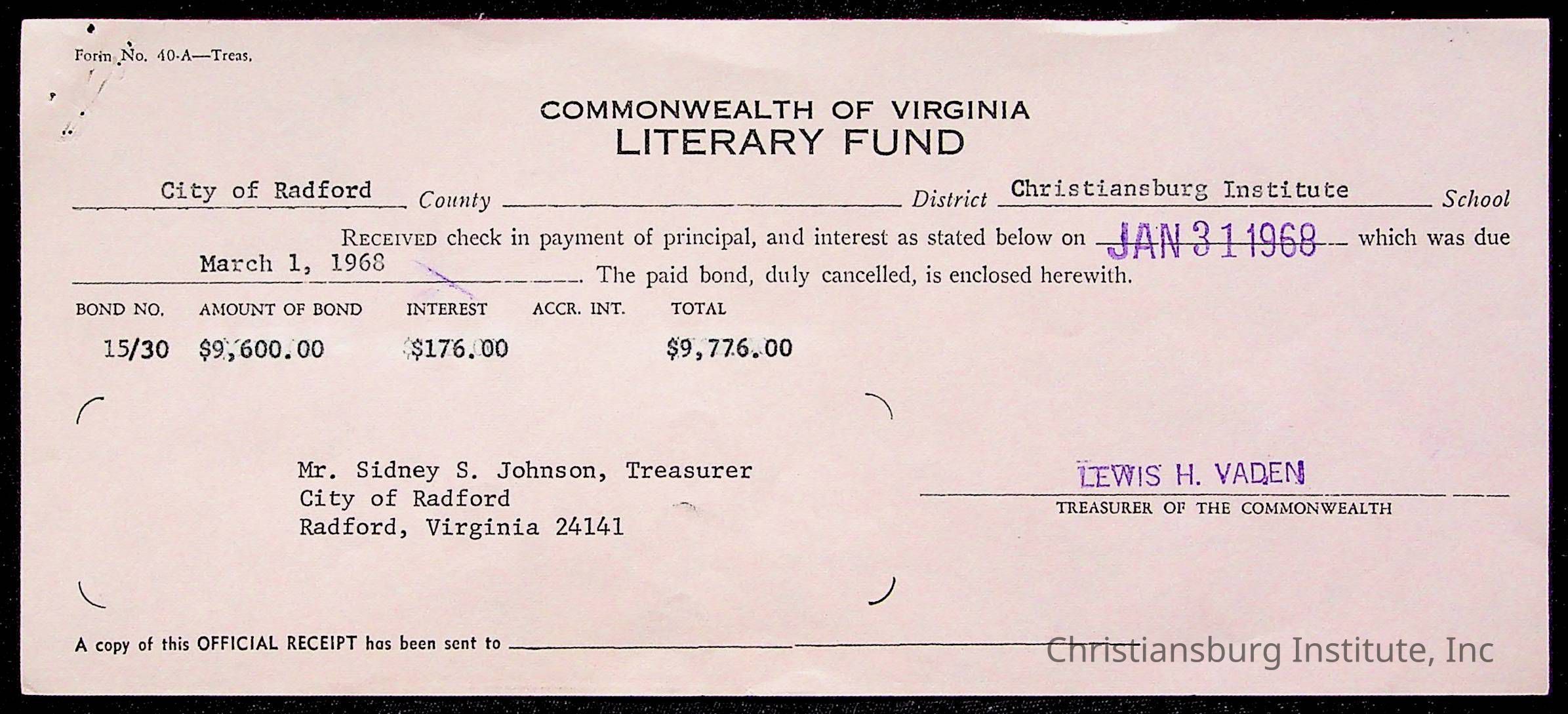 An archive of receipts for the literary fund bonds for Christiansburg Institute from the City of Radford, dated 1954-1968.