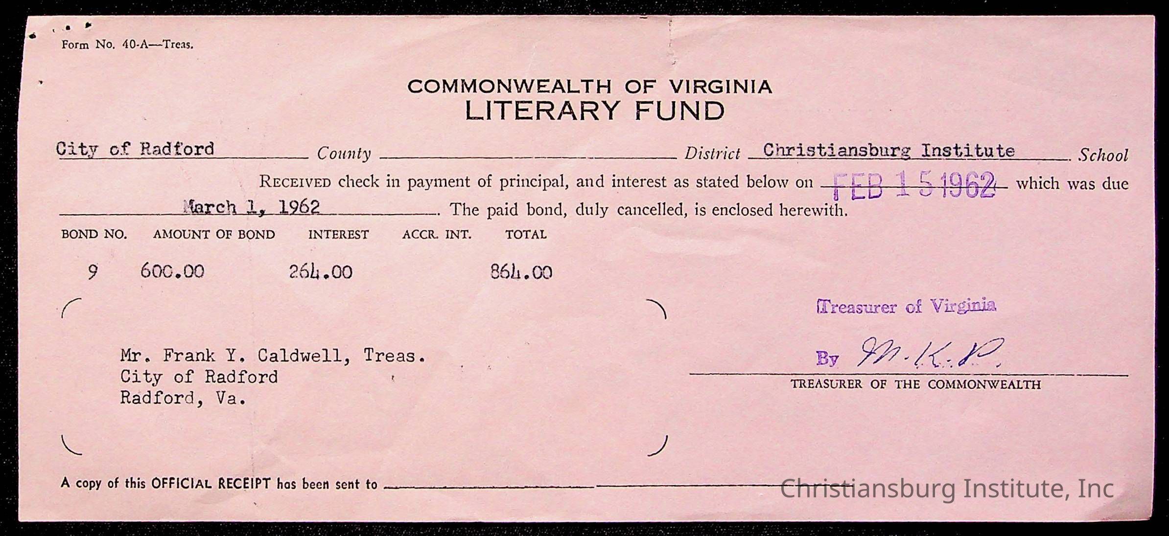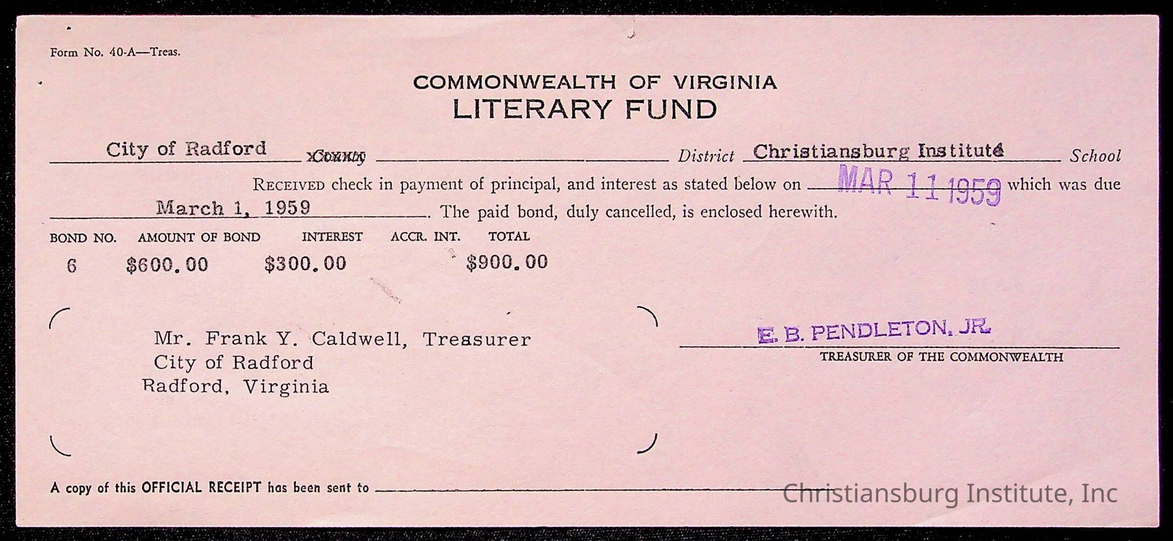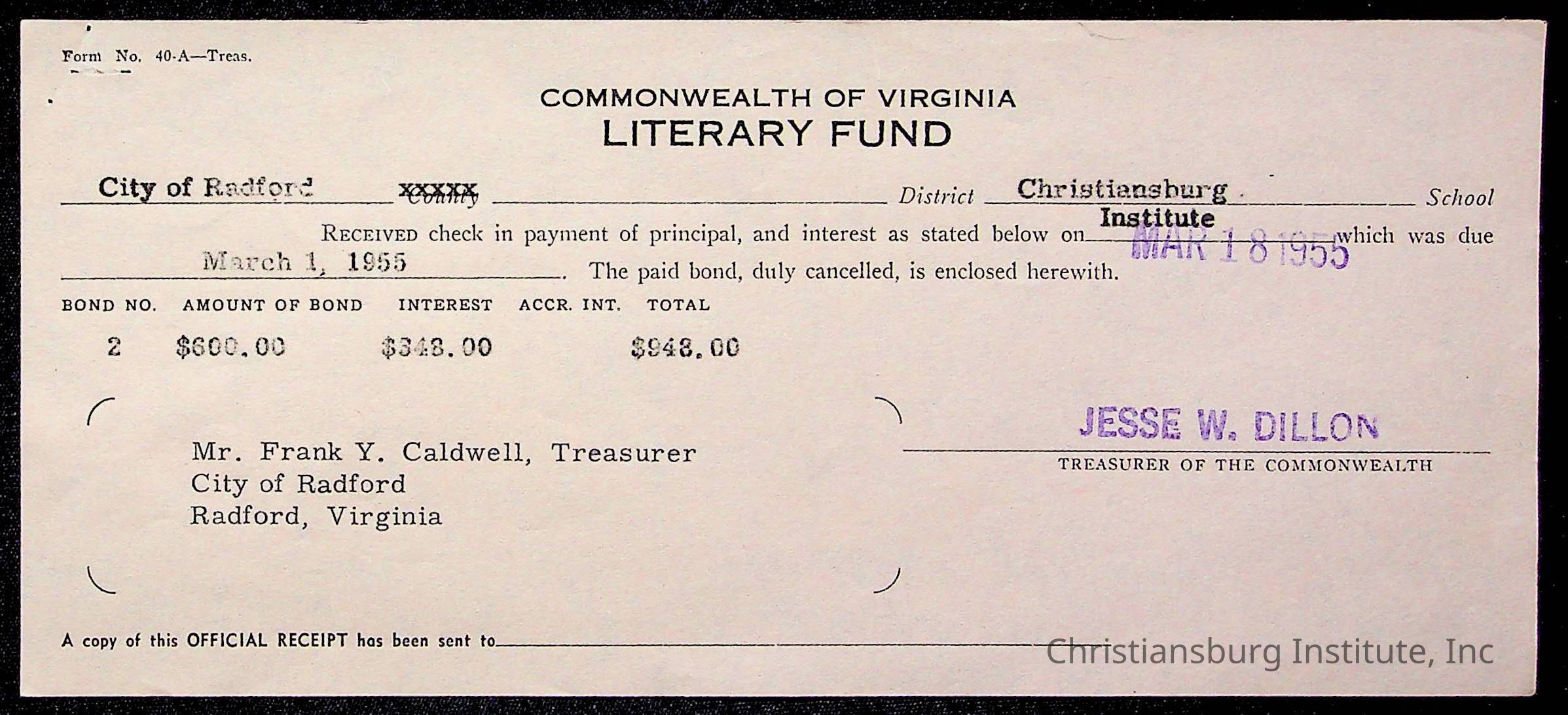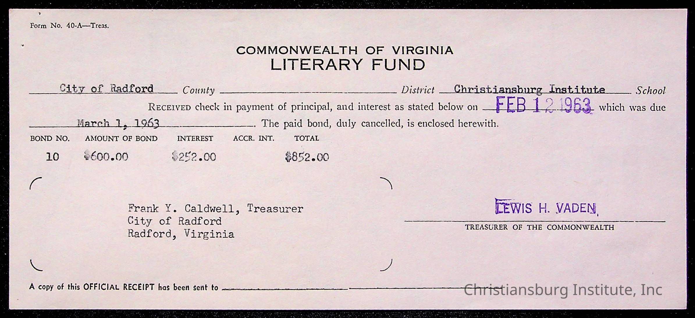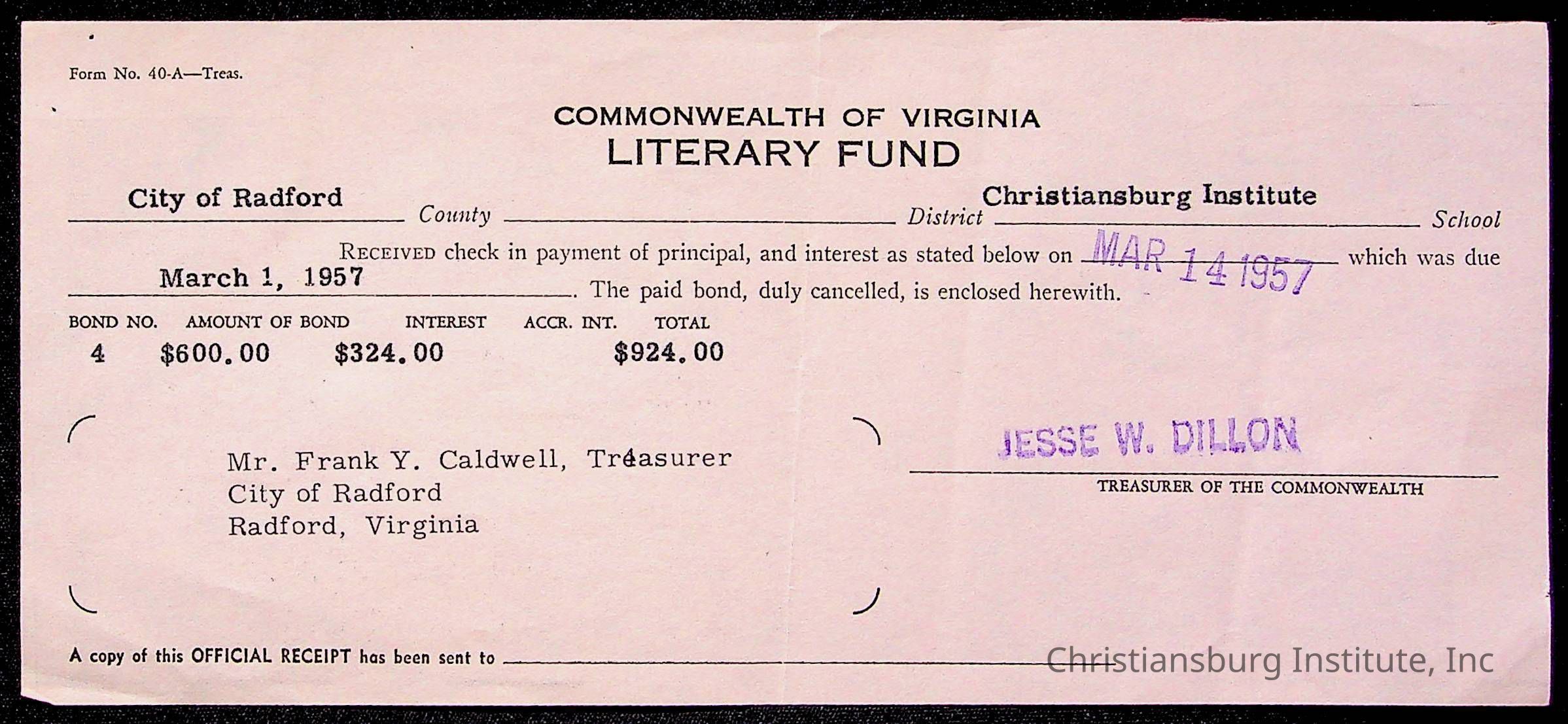 An archive of receipts for the literary fund bonds for Christiansburg Institute from the City of Radford, dated 1954-1968.