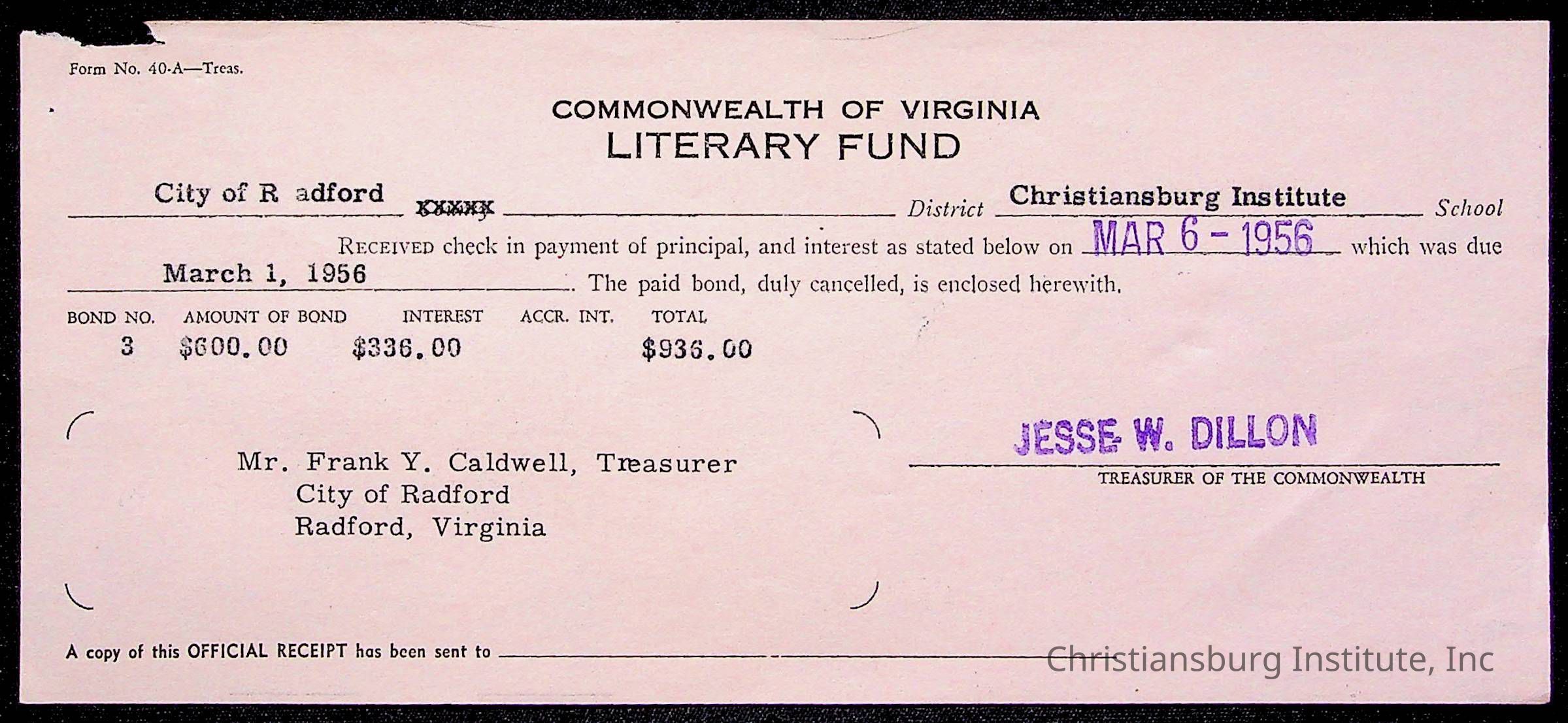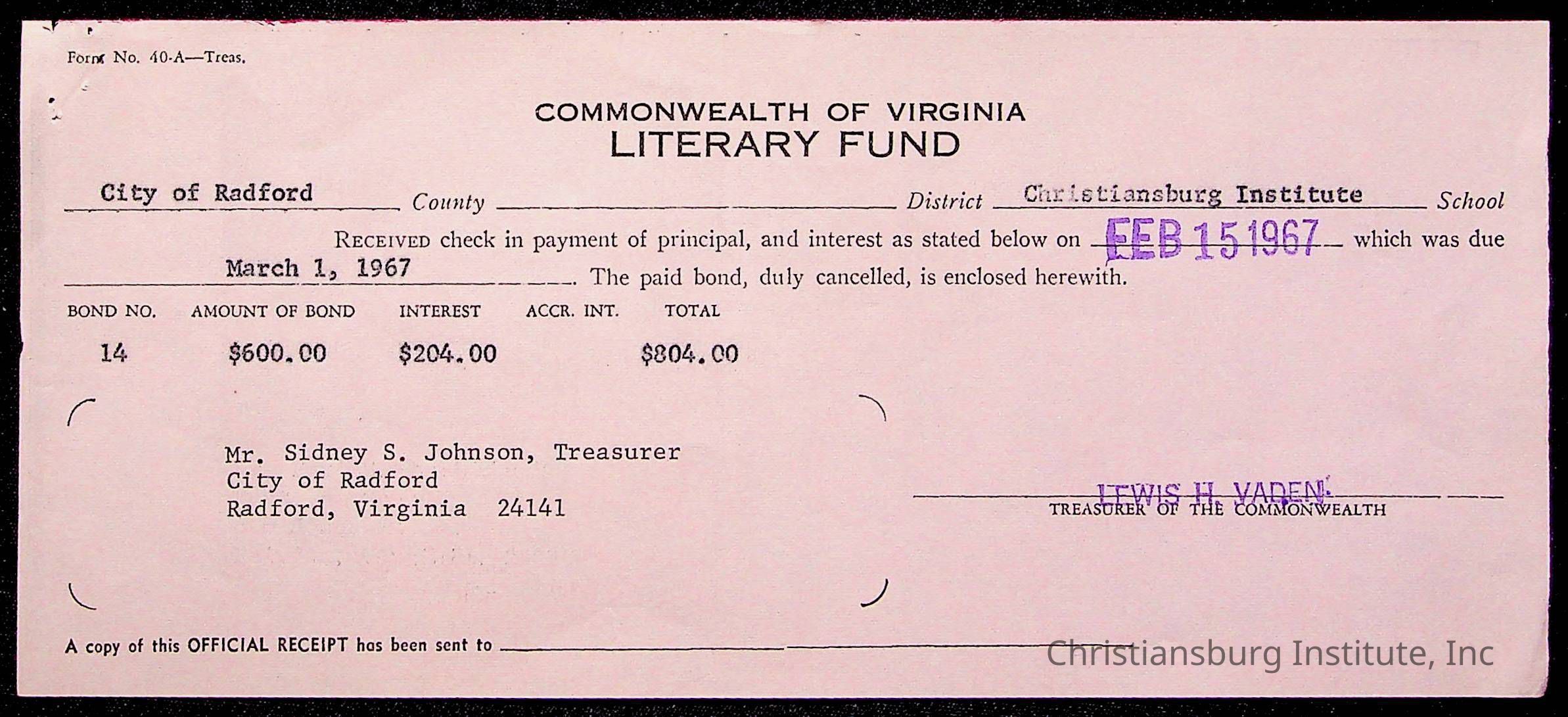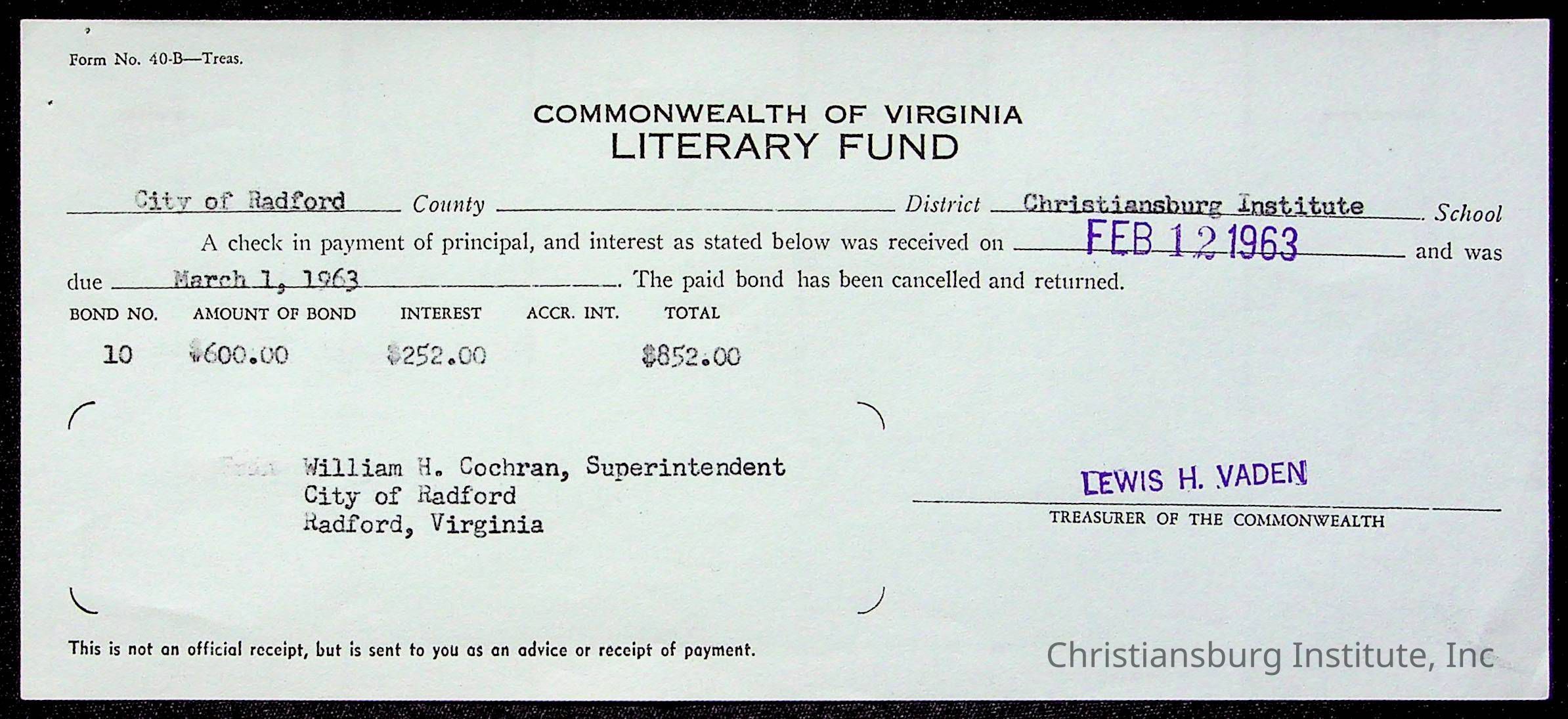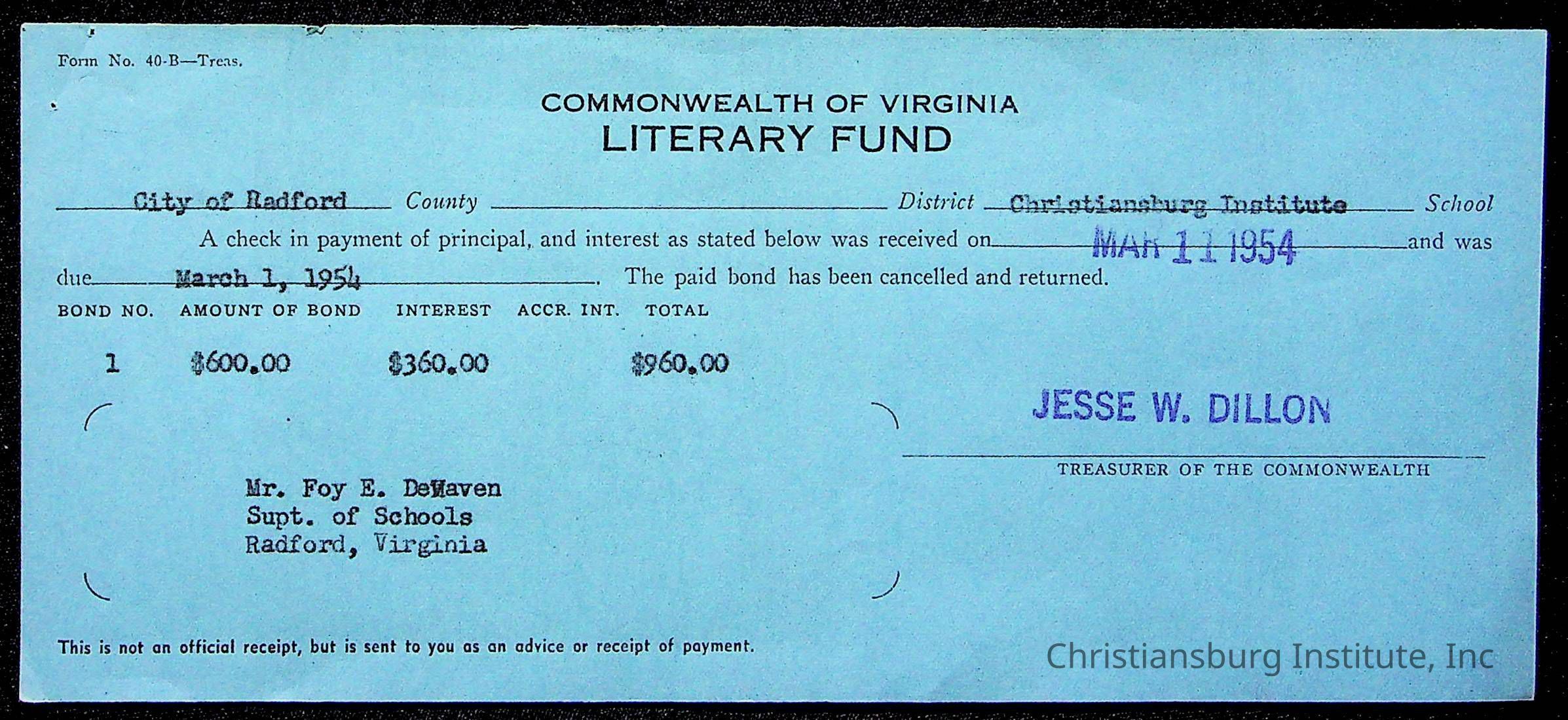 An archive of receipts for the literary fund bonds for Christiansburg Institute from the City of Radford, dated 1954-1968.