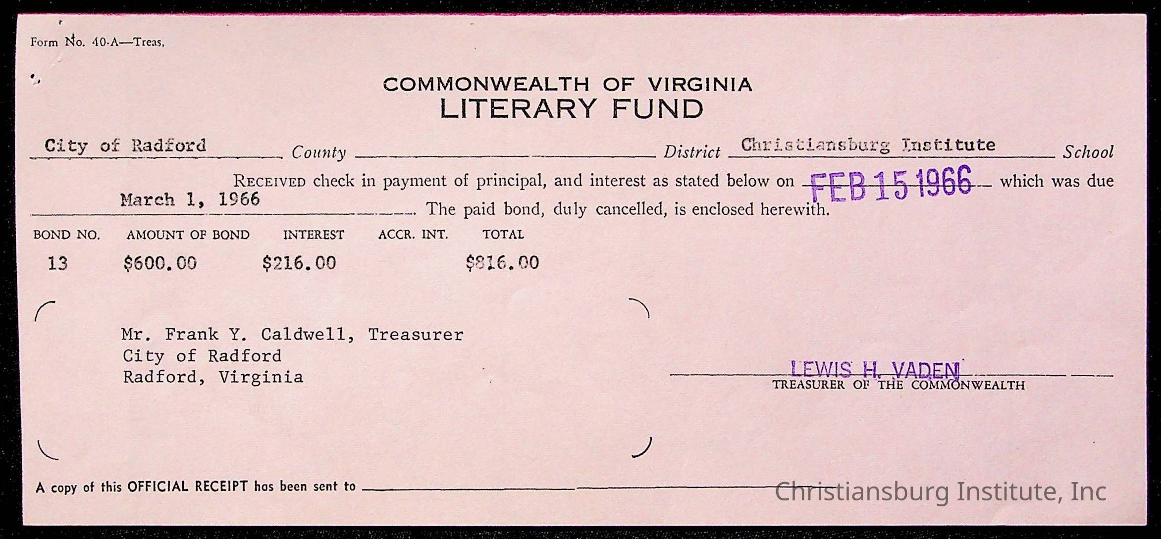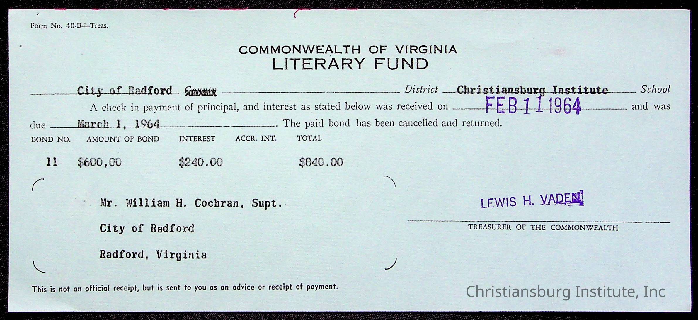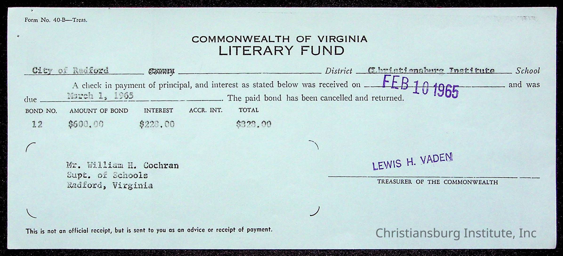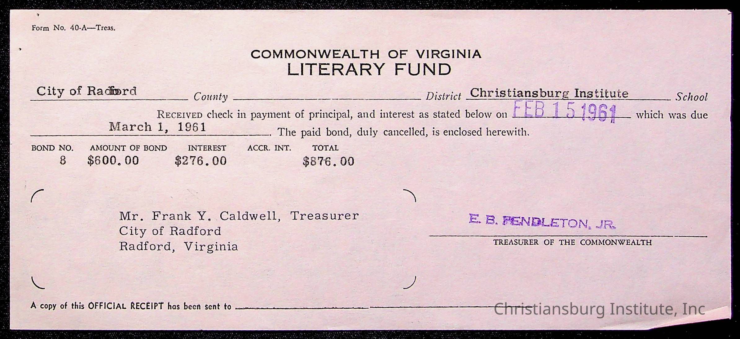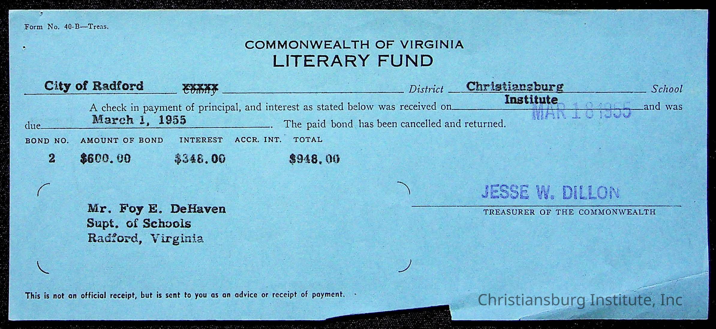 An archive of receipts for the literary fund bonds for Christiansburg Institute from the City of Radford, dated 1954-1968.
