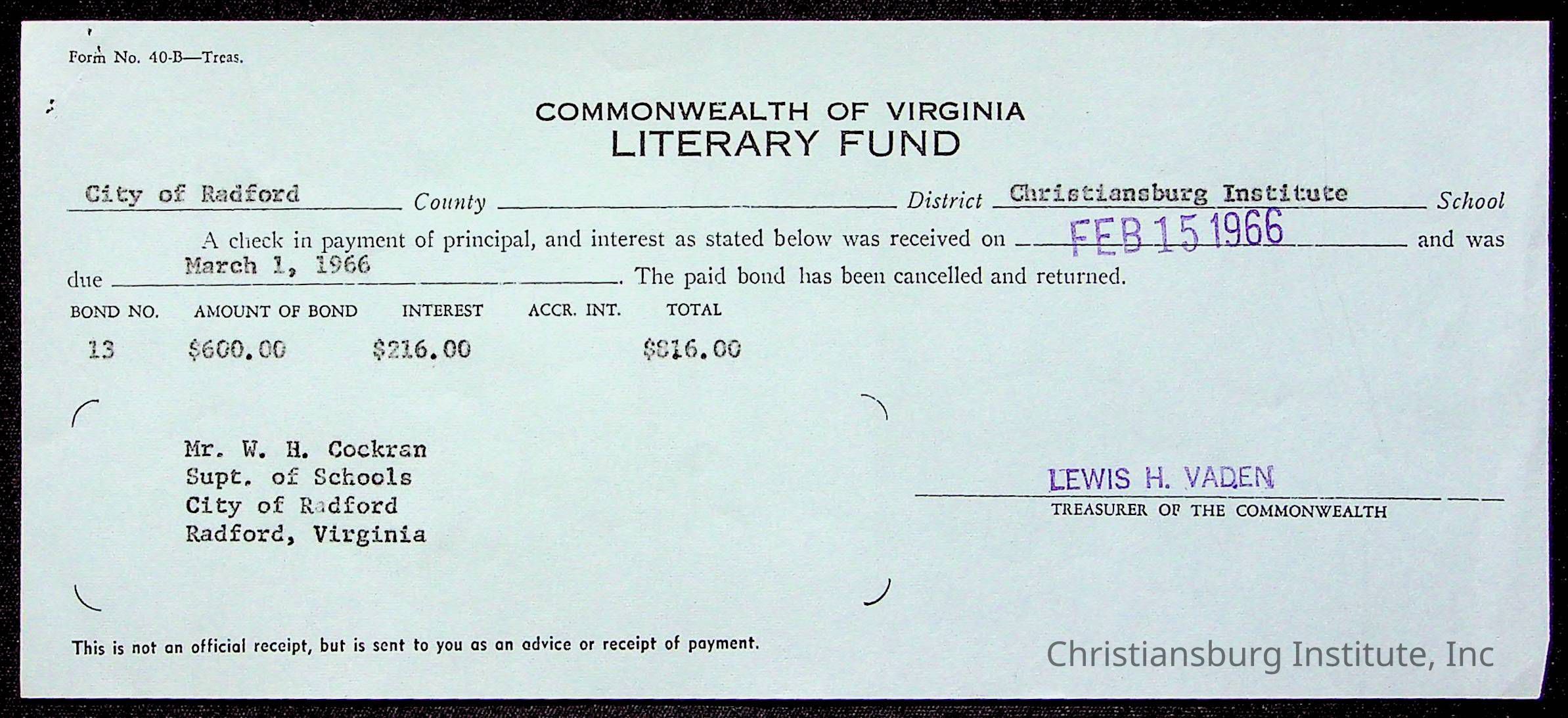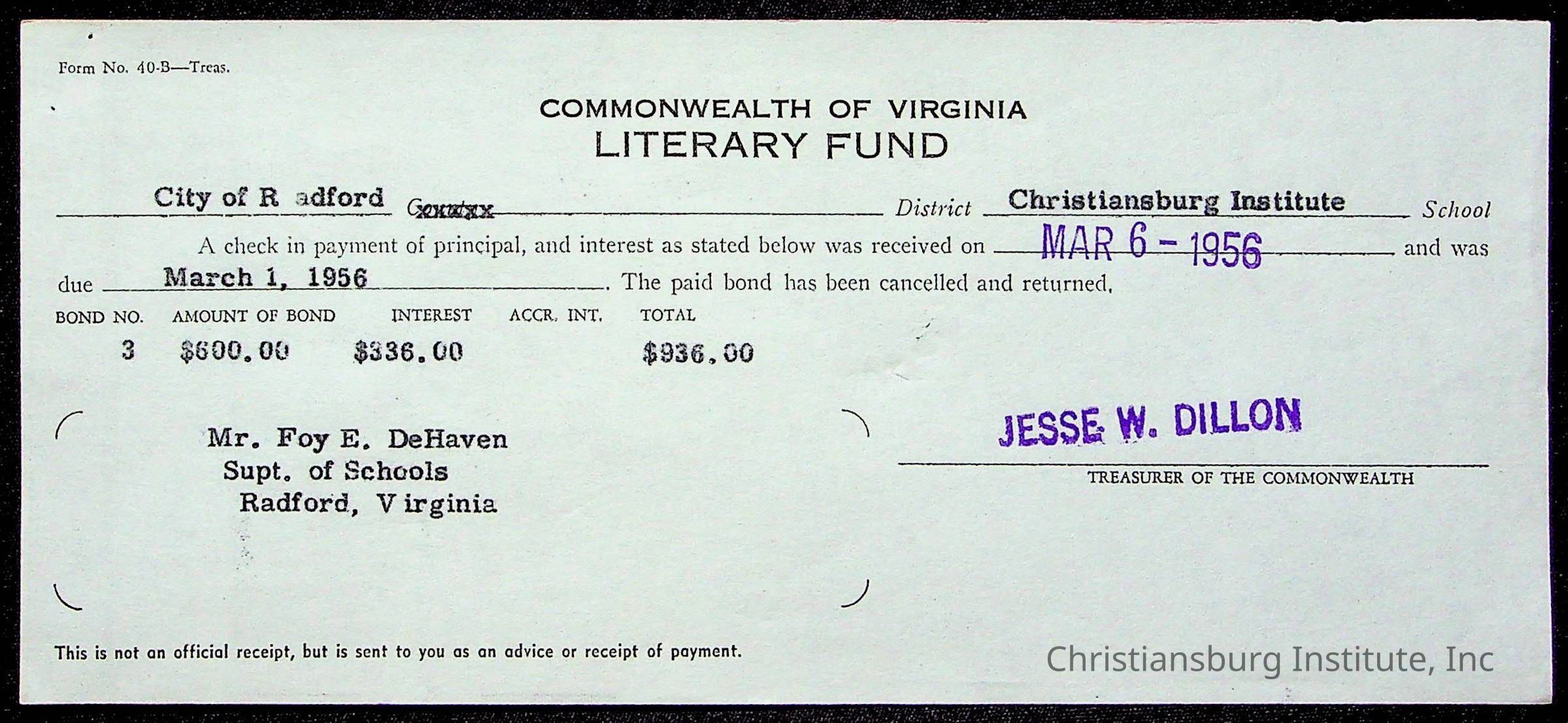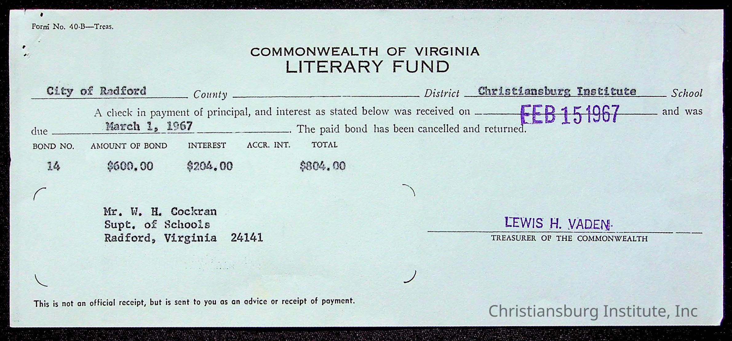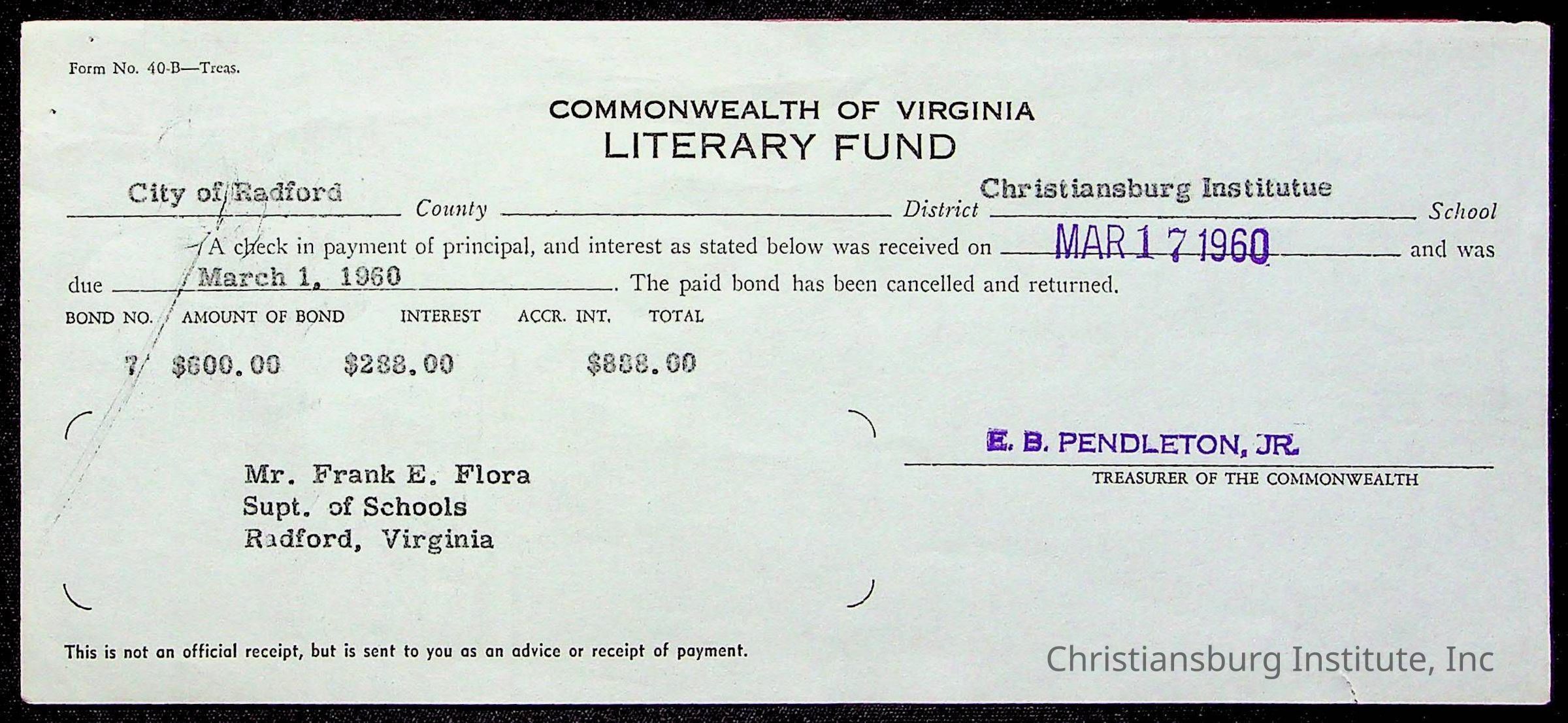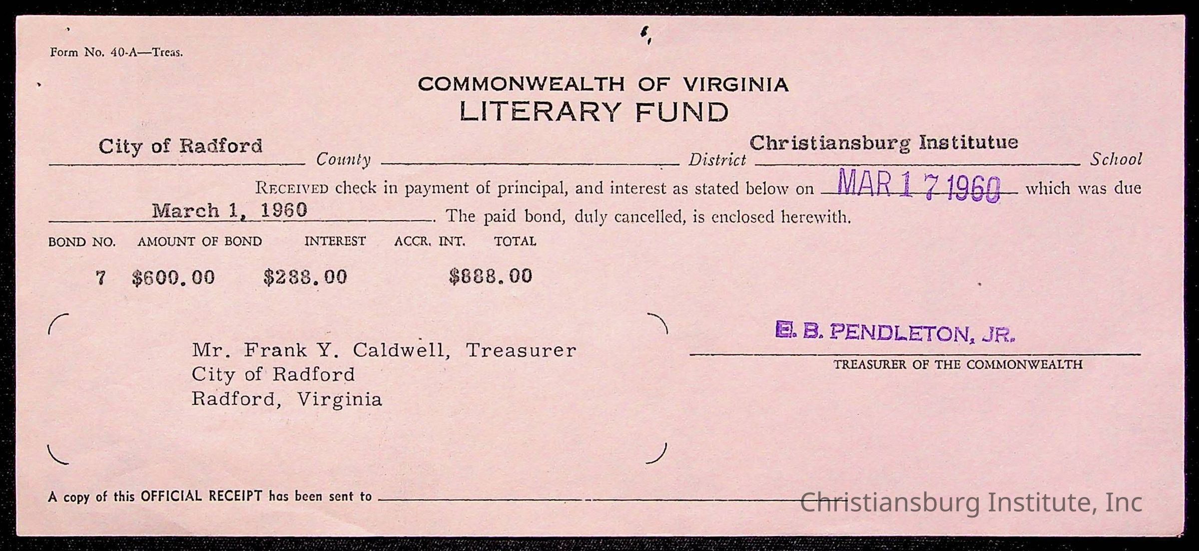 An archive of receipts for the literary fund bonds for Christiansburg Institute from the City of Radford, dated 1954-1968.