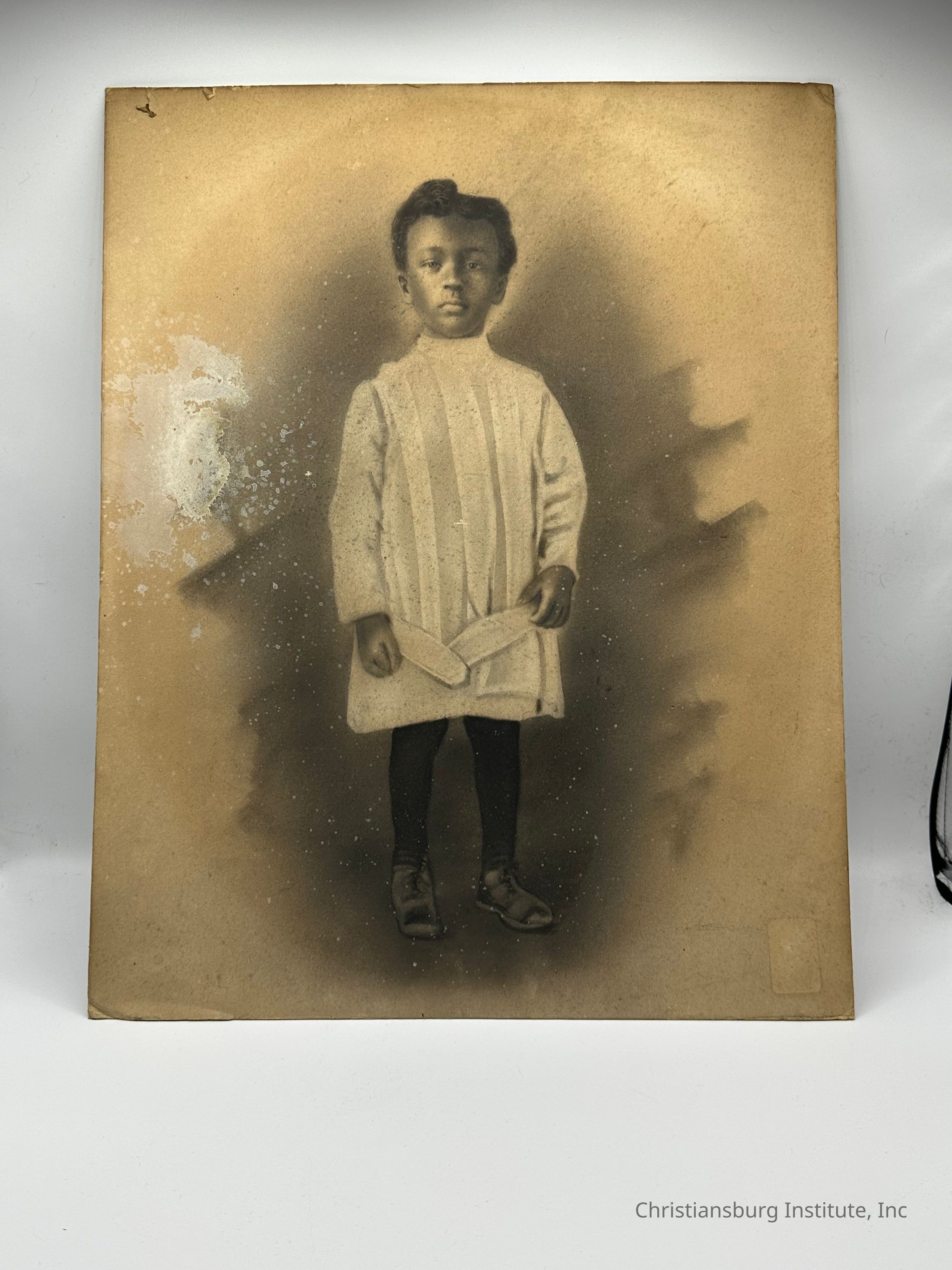 A charcoal drawing of an unknown African American boy standing, undated.Type of Drawing