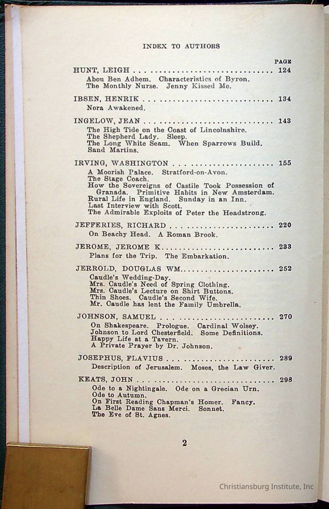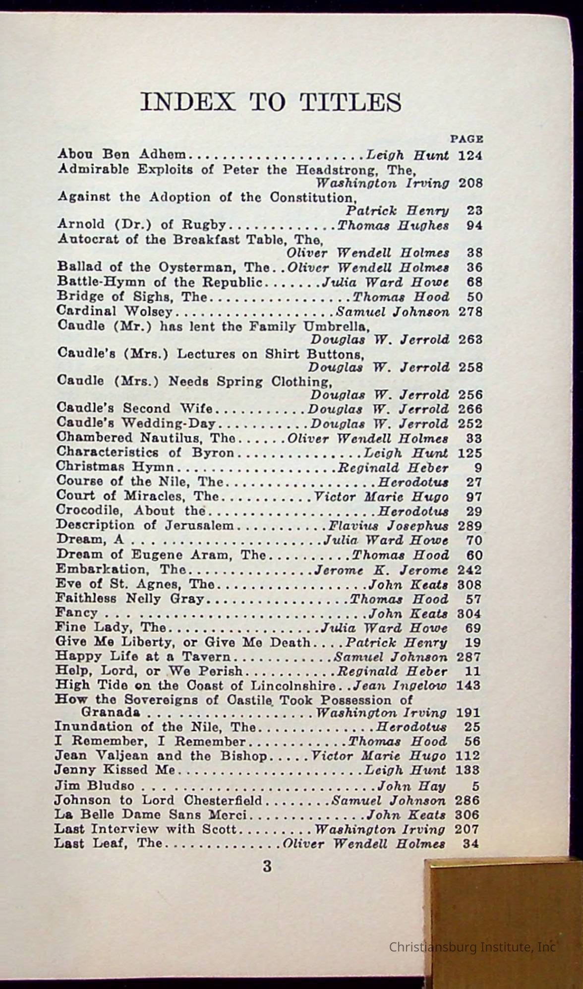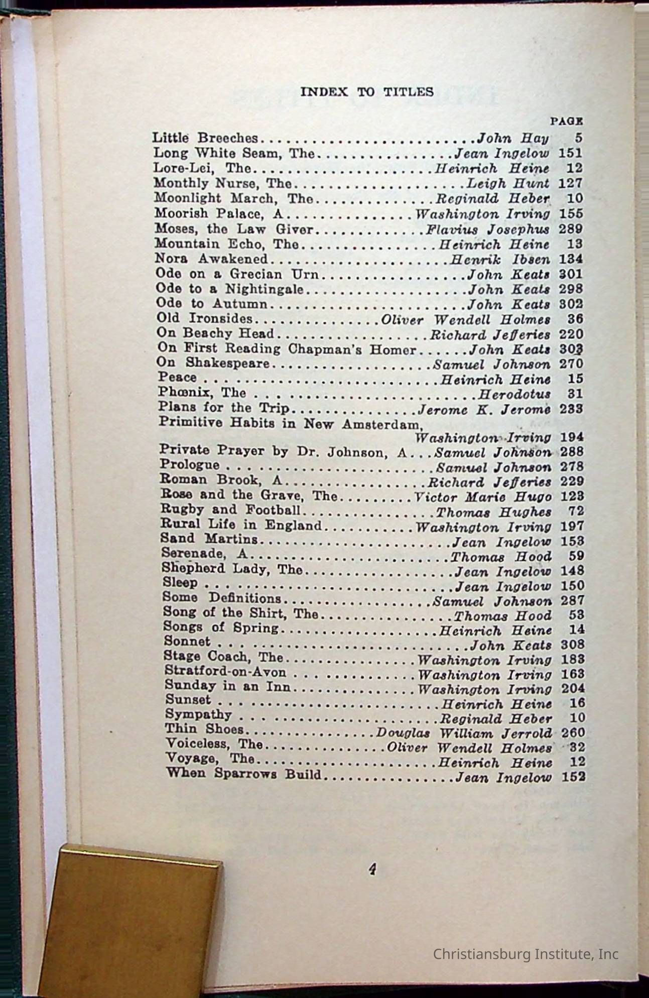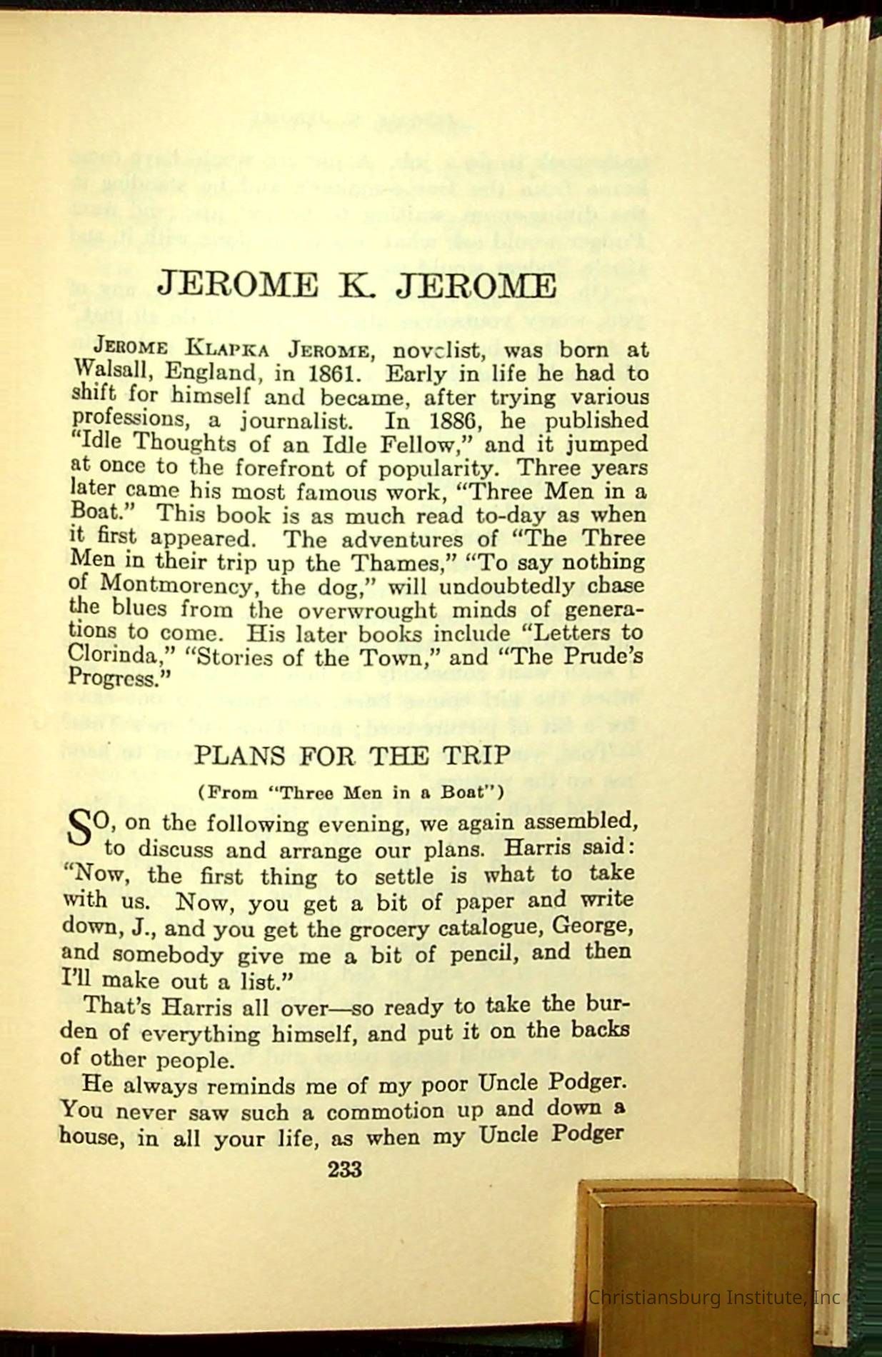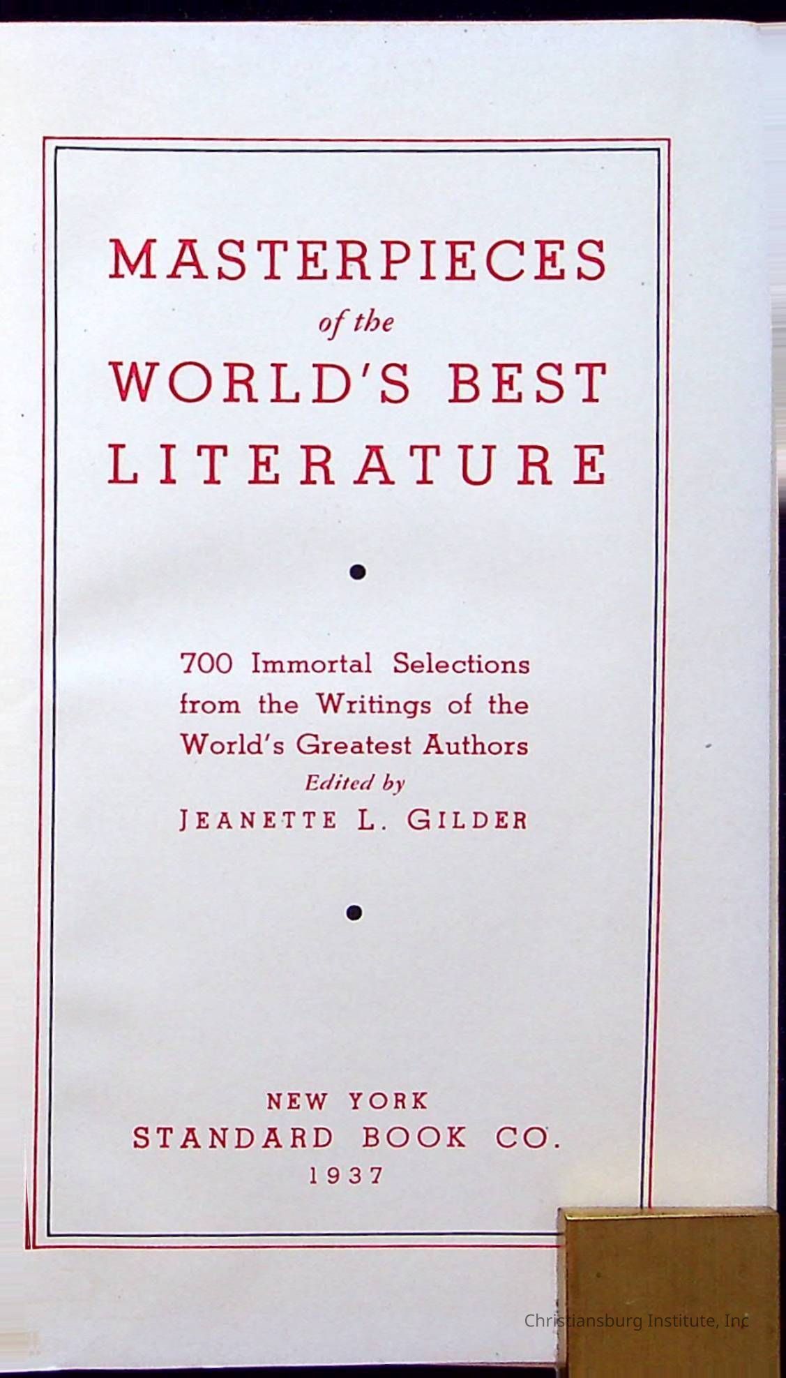 Masterpieces of the World's Best Literature: 700 Immortal Selections from the Writings of the World's Greatest Authors edited by Jeanette L. Gilder and published by the New York Standard Book Co in 1937. This book was used by Christiansburg Institute teacher, Viola Charlton in her class.Collection