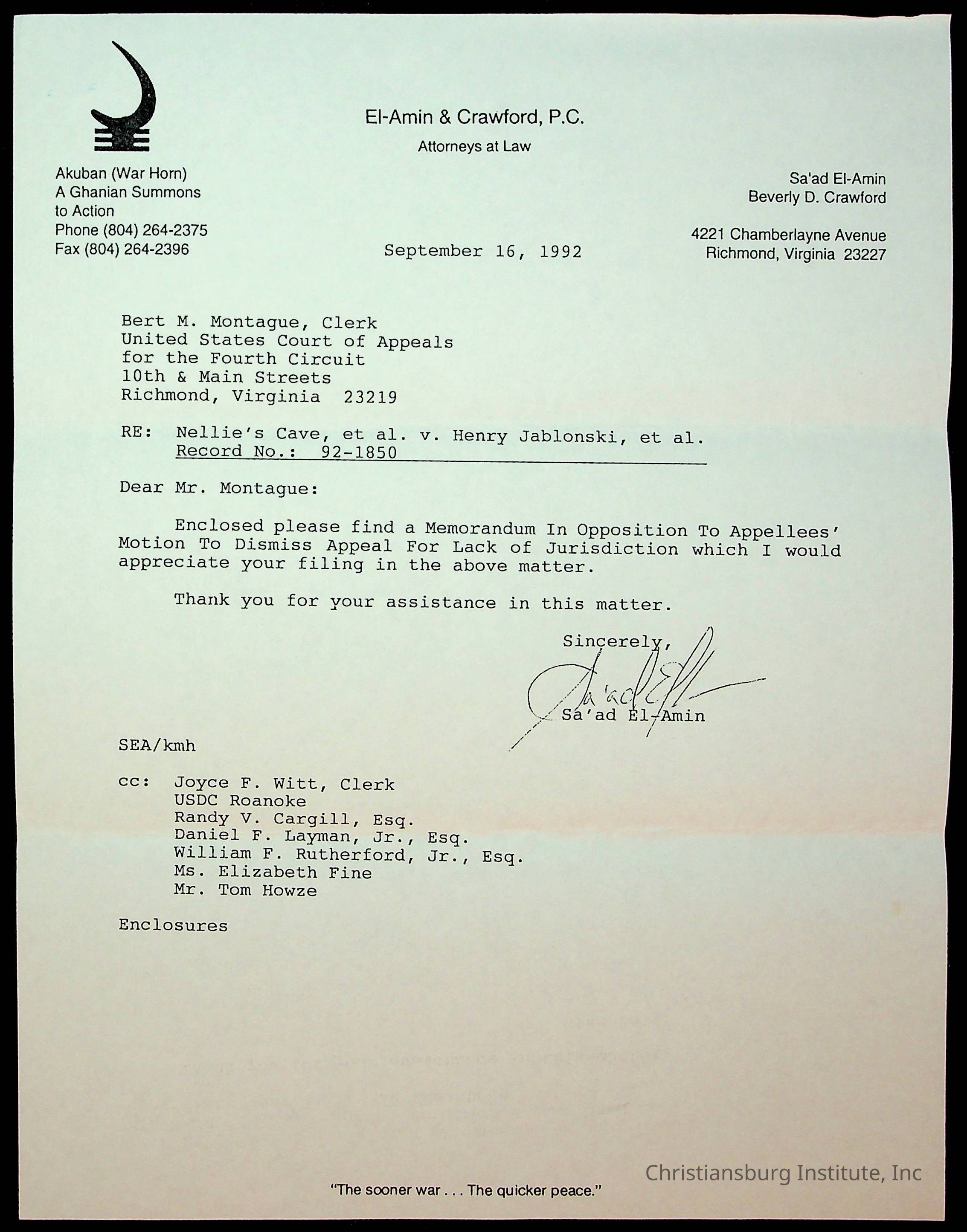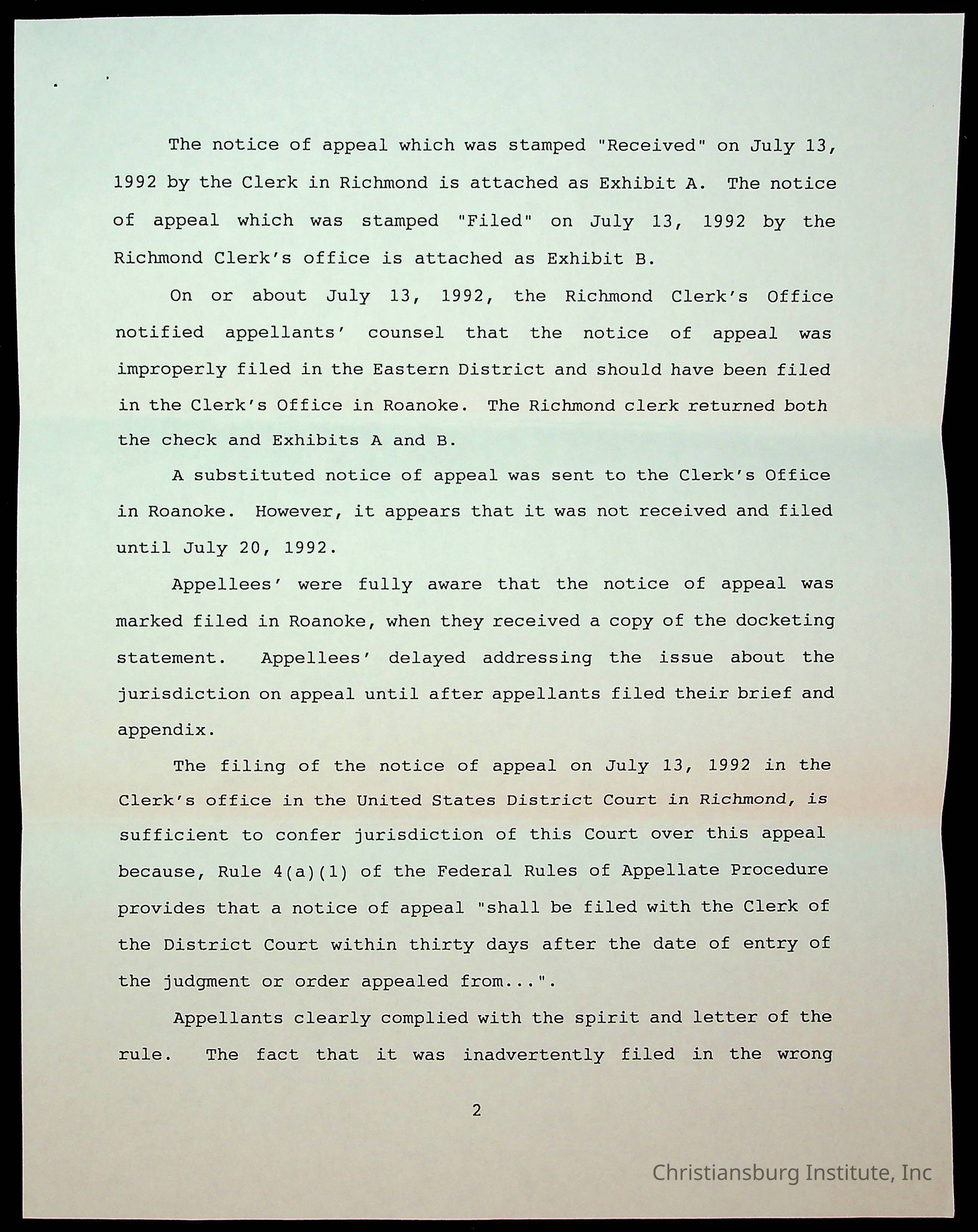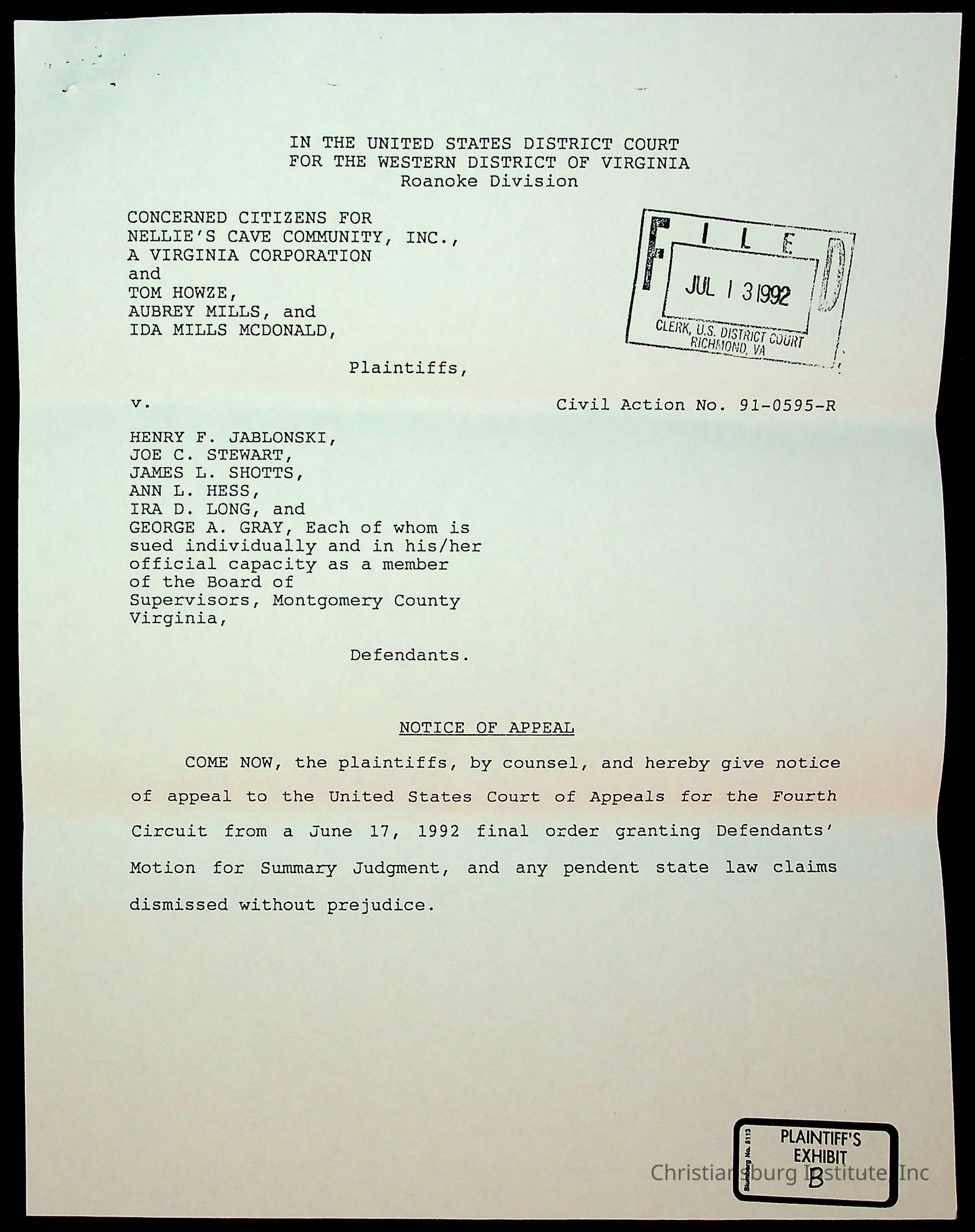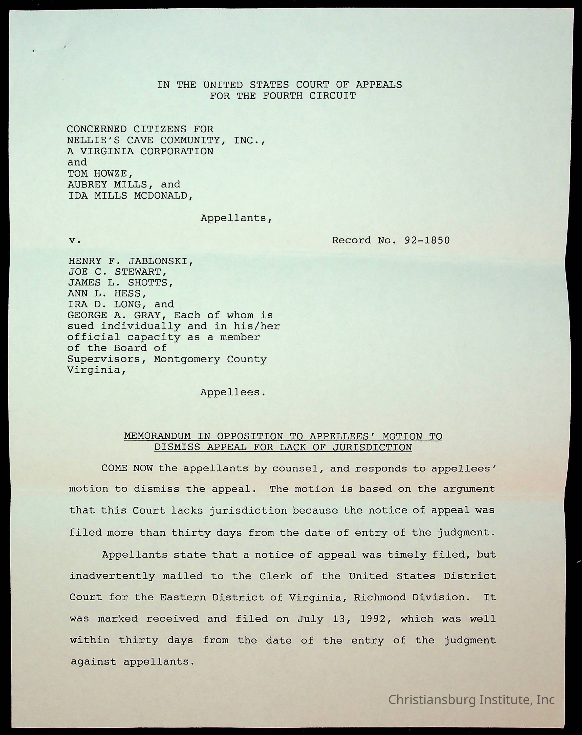 An archive of court documents in the case, concerned citizens for Nellies Cave community, Inc. versus the board of supervisors of Montgomery County, Virginia including the memorandum in opposition to the appellees' motion to dismiss the appeal for lack of jurisdiction, dated 1992.Collection