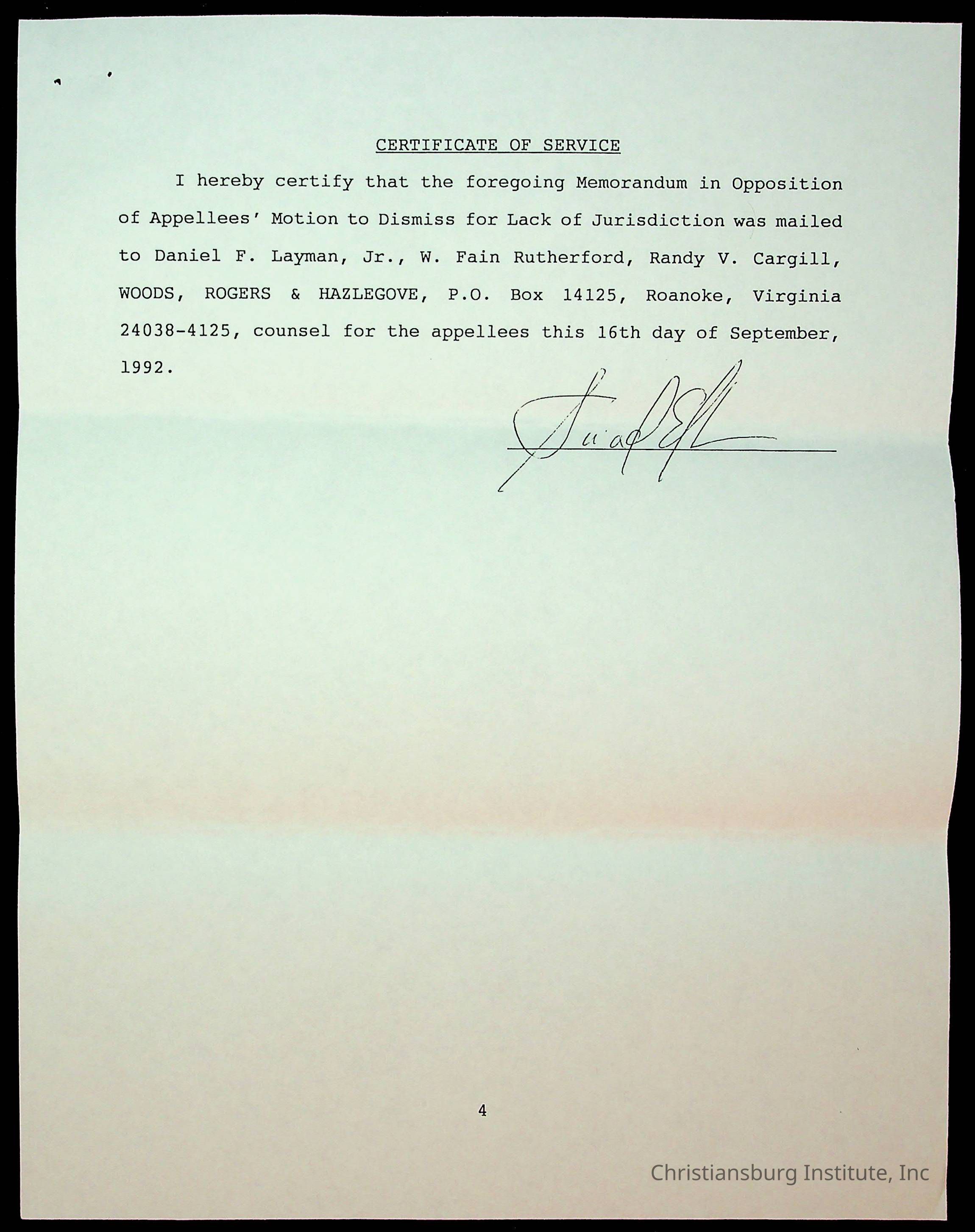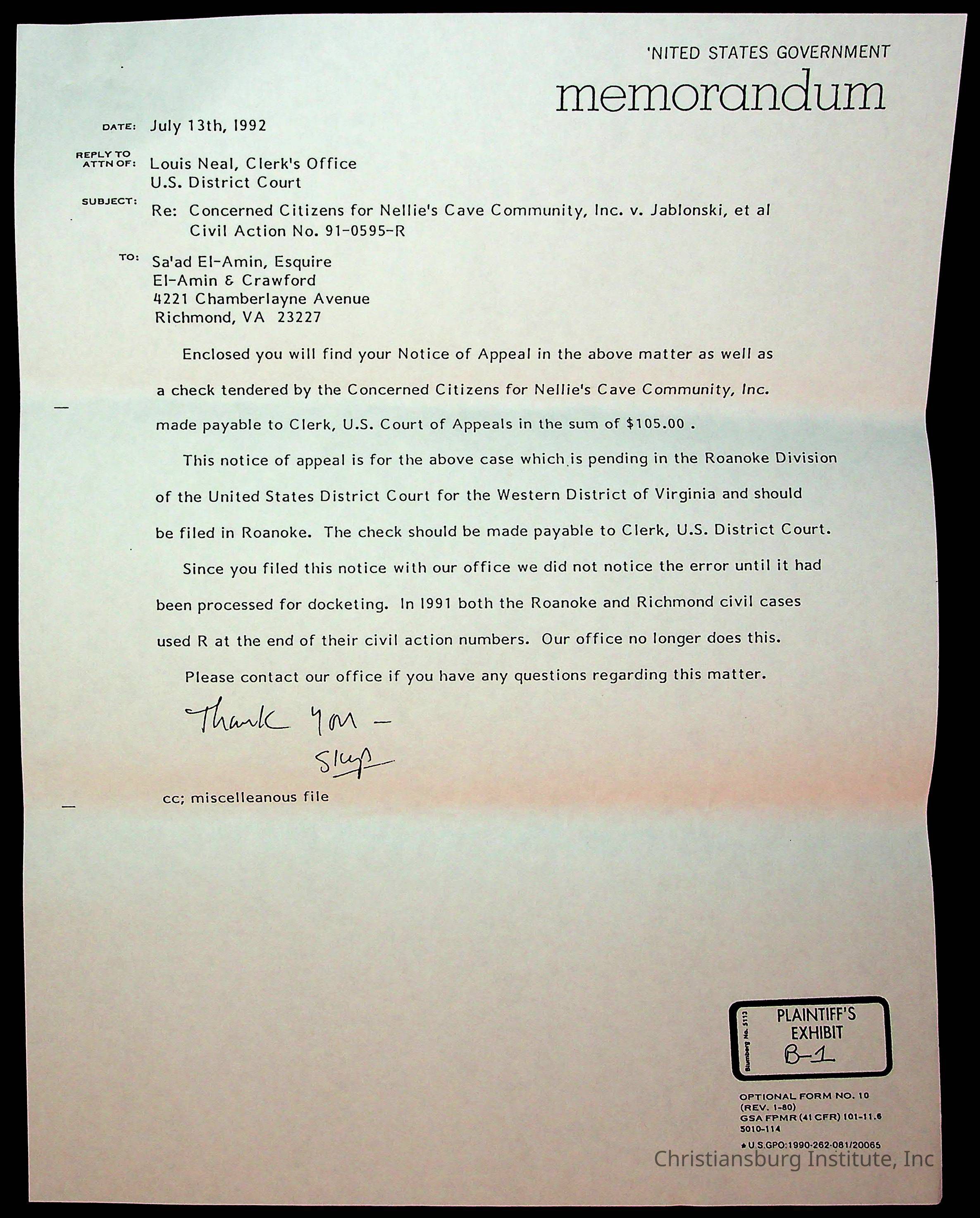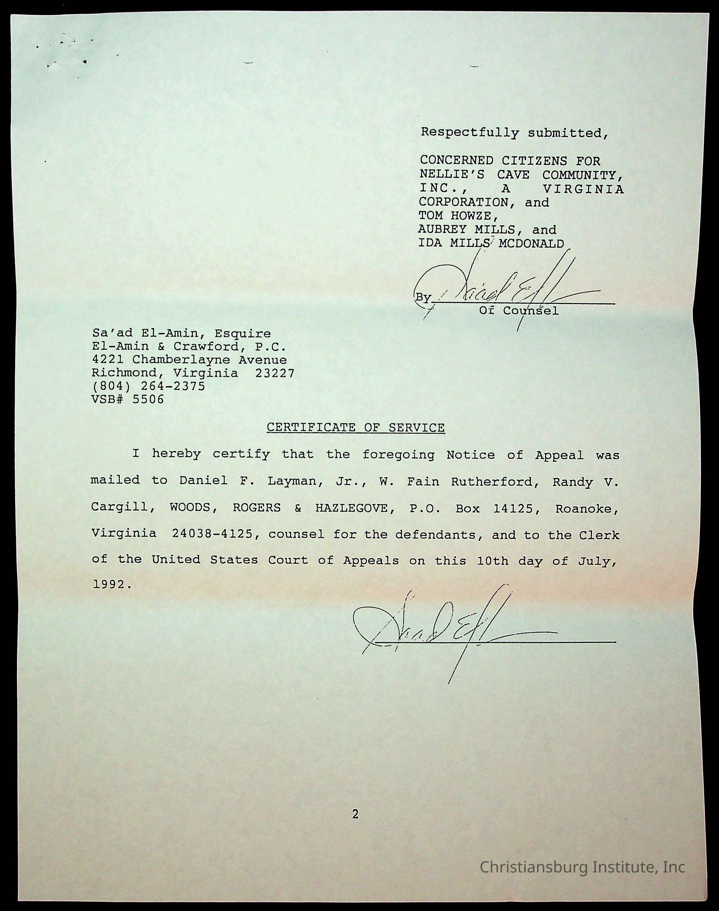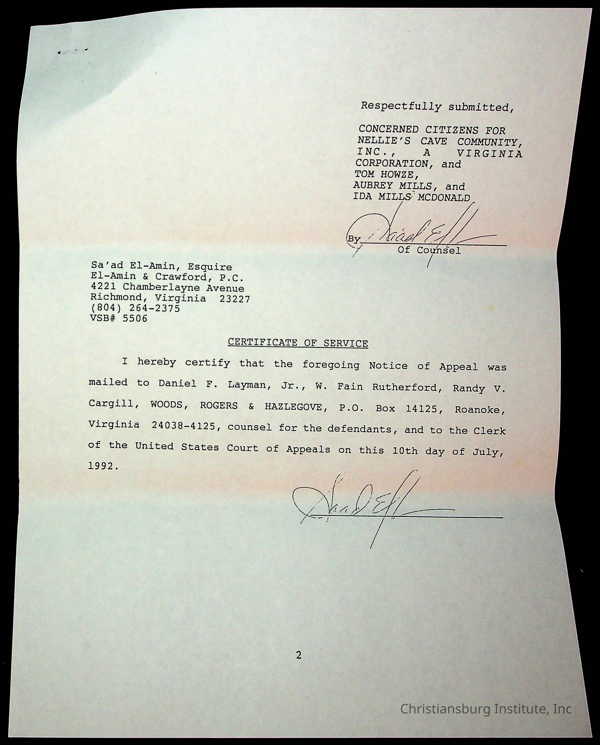 An archive of court documents in the case, concerned citizens for Nellies Cave community, Inc. versus the board of supervisors of Montgomery County, Virginia including the memorandum in opposition to the appellees' motion to dismiss the appeal for lack of jurisdiction, dated 1992.Collection