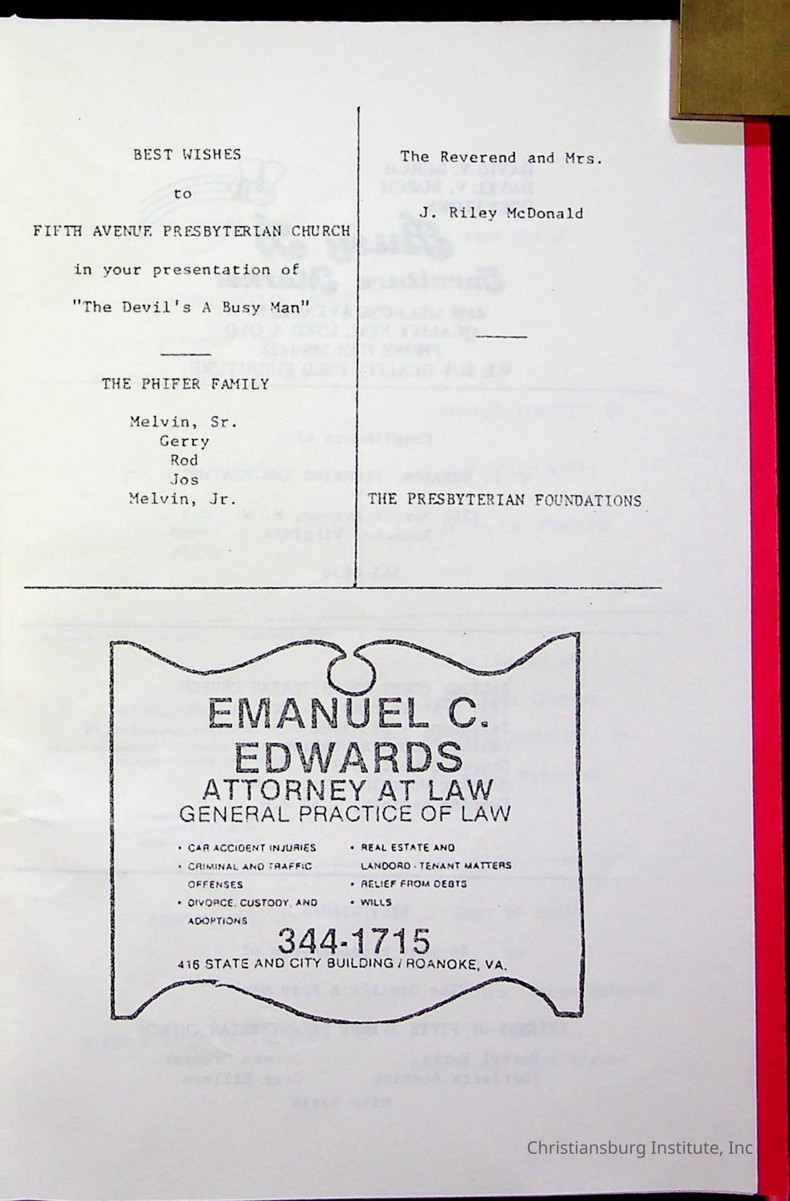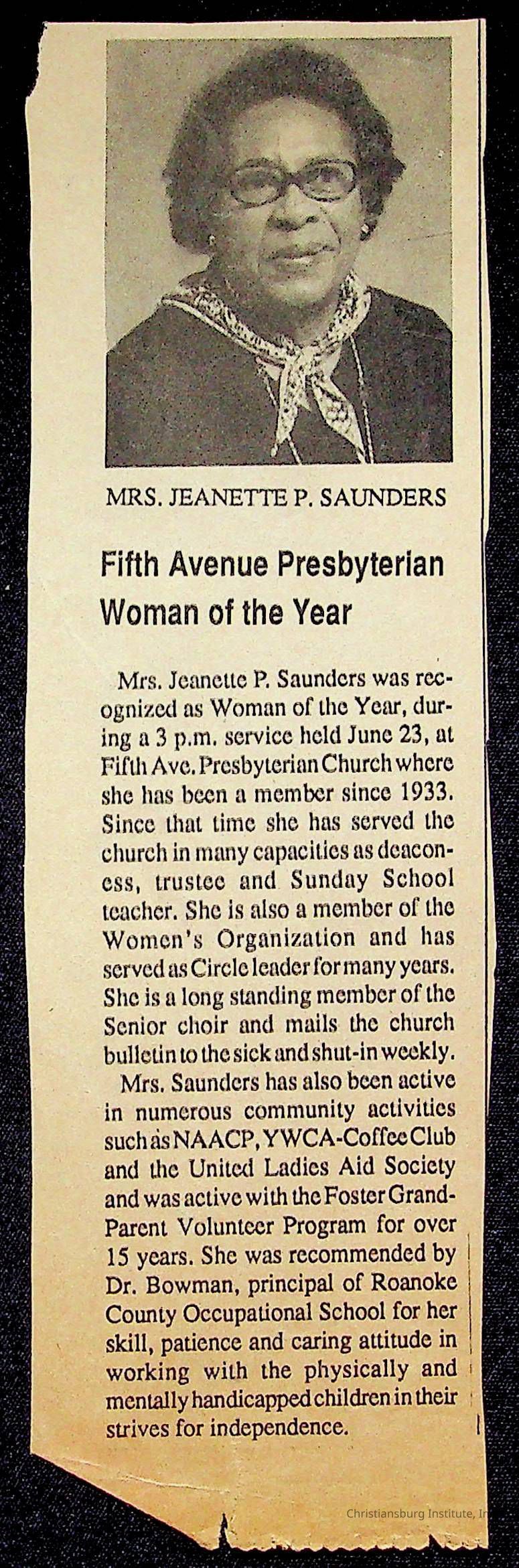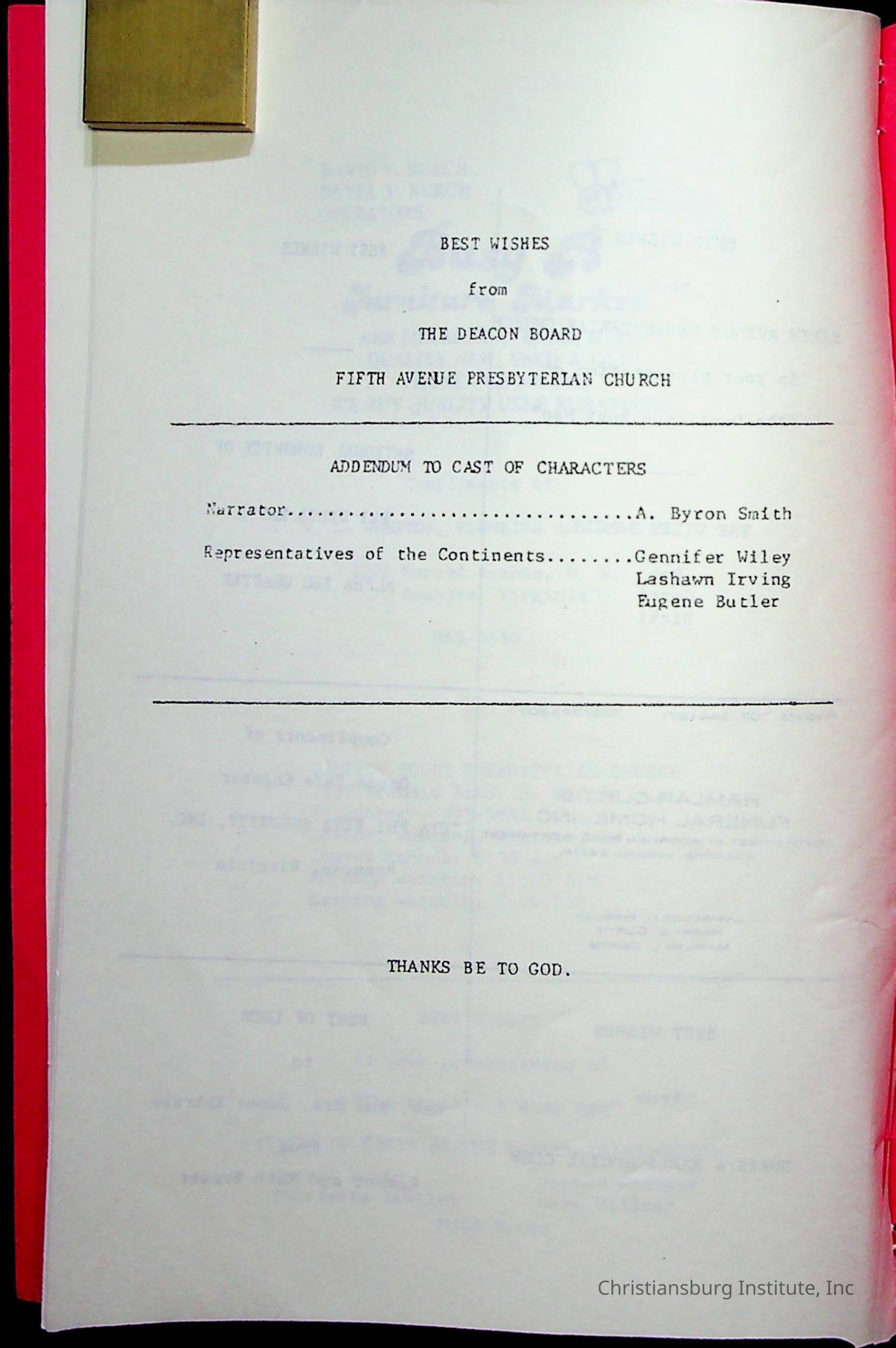 Copyright has been assigned to Christiansburg Institute Museum & Archives by Fifth Avenue Presbyterian Church. For permission to publish materials created by the donor, contact CIMA@christiansburginstitute.com. Materials not created by Fifth Avenue Presbyterian Church may still be under copyright.