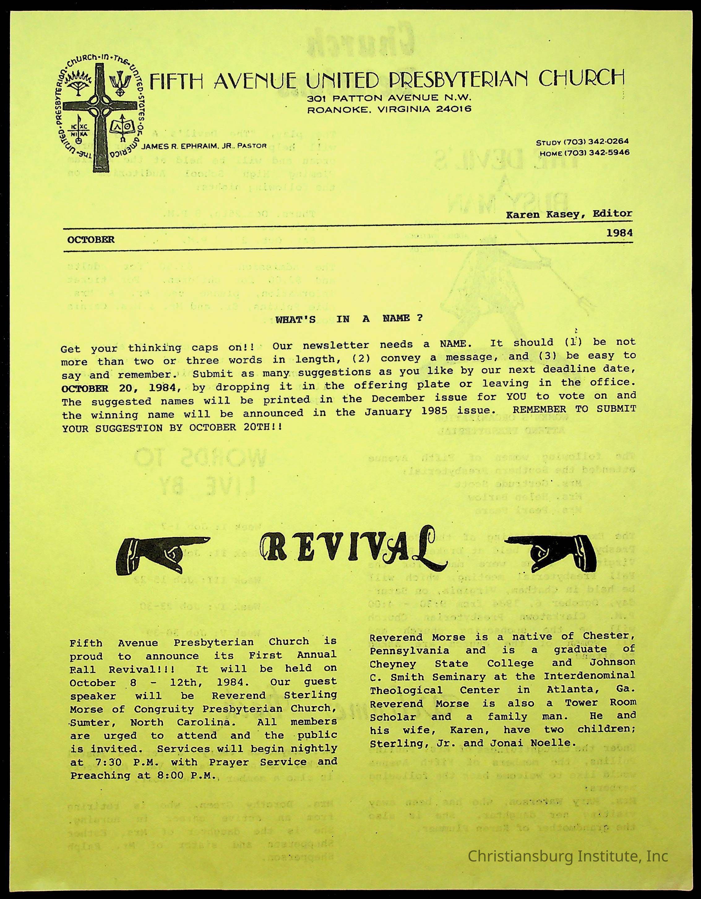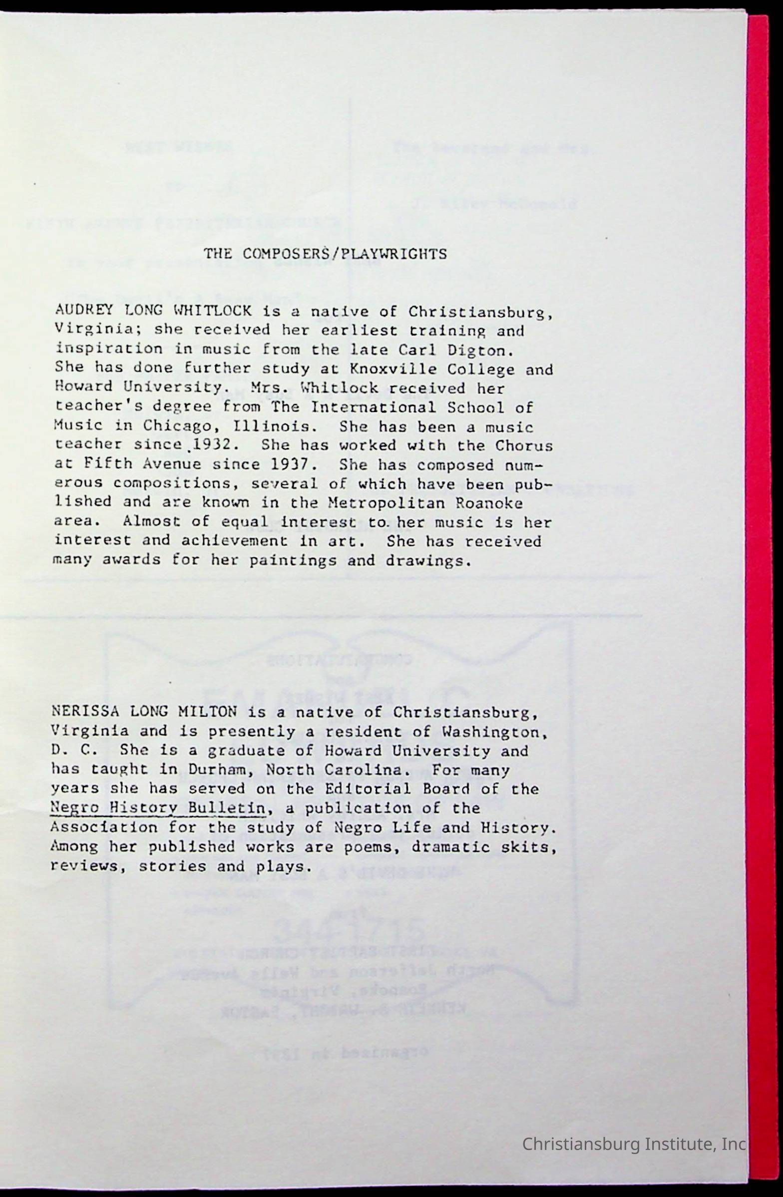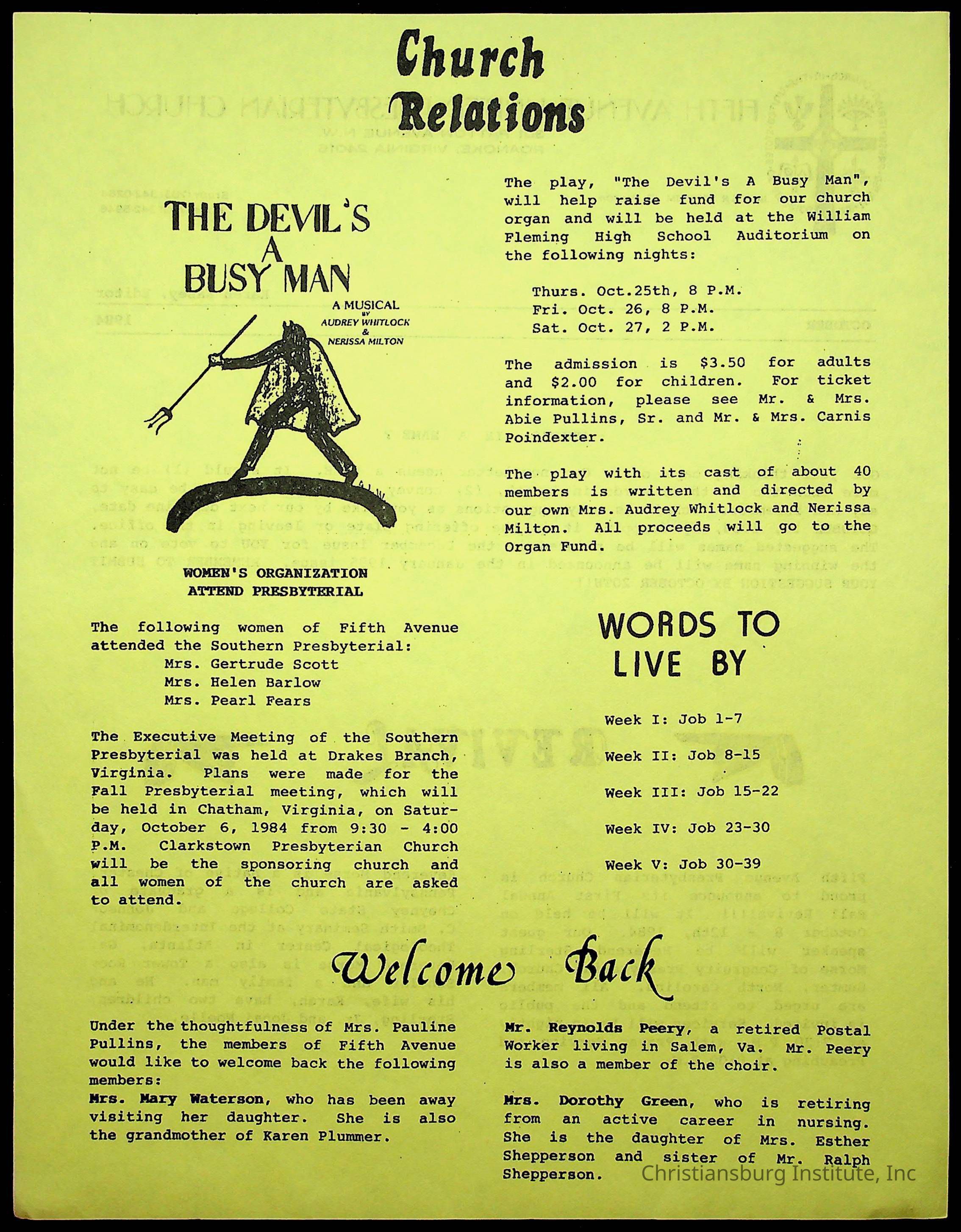 Copyright has been assigned to Christiansburg Institute Museum & Archives by Fifth Avenue Presbyterian Church. For permission to publish materials created by the donor, contact CIMA@christiansburginstitute.com. Materials not created by Fifth Avenue Presbyterian Church may still be under copyright.