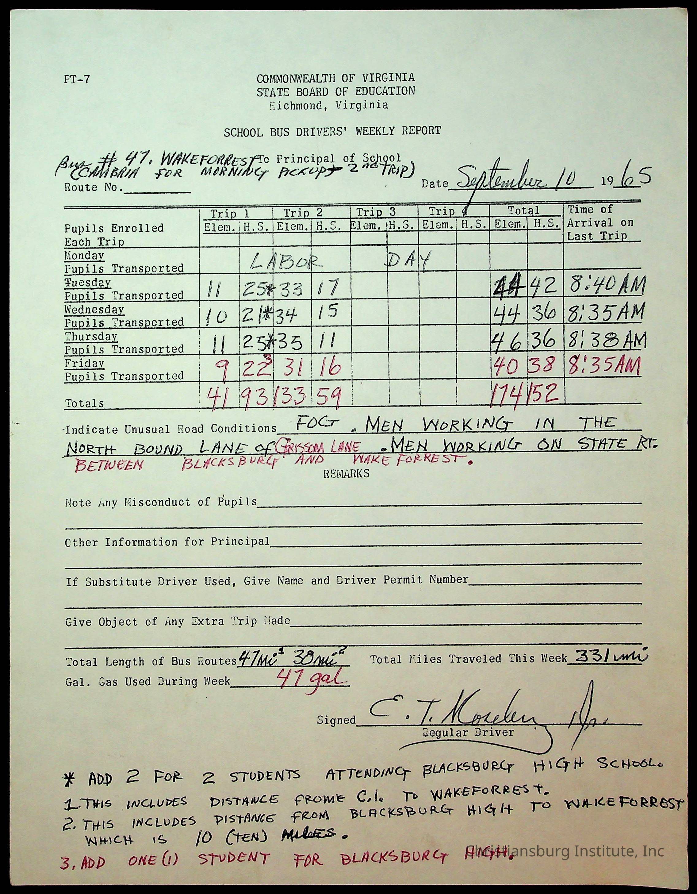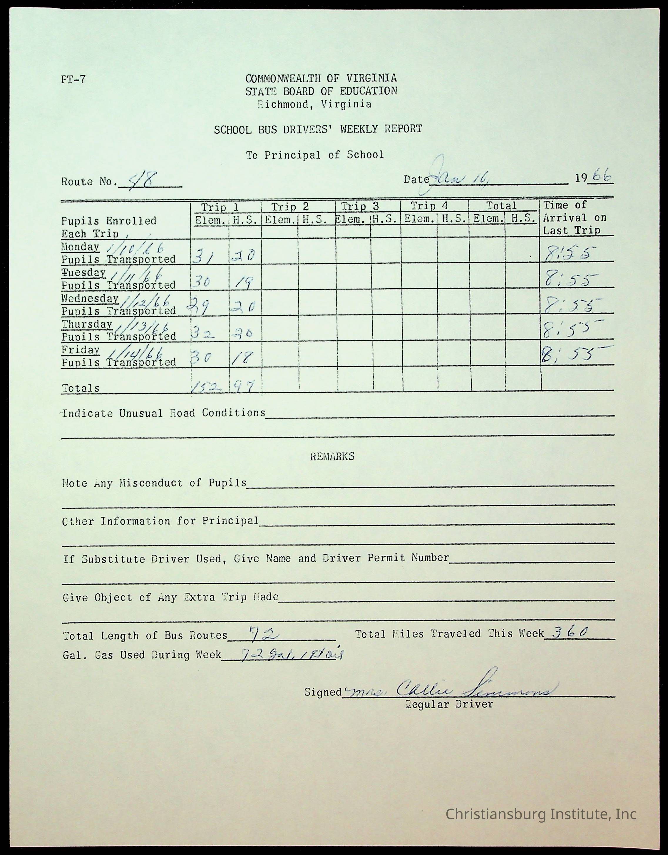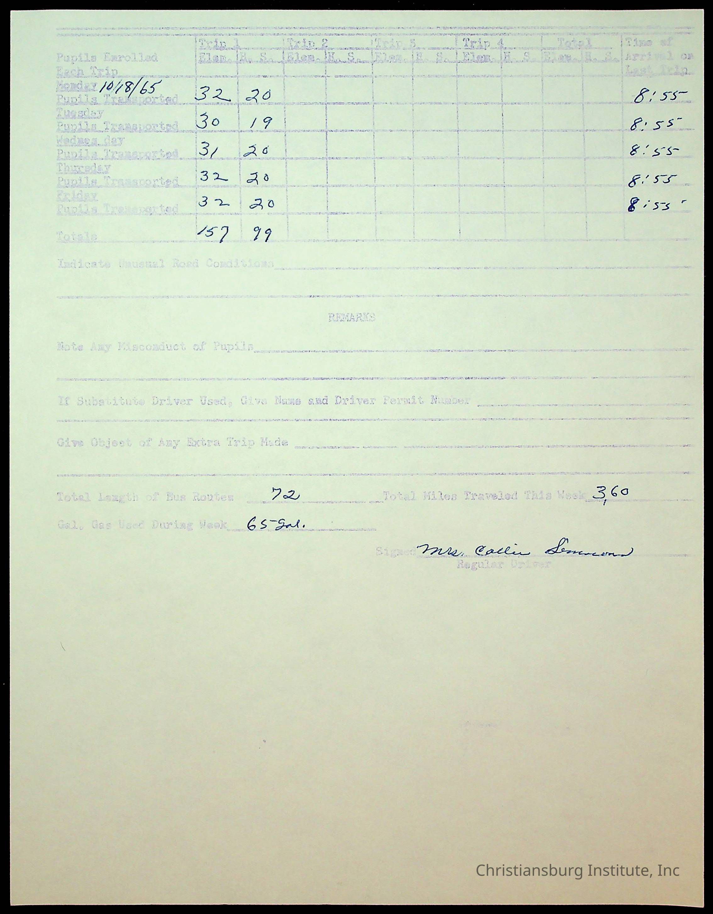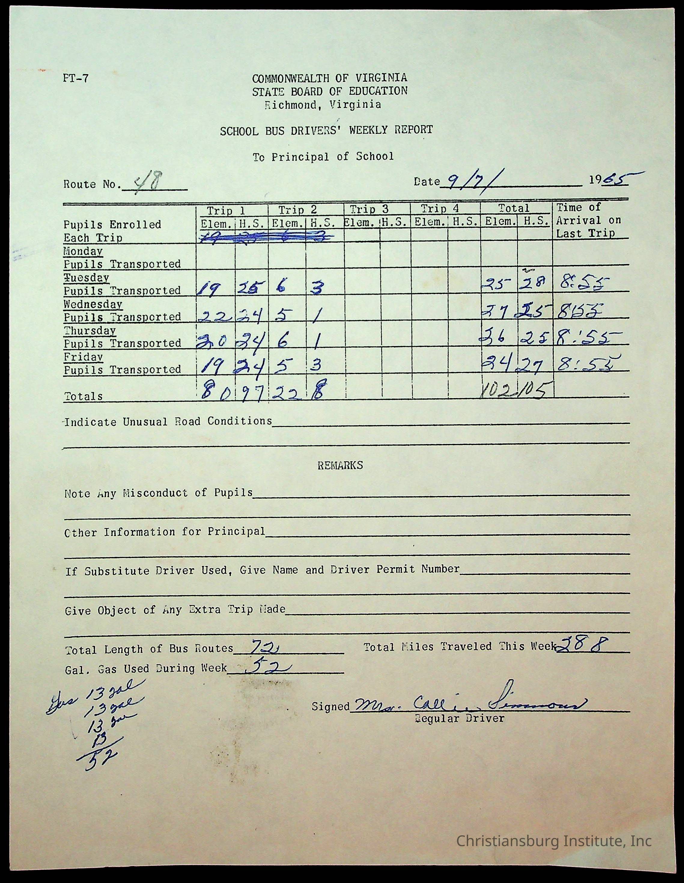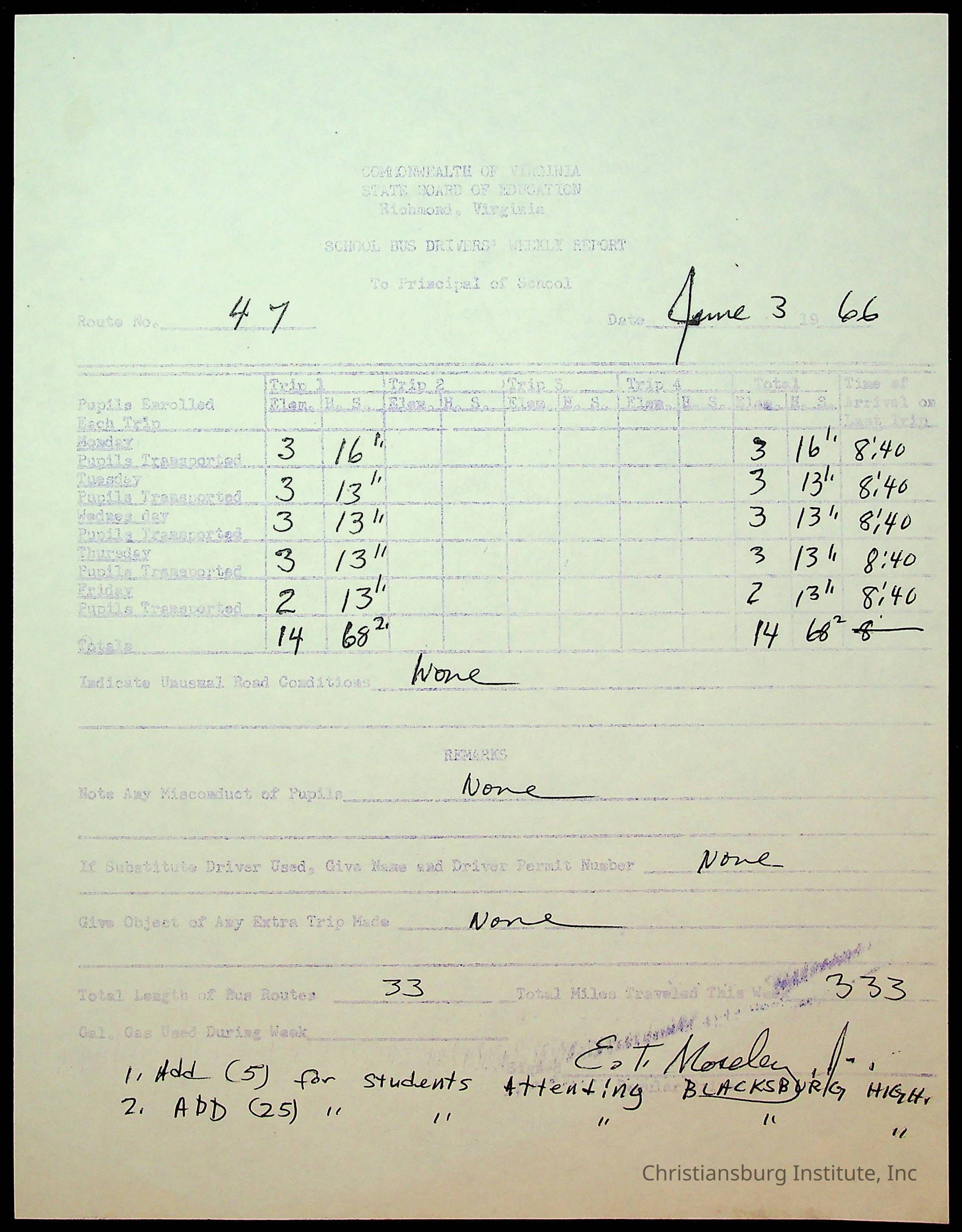 An archive of documents relating to the bus system at Christiansburg Institute and in Montgomery County, Virginia during the 1965-1966 school year.