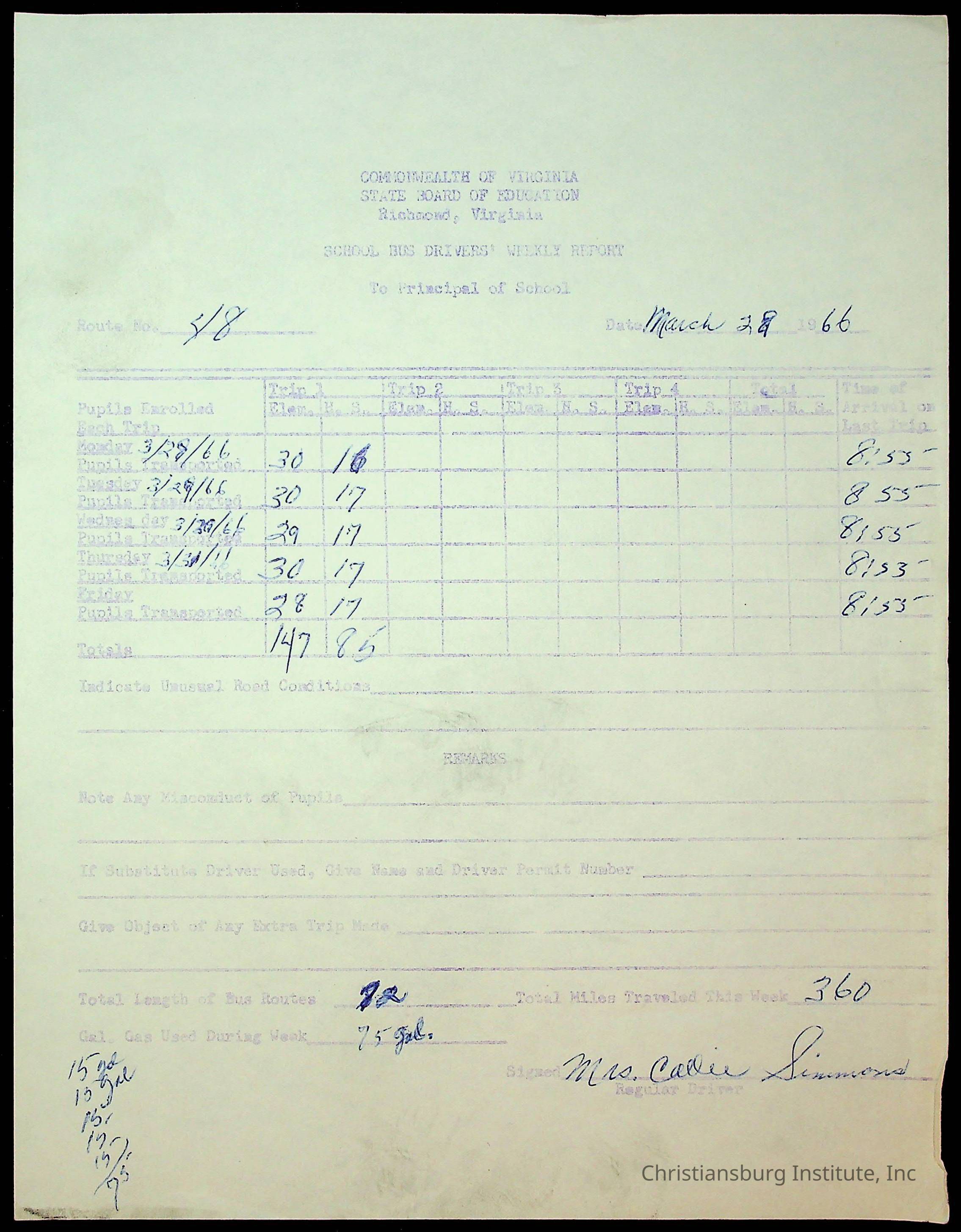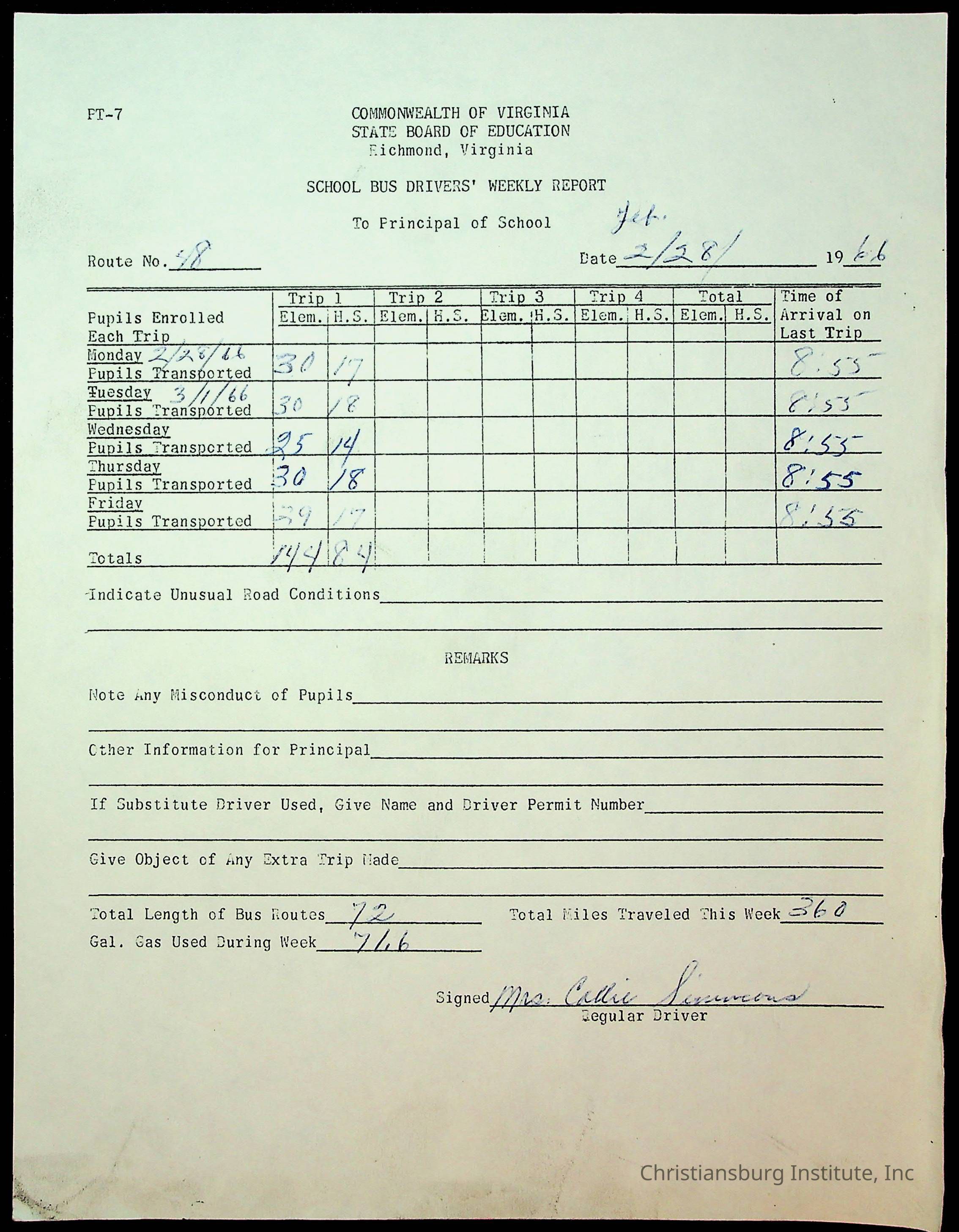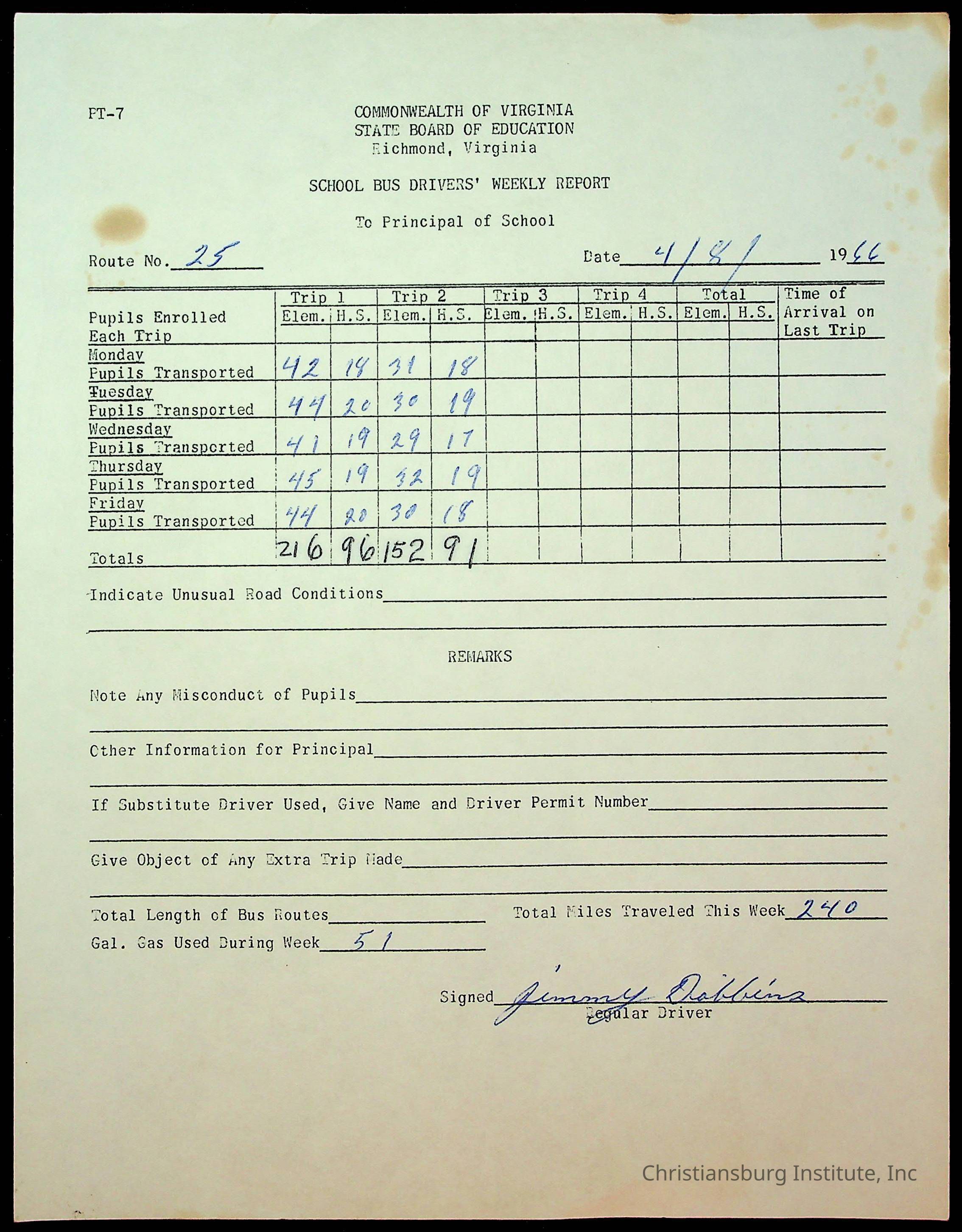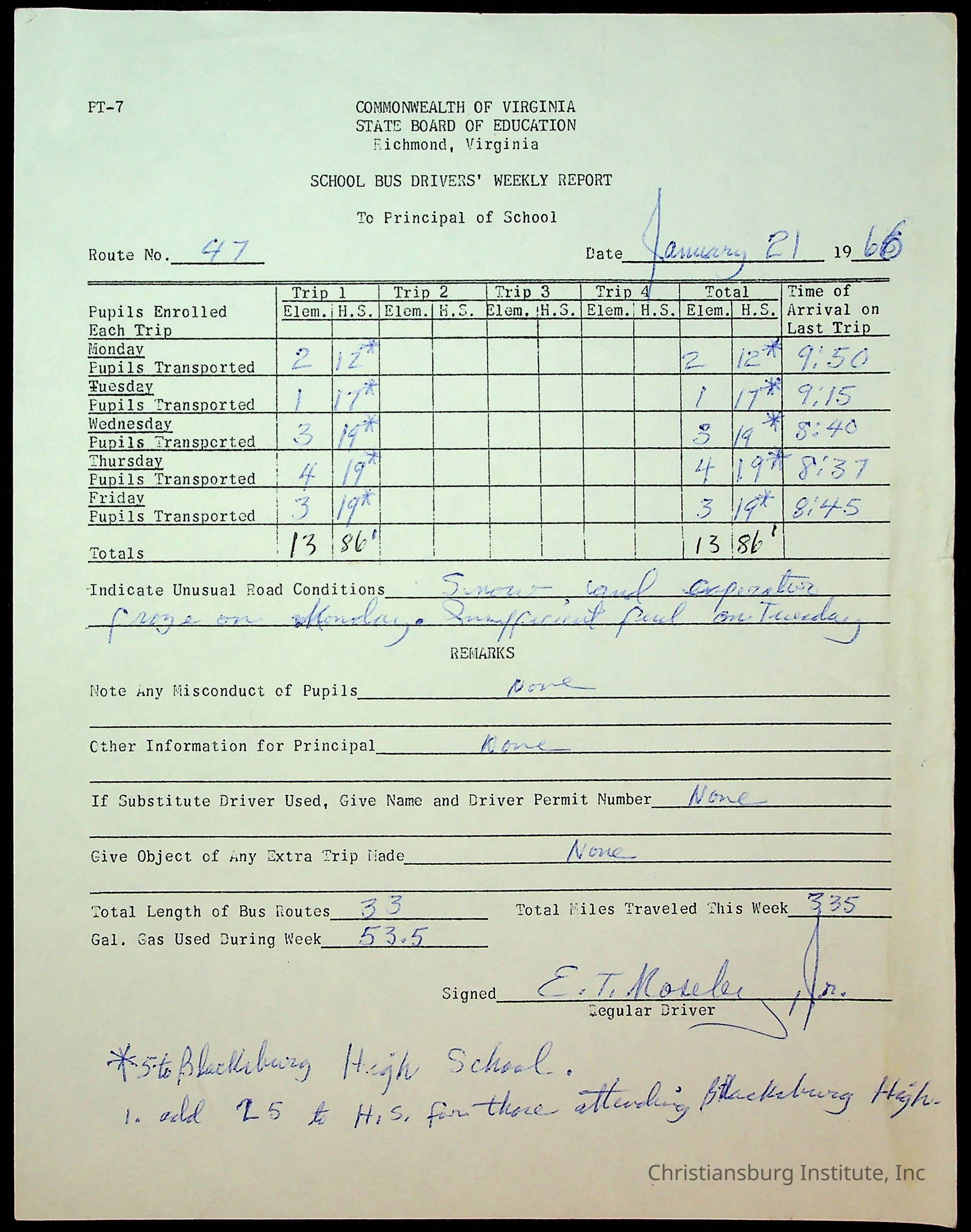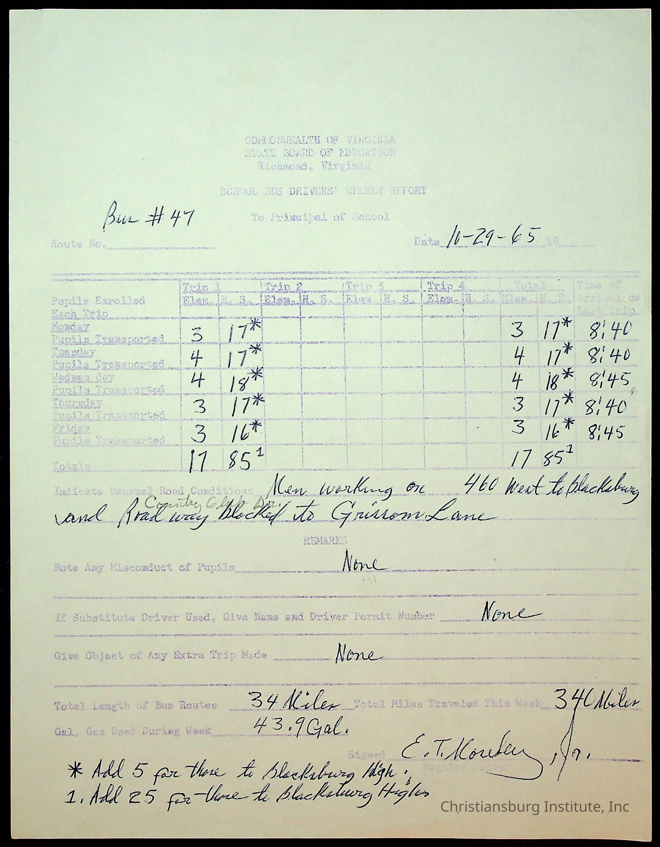 An archive of documents relating to the bus system at Christiansburg Institute and in Montgomery County, Virginia during the 1965-1966 school year.