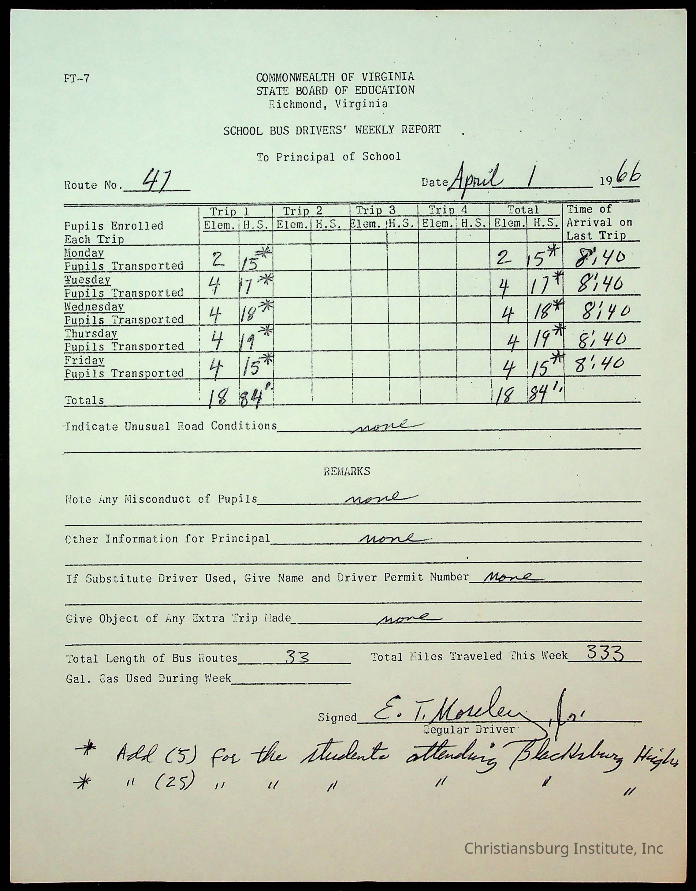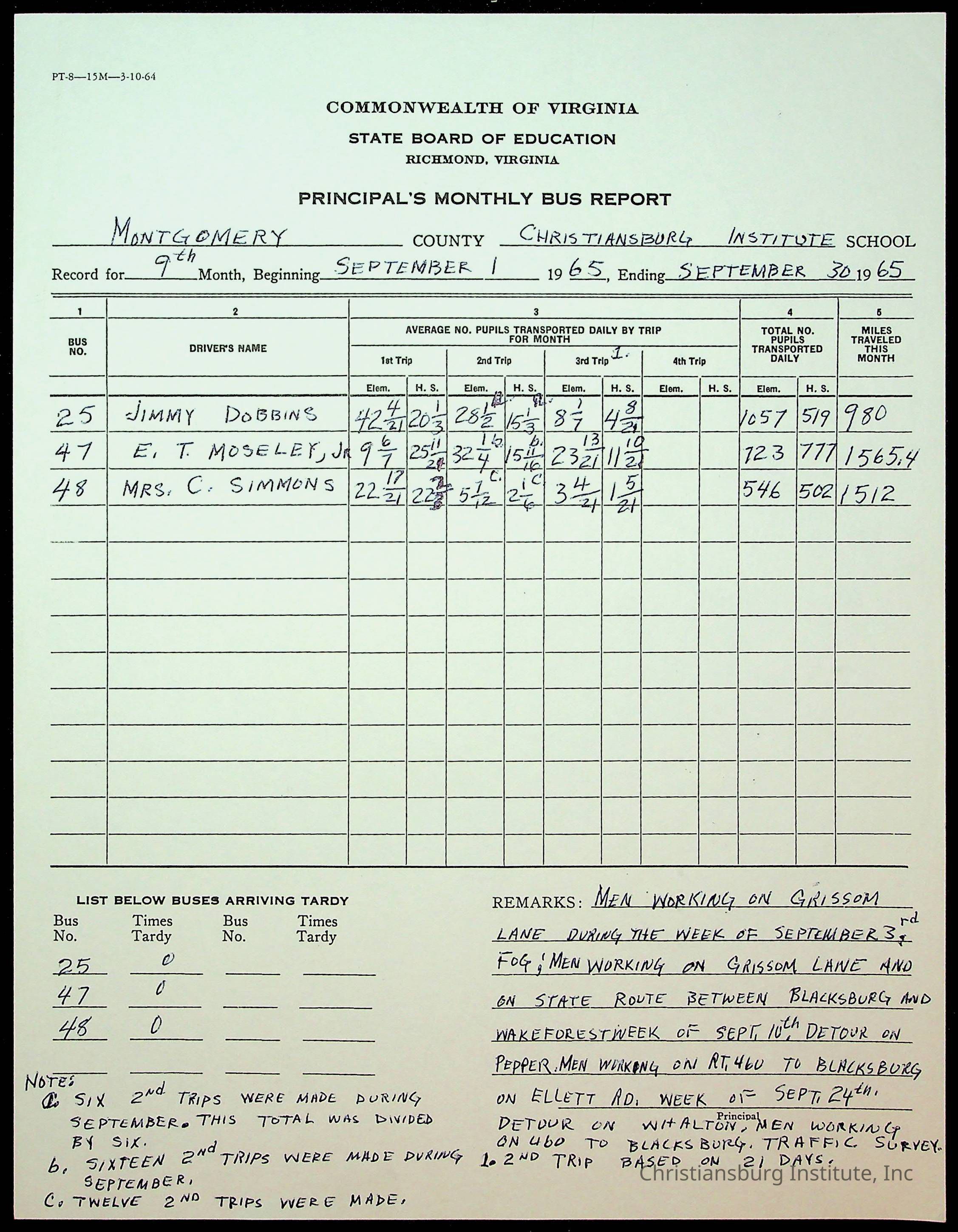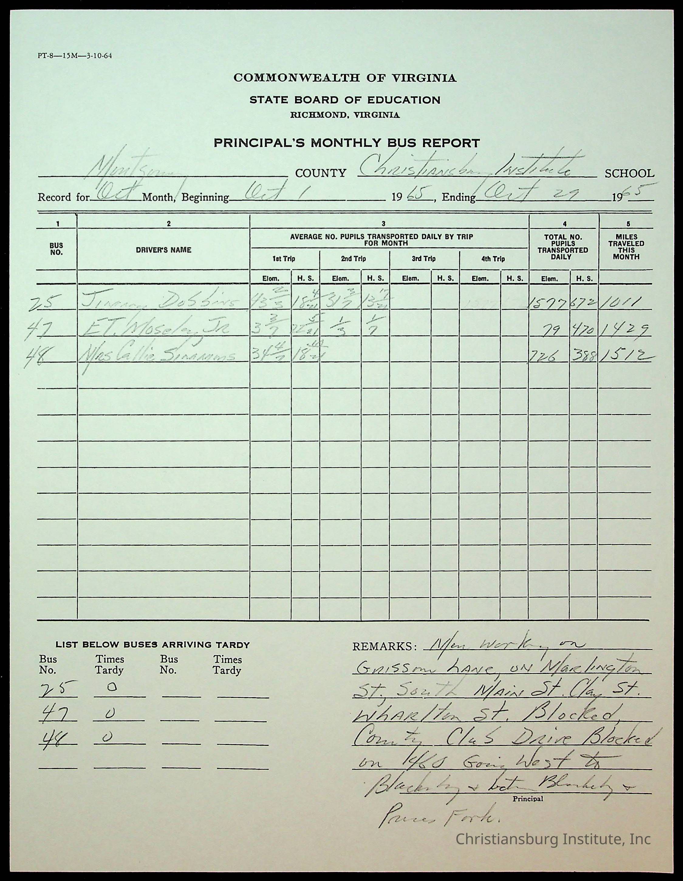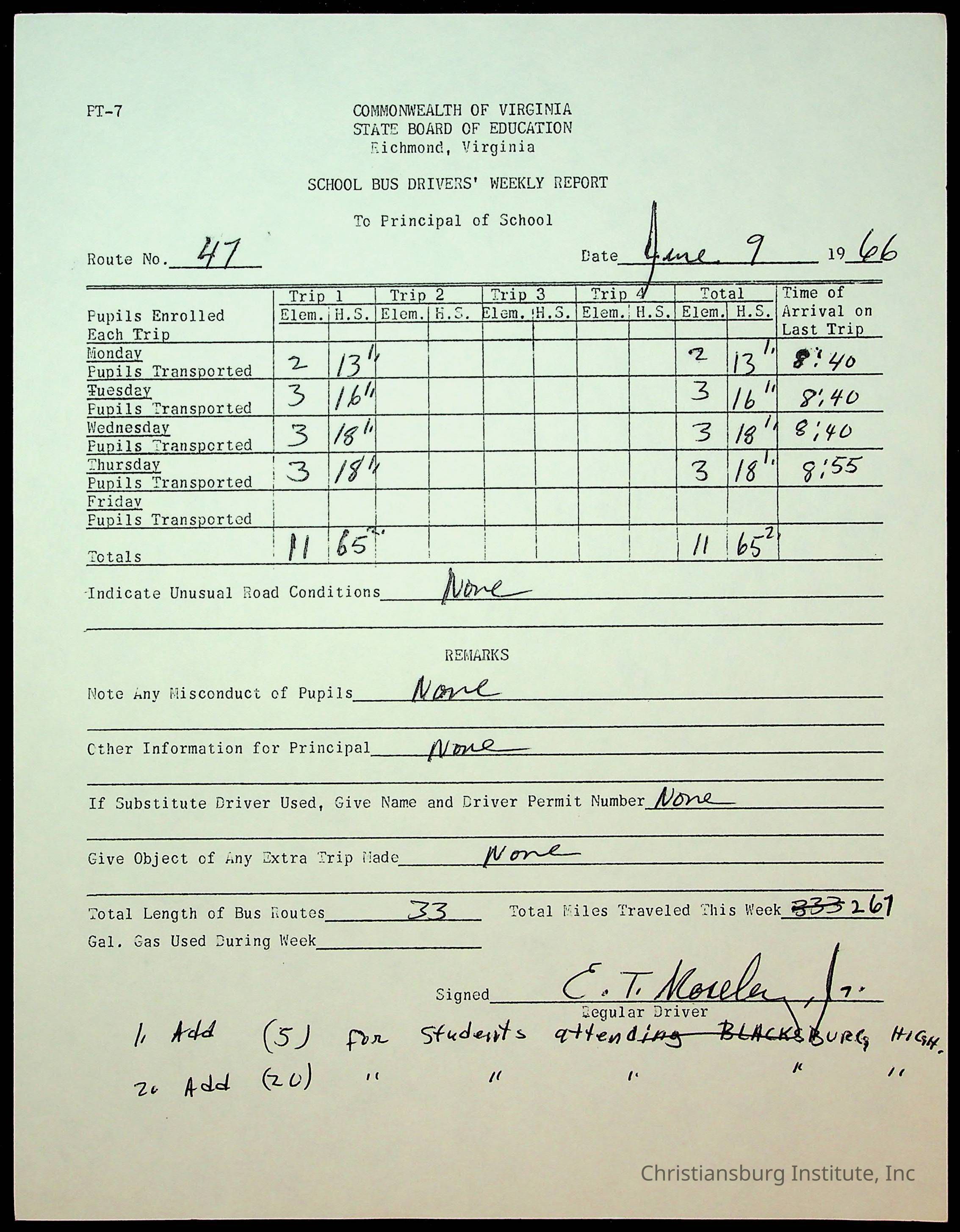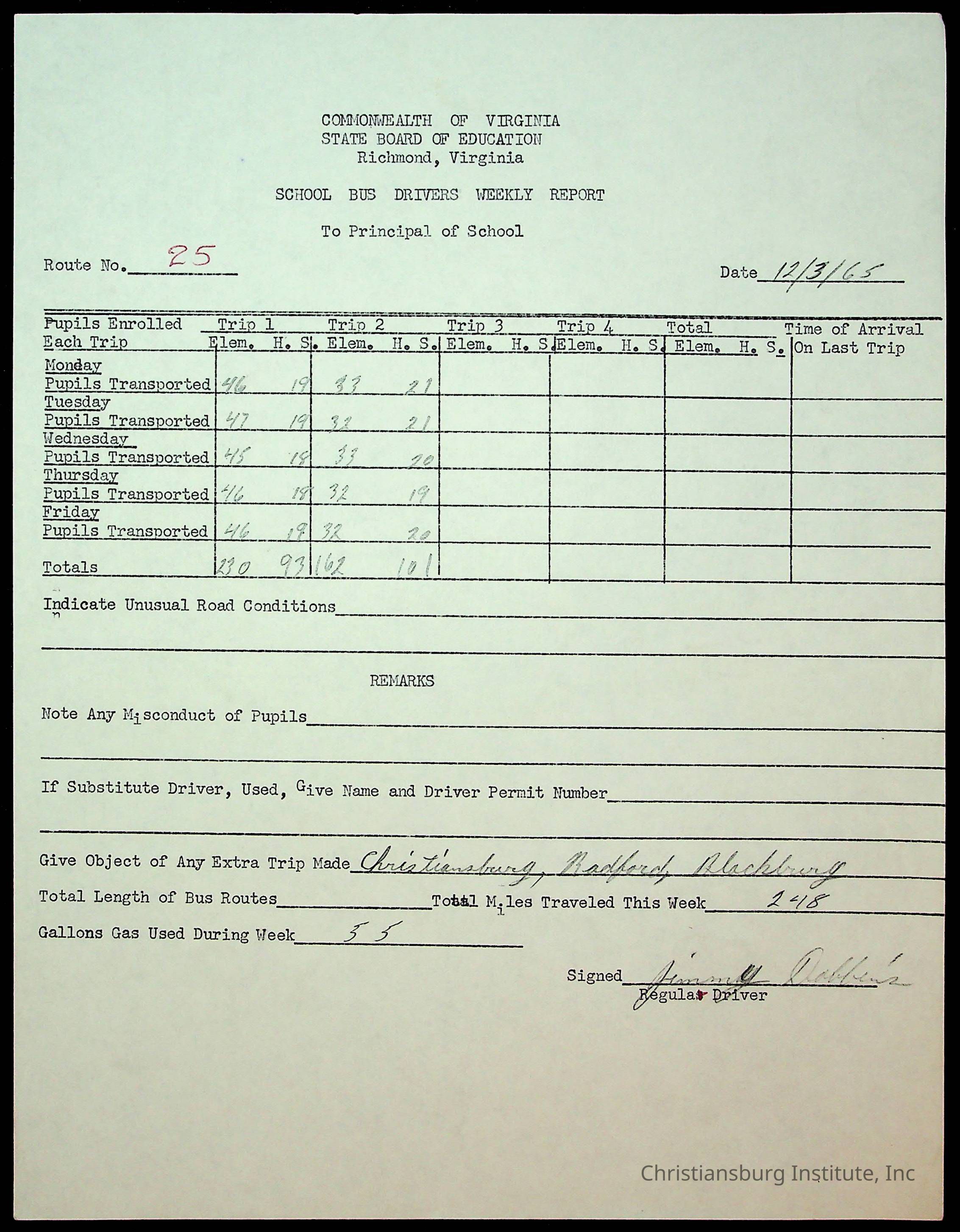 An archive of documents relating to the bus system at Christiansburg Institute and in Montgomery County, Virginia during the 1965-1966 school year.