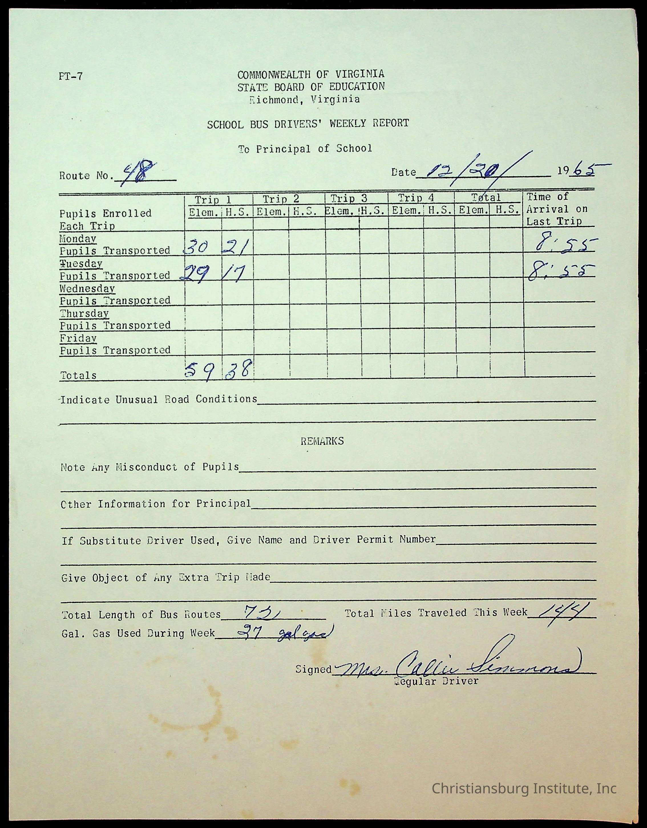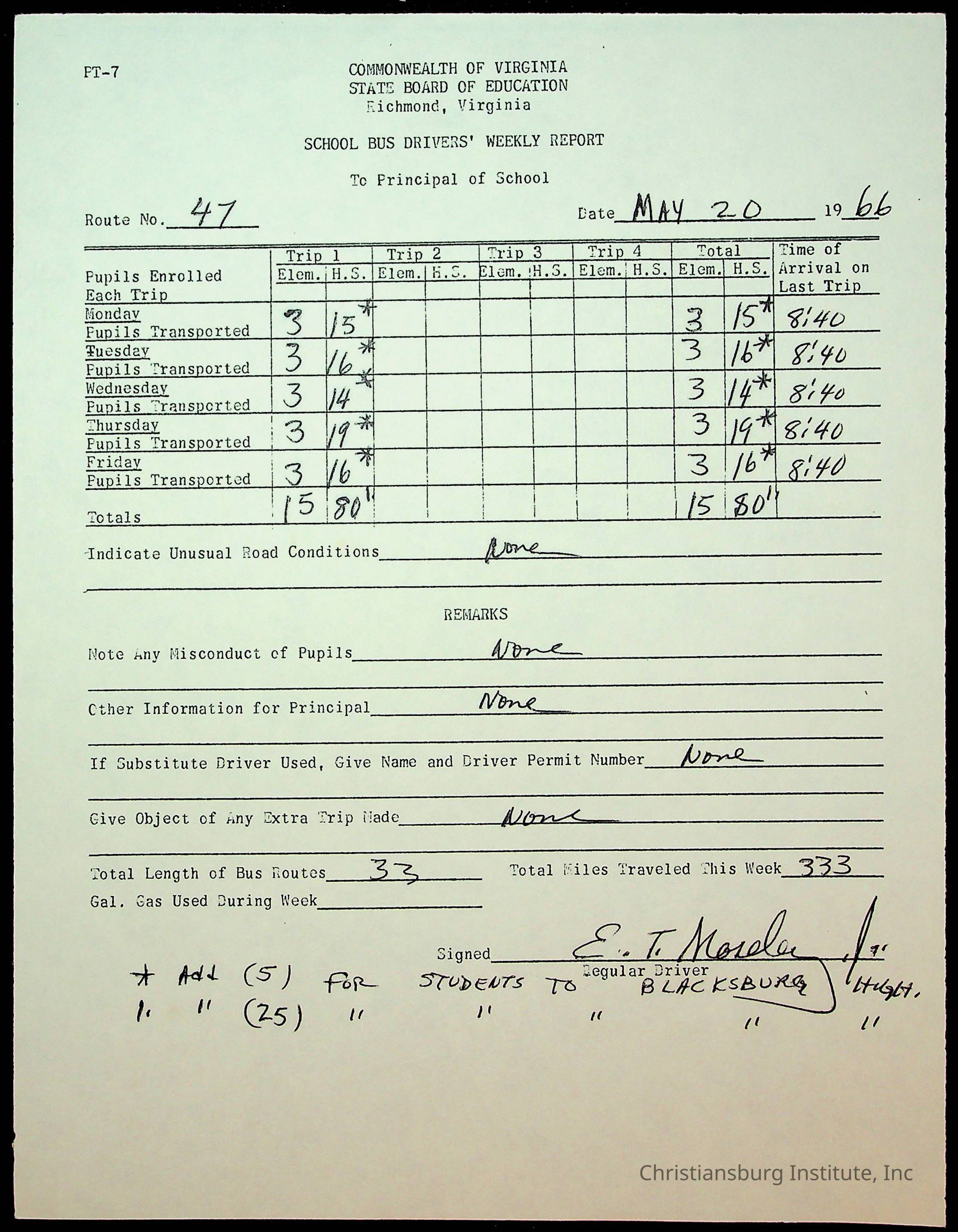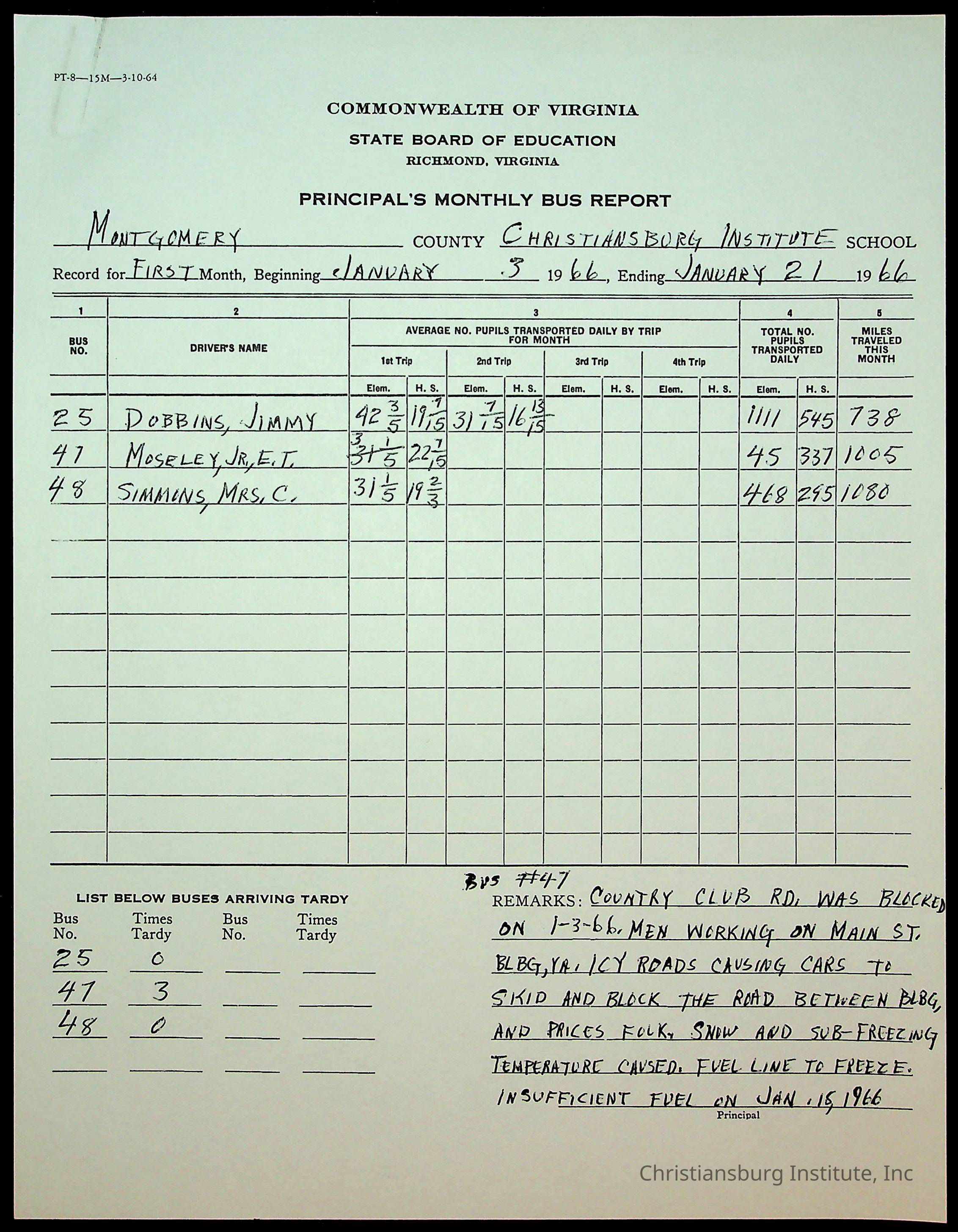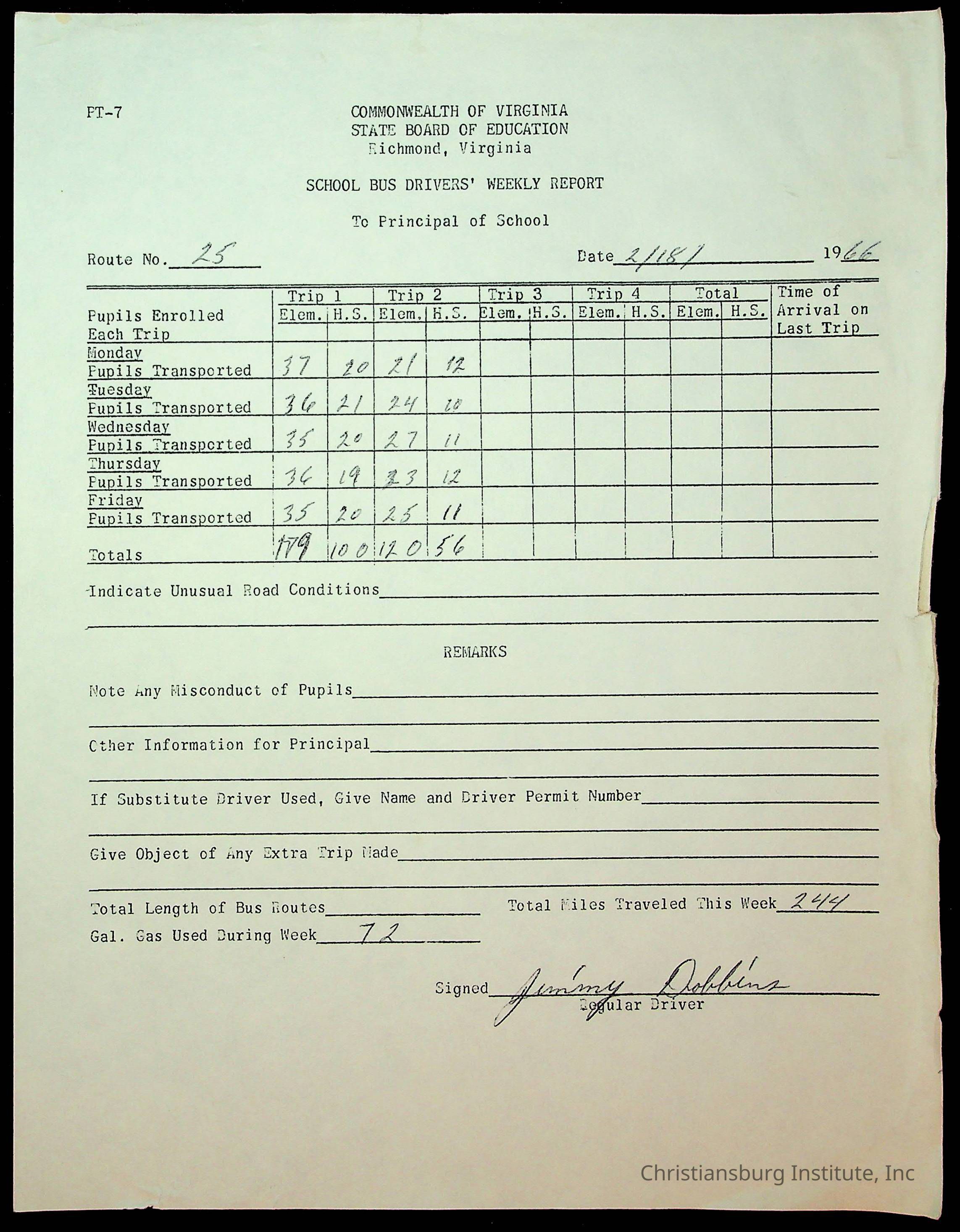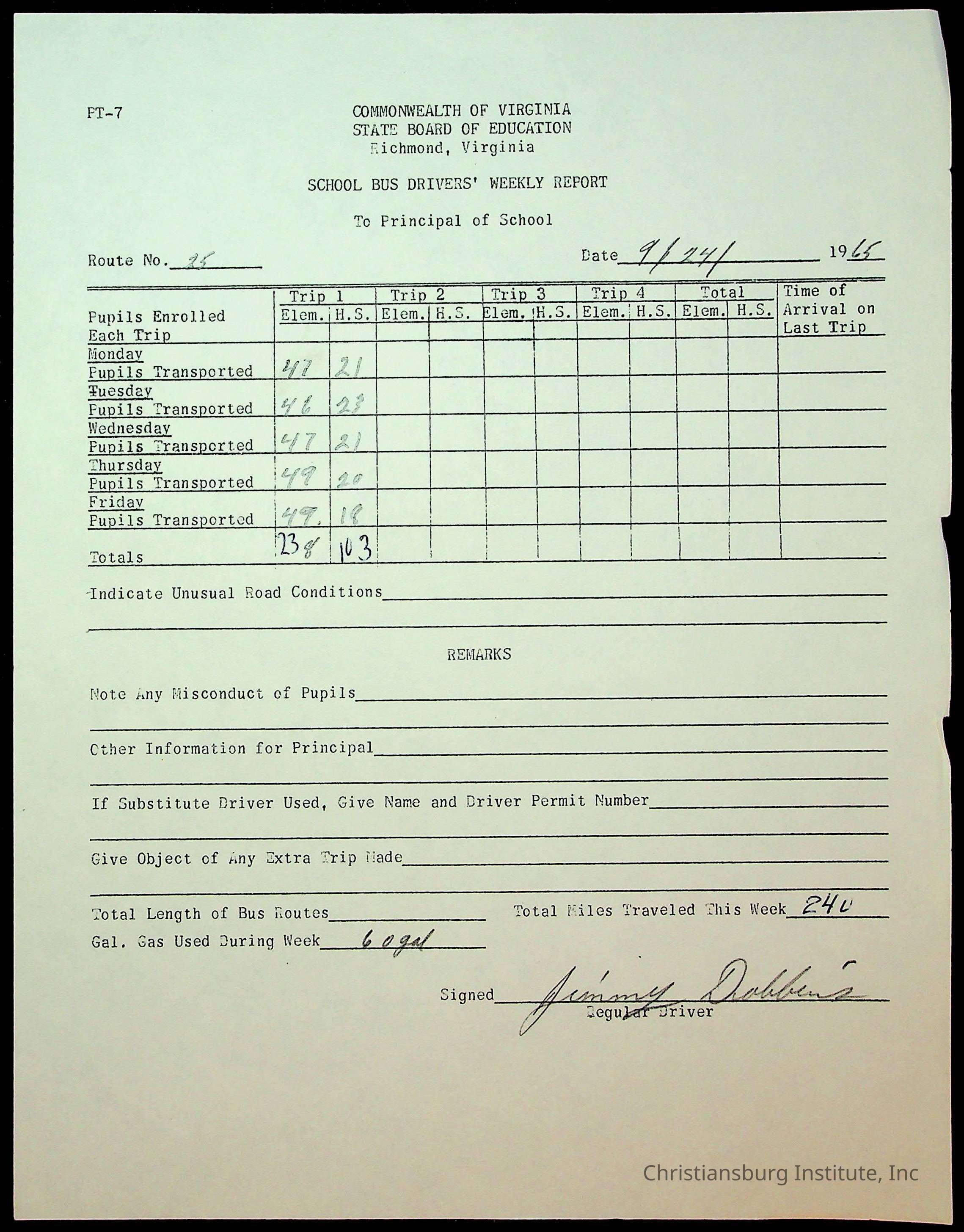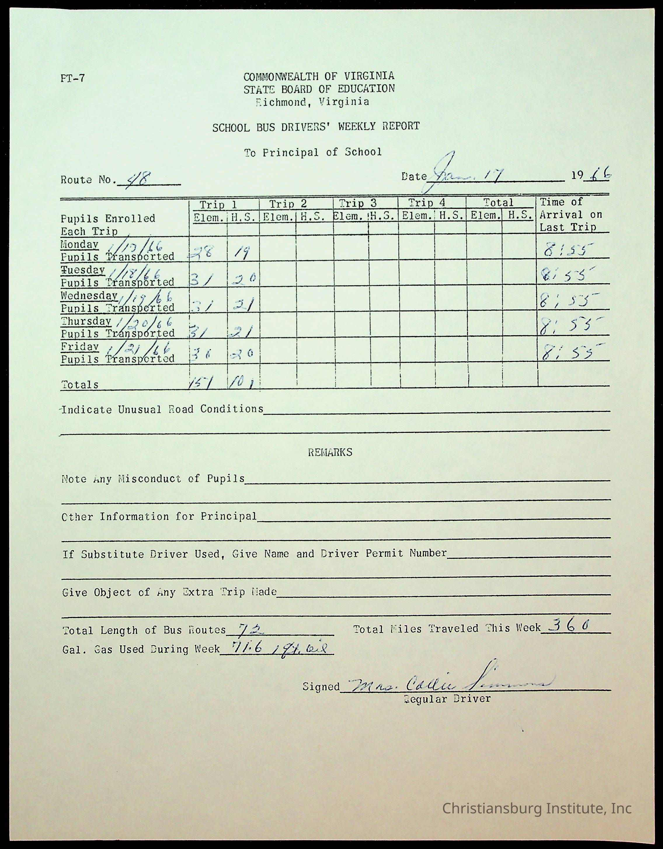 An archive of documents relating to the bus system at Christiansburg Institute and in Montgomery County, Virginia during the 1965-1966 school year.