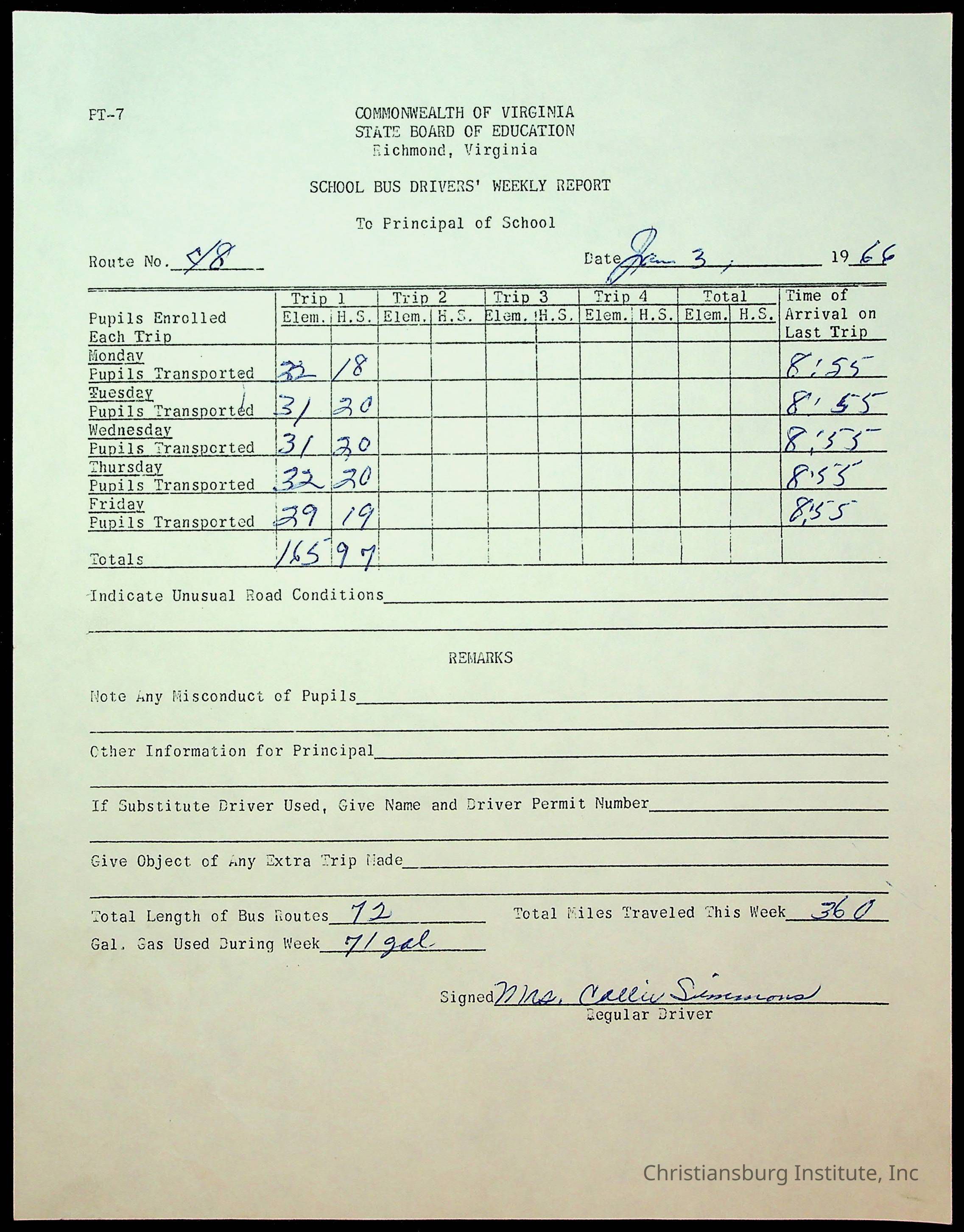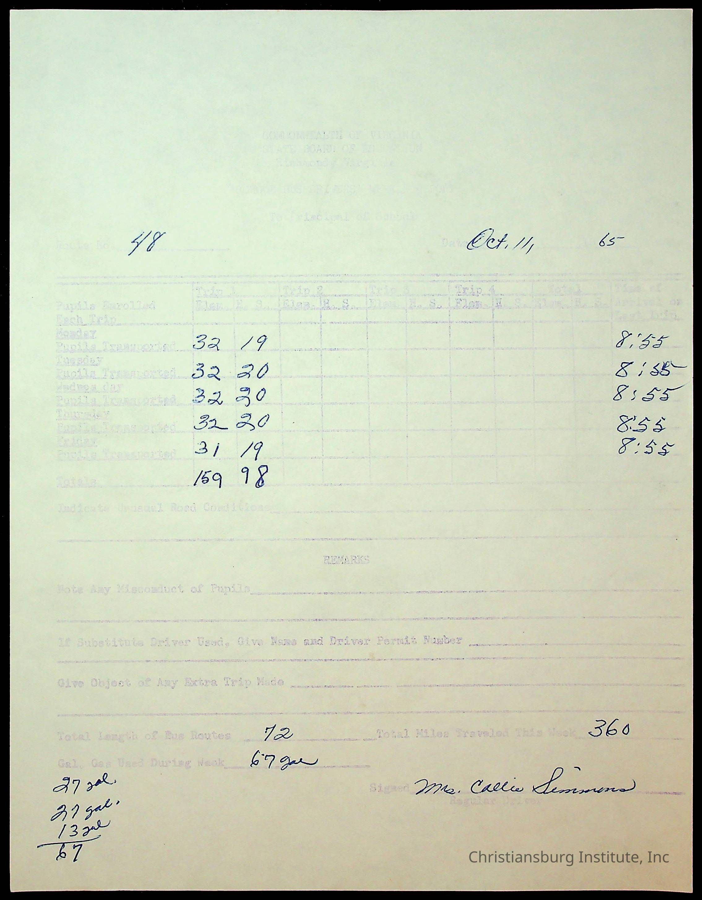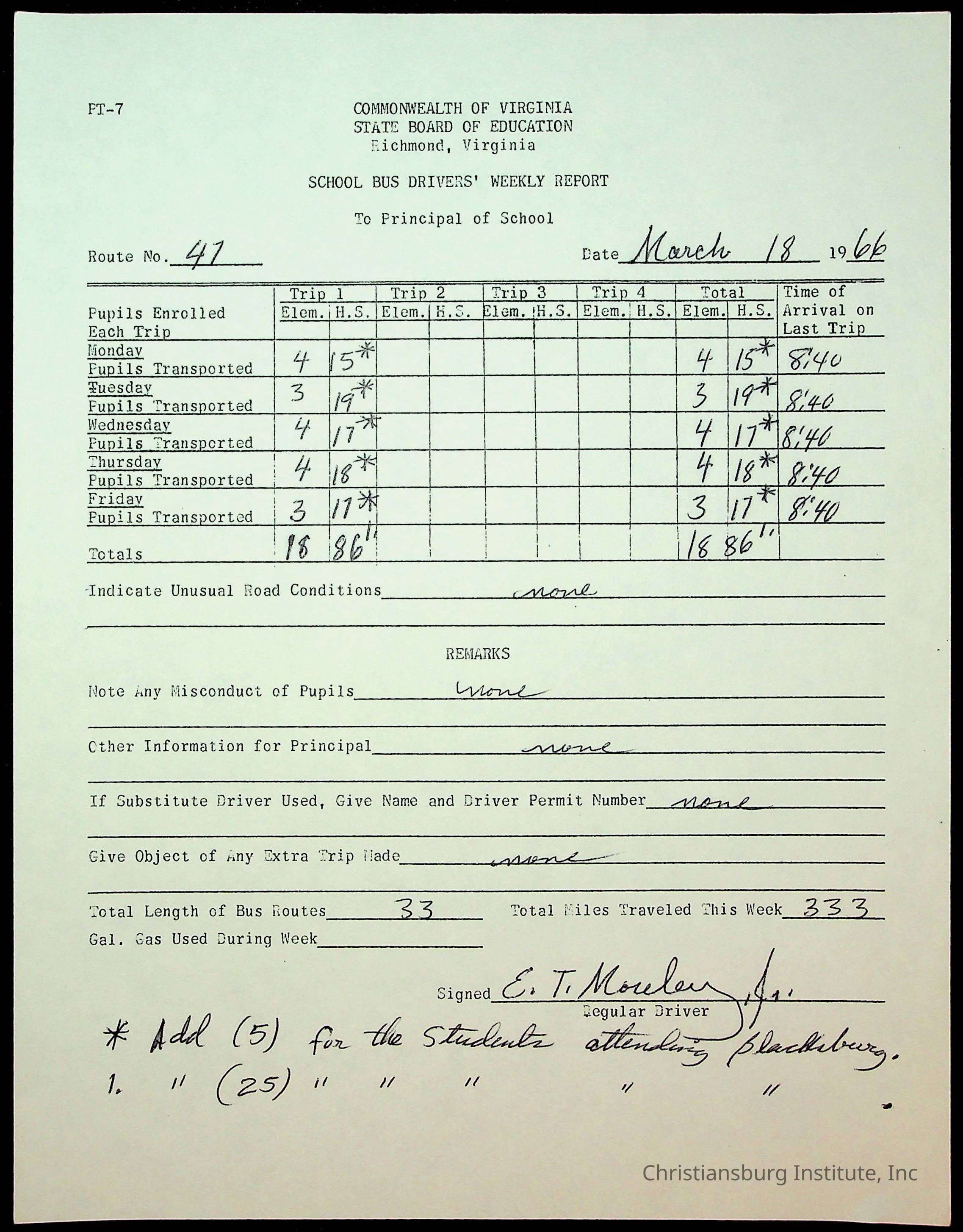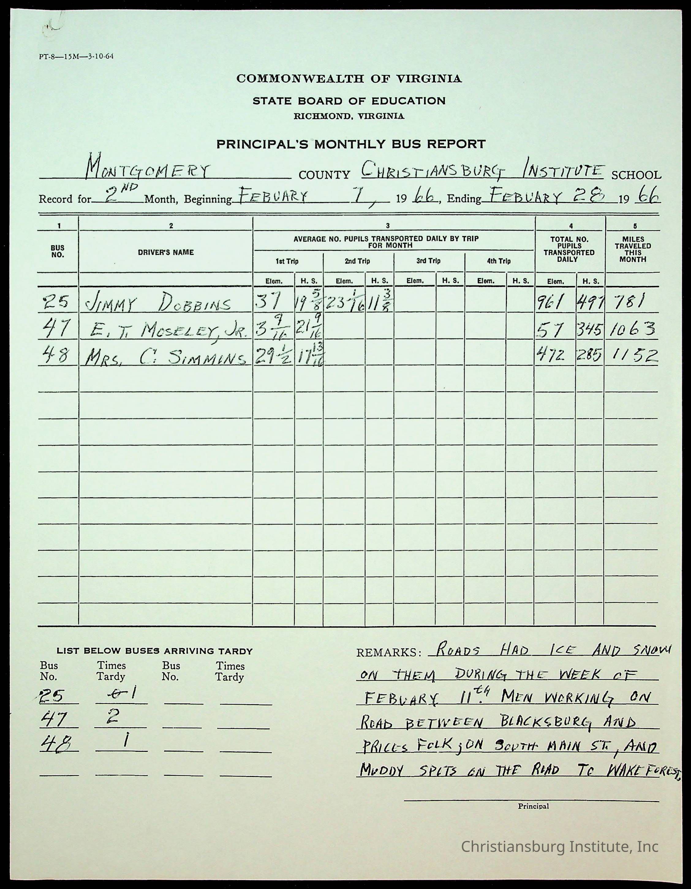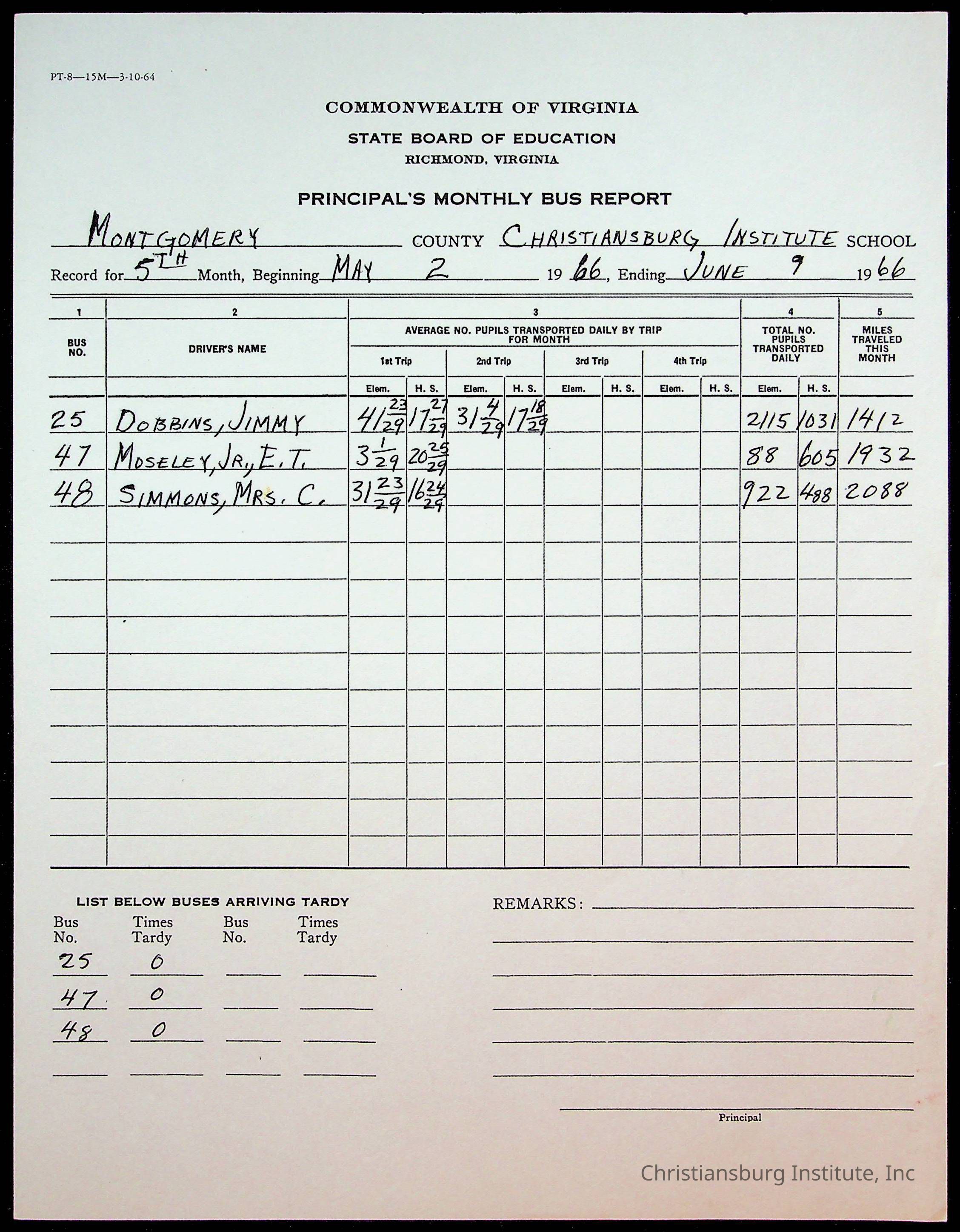 An archive of documents relating to the bus system at Christiansburg Institute and in Montgomery County, Virginia during the 1965-1966 school year.
