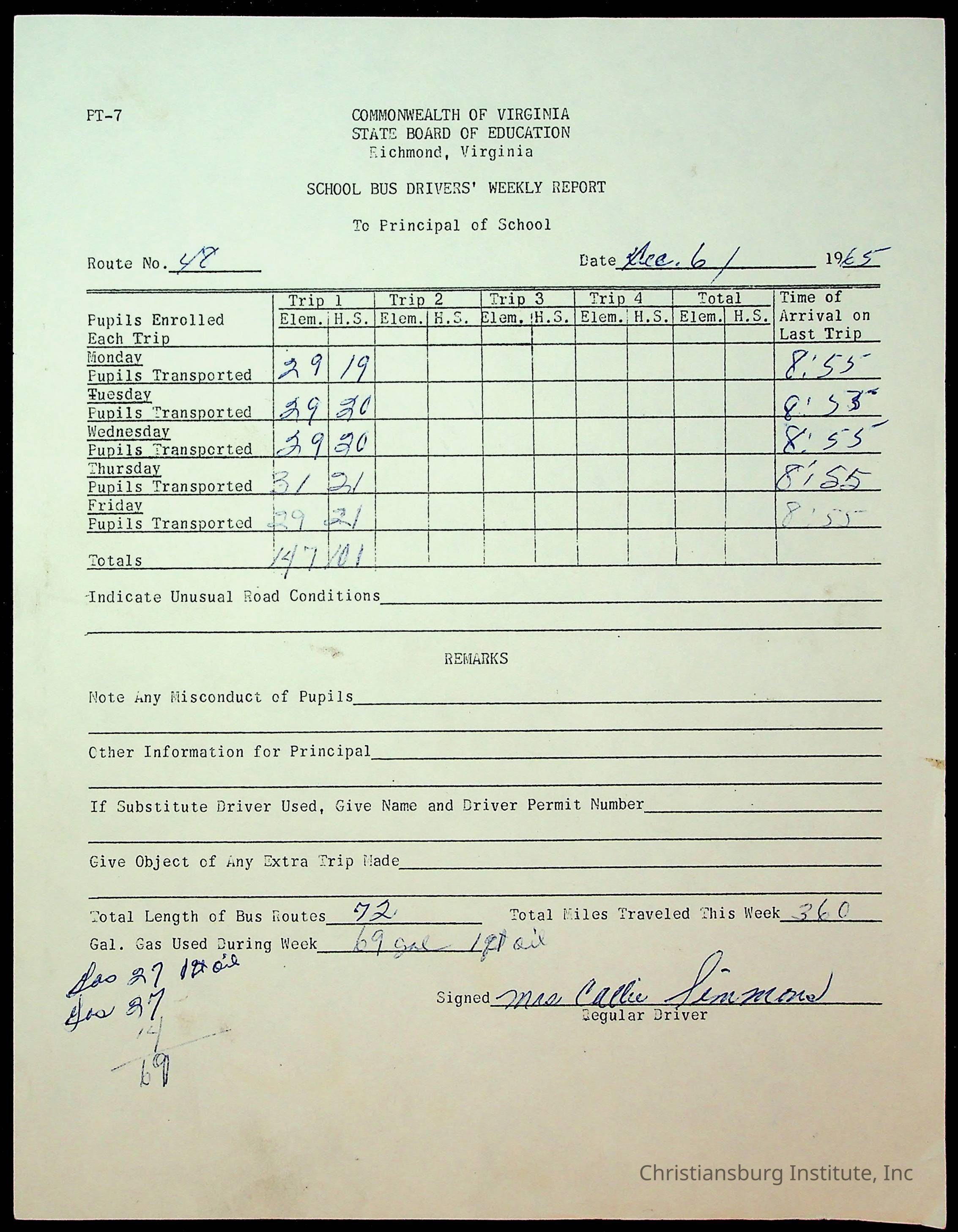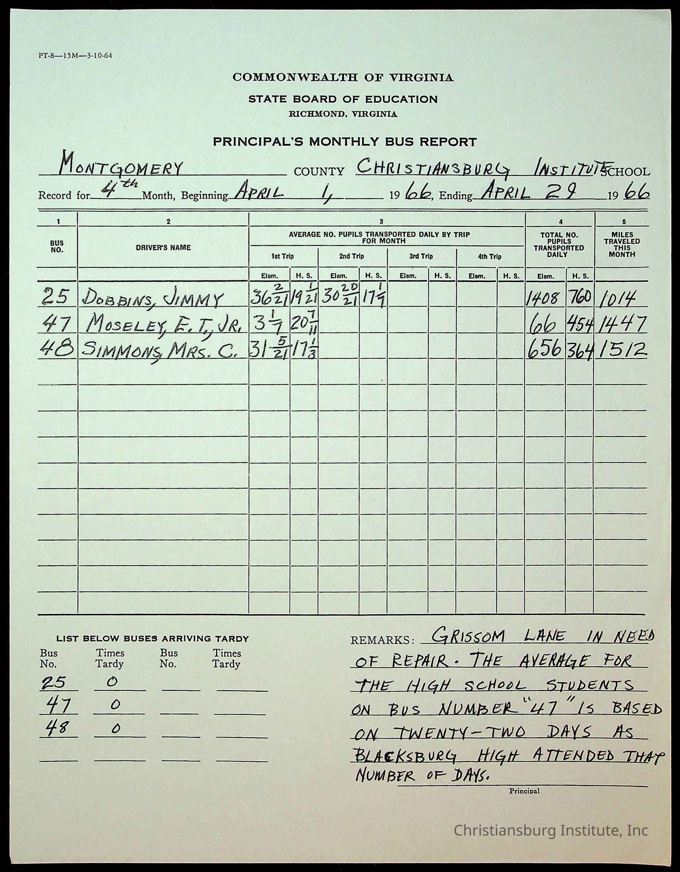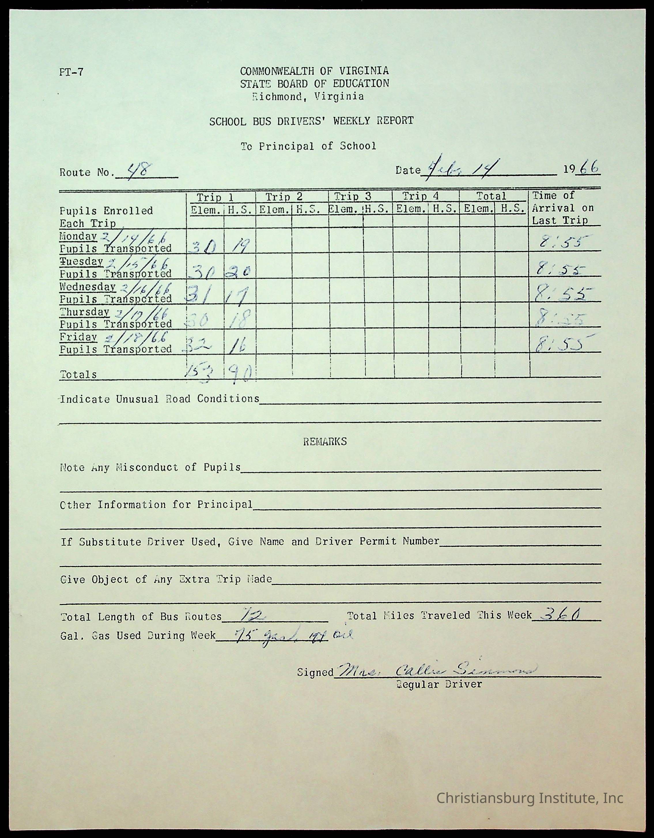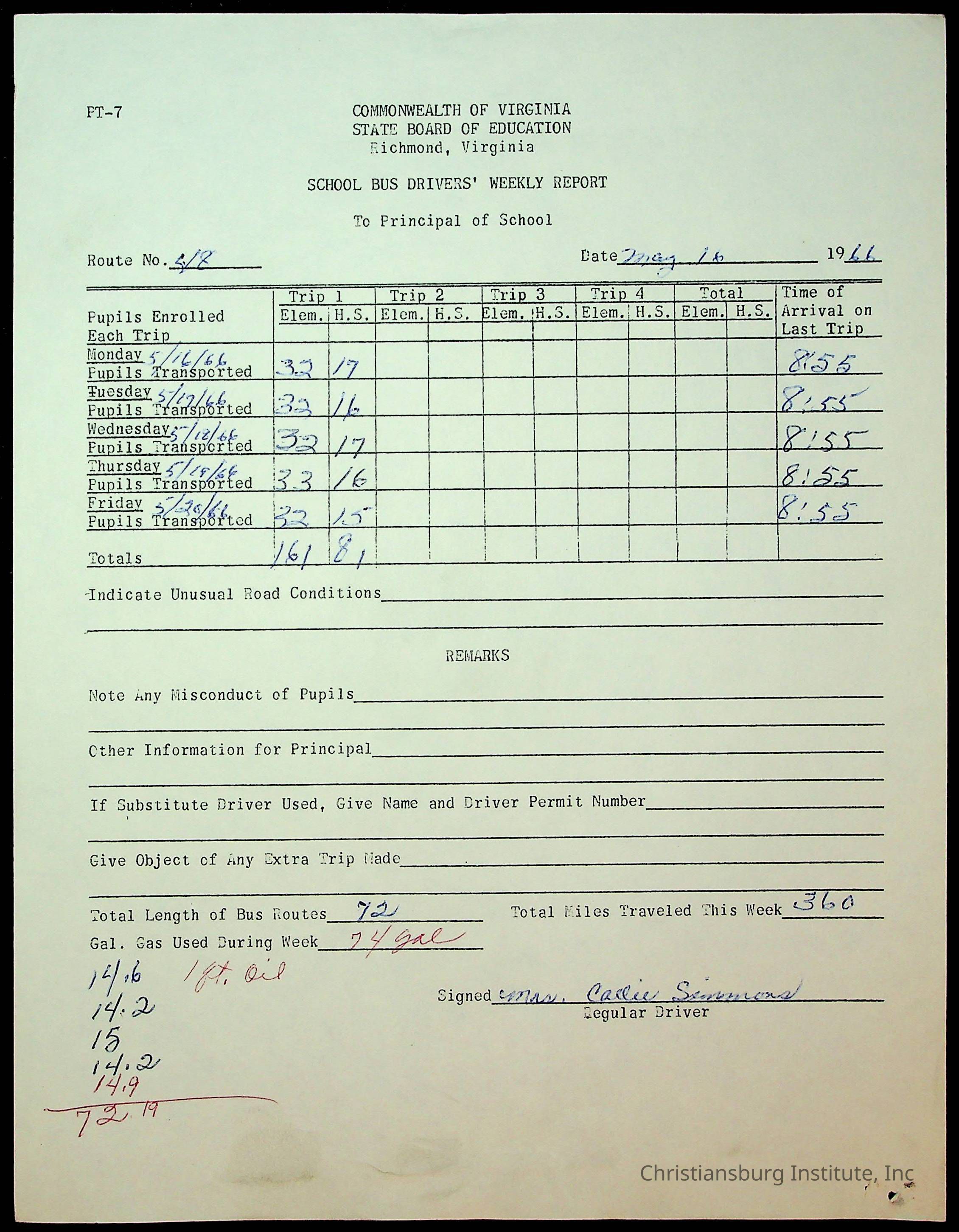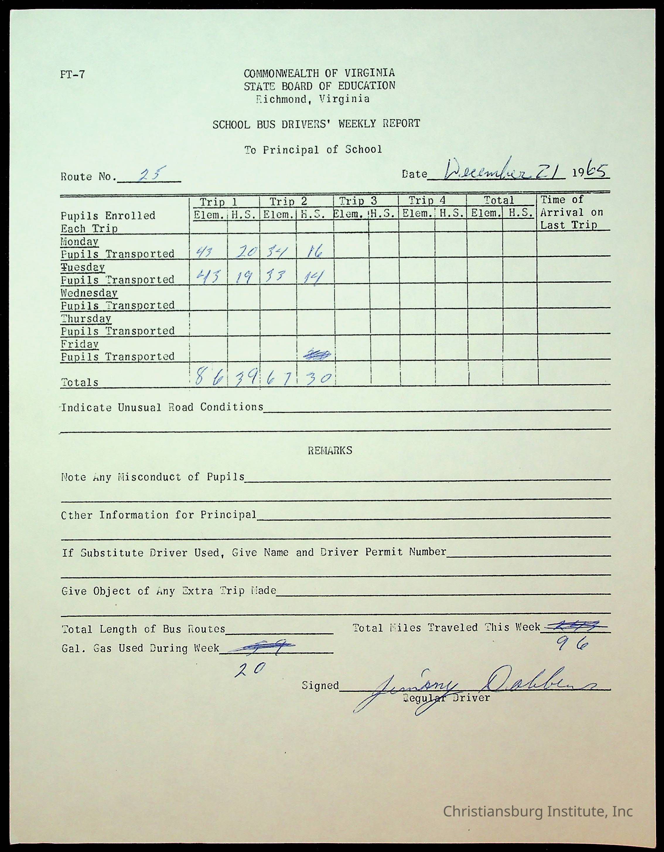 An archive of documents relating to the bus system at Christiansburg Institute and in Montgomery County, Virginia during the 1965-1966 school year.