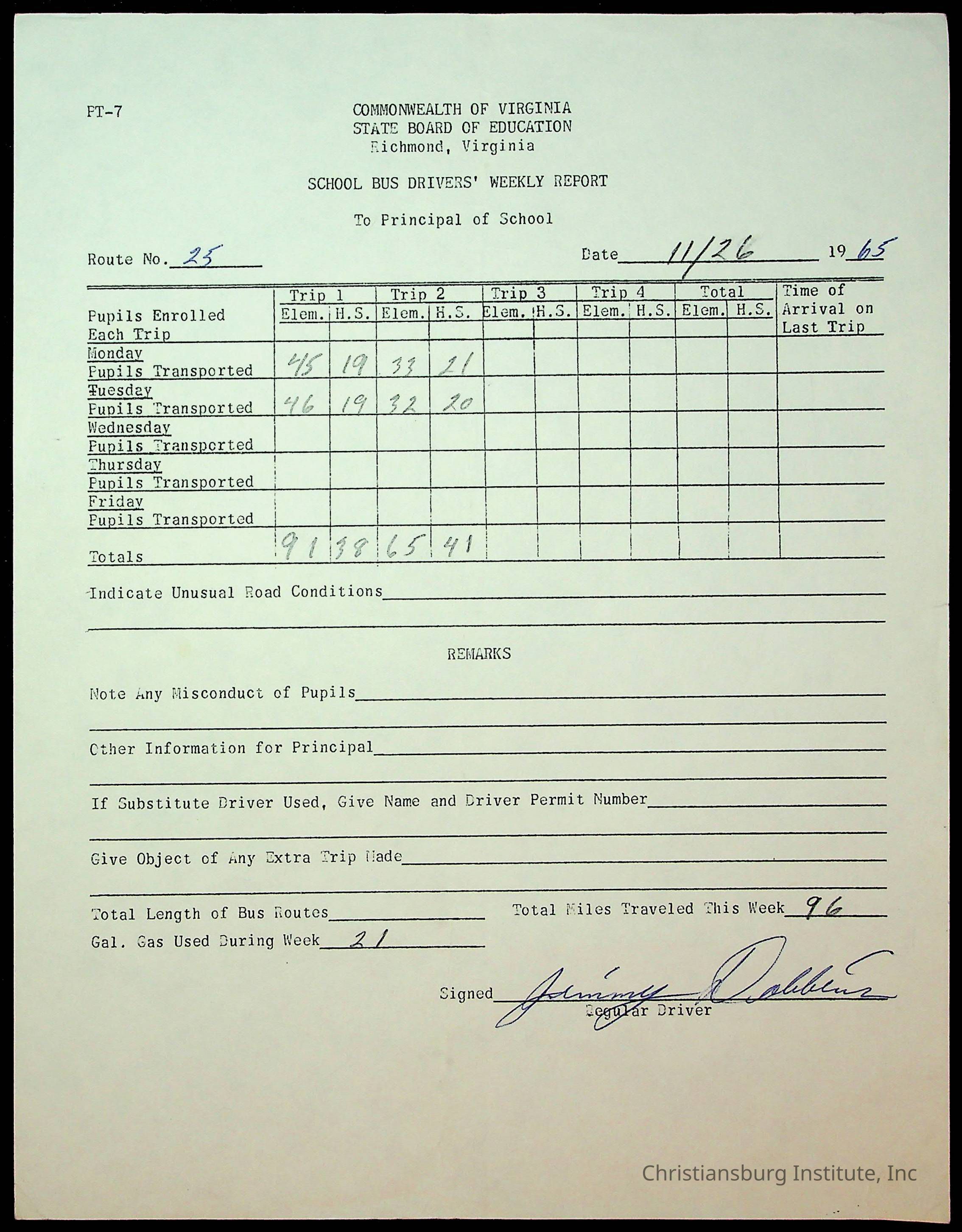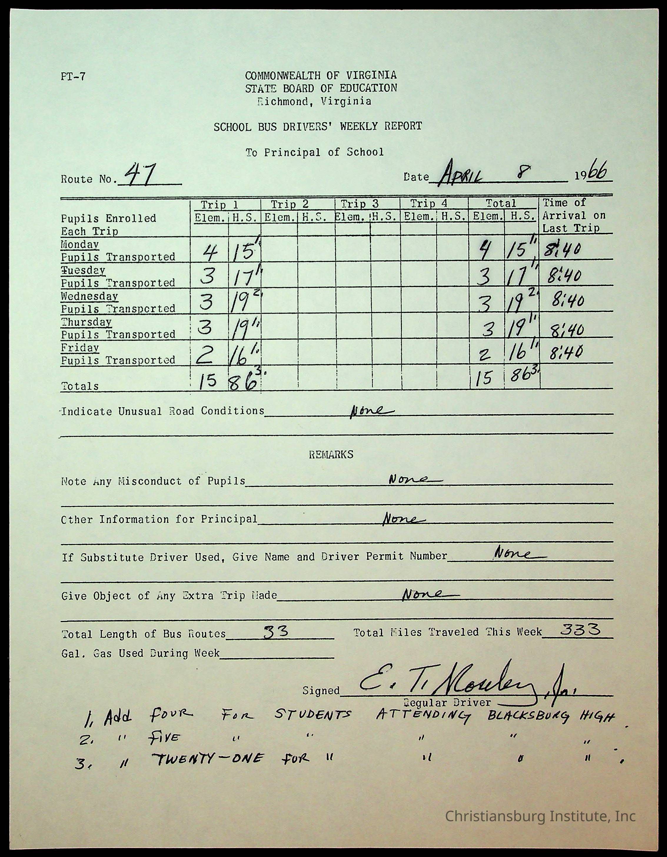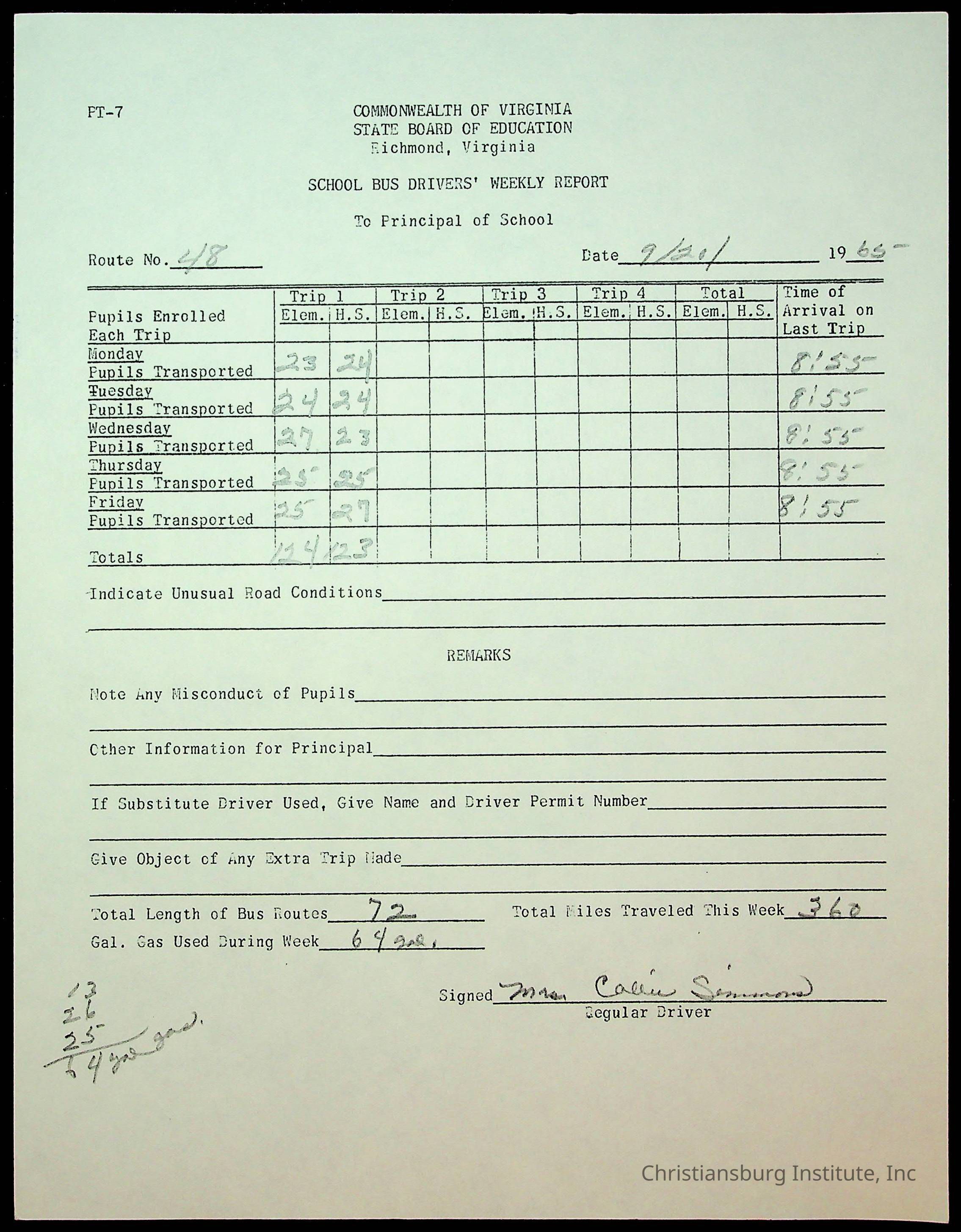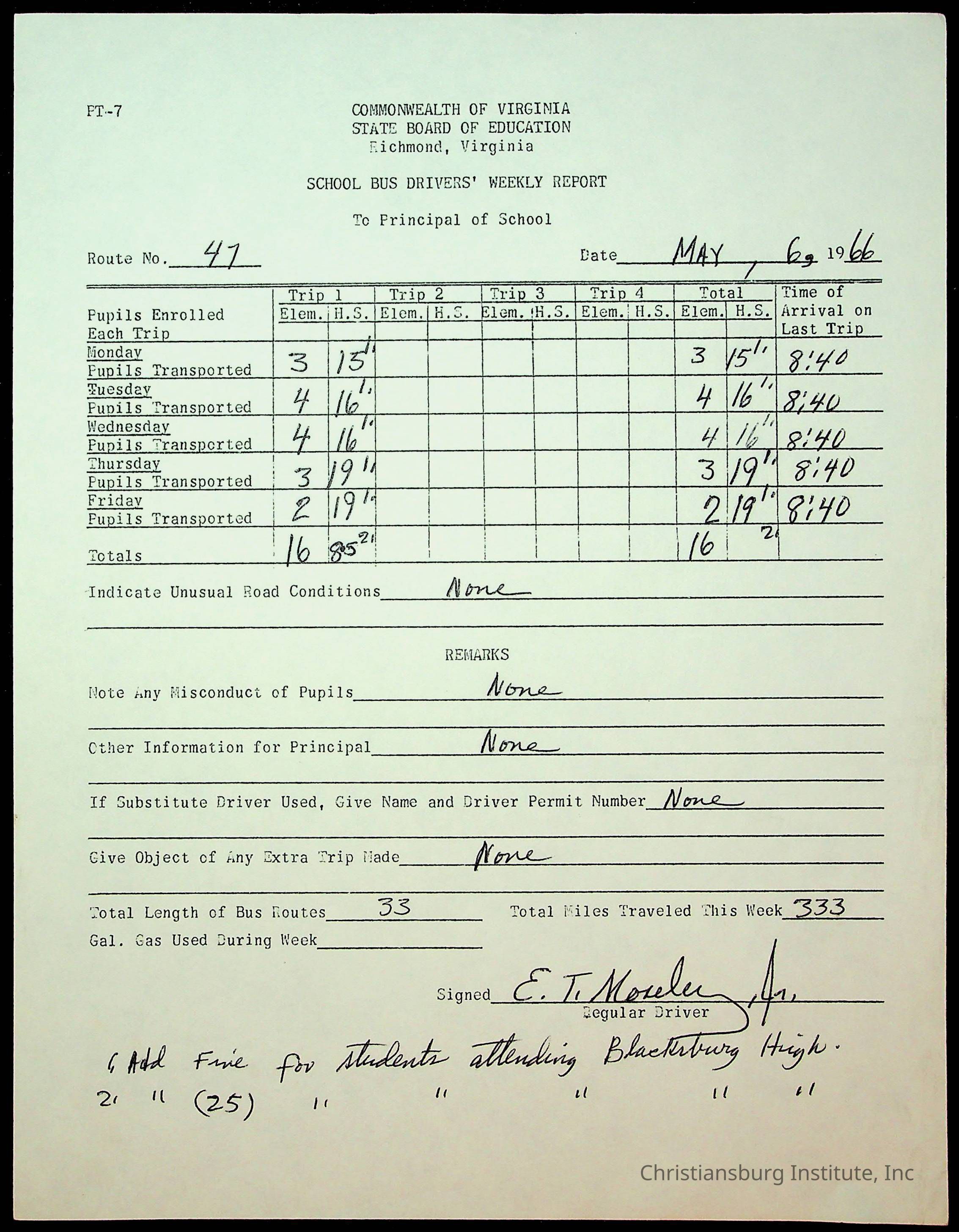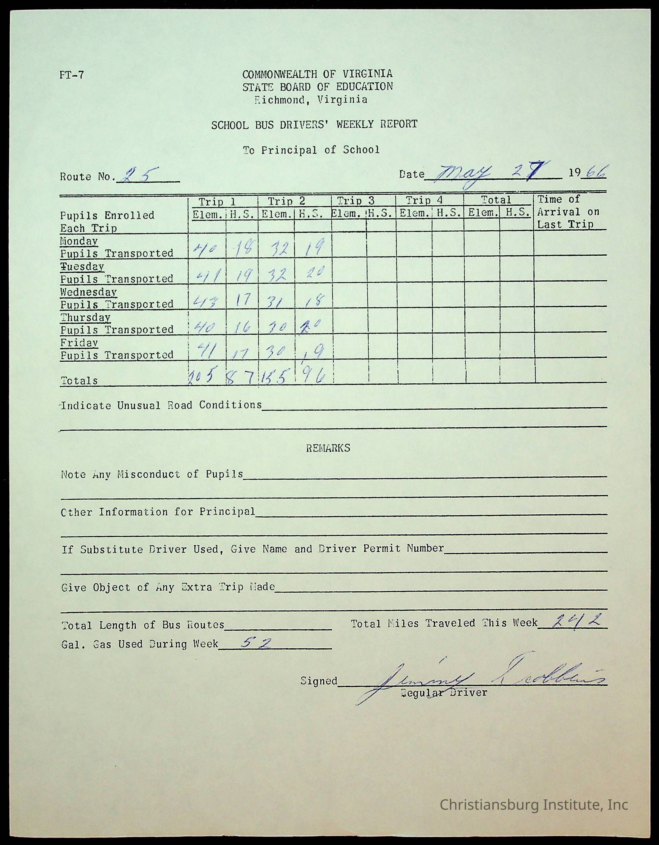 An archive of documents relating to the bus system at Christiansburg Institute and in Montgomery County, Virginia during the 1965-1966 school year.