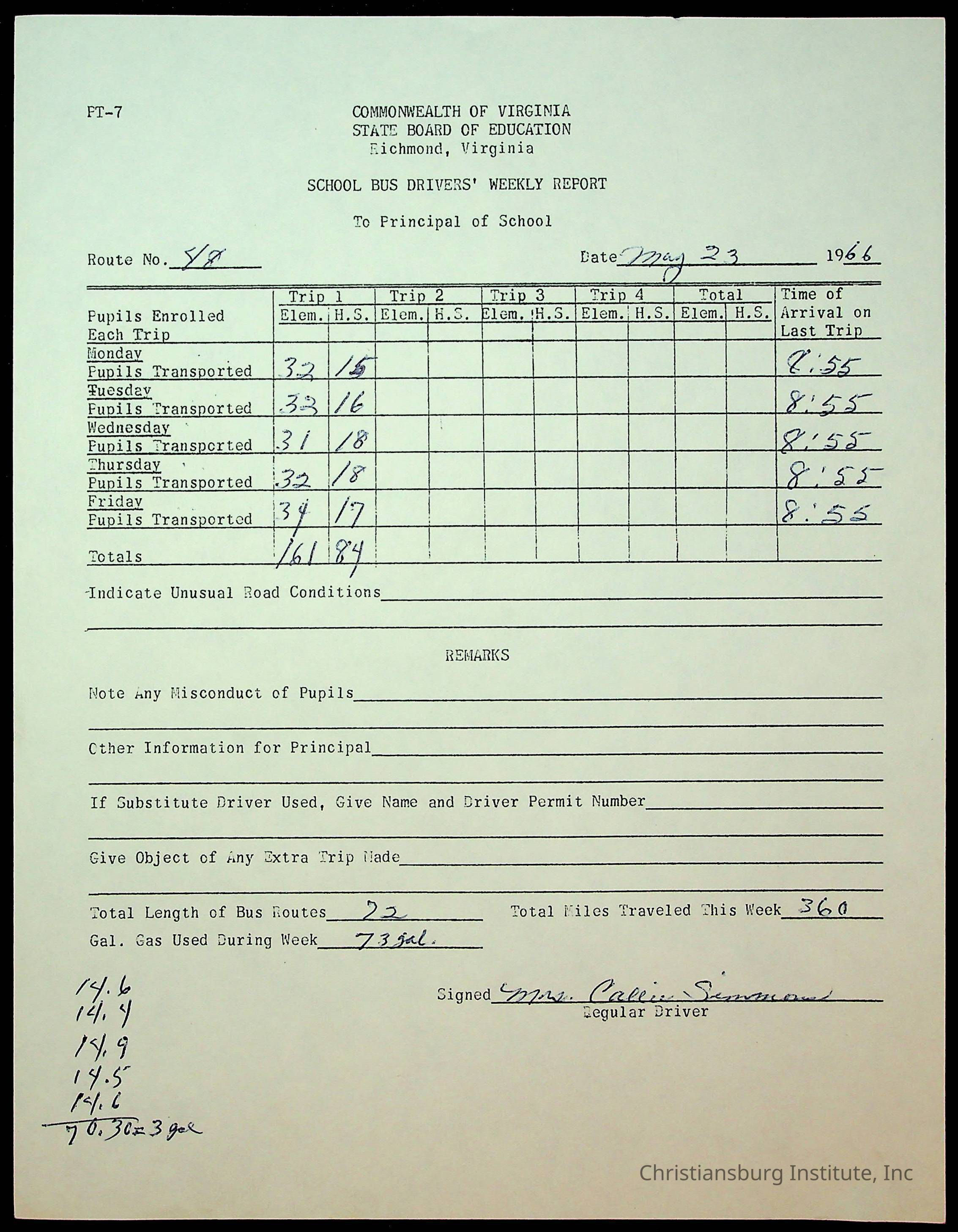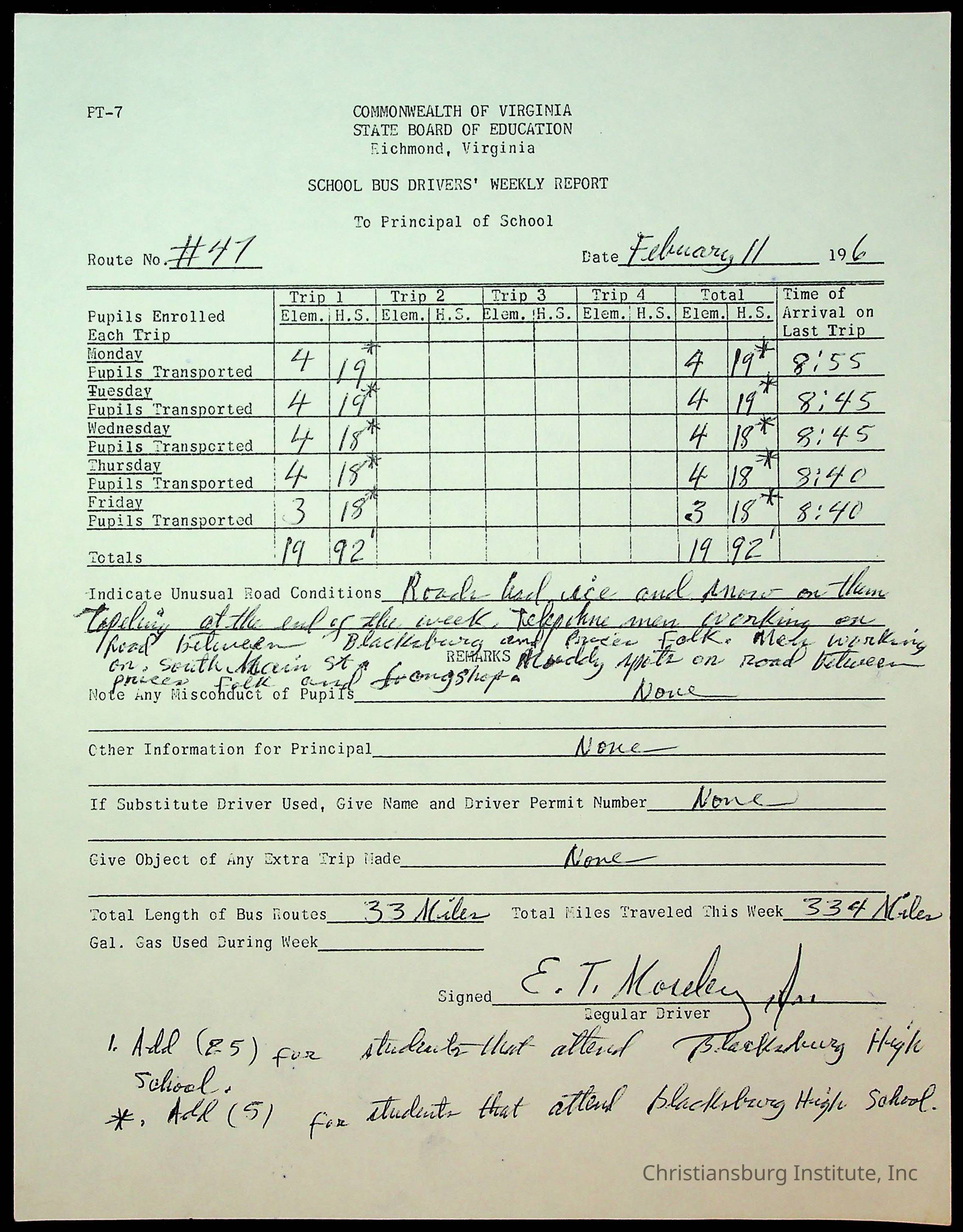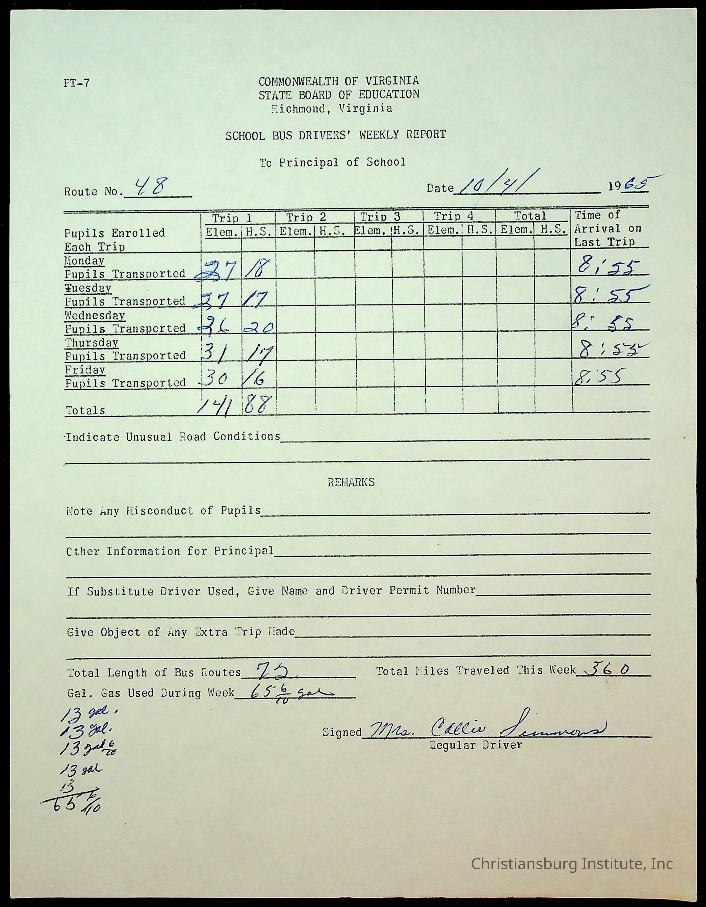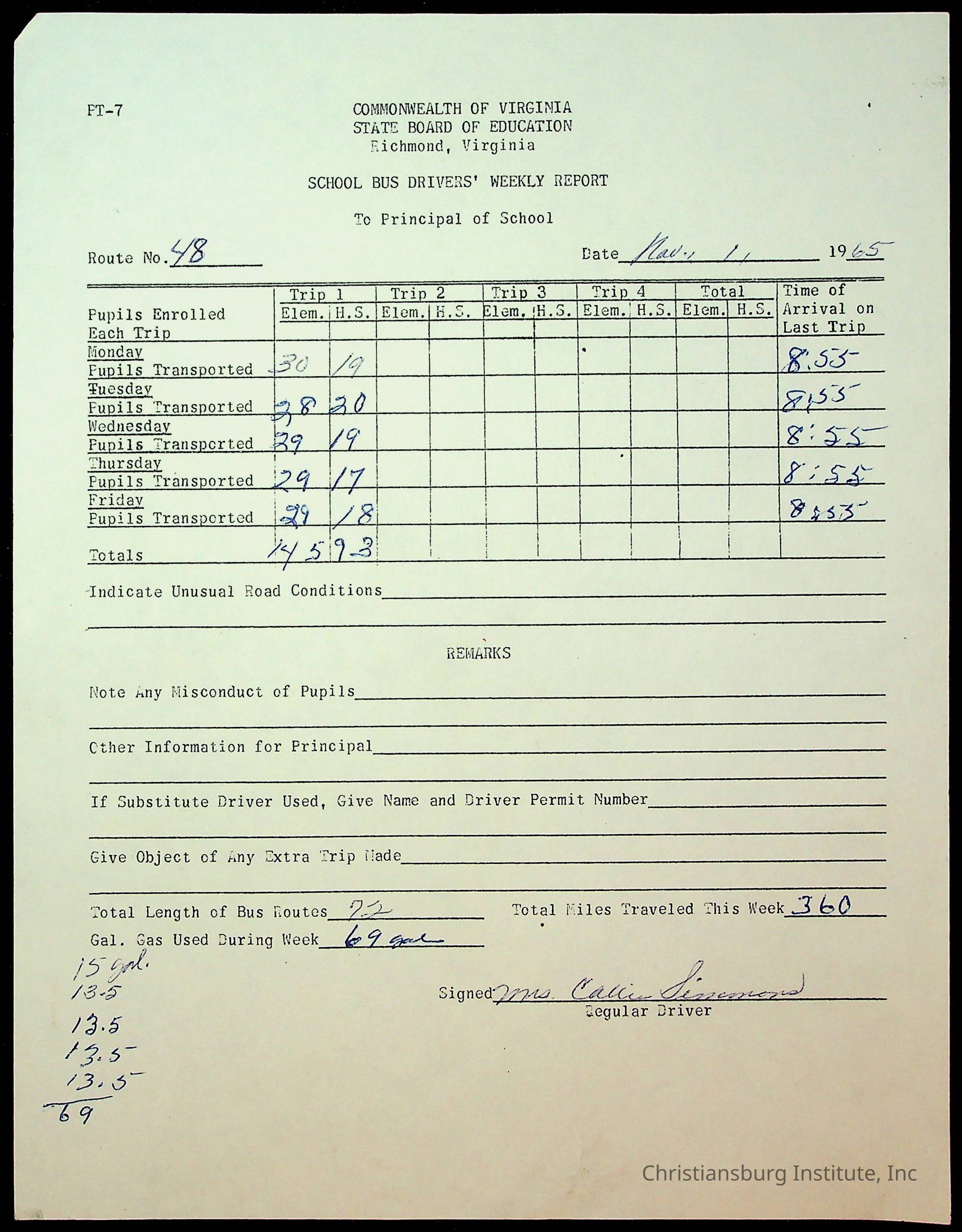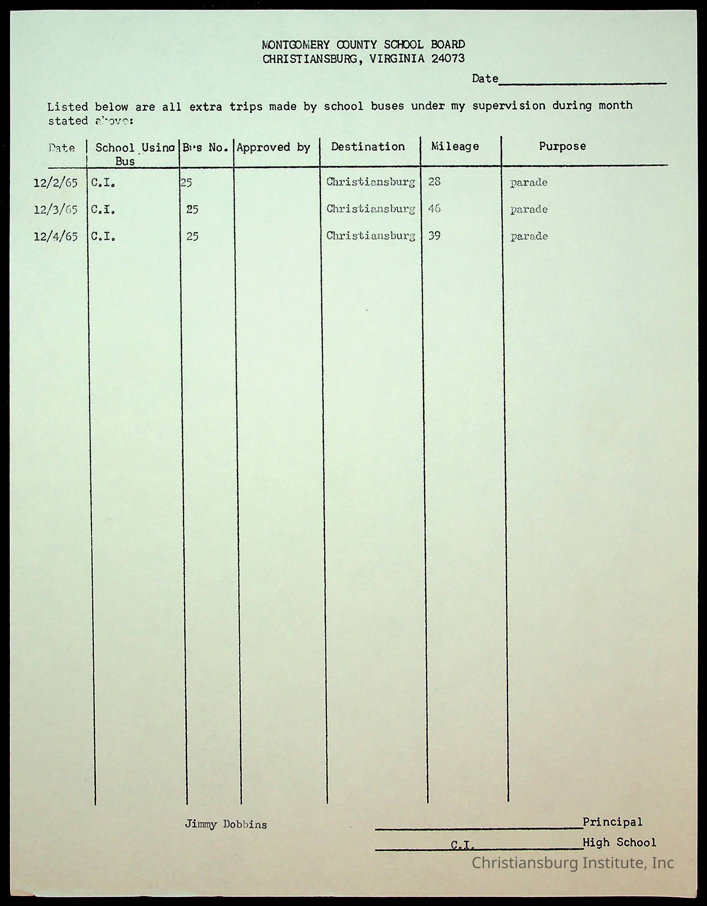 An archive of documents relating to the bus system at Christiansburg Institute and in Montgomery County, Virginia during the 1965-1966 school year.