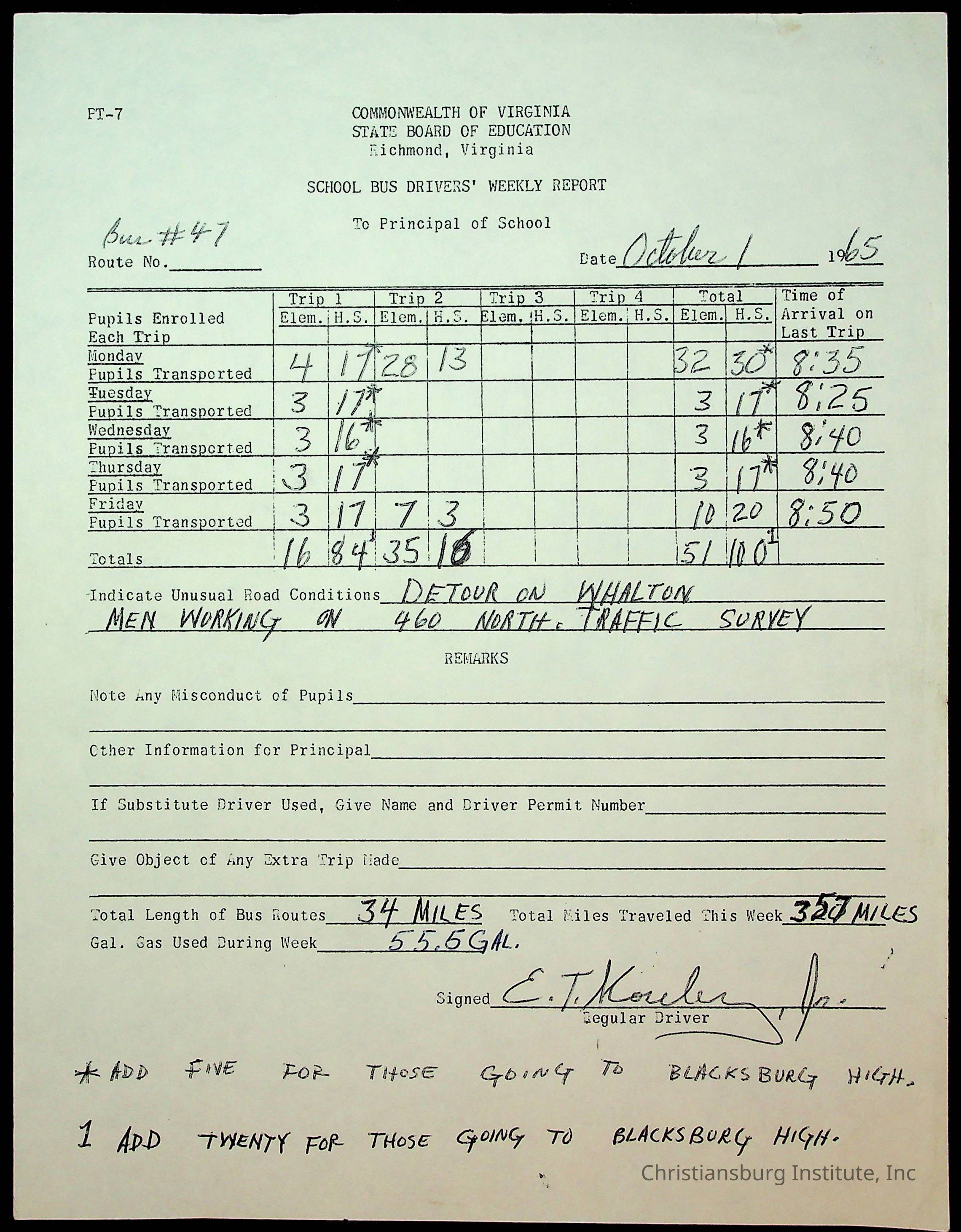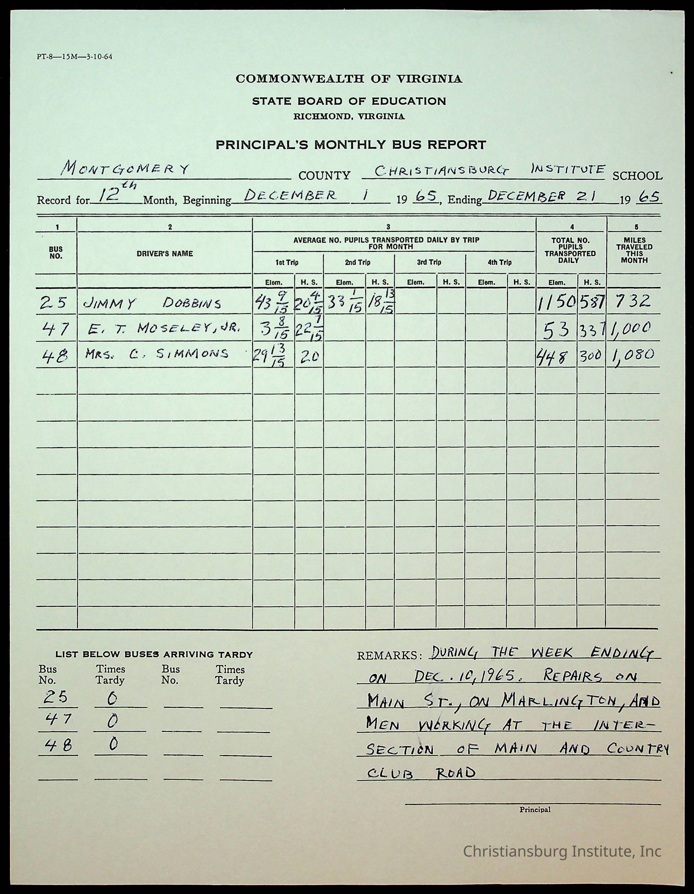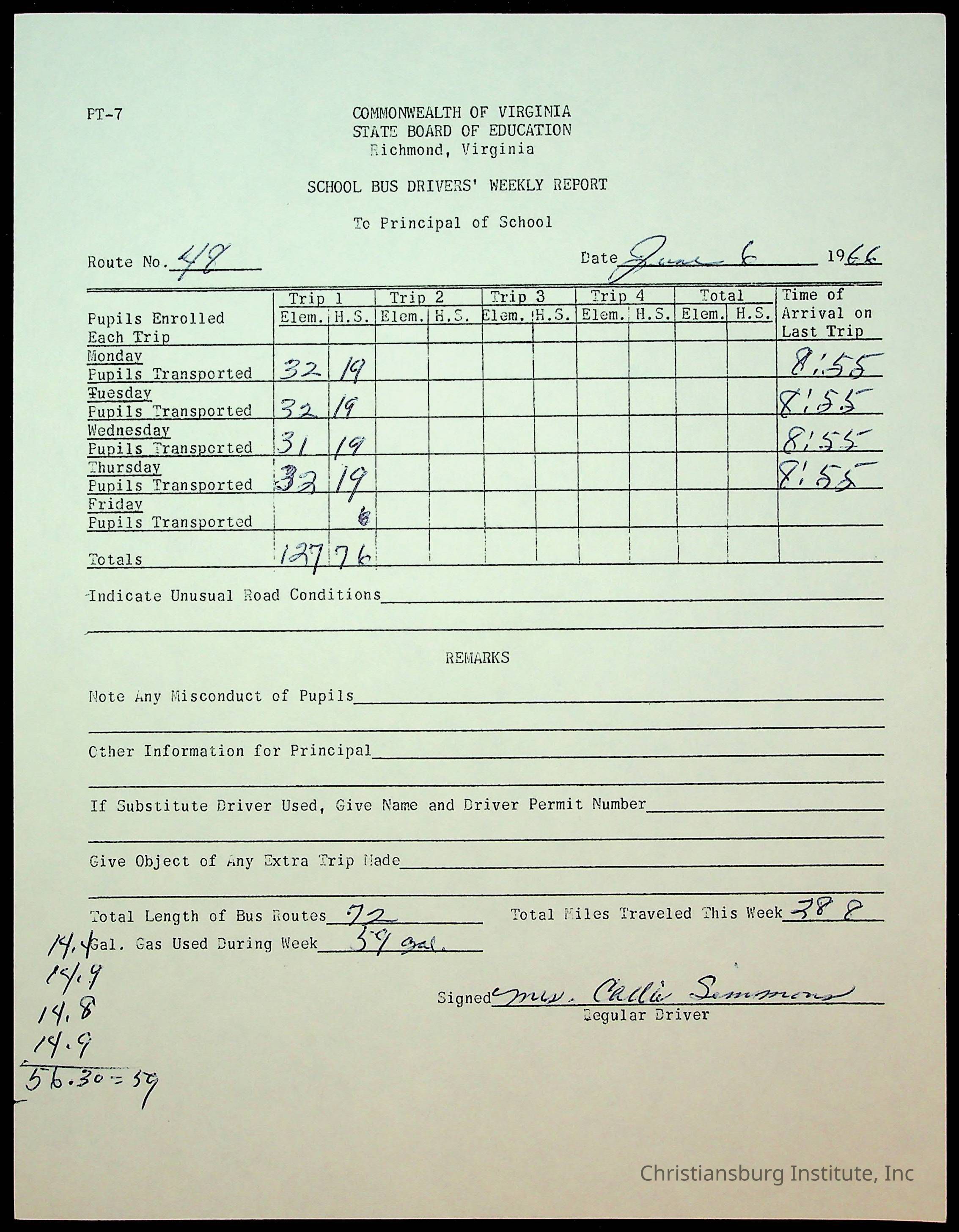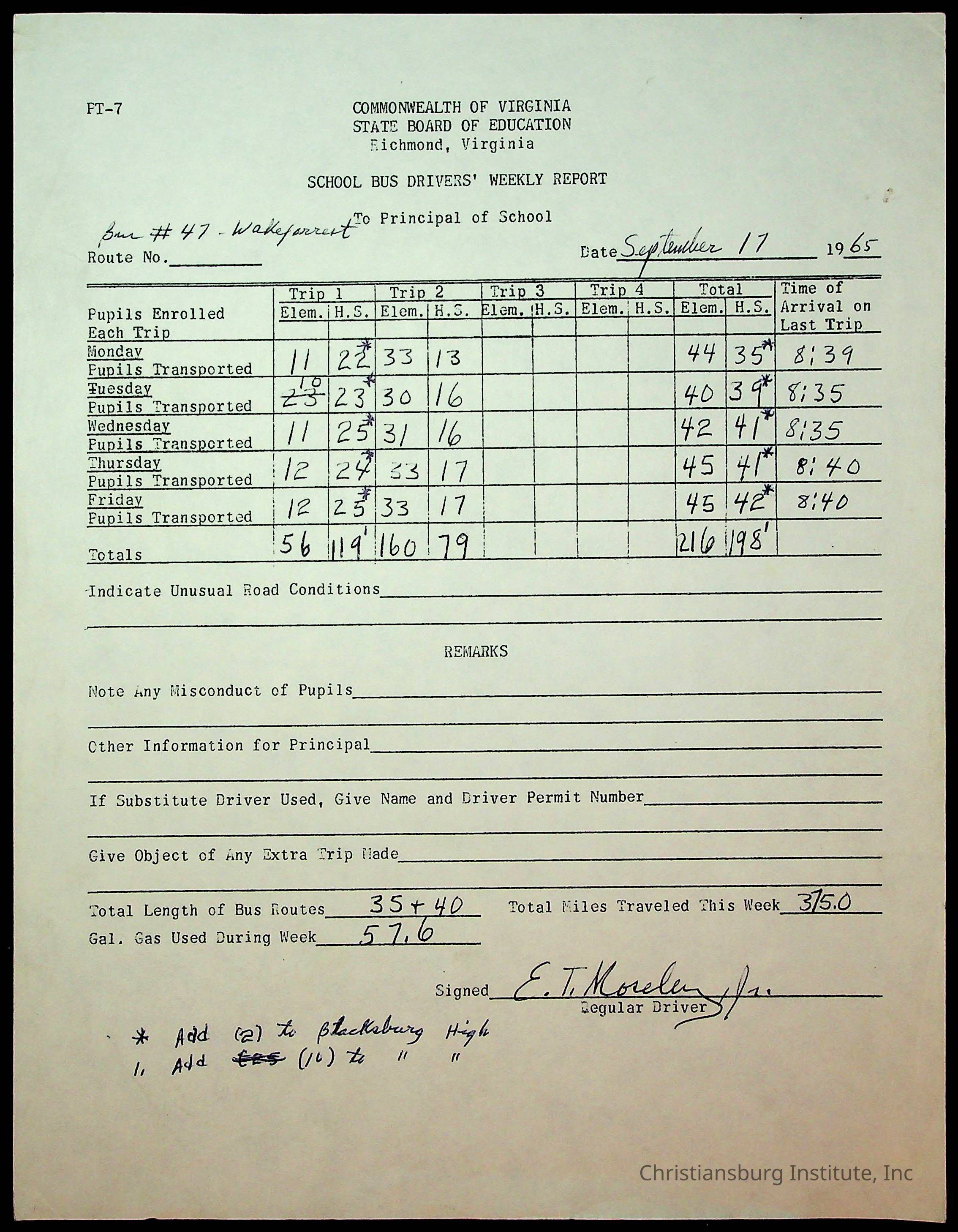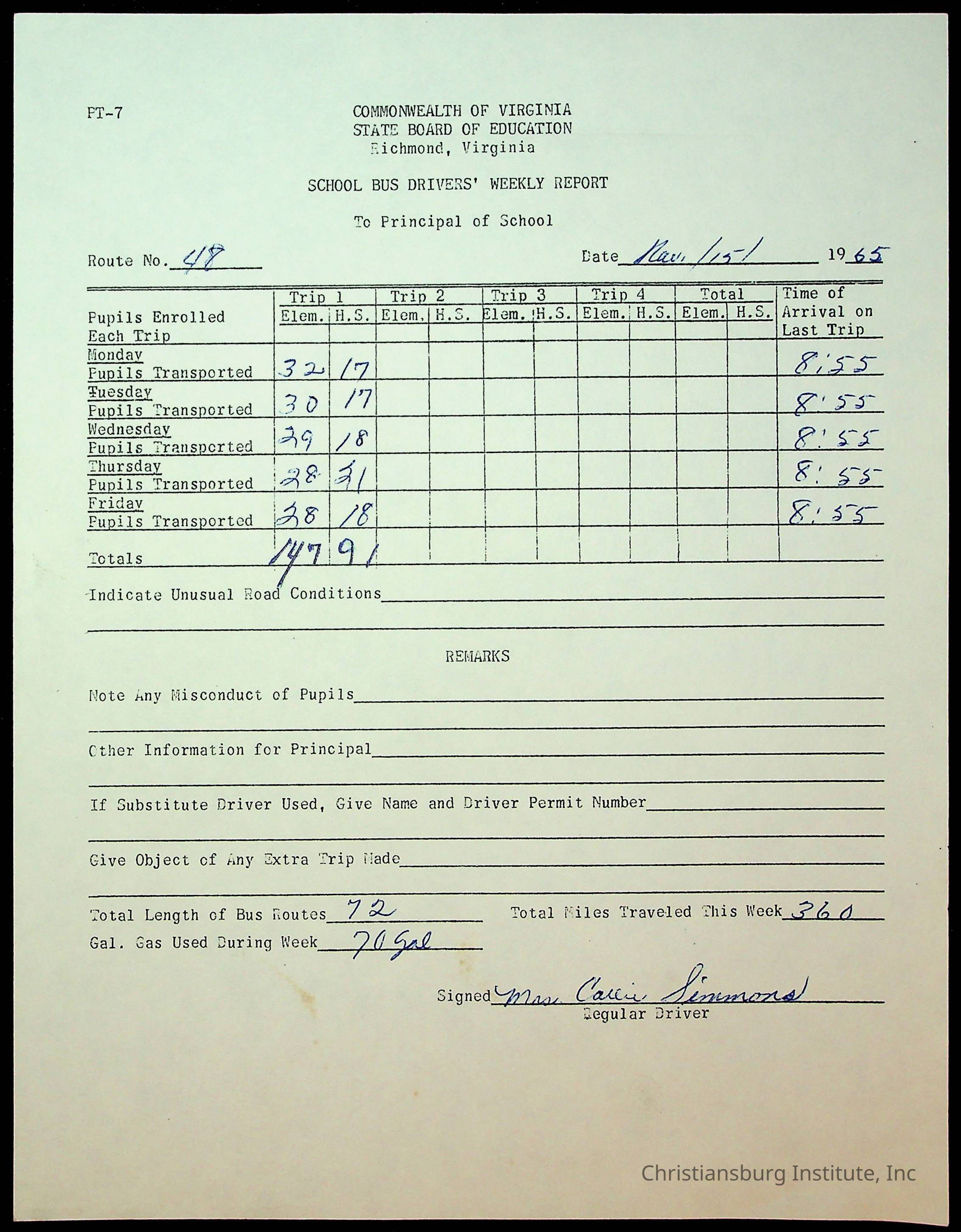 An archive of documents relating to the bus system at Christiansburg Institute and in Montgomery County, Virginia during the 1965-1966 school year.