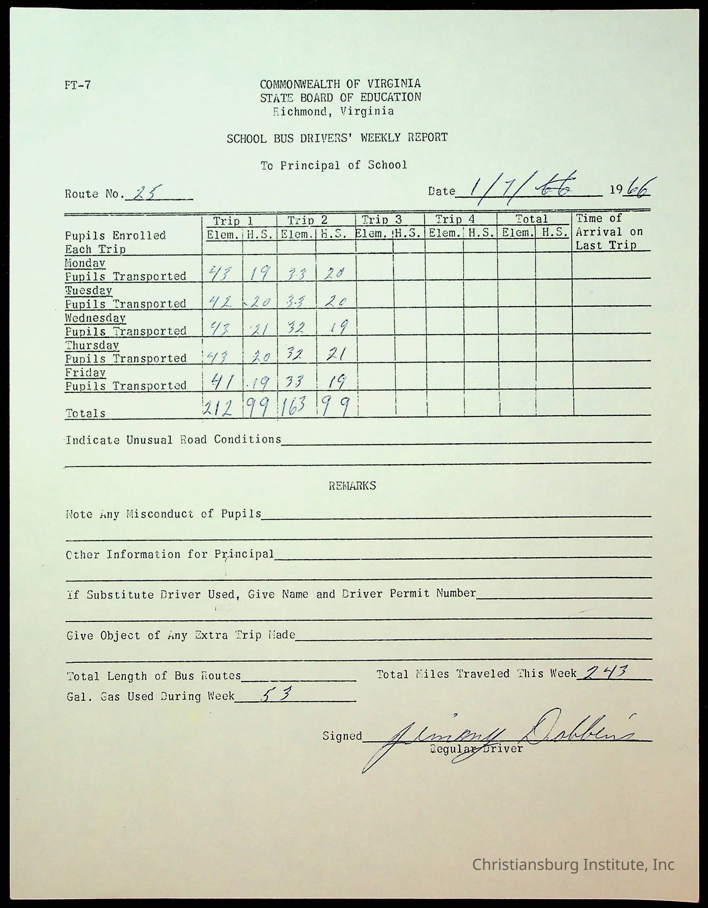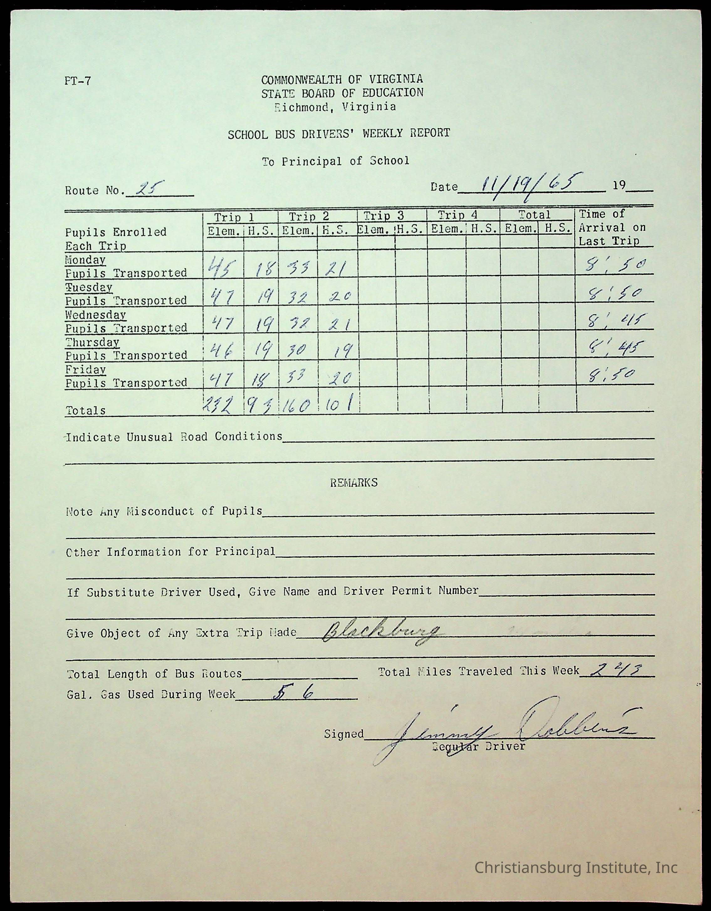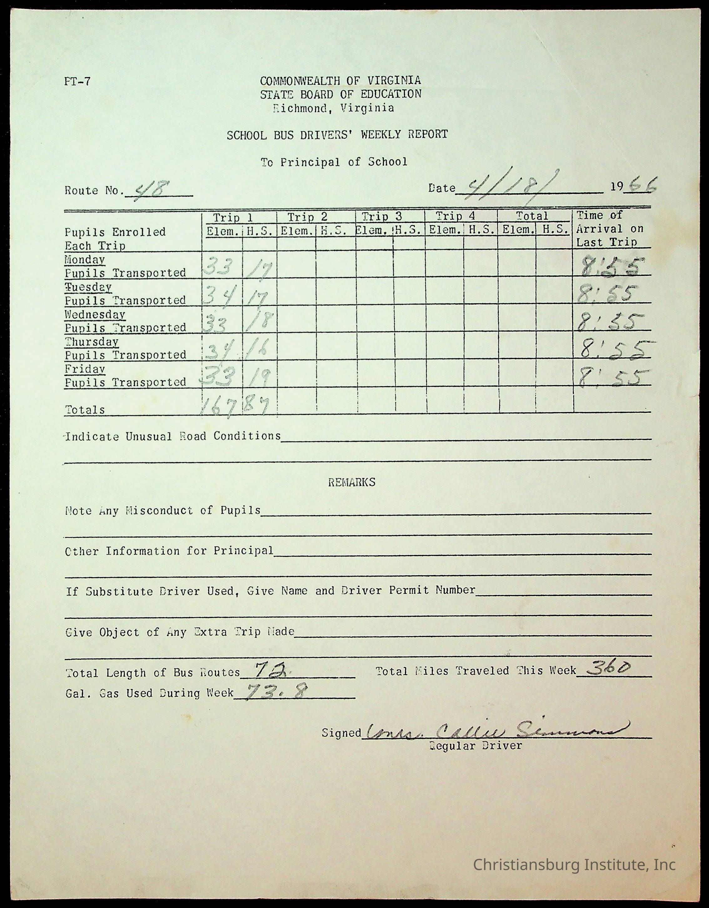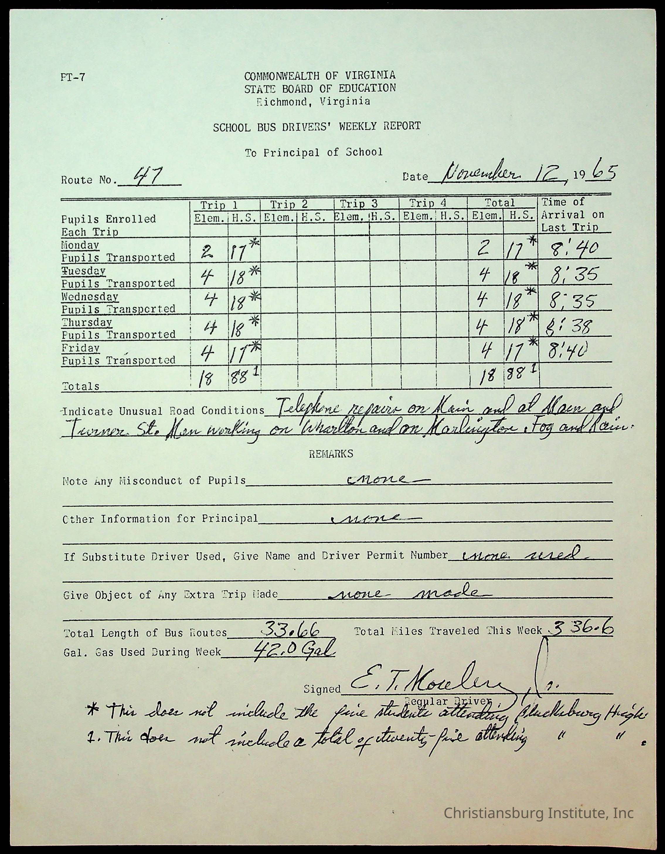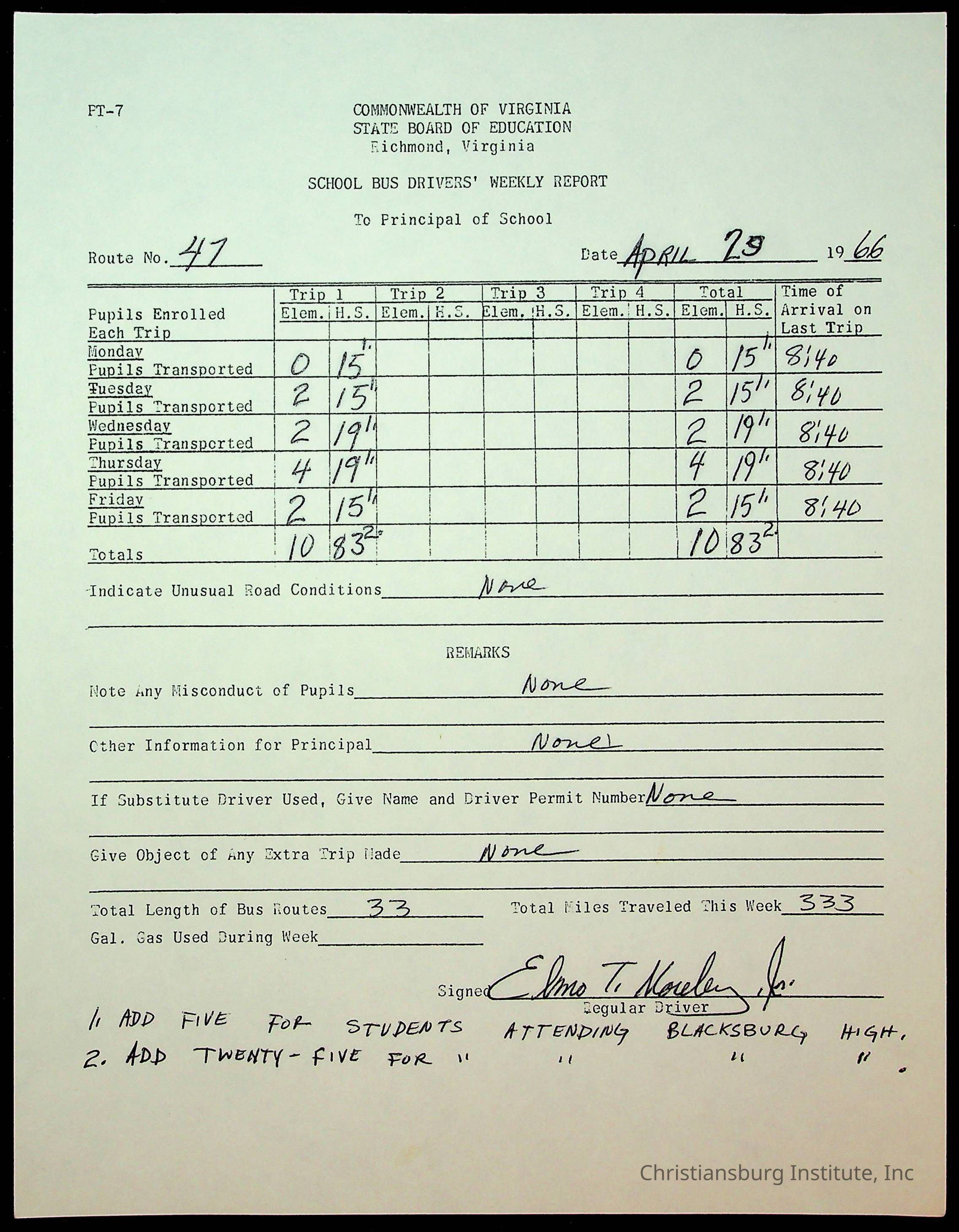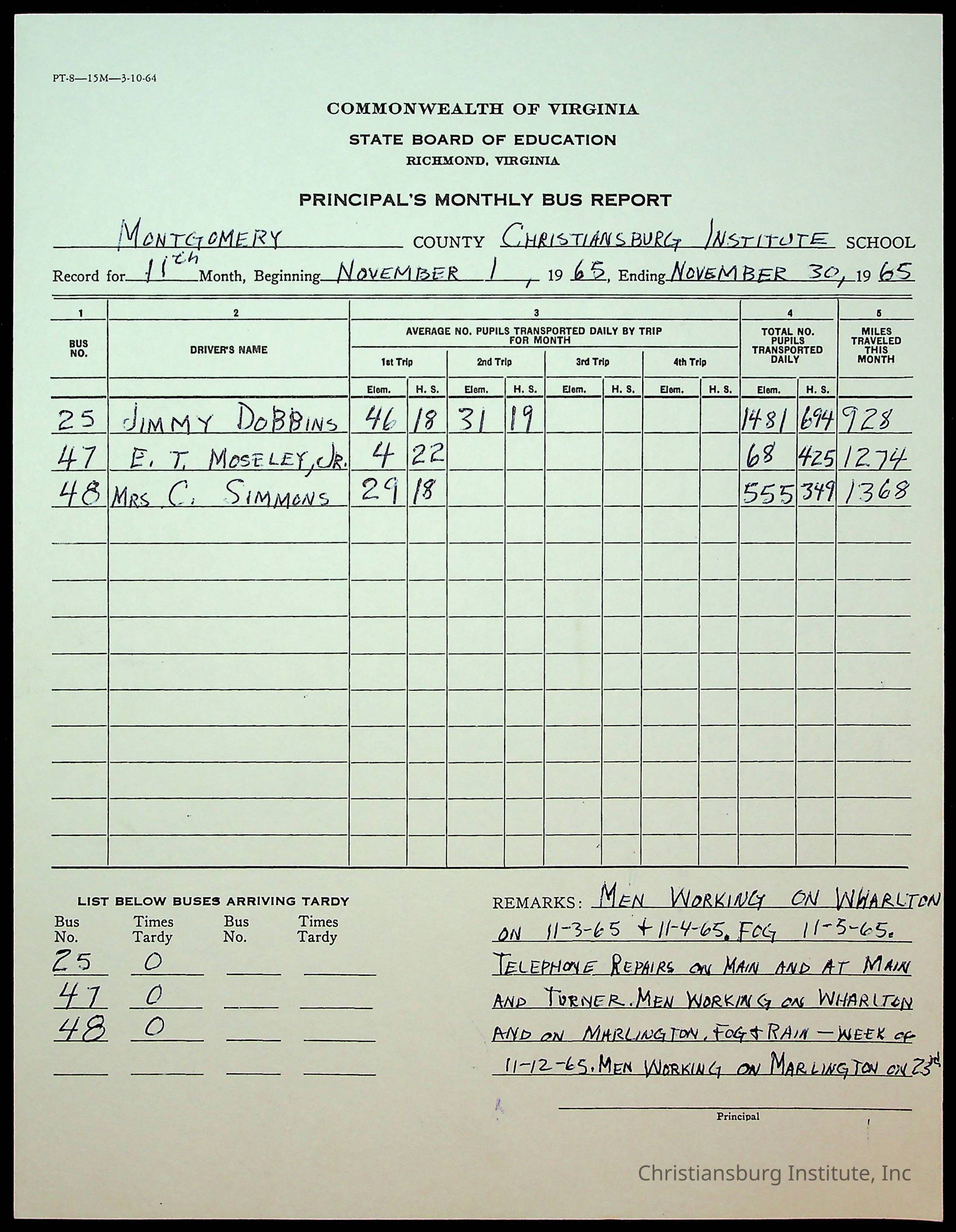 An archive of documents relating to the bus system at Christiansburg Institute and in Montgomery County, Virginia during the 1965-1966 school year.