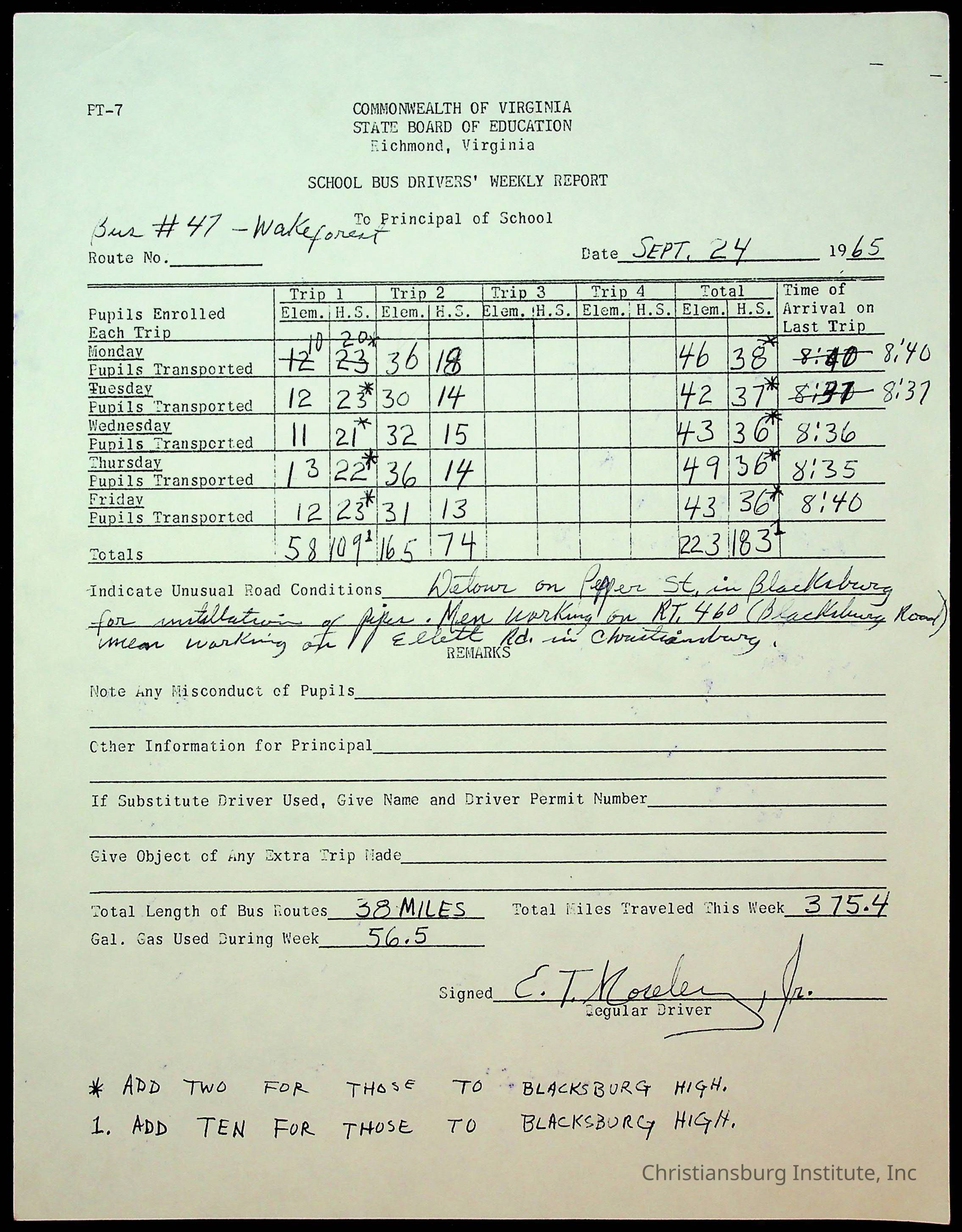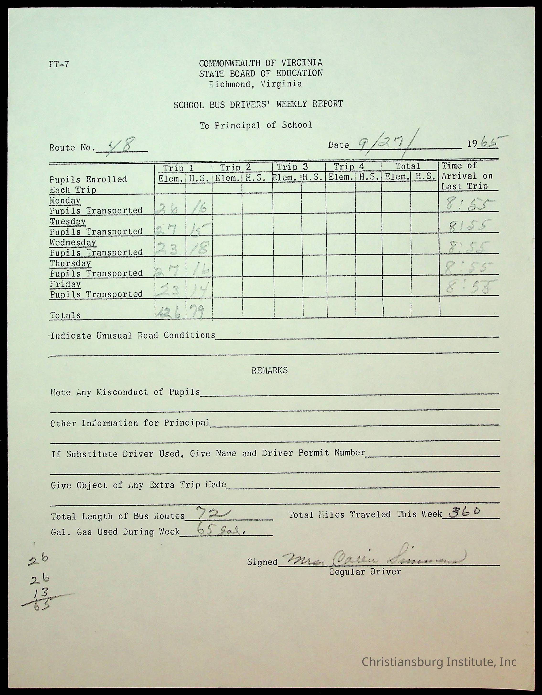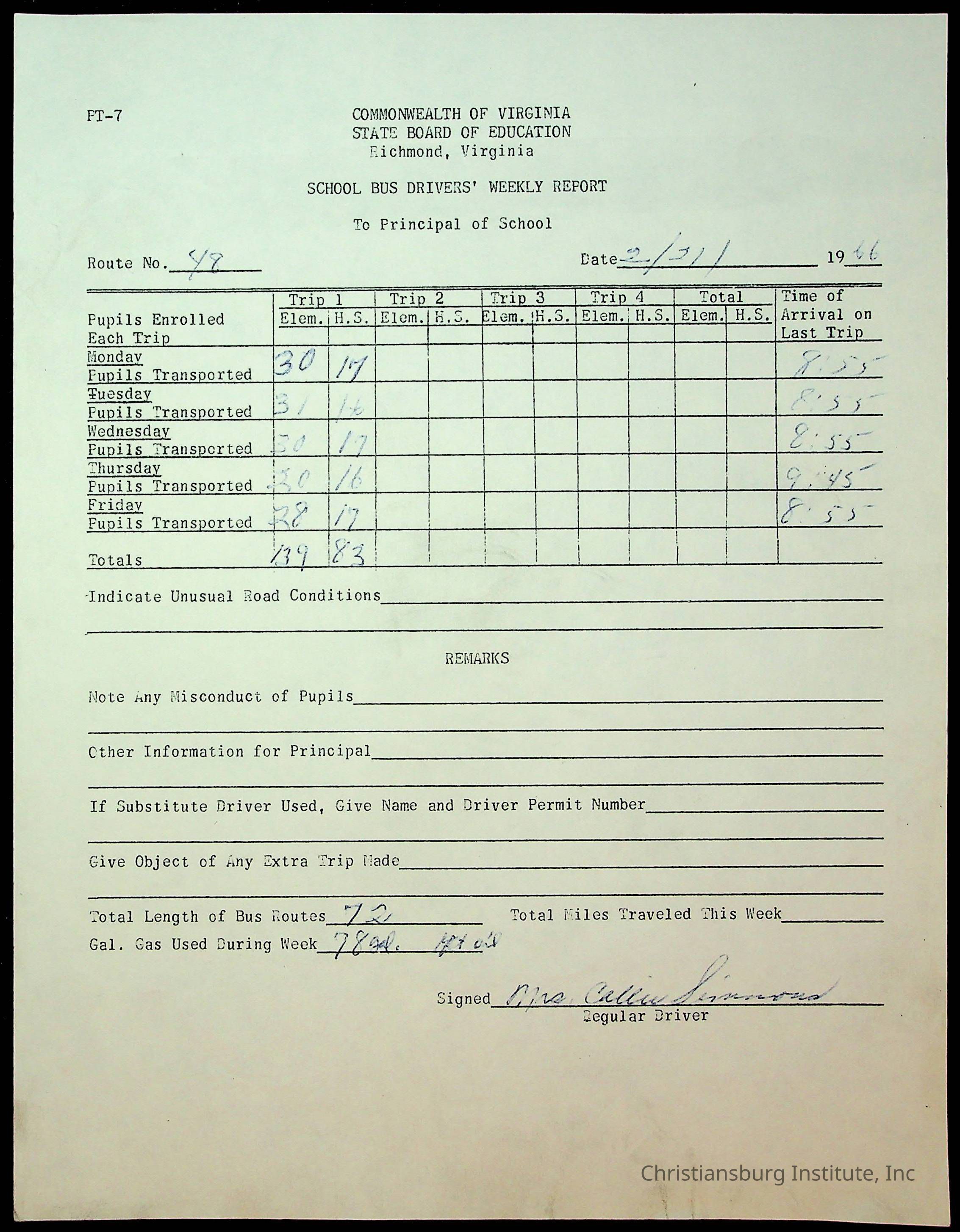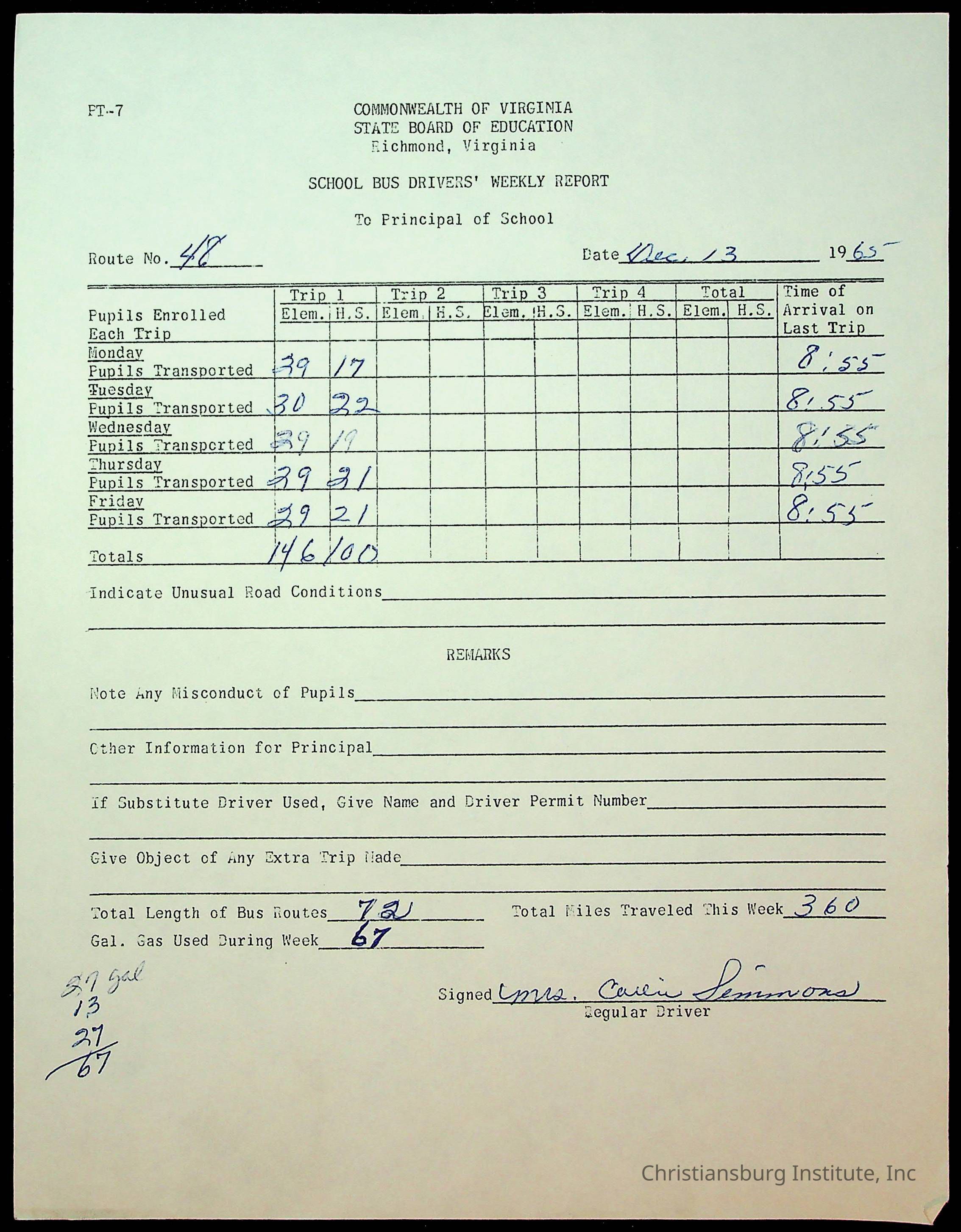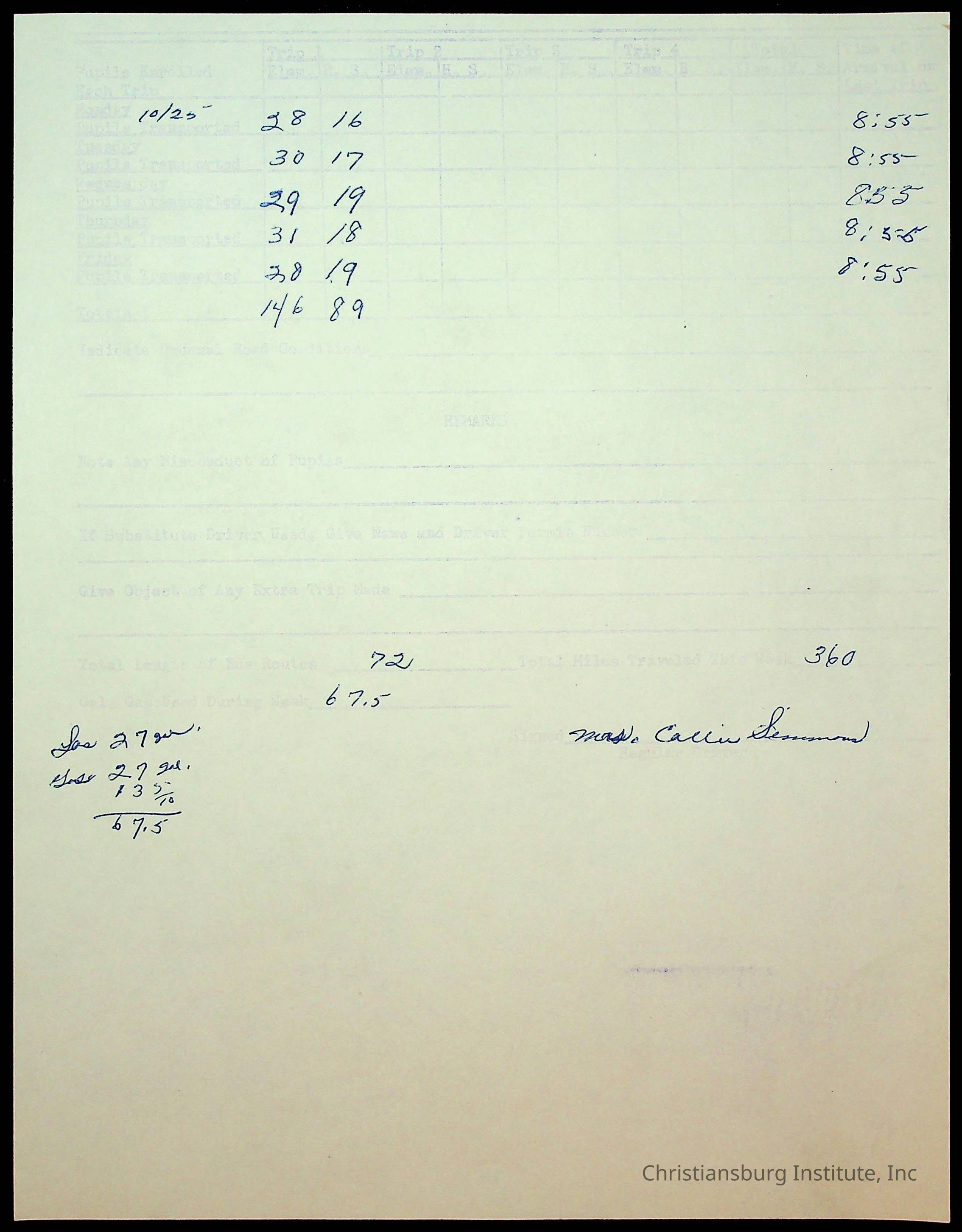 An archive of documents relating to the bus system at Christiansburg Institute and in Montgomery County, Virginia during the 1965-1966 school year.