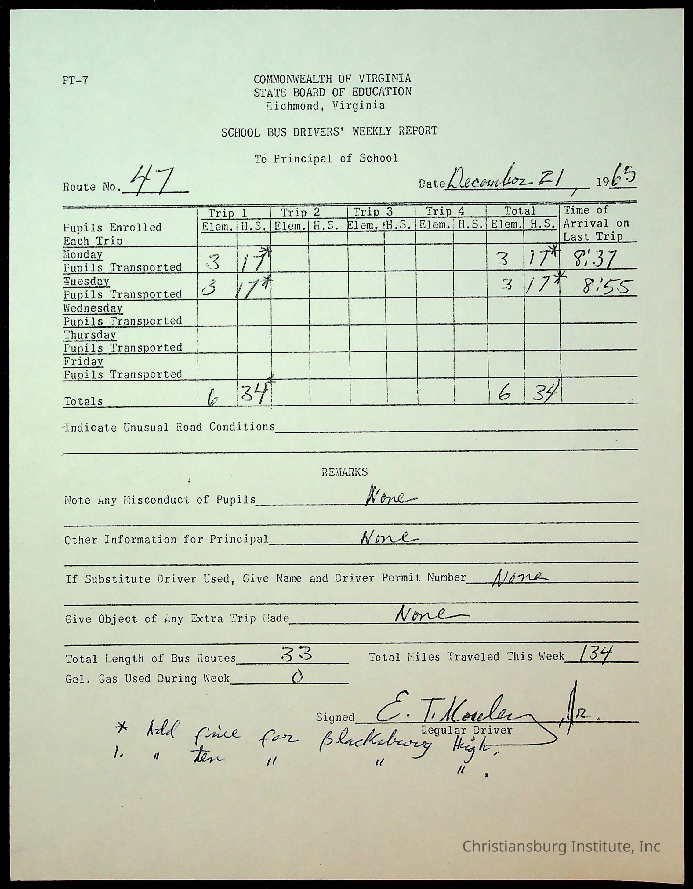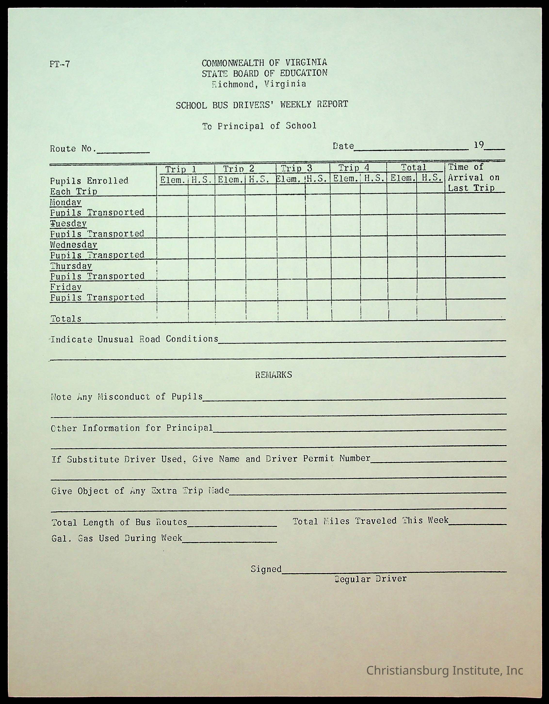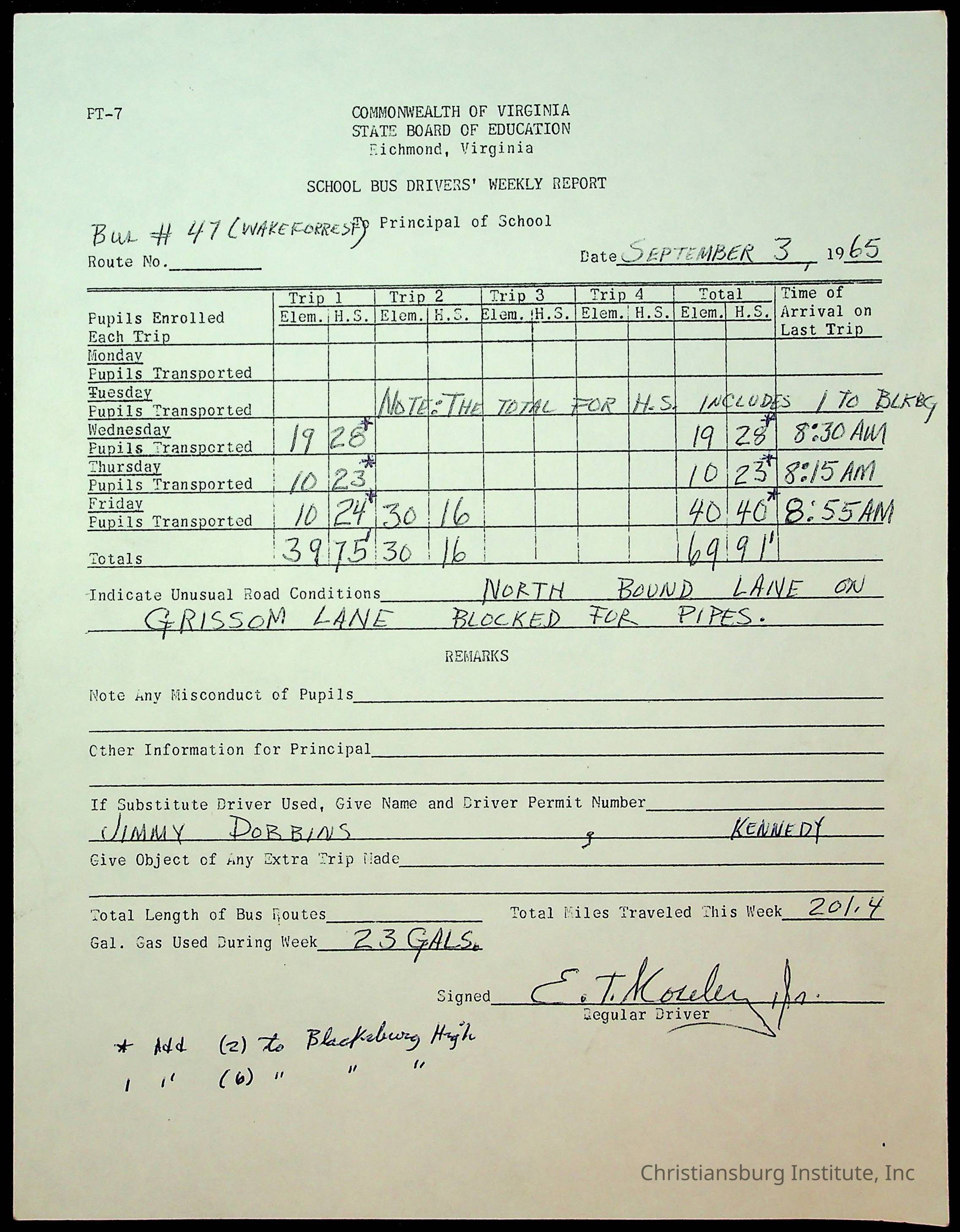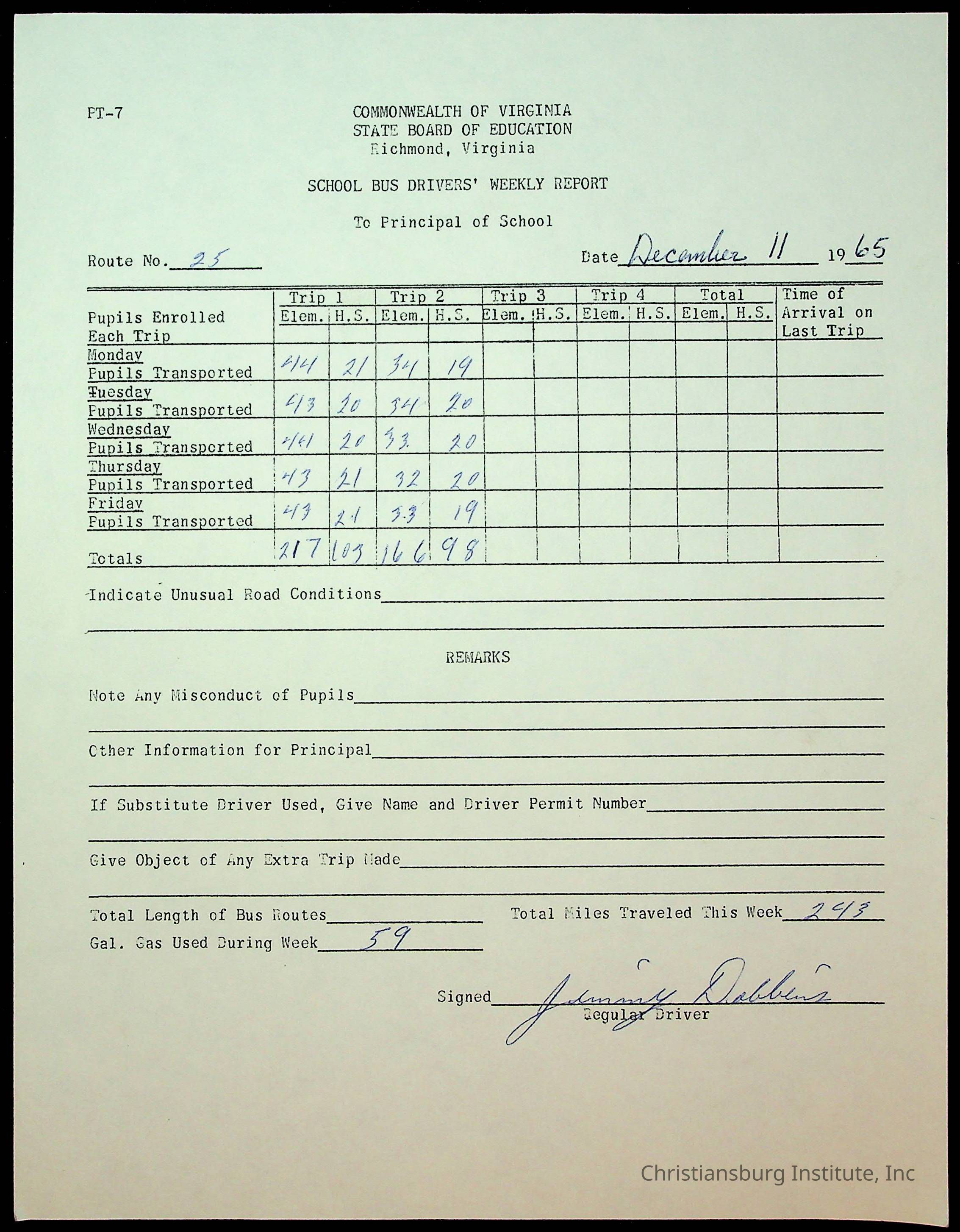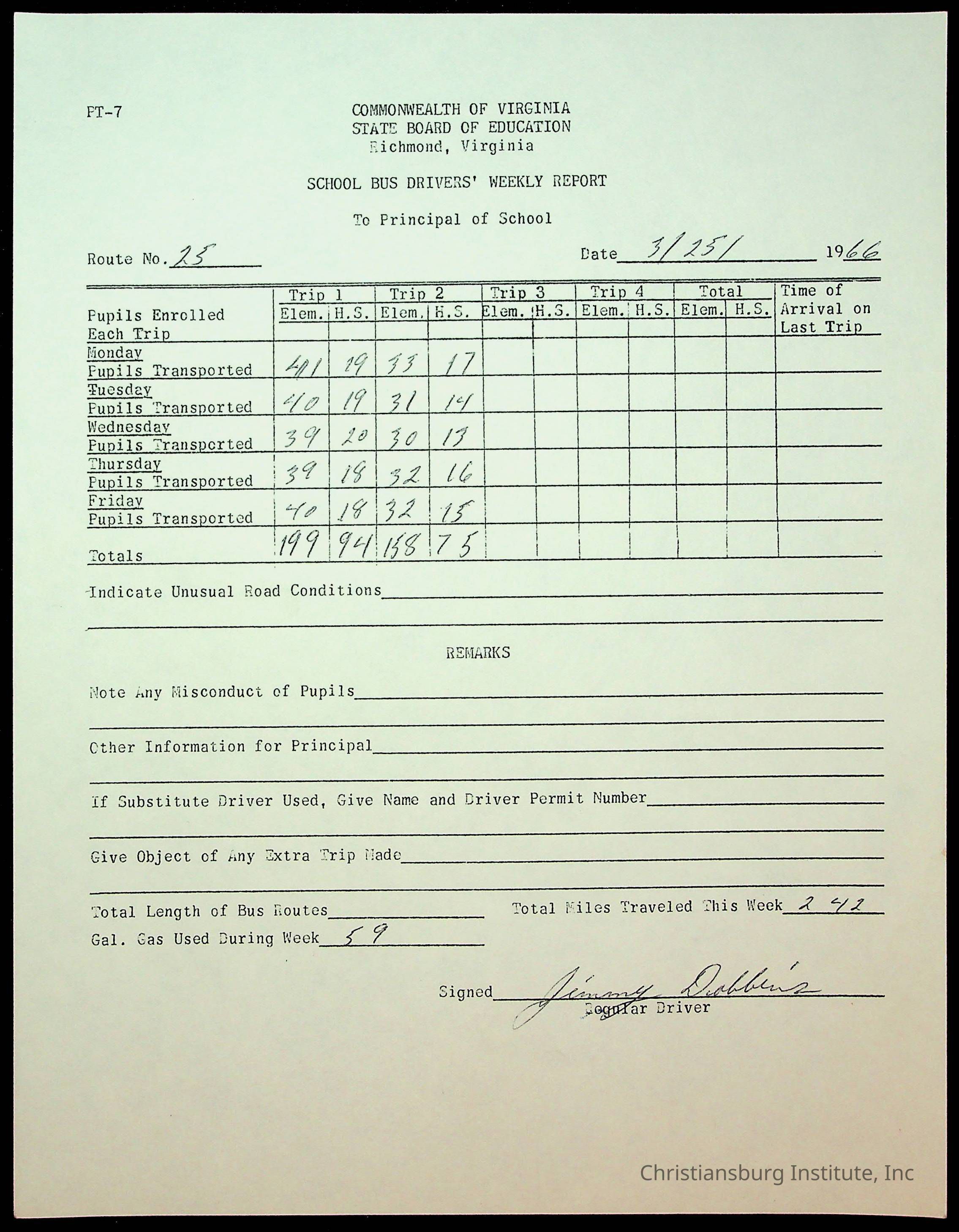 An archive of documents relating to the bus system at Christiansburg Institute and in Montgomery County, Virginia during the 1965-1966 school year.