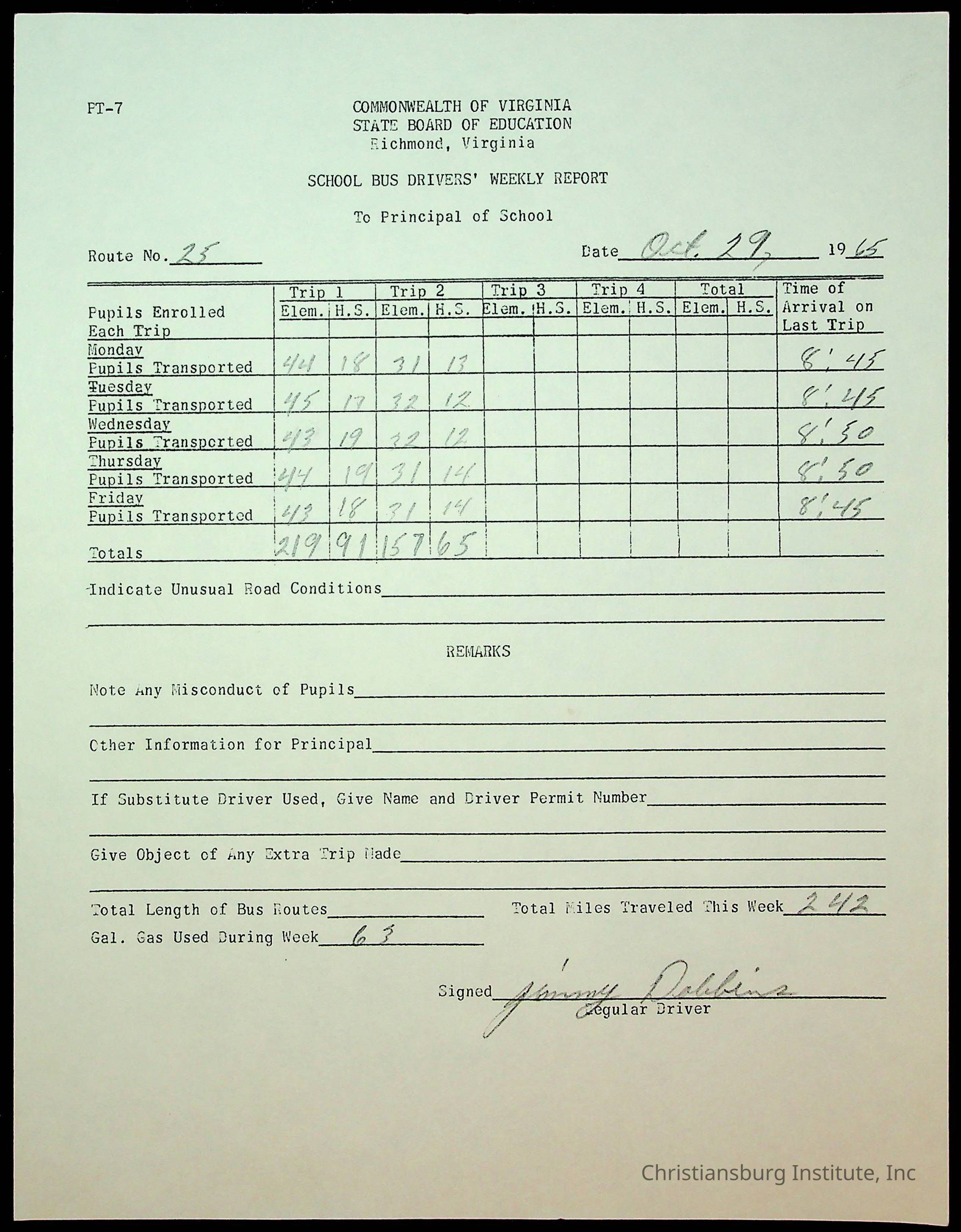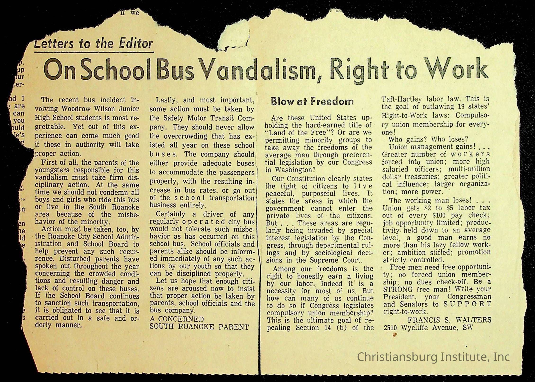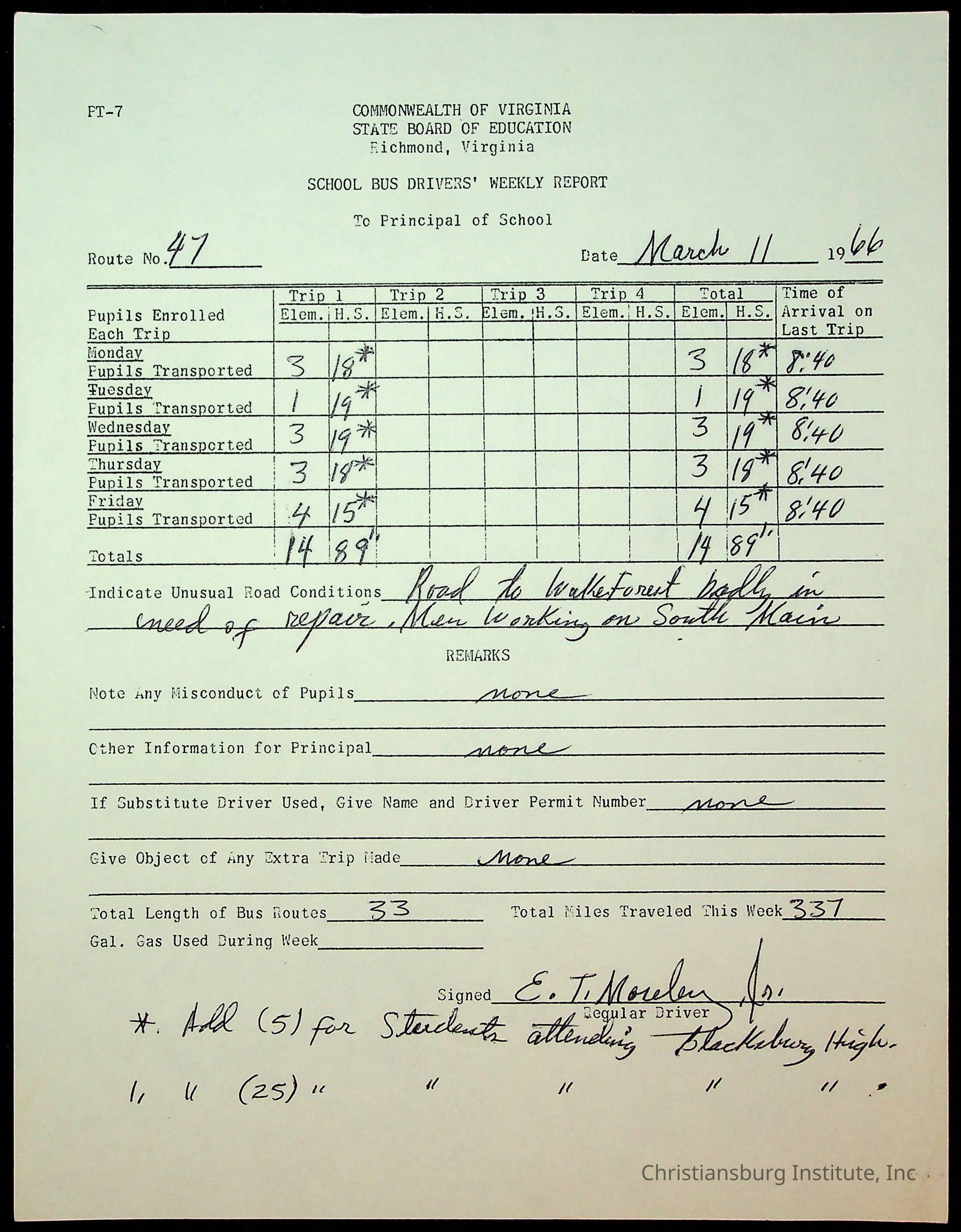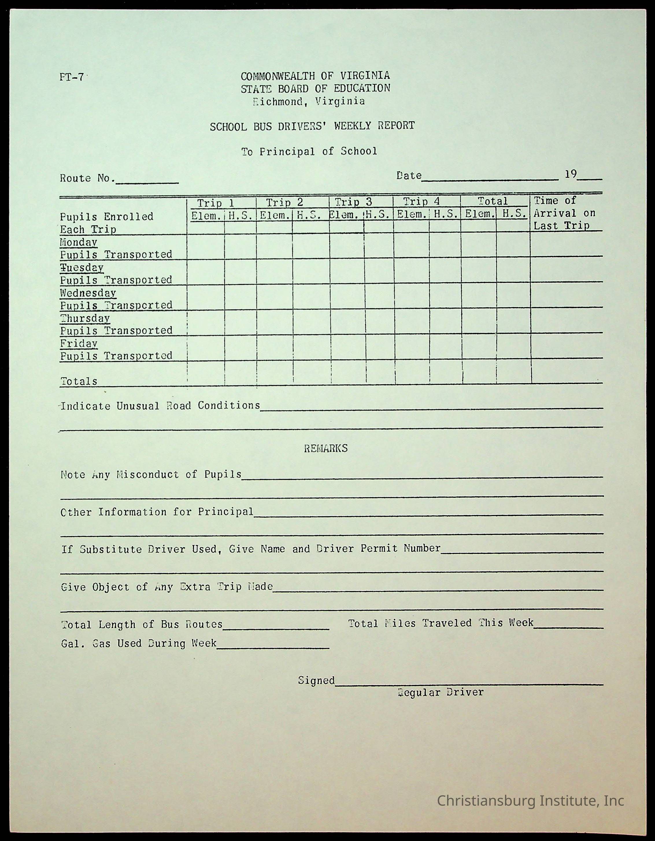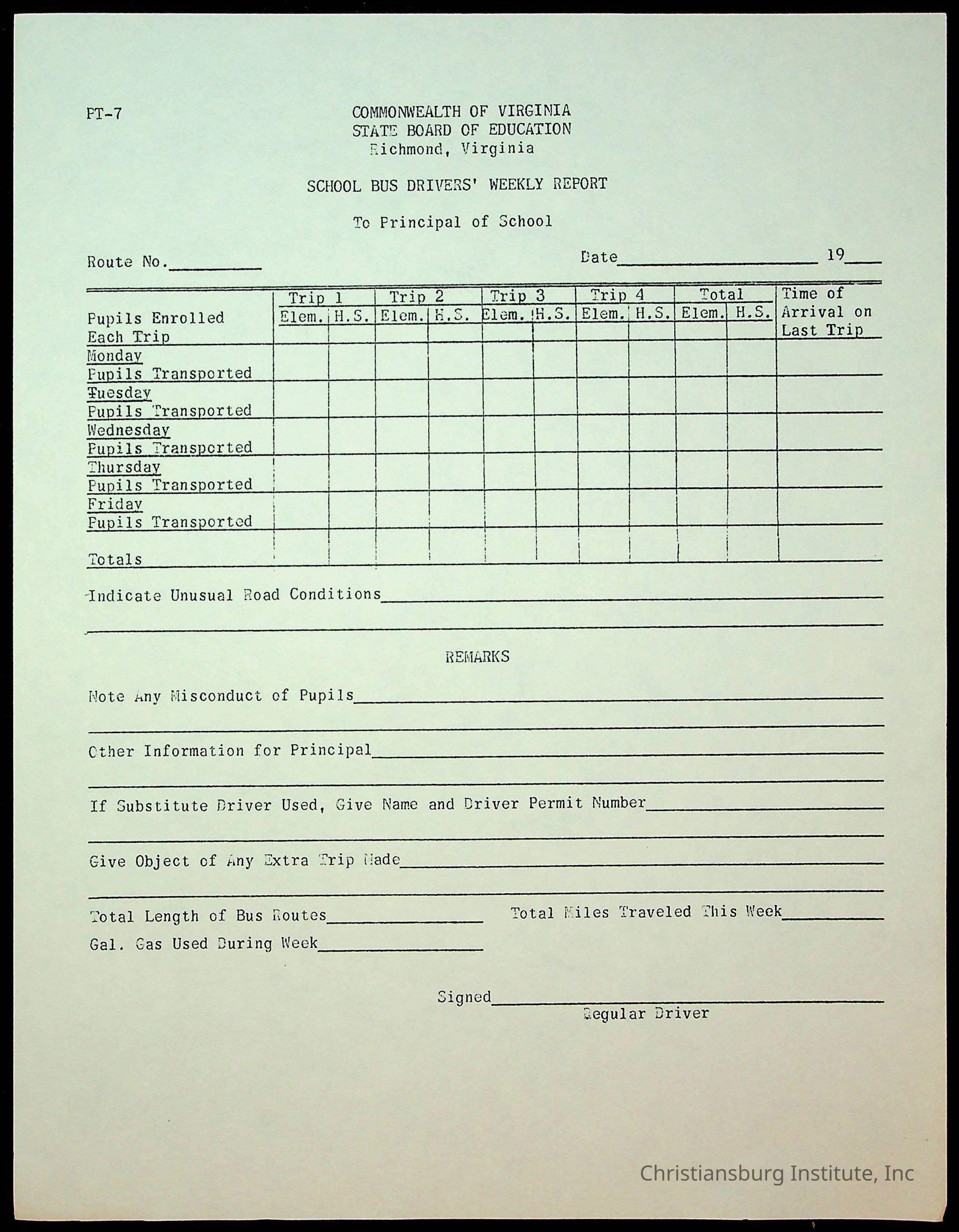 An archive of documents relating to the bus system at Christiansburg Institute and in Montgomery County, Virginia during the 1965-1966 school year.