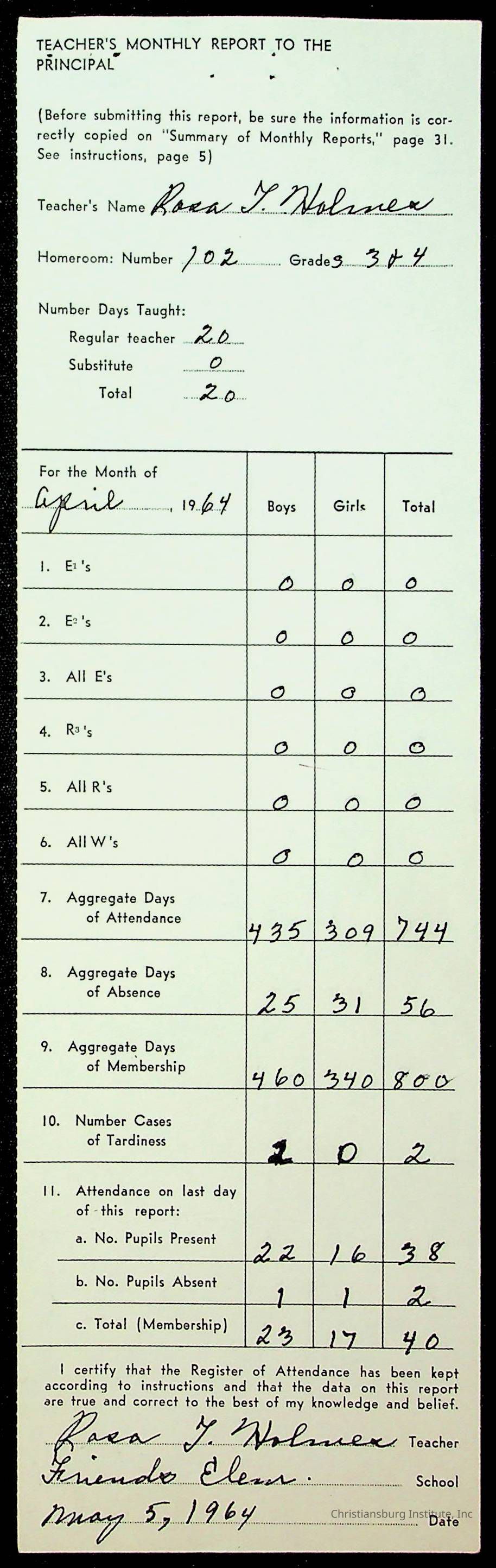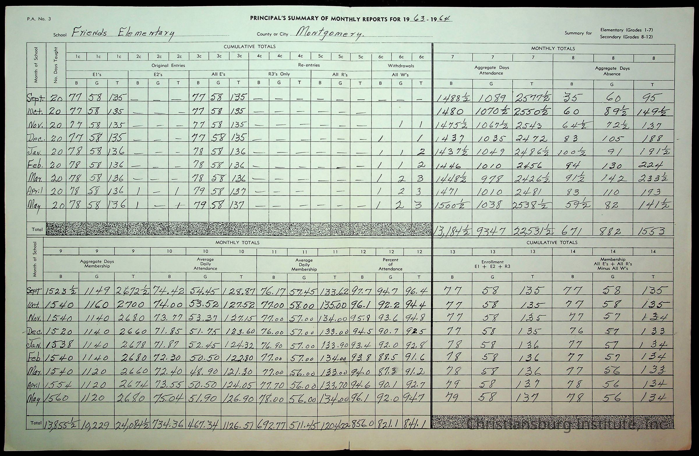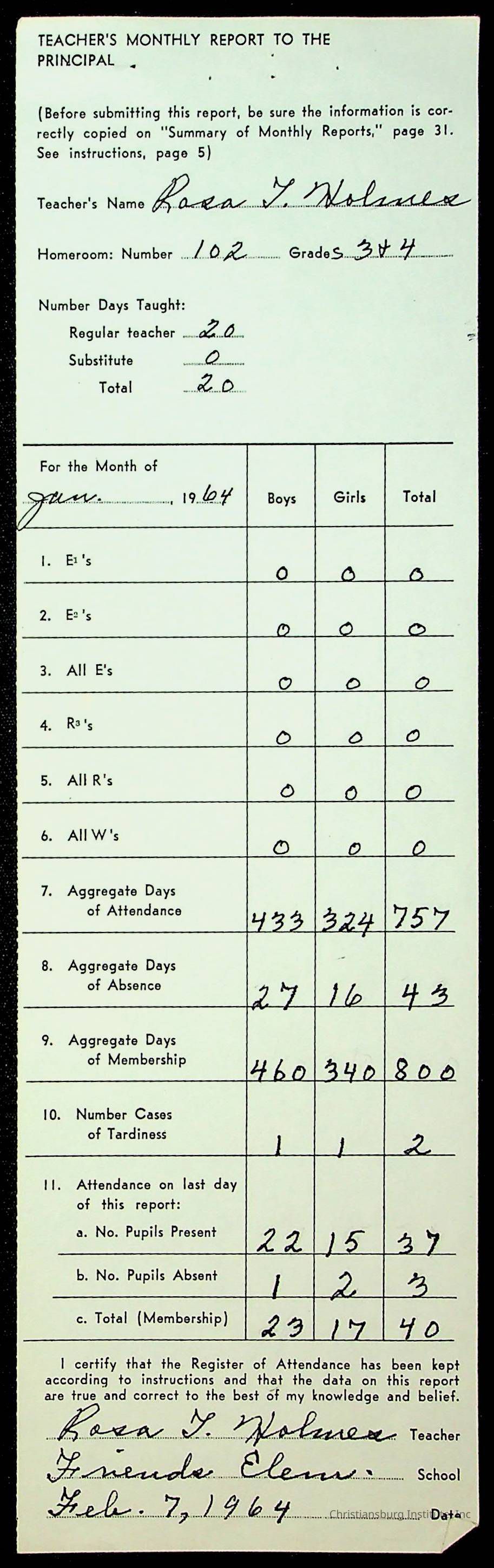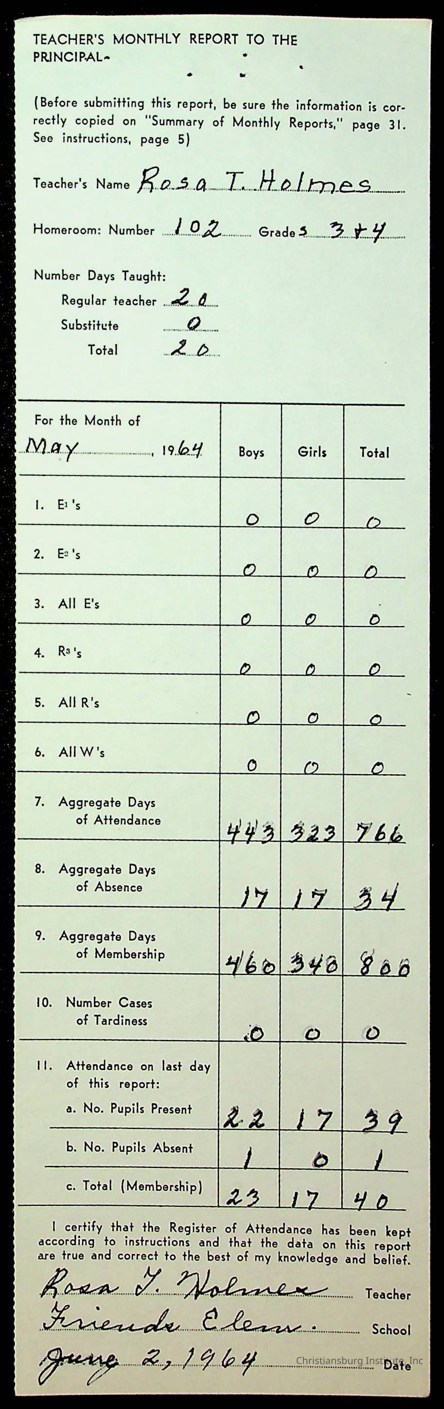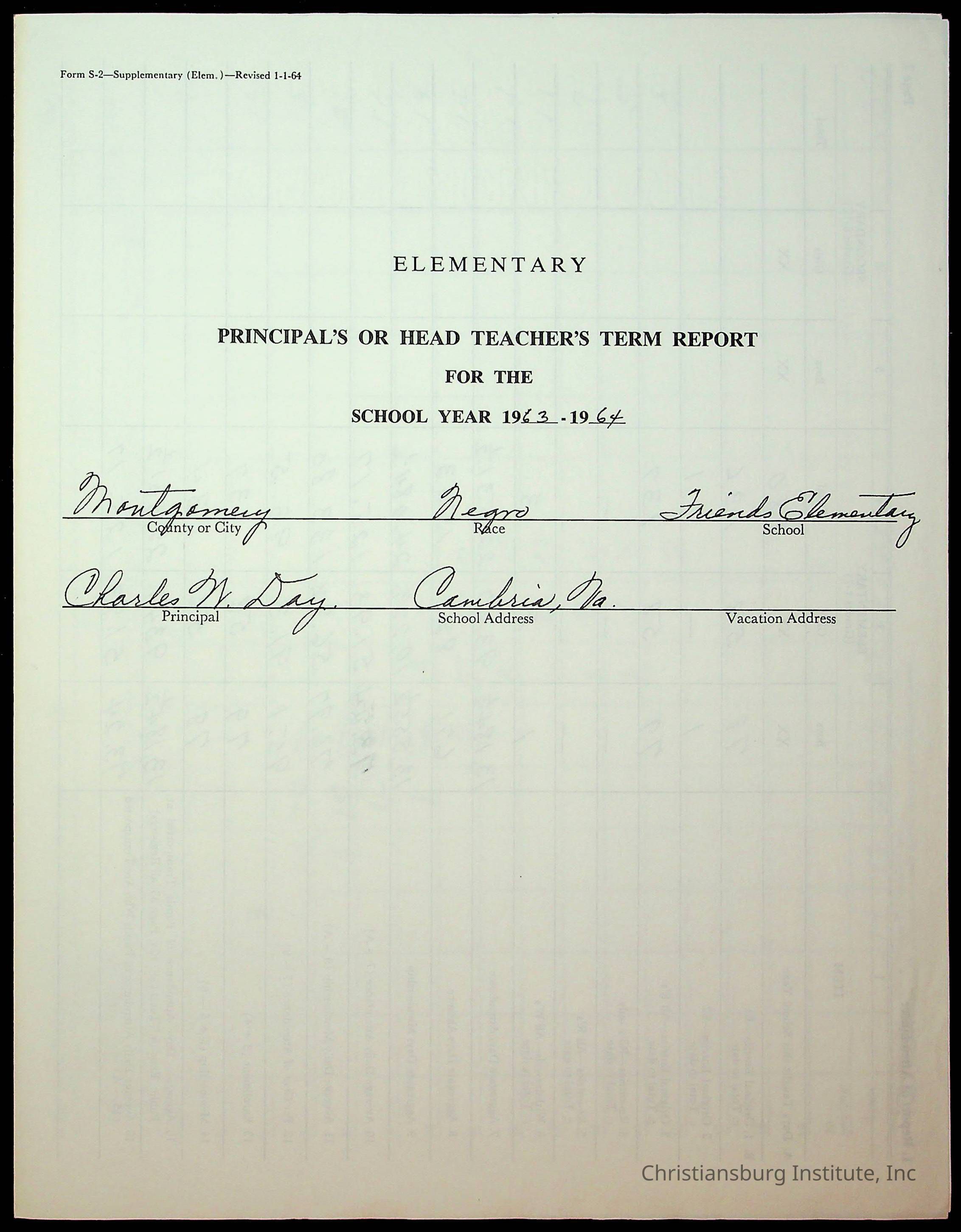 An archive of monthly principal reports for Christiansburg Institute and Friends Elementary School from 1963 through 1964.