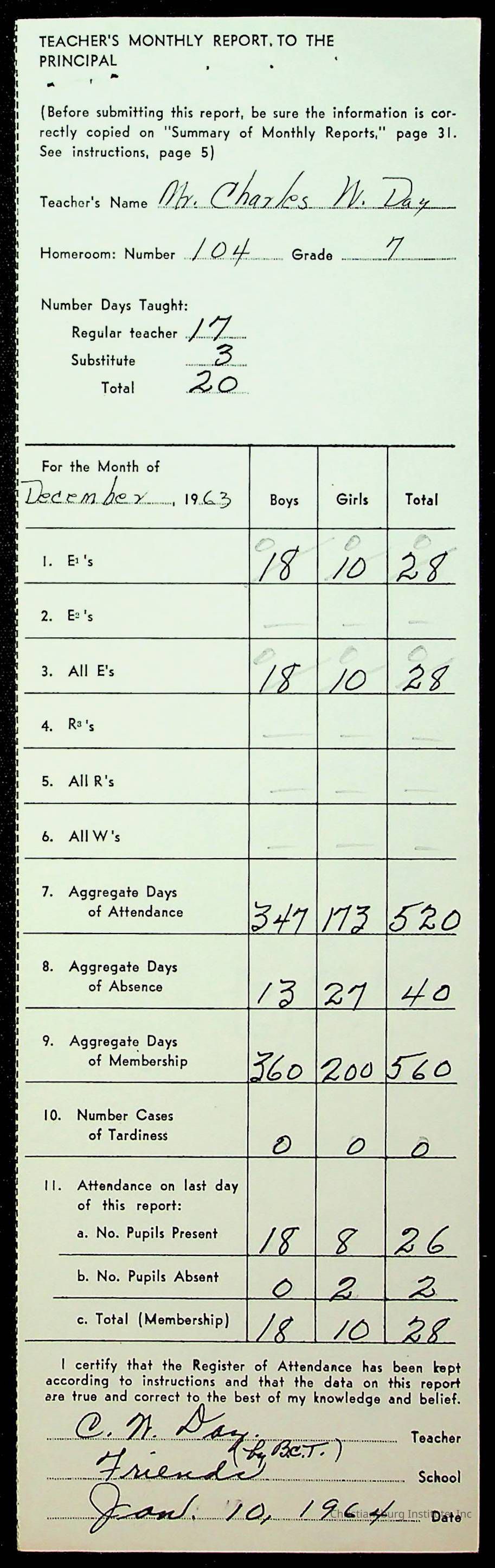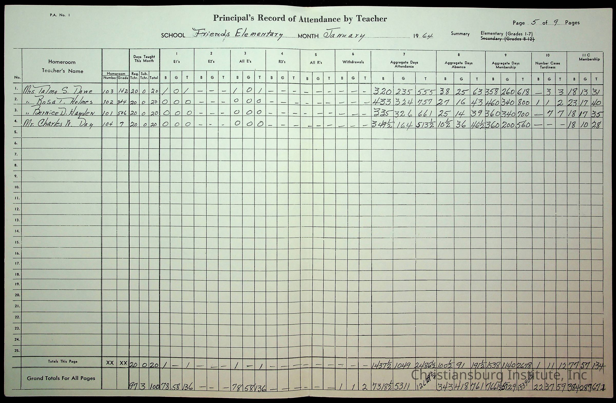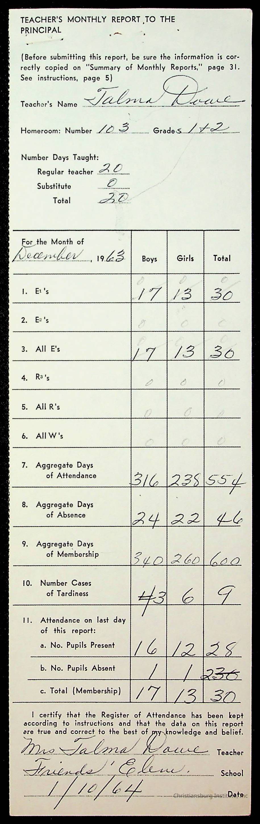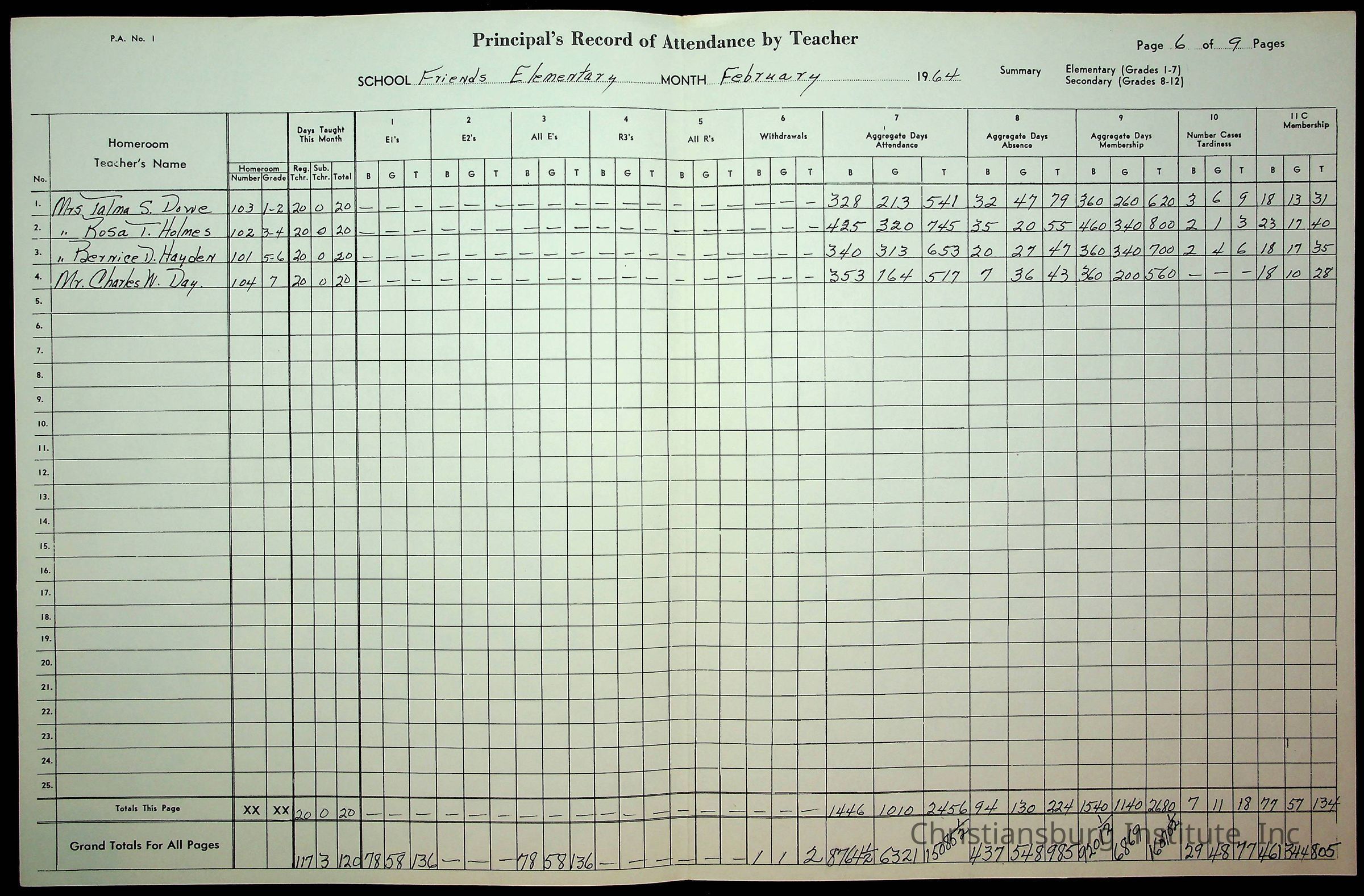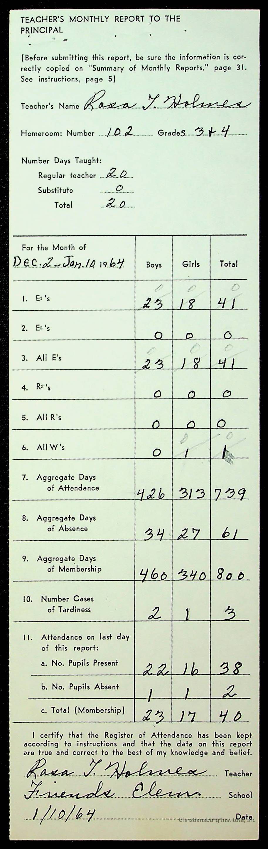 An archive of monthly principal reports for Christiansburg Institute and Friends Elementary School from 1963 through 1964.