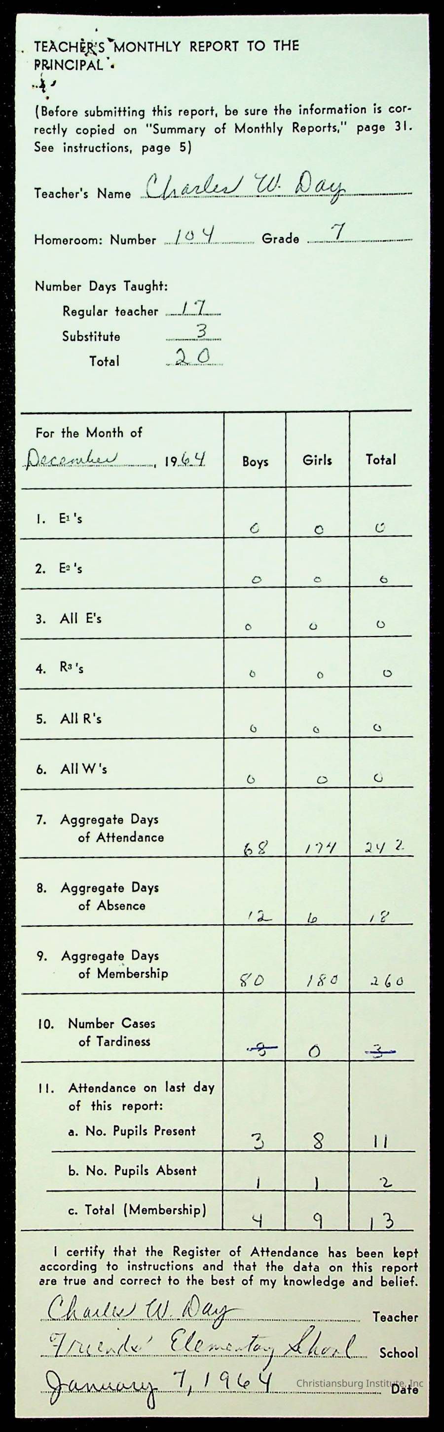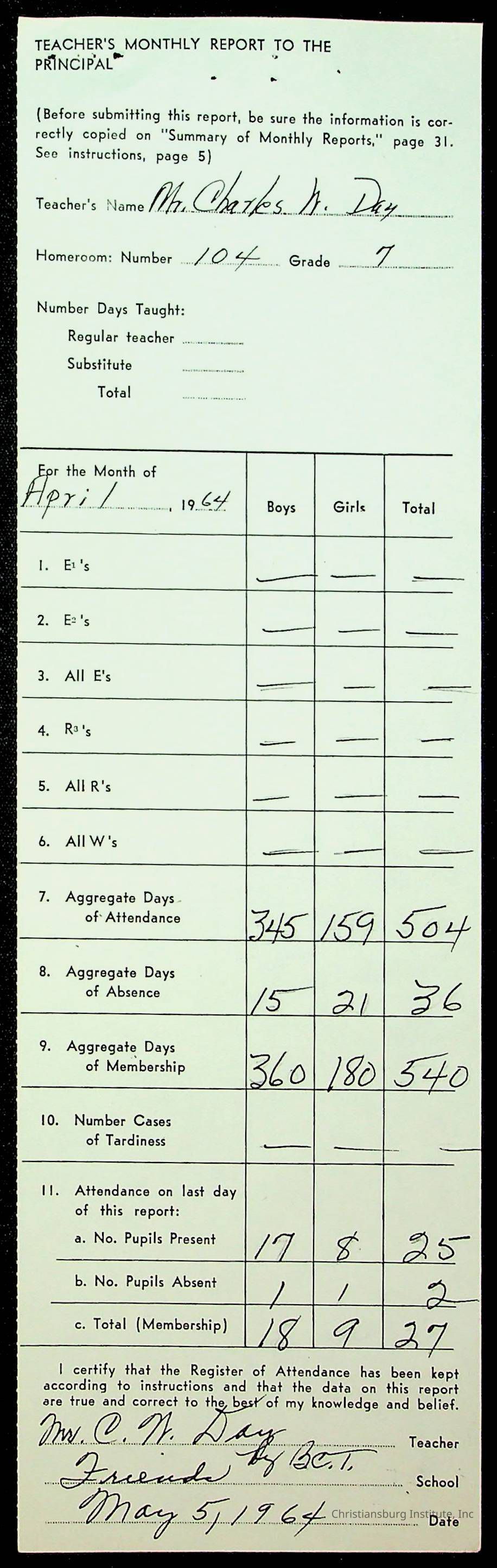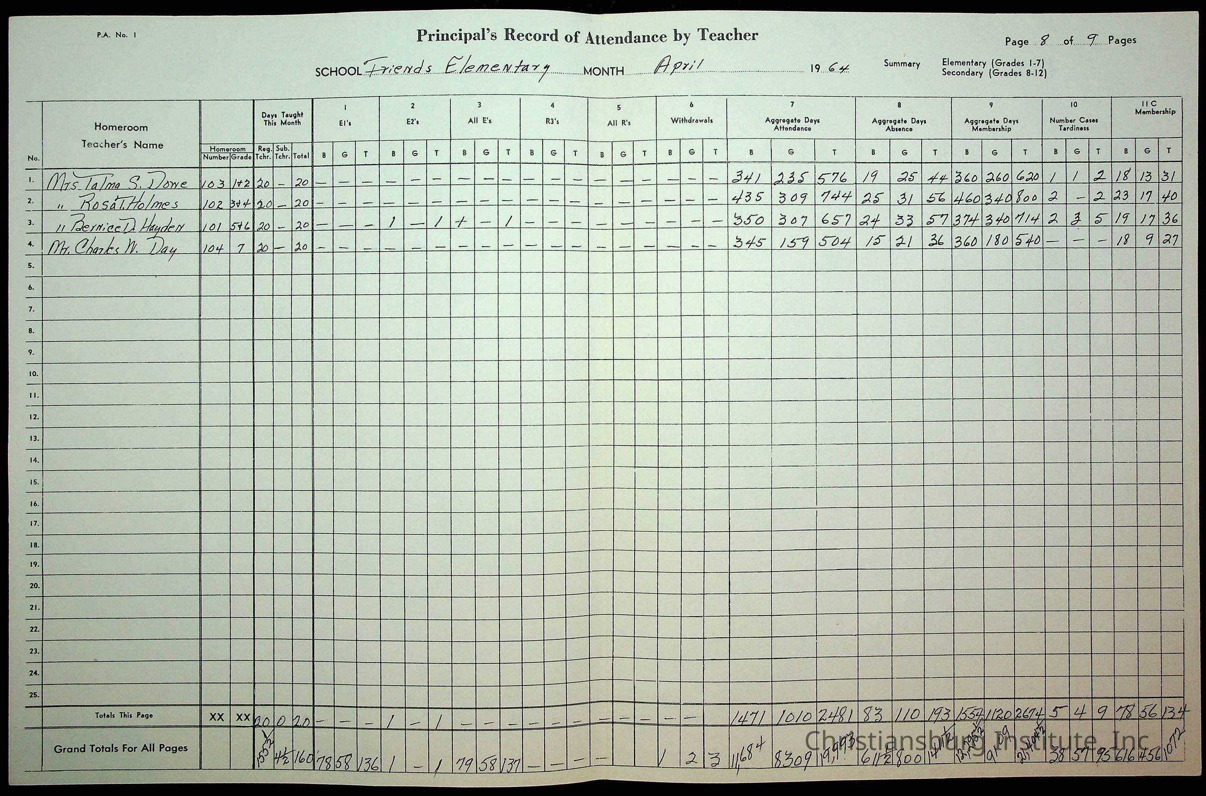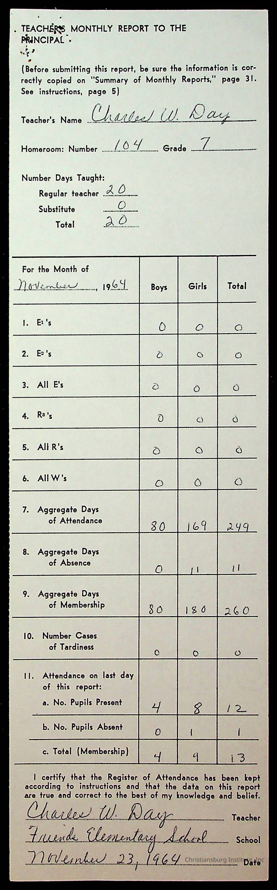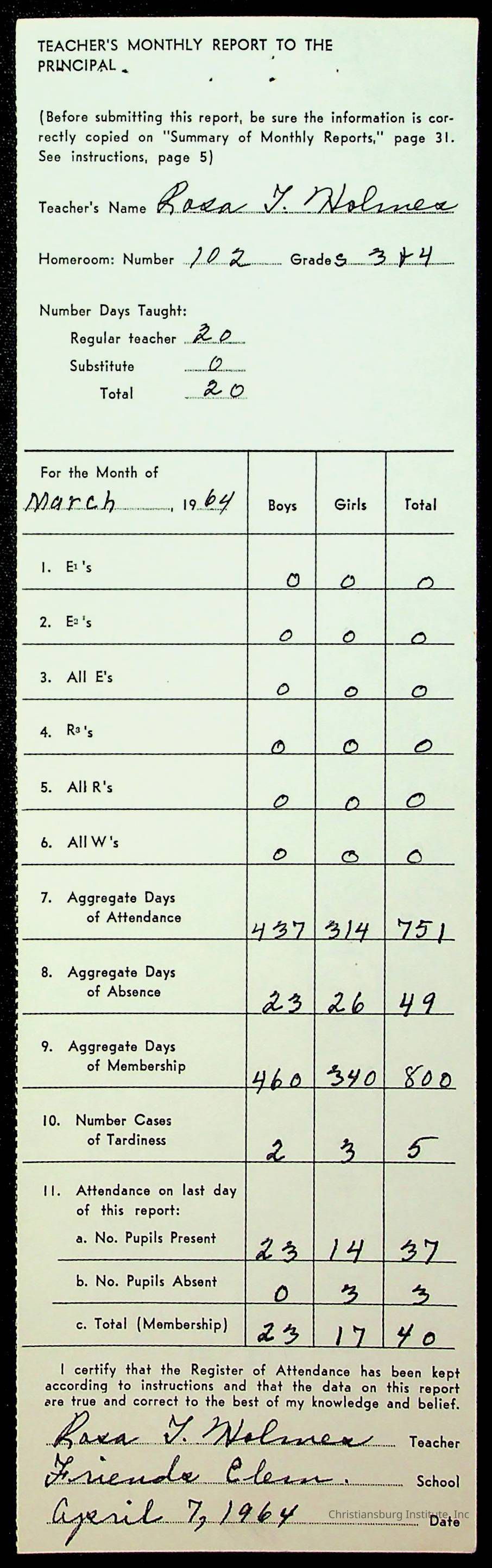 An archive of monthly principal reports for Christiansburg Institute and Friends Elementary School from 1963 through 1964.