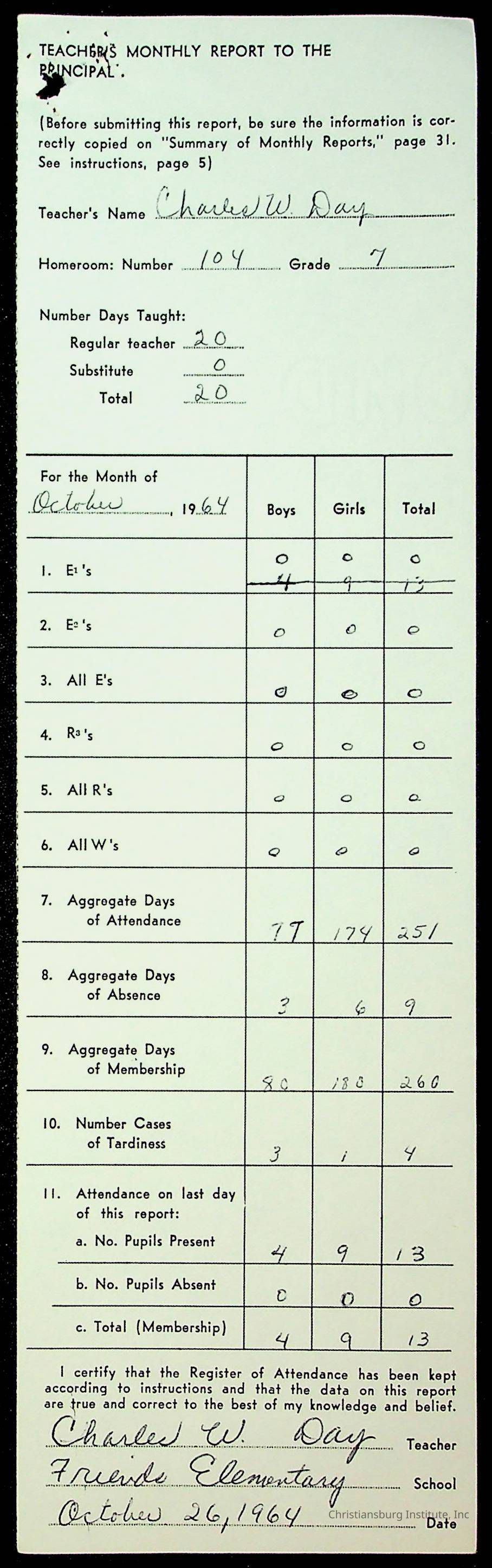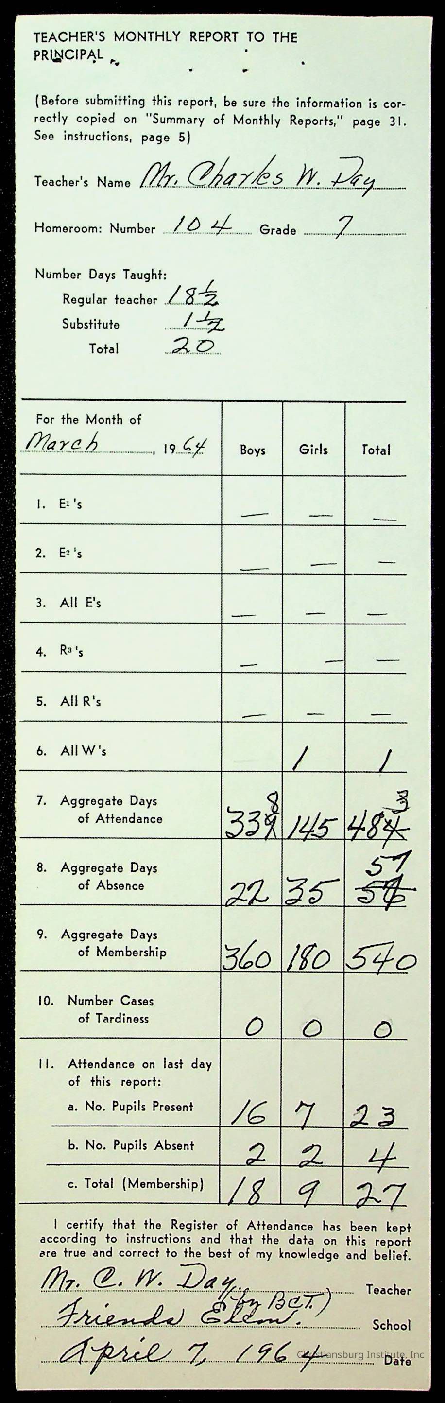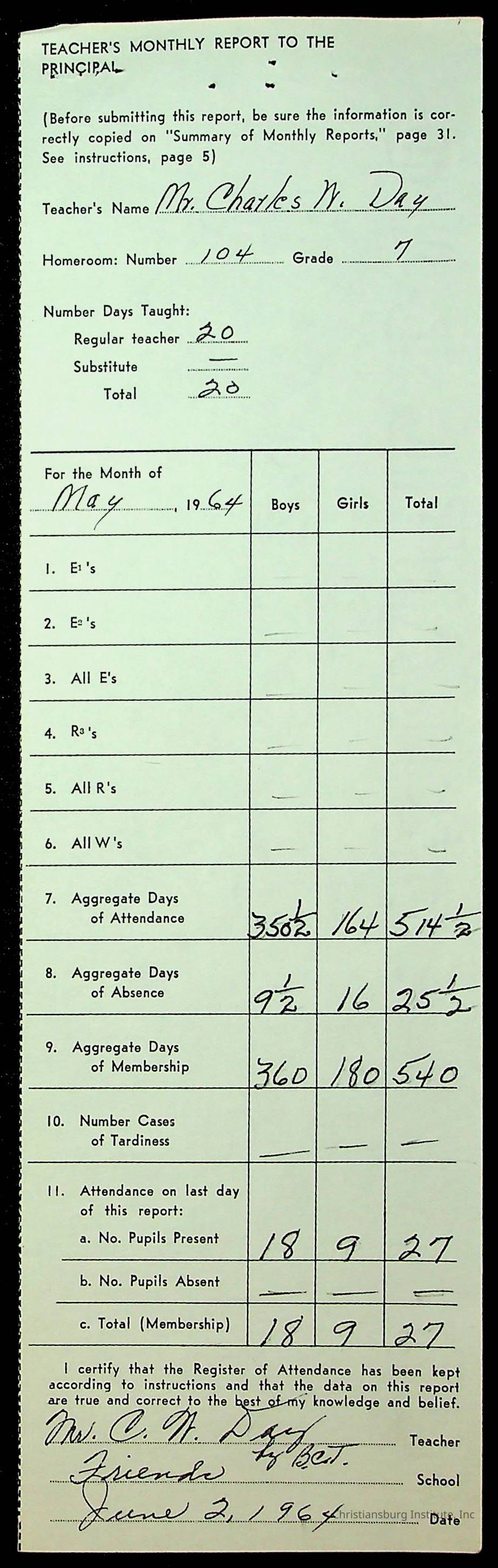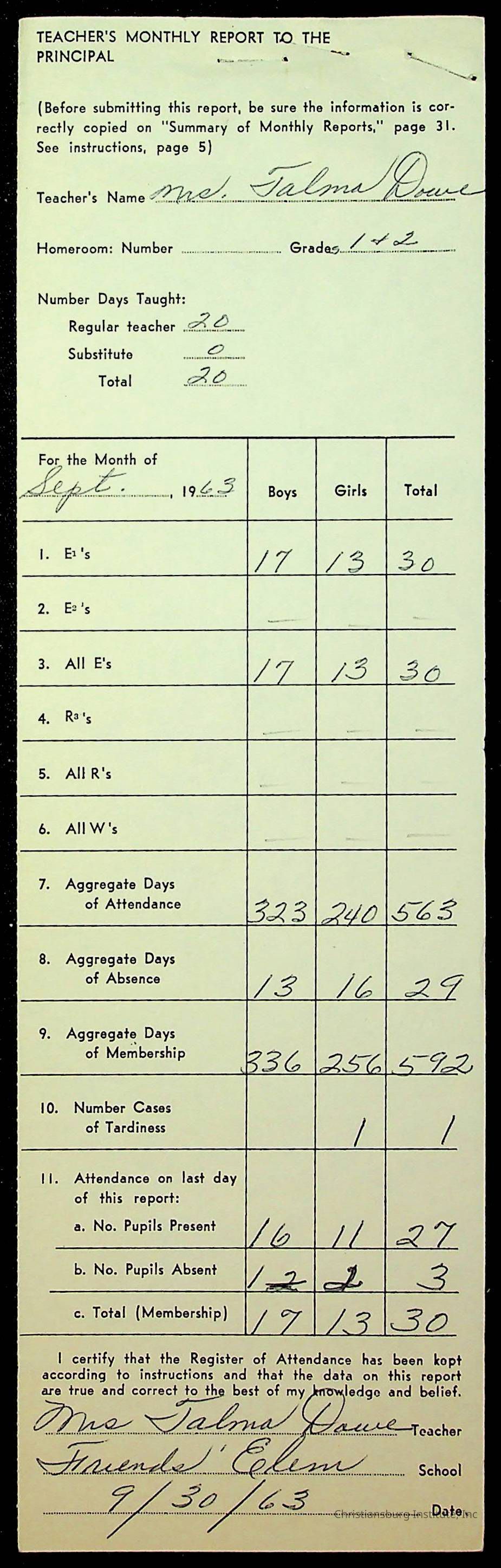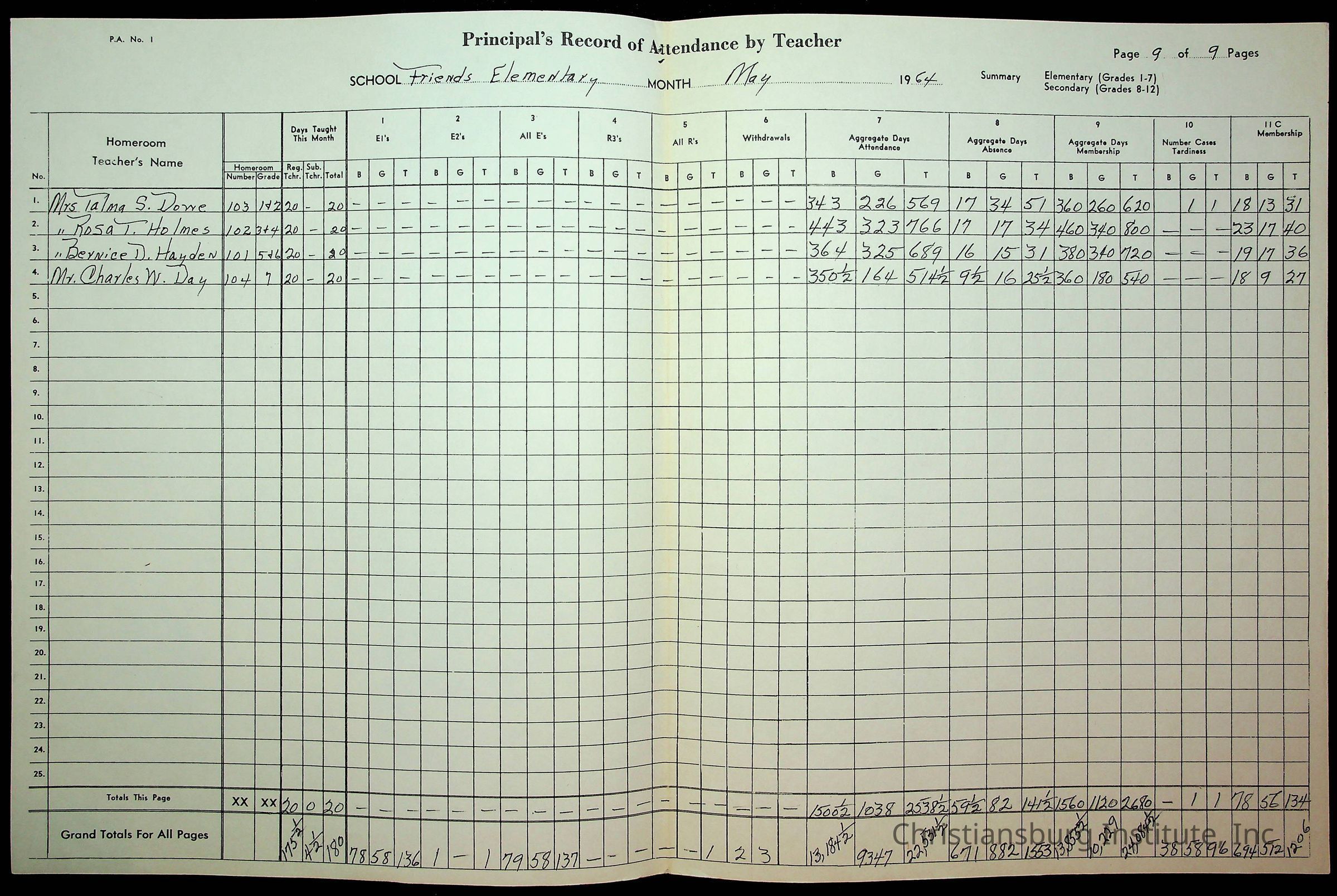 An archive of monthly principal reports for Christiansburg Institute and Friends Elementary School from 1963 through 1964.