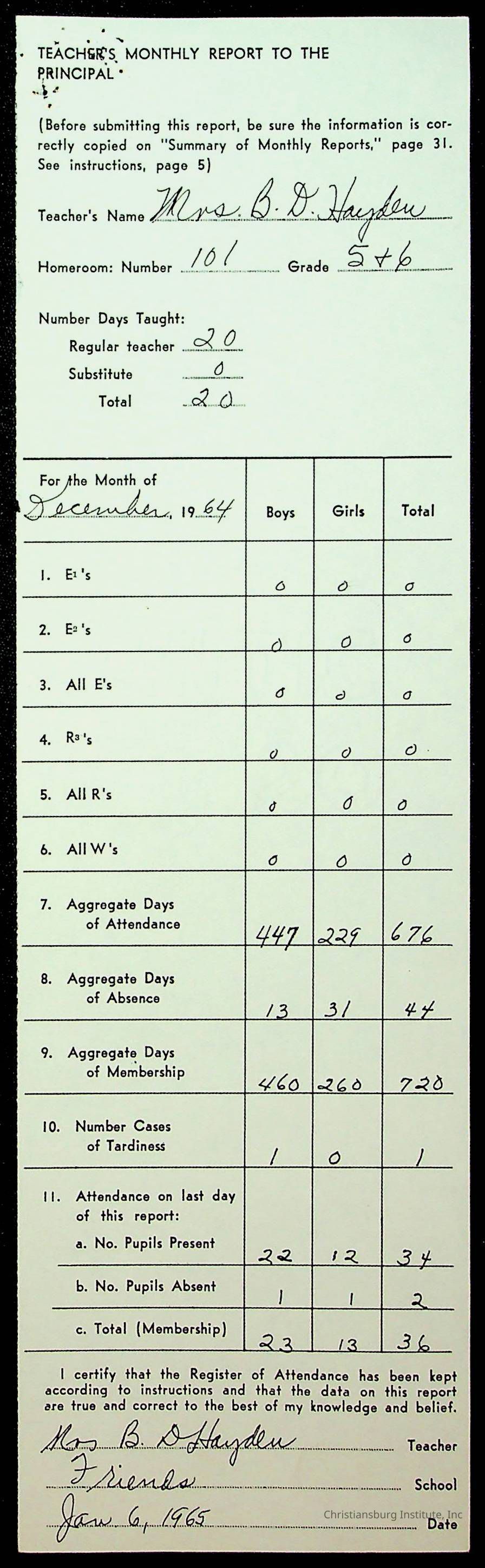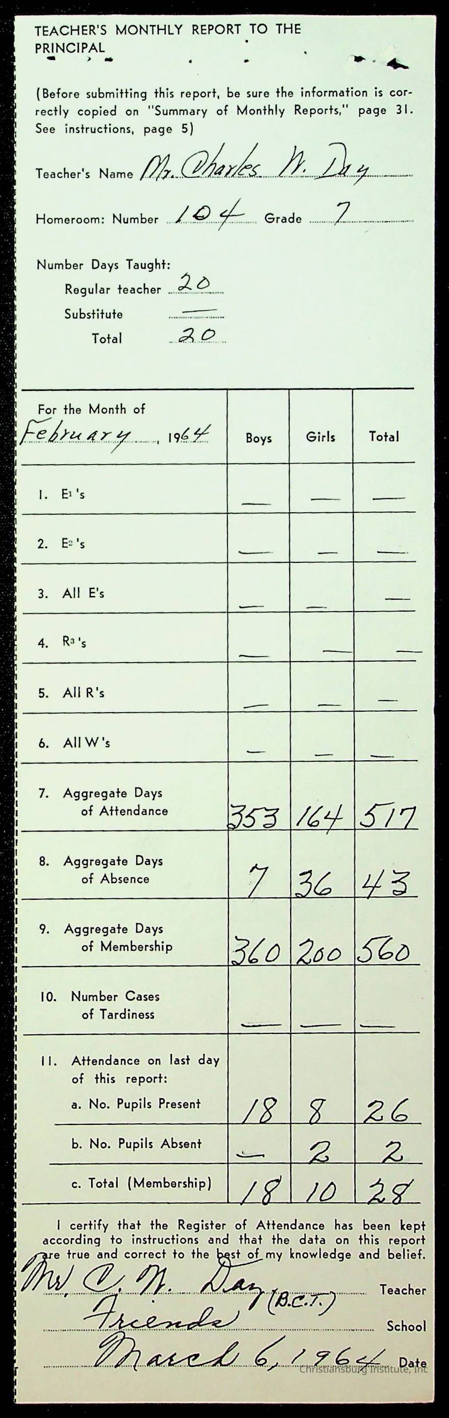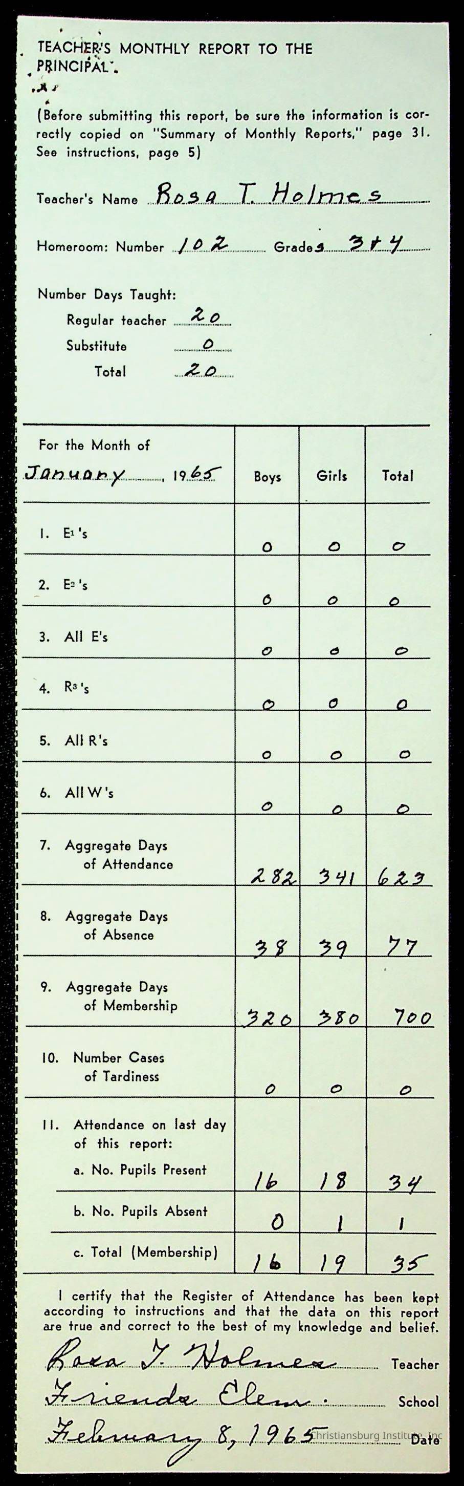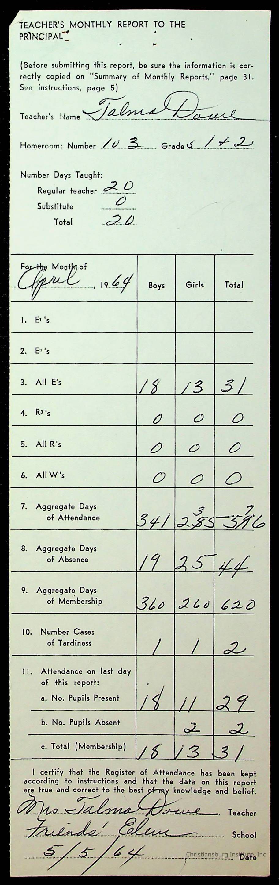 An archive of monthly principal reports for Christiansburg Institute and Friends Elementary School from 1963 through 1964.