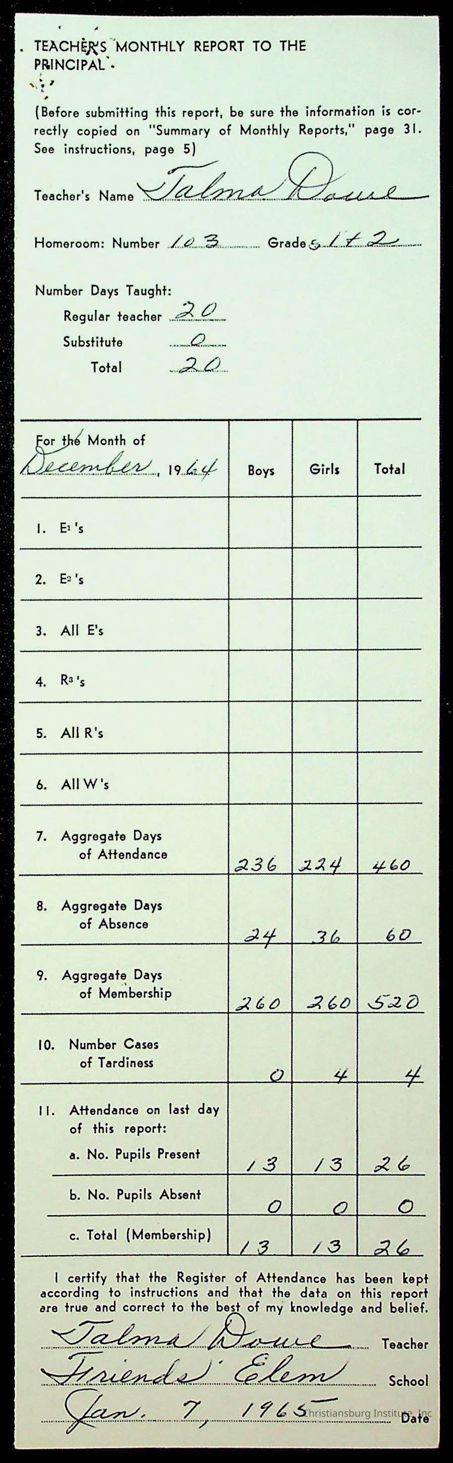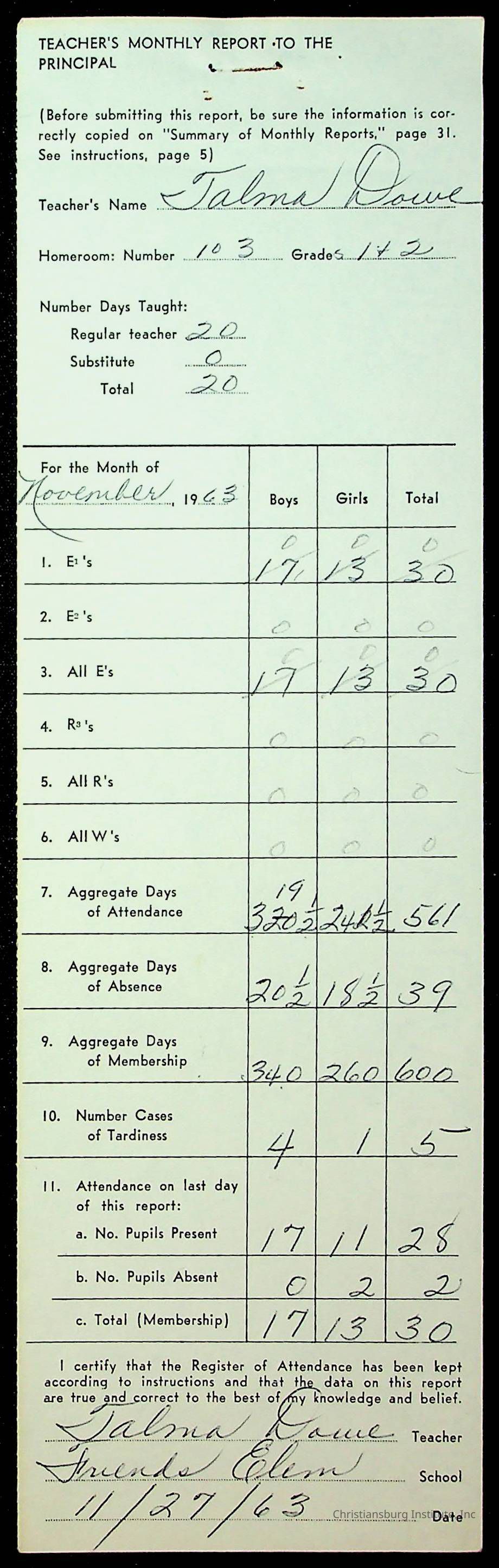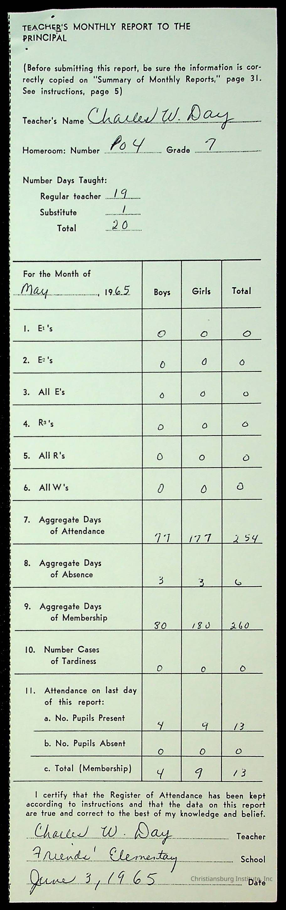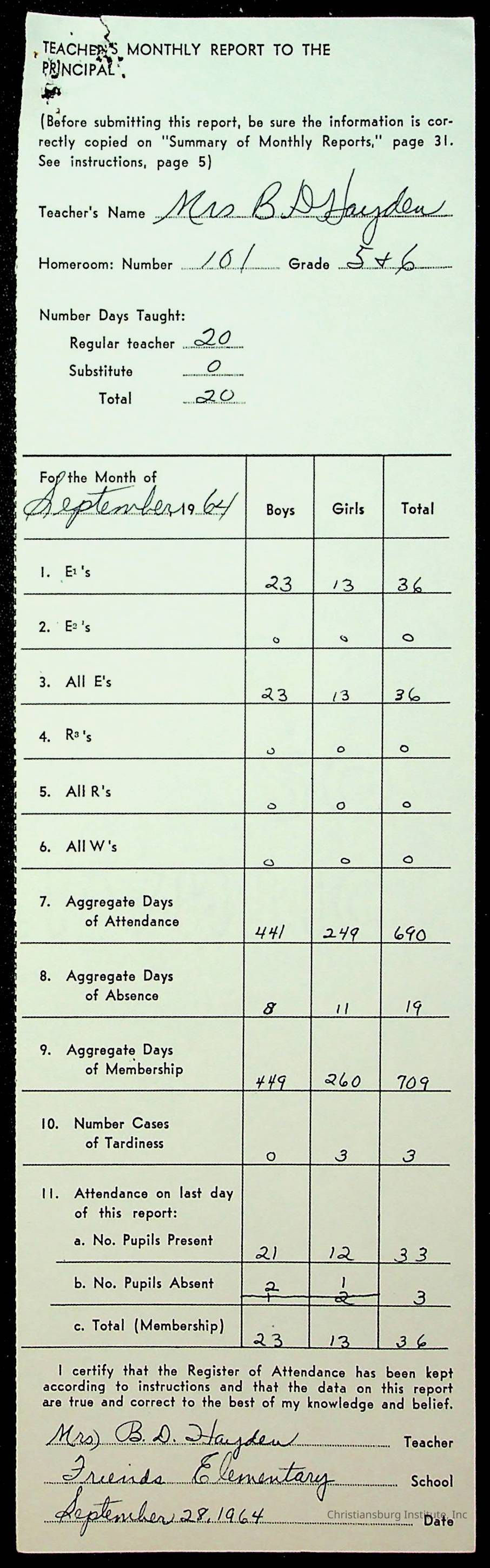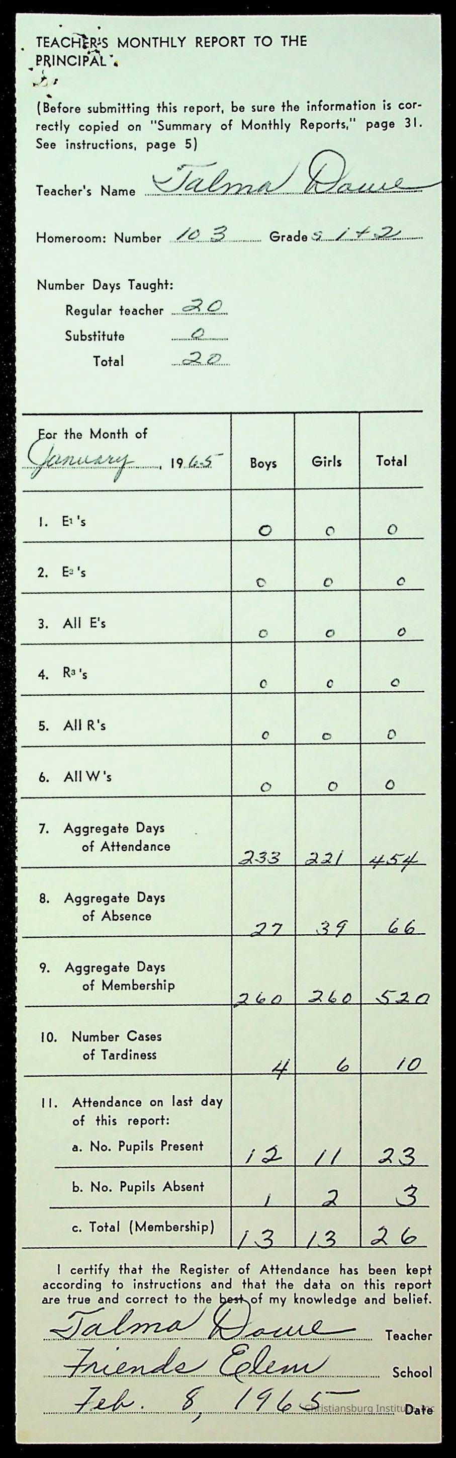 An archive of monthly principal reports for Christiansburg Institute and Friends Elementary School from 1963 through 1964.