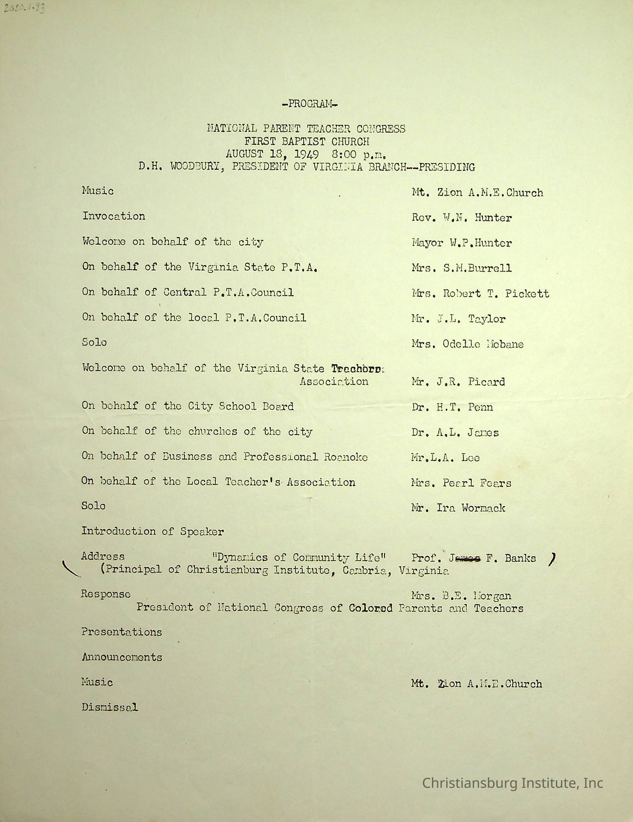 An event program for the National Parent Teacher Congress at the First Baptist Church in Virginia on August 18th, 1949.Creator