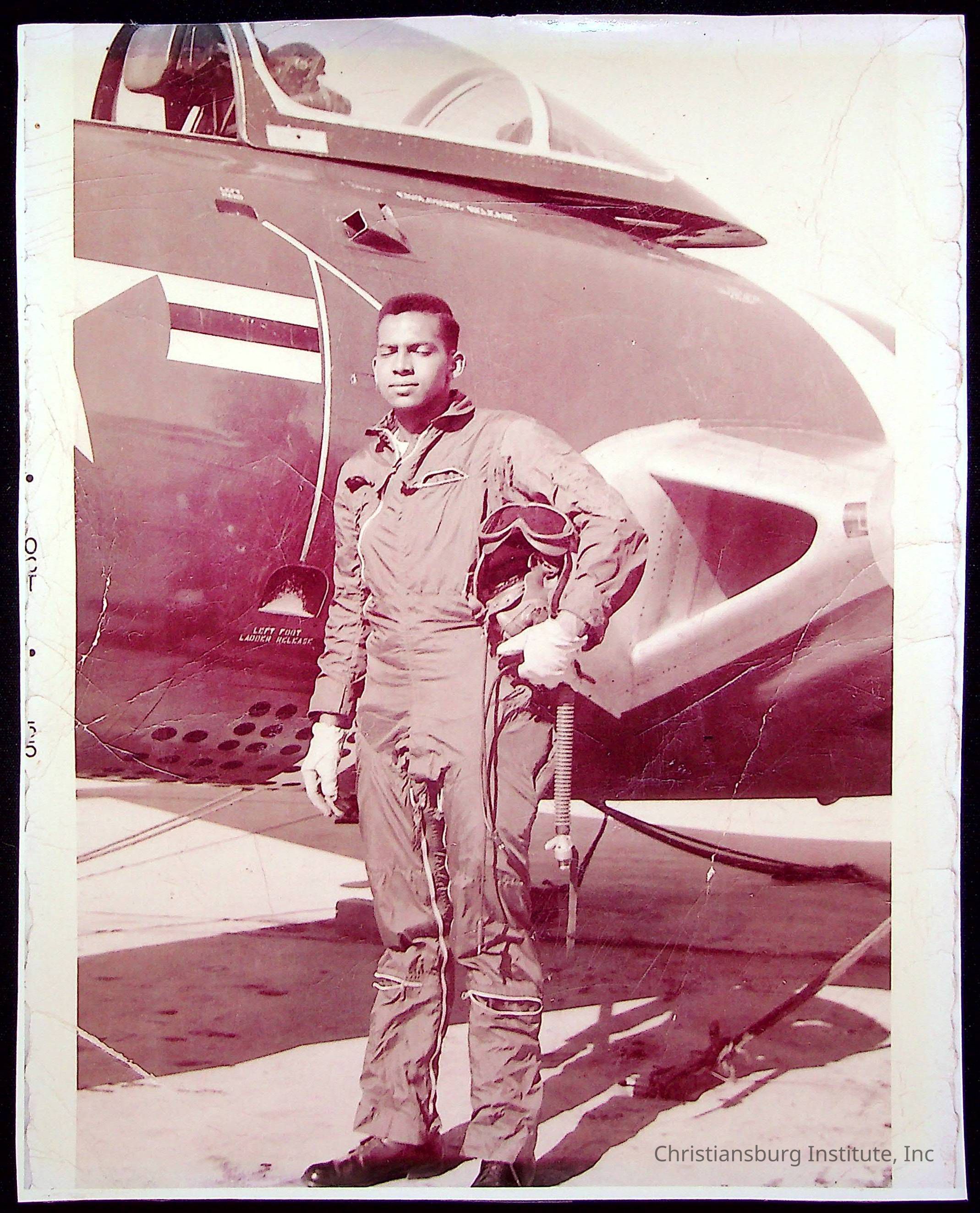 A photograph of Navy Commander Leonard Murray Lee, a Christiansburg Institute alumni, standing in a flight suit in front of a US Navy plane dated October 1955.Collection