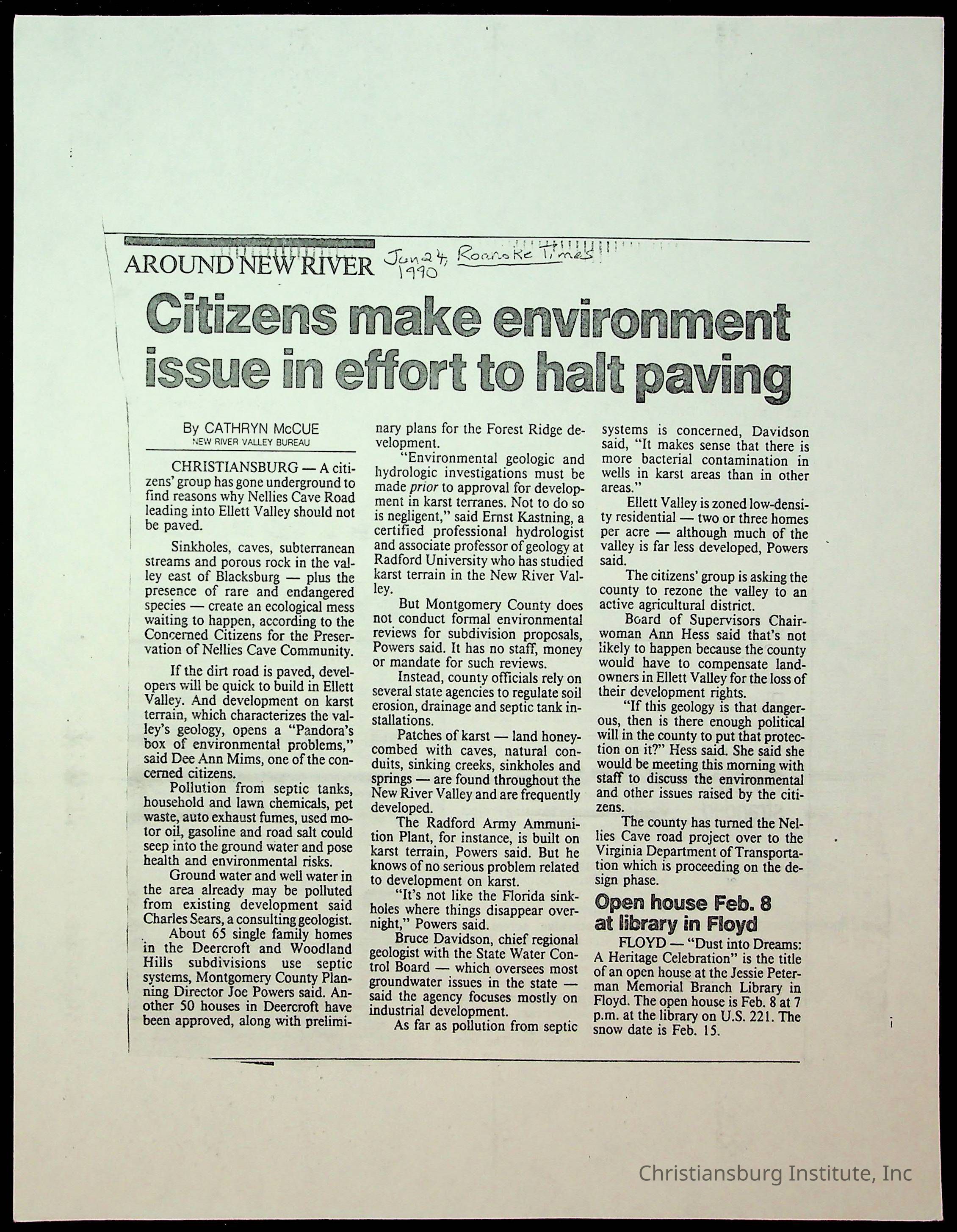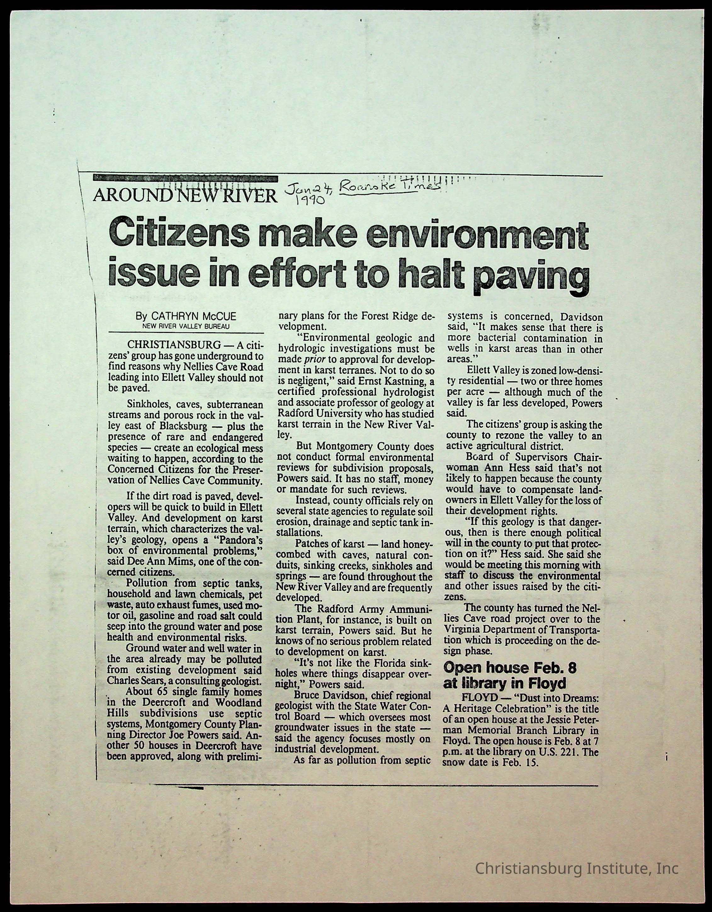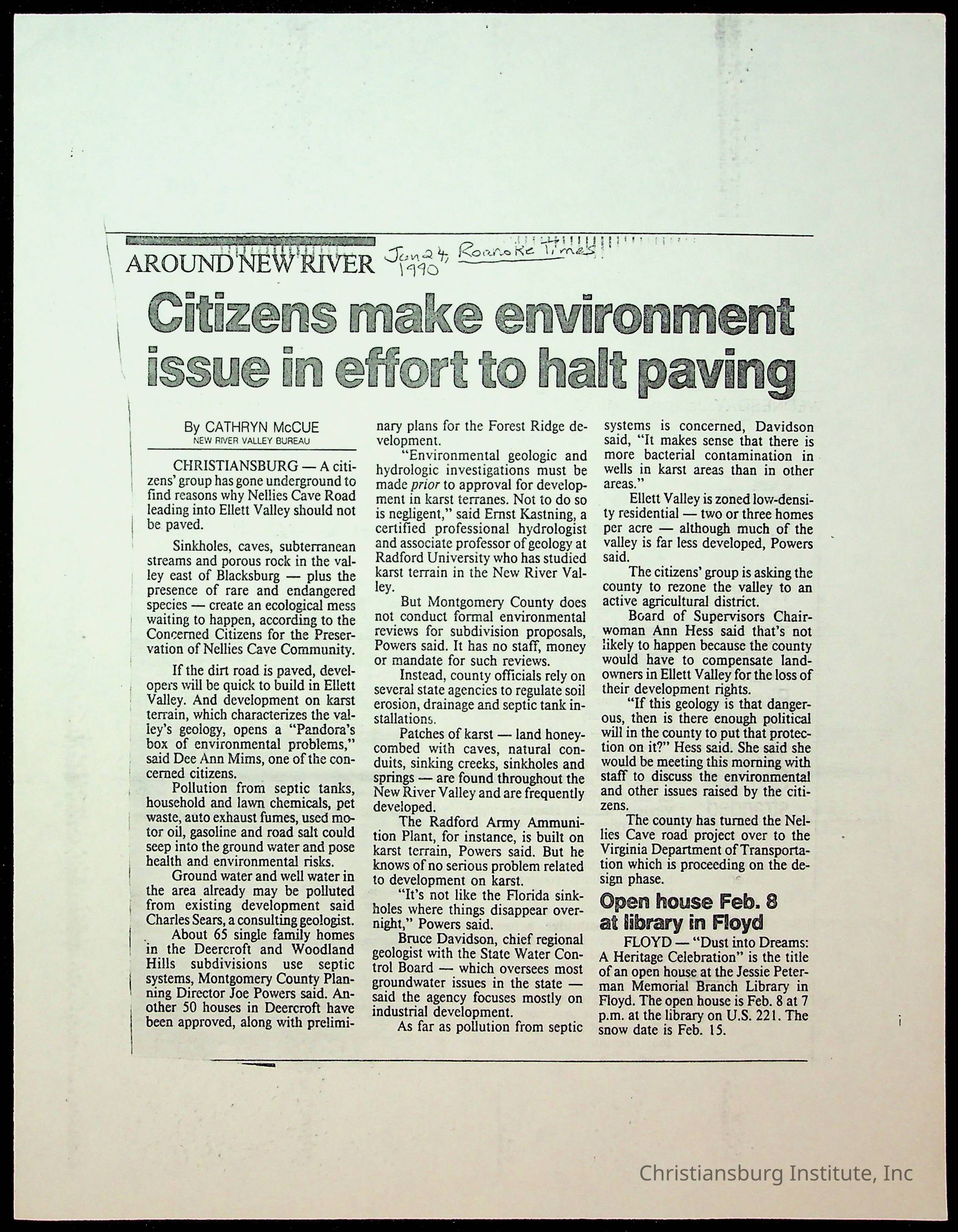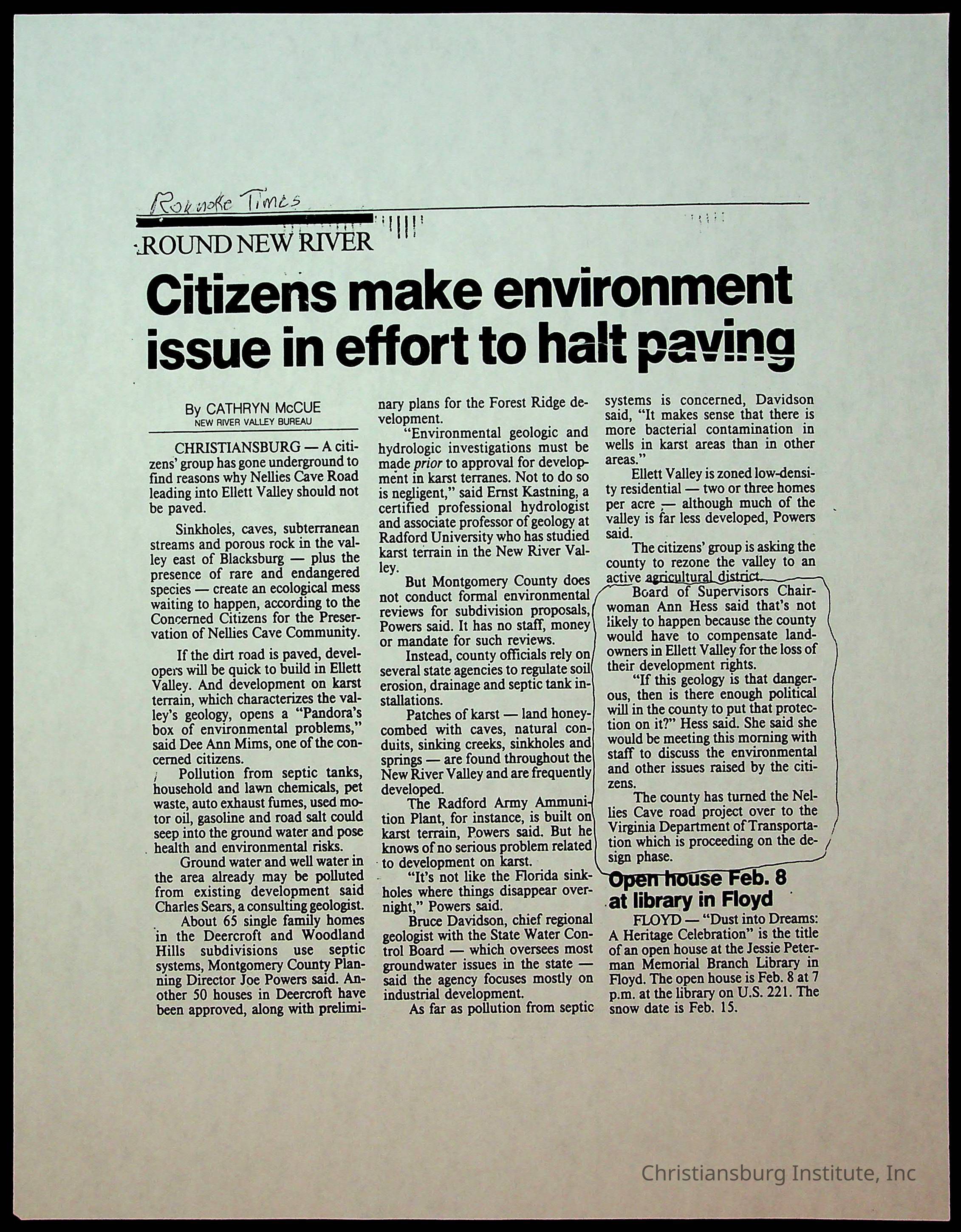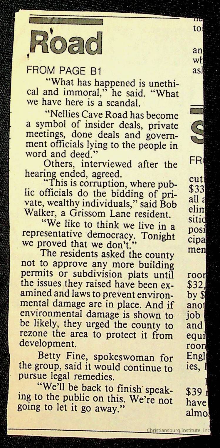 Fine, Elizabeth C., Concerned Citizens For Nellies Cave Community, Montgomery County, The Roanoke Times, The News Messenger, NRV Current