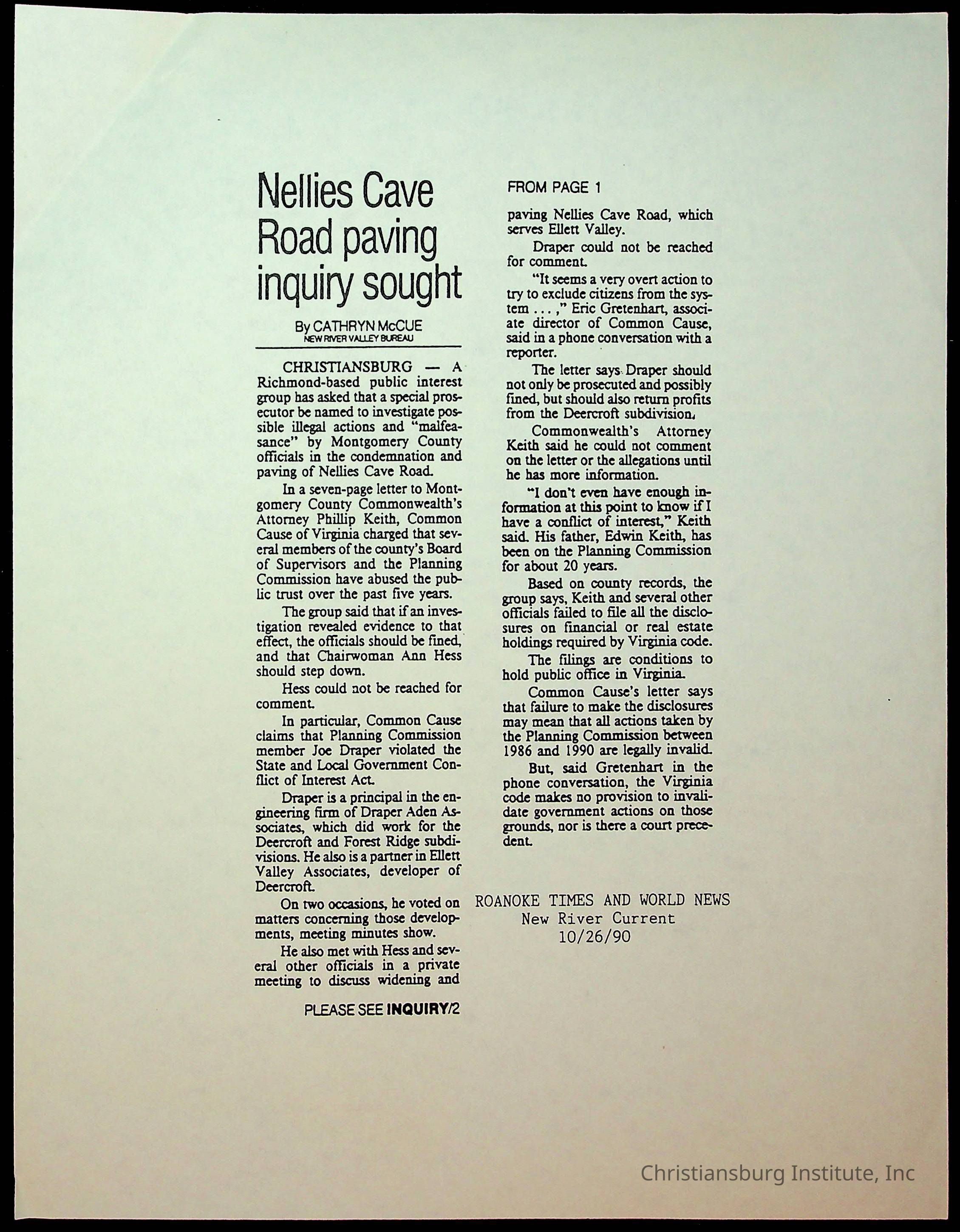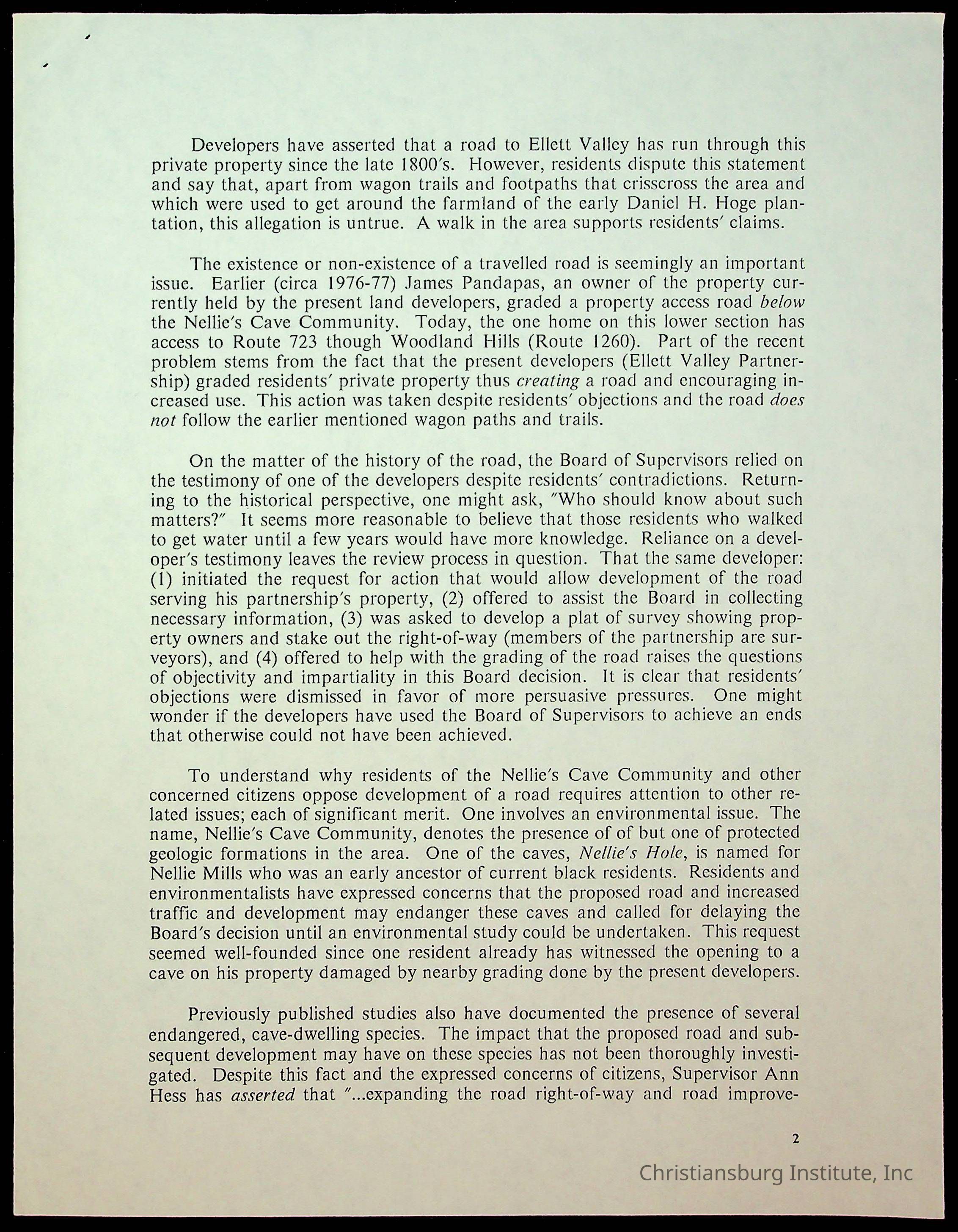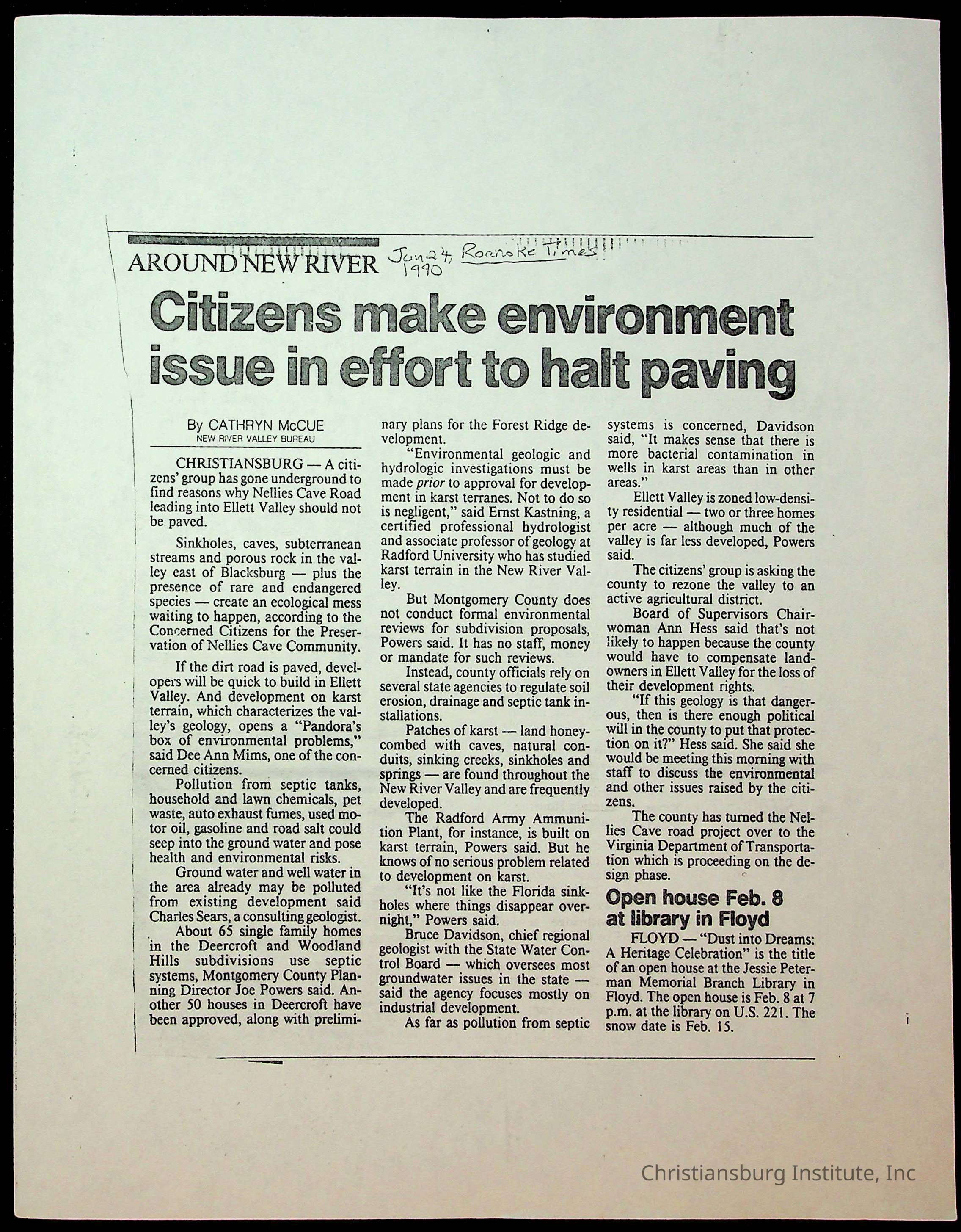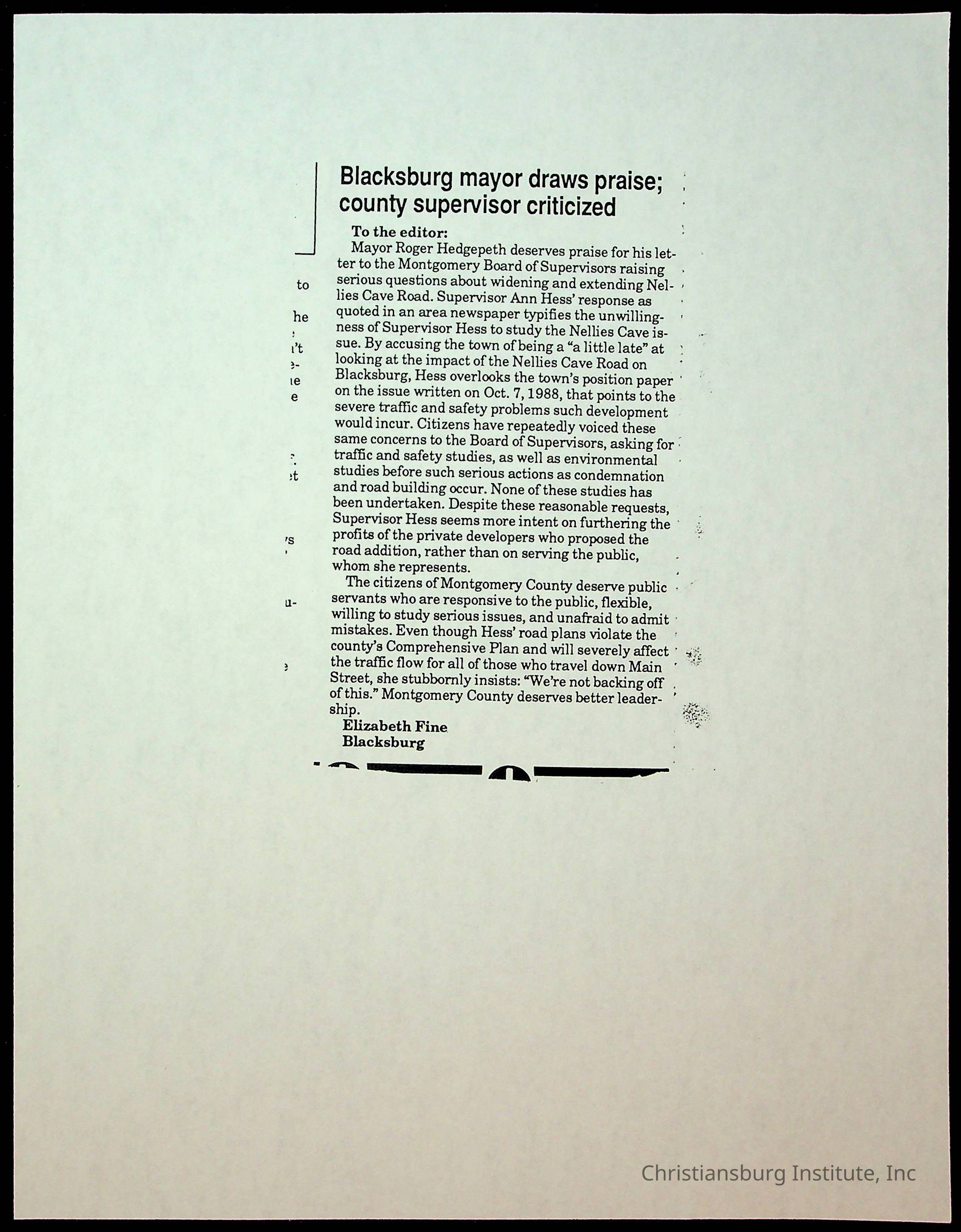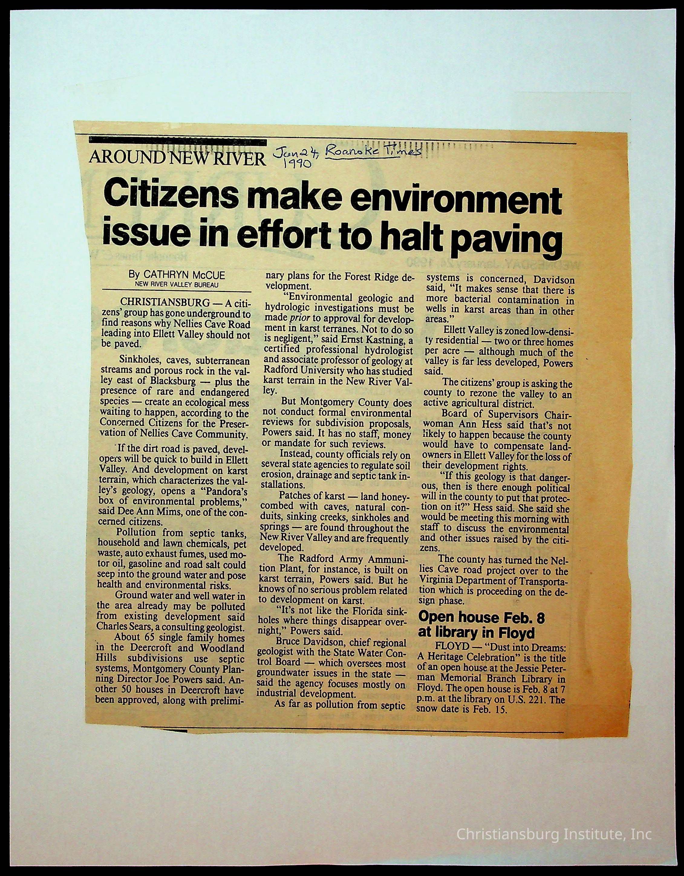 Fine, Elizabeth C., Concerned Citizens For Nellies Cave Community, Montgomery County, The Roanoke Times, The News Messenger, NRV Current
